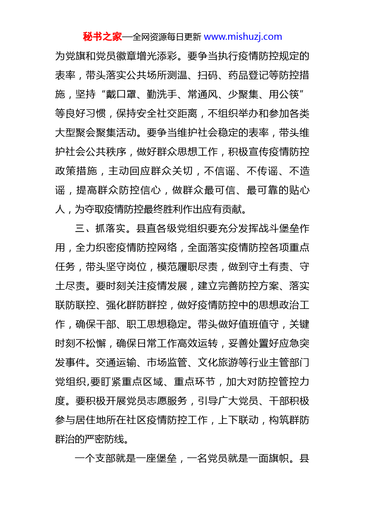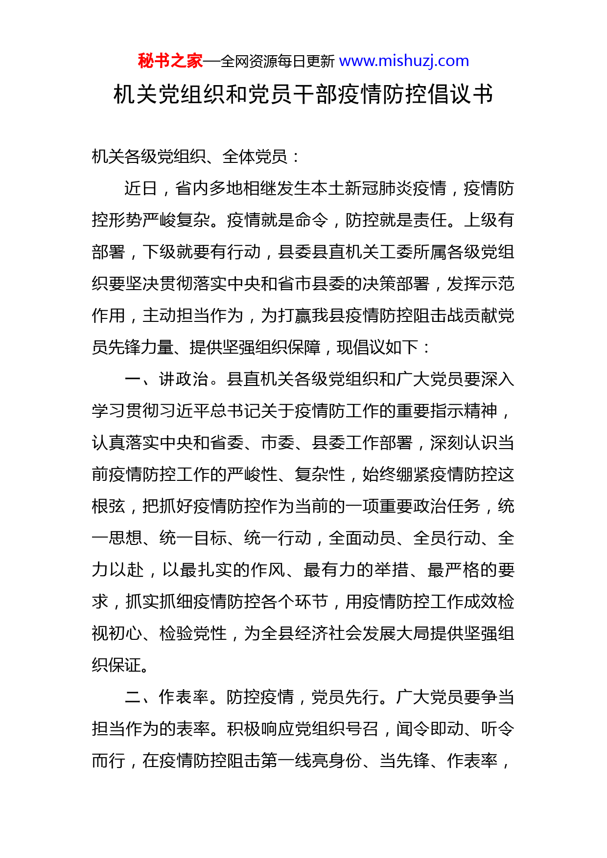 秘书之家—全网资源每日更新www.mishuzj.com机关党组织和党员干部疫情防控倡议书机关各级党组织、全体党员:近日,省内多地相继发生本土新冠肺炎疫情,疫情防控形势严峻复杂。疫情就是命令,防控就是责任。上级有部署,下级就要有行动,县委县直机关工委所属各级党组织要坚决贯彻落实中央和省市县委的决策部署,发挥示范作用,主动担当作为,为打赢我县疫情防控阻击战贡献党员先锋力量、提供坚强组织保障,现倡议如下:一、讲政治。县直机关各级党组织和广大党员要深入学习贯彻习近平总书记关于疫情防工作的重要指示精神,认真落实中央和省委、市委、县委工作部署,深刻认识当前疫情防控工作的严峻性、复杂性,始终绷紧疫情防控这根弦,把抓好疫情防控作为当前的一项重要政治任务,统一思想、统一目标、统一行动,全面动员、全员行动、全力以赴,以最扎实的作风、最有力的举措、最严格的要求,抓实抓细疫情防控各个环节,用疫情防控工作成效检视初心、检验党性,为全县经济社会发展大局提供坚强组织保证。二、作表率。防控疫情,党员先行。广大党员要争当担当作为的表率。积极响应党组织号召,闻令即动、听令而行,在疫情防控阻击第一线亮身份、当先锋、作表率,秘书之家—全网资源每日更新www.mishuzj.com为党旗和党员徽章增光添彩。要争当执行疫情防控规定的表率,带头落实公共场所测温、扫码、药品登记等防控措施,坚持“戴口罩、勤洗手、常通风、少聚集、用公筷”等良好习惯,保持安全社交距离,不组织举办和参加各类大型聚会聚集活动。要争当维护社会稳定的表率,带头维护社会公共秩序,做好群众思想工作,积极宣传疫情防控政策措施,主动回应群众关切,不信谣、不传谣、不造谣,提高群众防控信心,做群众最可信、最可靠的贴心人,为夺取疫情防控最终胜利作出应有贡献。三、抓落实。县直各级党组织要充分发挥战斗堡垒作用,全力织密疫情防控网络,全面落实疫情防控各项重点任务,带头坚守岗位,模范履职尽责,做到守土有责、守土尽责。要时刻关注疫情发展,建立完善防控方案、落实联防联控、强化群防群控,做好疫情防控中的思想政治工作,确保干部、职工思想稳定。带头做好值班值守,关键时刻不松懈,确保日常工作高效运转,妥善处置好应急突发事件。交通运输、市场监管、文化旅游等行业主管部门党组织,要盯紧重点区域、重点环节,加大对防控管控力度。要积极开展党员志愿服务,引导广大党员、干部积极参与居住地所在社区疫情防控工作,上下联动,构筑群防群治的严密防线。一个支部就是一座堡垒,一名党员就是一面旗帜。县秘书之家—全网资源每日更新www.mishuzj.com直机关各级党组织和广大党员要迅速行动起来,在县委、县政府的坚强领导下,上下同心、众志成城,全力构筑疫情防控“红色堡垒”,勇当疫情防控“红色尖兵”,让党旗在疫情防控阻击战中高高飘扬!XX县委组织部2022年X月X日