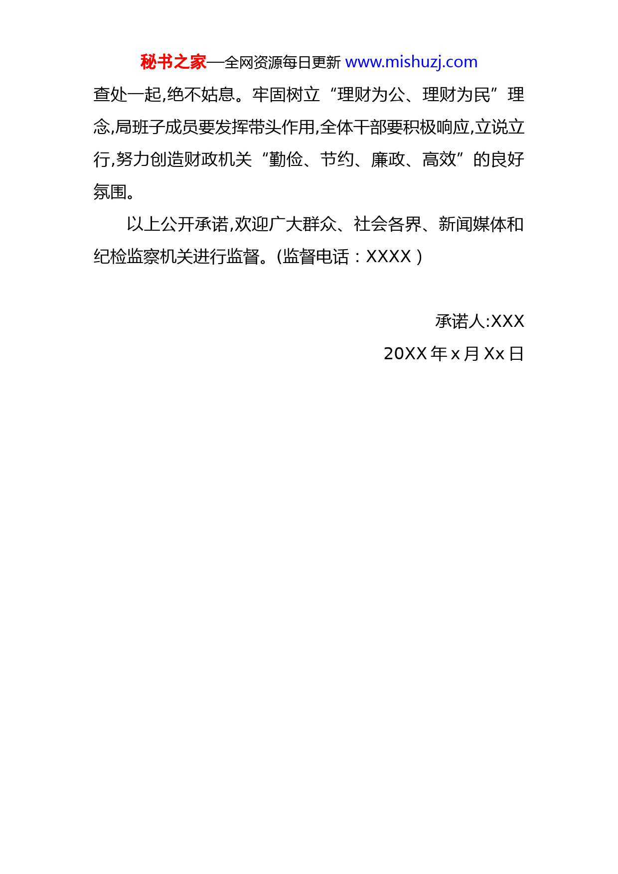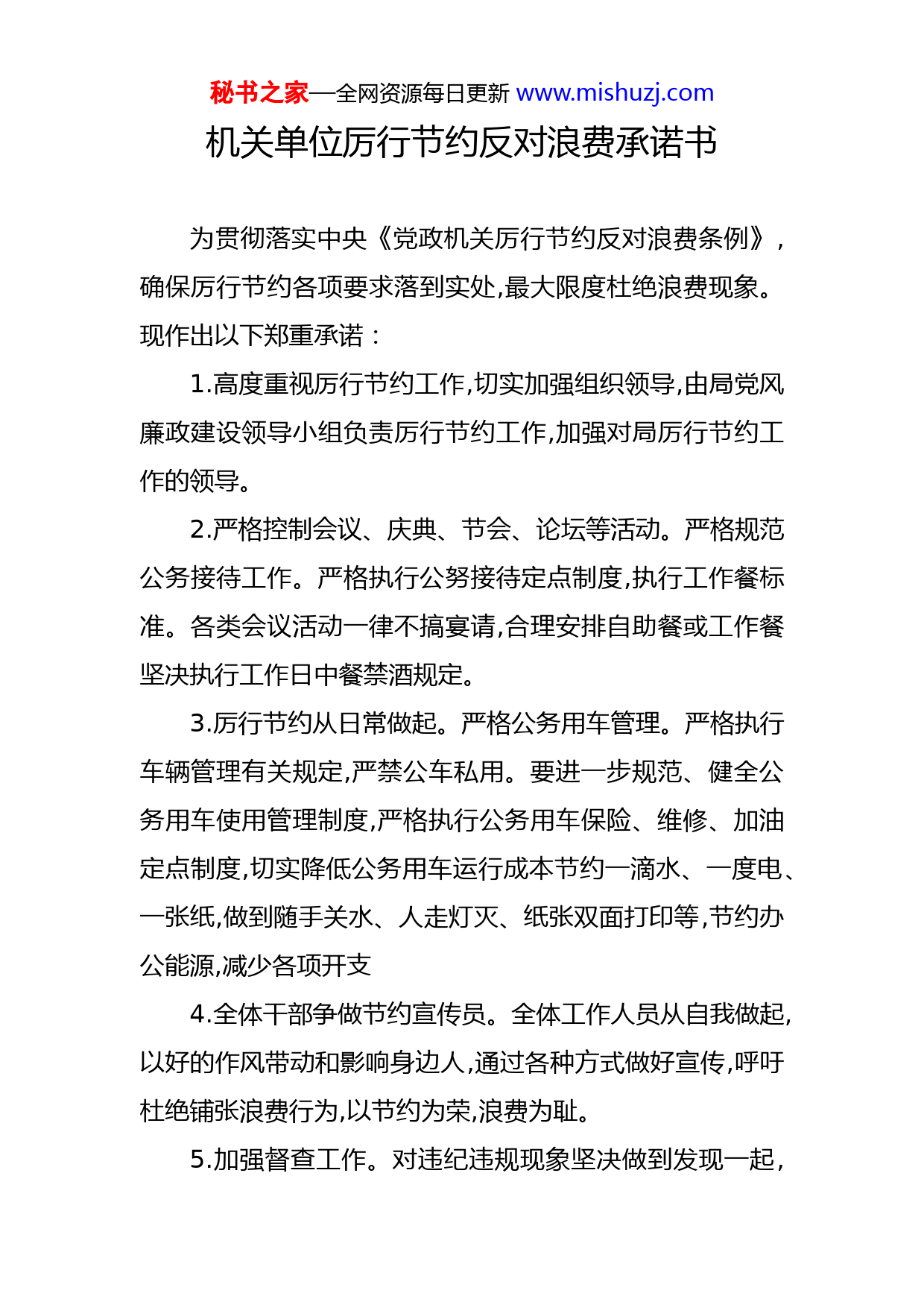 秘书之家—全网资源每日更新www.mishuzj.com机关单位厉行节约反对浪费承诺书为贯彻落实中央《党政机关厉行节约反对浪费条例》,确保厉行节约各项要求落到实处,最大限度杜绝浪费现象。现作出以下郑重承诺:1.高度重视厉行节约工作,切实加强组织领导,由局党风廉政建设领导小组负责厉行节约工作,加强对局厉行节约工作的领导。2.严格控制会议、庆典、节会、论坛等活动。严格规范公务接待工作。严格执行公努接待定点制度,执行工作餐标准。各类会议活动一律不搞宴请,合理安排自助餐或工作餐坚决执行工作日中餐禁酒规定。3.厉行节约从日常做起。严格公务用车管理。严格执行车辆管理有关规定,严禁公车私用。要进一步规范、健全公务用车使用管理制度,严格执行公务用车保险、维修、加油定点制度,切实降低公务用车运行成本节约一滴水、一度电、一张纸,做到随手关水、人走灯灭、纸张双面打印等,节约办公能源,减少各项开支4.全体干部争做节约宣传员。全体工作人员从自我做起,以好的作风带动和影响身边人,通过各种方式做好宣传,呼吁杜绝铺张浪费行为,以节约为荣,浪费为耻。5.加强督查工作。对违纪违规现象坚决做到发现一起,秘书之家—全网资源每日更新www.mishuzj.com查处一起,绝不姑息。牢固树立“理财为公、理财为民”理念,局班子成员要发挥带头作用,全体干部要积极响应,立说立行,努力创造财政机关“勤俭、节约、廉政、高效”的良好氛围。以上公开承诺,欢迎广大群众、社会各界、新闻媒体和纪检监察机关进行监督。(监督电话:XXXX)承诺人:XXX20XX年x月Xx日