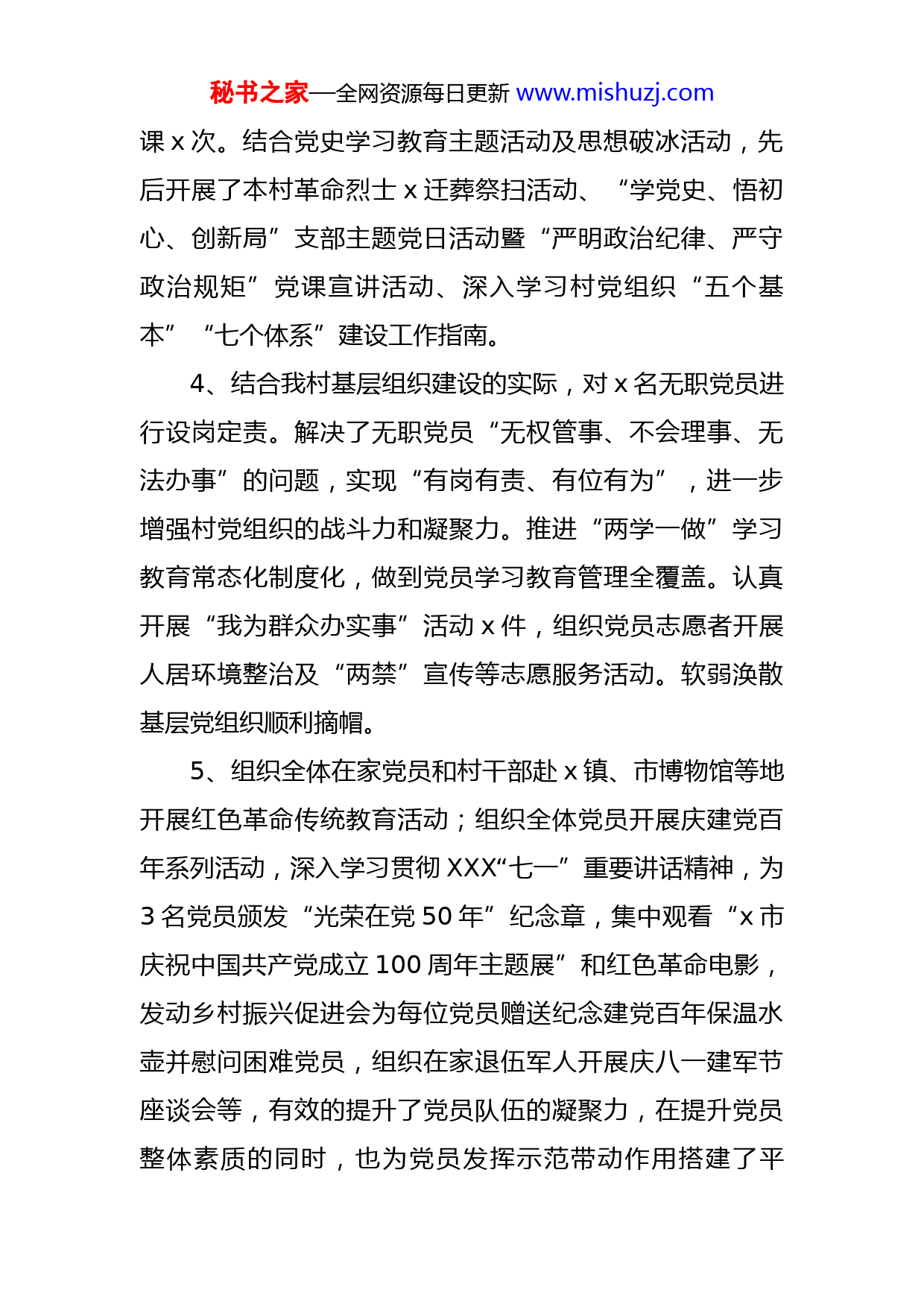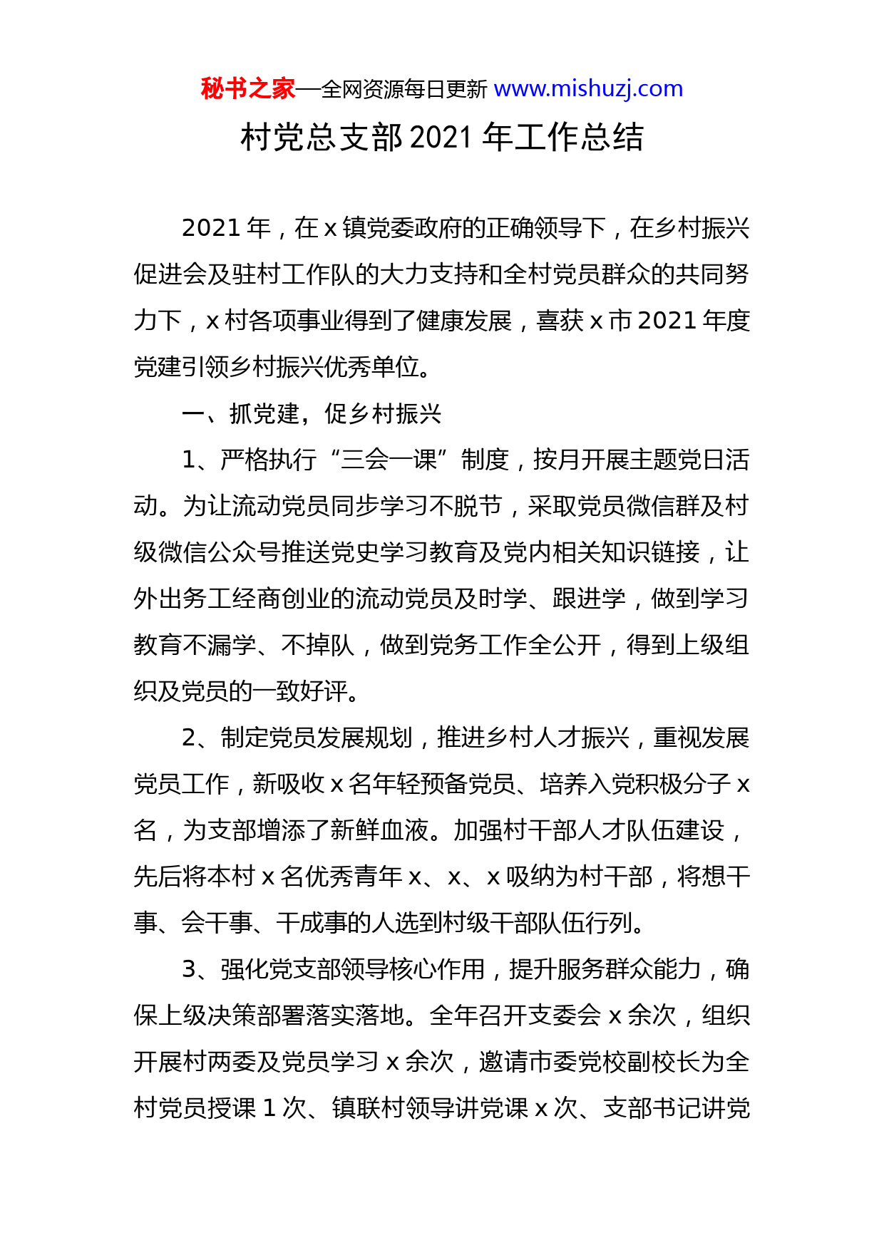 秘书之家—全网资源每日更新www.mishuzj.com村党总支部2021年工作总结2021年,在x镇党委政府的正确领导下,在乡村振兴促进会及驻村工作队的大力支持和全村党员群众的共同努力下,x村各项事业得到了健康发展,喜获x市2021年度党建引领乡村振兴优秀单位。一、抓党建,促乡村振兴1、严格执行“三会一课”制度,按月开展主题党日活动。为让流动党员同步学习不脱节,采取党员微信群及村级微信公众号推送党史学习教育及党内相关知识链接,让外出务工经商创业的流动党员及时学、跟进学,做到学习教育不漏学、不掉队,做到党务工作全公开,得到上级组织及党员的一致好评。2、制定党员发展规划,推进乡村人才振兴,重视发展党员工作,新吸收x名年轻预备党员、培养入党积极分子x名,为支部增添了新鲜血液。加强村干部人才队伍建设,先后将本村x名优秀青年x、x、x吸纳为村干部,将想干事、会干事、干成事的人选到村级干部队伍行列。3、强化党支部领导核心作用,提升服务群众能力,确保上级决策部署落实落地。全年召开支委会x余次,组织开展村两委及党员学习x余次,邀请市委党校副校长为全村党员授课1次、镇联村领导讲党课x次、支部书记讲党秘书之家—全网资源每日更新www.mishuzj.com课x次。结合党史学习教育主题活动及思想破冰活动,先后开展了本村革命烈士x迁葬祭扫活动、“学党史、悟初心、创新局”支部主题党日活动暨“严明政治纪律、严守政治规矩”党课宣讲活动、深入学习村党组织“五个基本”“七个体系”建设工作指南。4、结合我村基层组织建设的实际,对x名无职党员进行设岗定责。解决了无职党员“无权管事、不会理事、无法办事”的问题,实现“有岗有责、有位有为”,进一步增强村党组织的战斗力和凝聚力。推进“两学一做”学习教育常态化制度化,做到党员学习教育管理全覆盖。认真开展“我为群众办实事”活动x件,组织党员志愿者开展人居环境整治及“两禁”宣传等志愿服务活动。软弱涣散基层党组织顺利摘帽。5、组织全体在家党员和村干部赴x镇、市博物馆等地开展红色革命传统教育活动;组织全体党员开展庆建党百年系列活动,深入学习贯彻XXX“七一”重要讲话精神,为3名党员颁发“光荣在党50年”纪念章,集中观看“x市庆祝中国共产党成立100周年主题展”和红色革命电影,发动乡村振兴促进会为每位党员赠送纪念建党百年保温水壶并慰问困难党员,组织在家退伍军人开展庆八一建军节座谈会等,有效的提升了党员队伍的凝聚力,在提升党员整体素质的同时,也为党员发挥示范带动作用搭建了平秘书之家—全网资源每日更新www.mishuzj.com台。组织村干部赴调x村及x村学习乡村振兴先进经验。6、按照上级要求对全村党员进行民主评议,对村“两委”及班子个人进行民主测评。评选出2名镇级优秀共产党员、x名优秀党务工作者、x名镇级先进个人。按程序选举产生镇级人大代表4名、镇级党代表x名、市人大代表x名,村支部书记当选为x市第十次党代会代表及XX市第六次党代会代表。7、风往正处引。始终把纪律规矩挺在前面,组织党员学习贯彻《中国共产党纪律处分条例》《中国共产党廉洁自律准则》《中国共产党问责条例》及观看警示教育片,加强党员警示教育和廉政提醒。扎实开展“思想破冰引领发展突围”大研讨活动及专题组织生活会,开展党员批评与自我批评及党风廉政建设宣教月活动,坚持问题整改,针对村干部存在的问题逐一进行谈心谈话,及时为其思想补钙,利用村级微信公众号把党员干部学习体会进行全公开,赢得了党员群众的普遍点赞。8、巩固脱贫攻坚成果和乡村振兴有效衔接工作。2021年,随着第二批工作队的到来,乡村振兴的帷幕正式拉开了。通过开展大走访、大排查,评议出x户突发严重困难监测户,根据监测对象实际困难,分别采取了针对性的帮扶措施,同时对全村x户贫困户严格落实长效帮扶机制。工作队所在单位市委组织部和市人社局就业中心秘书之家—全网资源每日更新www.mishuzj.com领导多次莅临我村调研指导。我们依靠党建引领,加快美丽乡村建设。过程中,我们充分尊重群众意见,严格按照规划设计要求,抓进度更重质量,并以此为示范点和方向标,精心打造美丽乡村,迎来了各级领导来村调研,年前连接路第一二阶段路基和桥梁工程、公路提档升级、组级道路旁安装太阳能路灯、高桥片区太阳能路灯更换电池板、村部广场及百姓舞台建设、泵站升级改造、新建公墓、沟渠清理等民生工程已竣工验收。二、抓防控,促疫苗接种面对常态化疫情防控工作,我村及时成立疫情防控工作领导小组,村干部、驻村工作队及村民小组长全员参与,细化分工,下设综合协调组、返乡人员摸排及社会面管控组、信息统计组、居家隔离管理组、宣传组,实行定人、定岗、定责,全面抓实疫情防控工作。我村在抓好疫情防控的同时,还认真落实园区企业帮招工作,介绍本村在家有意愿工作的劳力就近就业;利用微信小程序广泛发布“x村返乡人员登记码”进行返乡登记,避免无接触登记来(返)乡人员,利用横幅、广播、流动喇叭、微信群、公众号等进行大力宣传并按防控要求督促返乡村民进行核酸检测。期间,镇在我村设点接种疫苗,我村两委全力配合做好服务,村两委班子“私车公用”接送群众接种疫苗,督促二针剂超六个