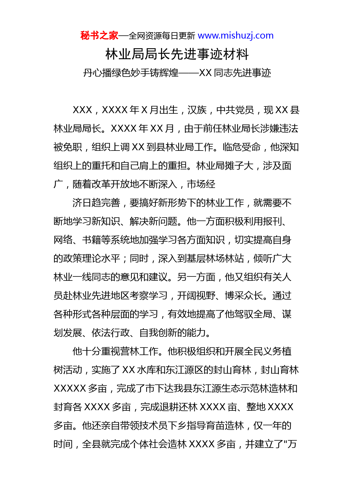 秘书之家—全网资源每日更新www.mishuzj.com林业局局长先进事迹材料丹心播绿色妙手铸辉煌——XX同志先进事迹XXX,XXXX年X月出生,汉族,中共党员,现XX县林业局局长。XXXX年XX月,由于前任林业局长涉嫌违法被免职,组织上调XX到县林业局工作。临危受命,他深知组织上的重托和自己肩上的重担。林业局摊子大,涉及面广,随着改革开放地不断深入,市场经济日趋完善,要搞好新形势下的林业工作,就需要不断地学习新知识、解决新问题。他一方面积极利用报刊、网络、书籍等系统地加强学习各方面知识,切实提高自身的政策理论水平;同时,深入到基层林场林站,倾听广大林业一线同志的意见和建议。另一方面,他又组织有关人员赴林业先进地区考察学习,开阔视野、博采众长。通过各种形式各种层面的学习,有效地提高了他驾驭全局、谋划发展、依法行政、自我创新的能力。他十分重视营林工作。他积极组织和开展全民义务植树活动,实施了XX水库和东江源区的封山育林,封山育林XXXXX多亩,完成了市下达我县东江源生态示范林造林和封育各XXXX多亩,完成退耕还林XXXX亩、整地XXXX多亩。他还亲自带领技术员下乡指导育苗造林,仅一年的时间,全县就完成个体社会造林XXXX多亩,并建立了"万秘书之家—全网资源每日更新www.mishuzj.com亩党员示范林基地",还超额完成了XXXX年X万亩的造林任务。他创新举措,狠抓林政资源管理。实行流动执法与固定执法相结合,采取集中力量、集中时间、各个击破等各种方法狠抓源头管理,有力打击了各类林业违法现象。尤其是XXXX年X月以来,在他的积极争取下,县政府抽调了财政、公检法、劳动人事等部门工作人员,分七组对全县范围内的木材生产及加工企业进行全面整治。重点整治了以“买卖青山”和借果业开发为名乱砍滥伐木竹以及无证采伐、异地采伐、超额采伐木竹等破坏林业资源行为;整治了非法收购、运输和销售木竹行为;整治了非法加工木竹、非法采挖、收购、运输和销售珍贵树木或国家保护植物等行为;全面清查了县内已伐木竹(含加工企业的木竹)是否合法。通过整治,为定南的林业建设创造了良好的发展环境。他巧谋划,严管理,推动XX林改工作顺利进行,成就了XX林业事业的一个传奇。XX的林改起步较晚,历史遗留问题较多,林改资金缺乏,林改面临着重重困难。他积极与有经验的基层林业工作者沟通,虚心向他们请教,为部署定南的林改工作掌握了第一手的资料。他深知,林改工作是一项系统工程,需要各方面各部门的鼎力支持才能顺利进行。他通过借助外力、发挥自己的人格魅力来搅动秘书之家—全网资源每日更新www.mishuzj.com党政领导,积极争取了各级党委政府及其他各部门的支持。他还积极向县里争取林改资金,仅XX年县财政就安排了XX万元林改经费,并列入当年财政预算,确保了林改各项工作顺利进行。面对林业技术人员缺乏的现实,他独辟蹊径,积极和其他县市的林业局沟通,从广东和平及江西大余借来XX名技术员,有效地解决了XX林业技术人员缺乏的问题。他还充分利用电视、广播、报纸、宣传队、墙报等一切宣传媒体,使林改政策家喻户晓、深入人心,把老百姓参与林改的积极性搅动起来,充分依靠调动老百姓的力量来推进林改工作,为林改工作的顺利完成打下了坚实的基础。他积极探索林业产权制度配套改革,在岿美山镇寨头村先行试点工作,组建股份制林场,林场由XX个股东出资注册,采取农户出山入股,由有经济实力的农户统一经营,实行山林权属与经营权分离的形式管理。现已有XXX户农户签约,股份制林场面积达XXXXX亩。林场明确利益分配,坚持集约经营,加强护林管理,生产经营形势明显看好,取得了初步成效。森林防火,责重于山。他根据森林火灾突发性强、危害性大的特点,及时调整了县专业森林消防队,进一步加强了管理和培训,实行半军事化管理,XX小时待命,保证在发生火灾火警时能"召之即来、来之能战、战之能胜”。秘书之家—全网资源每日更新www.mishuzj.com在林业局经费非常紧张的情况下,多方筹集了XX万元资金购置消防物资,为森林防火提供有力保障。自XX他到任以来,全县发生的森林火灾无论是次数还是火灾面积,都比往年大幅度降低,被市政府评为XXXX年度全市森林防火工作先进集体,他自己也被市政府评为先进个人。作为一名领导干部,他时刻保持清醒头脑,严格按照自己所作的廉政承诺,谦虚谨慎,不骄不躁,过好“人情关”、“金钱关”和“吃喝关”。有一次,他的亲叔叔走私木材被执法人员拦下,不得已打电话求情,只听他吼道∶“别找我,找我也要按规定处理”就挂掉了。XX对工作高标准、严要求,对同志他却是手足情深、关爱倍至。XXXX年春节前走访困难职工,每走一家,他都嘘寒问暖,问有什么问题需要解决……,他走到哪里,就把关怀送到哪,把问题解决在哪。慰问中,当他了解到职工XX前要得癌症已故,现要又得癌症,为治病使学习成绩都很优异的两个孩子面临失学时,当即拍板∶“这两个孩子今后我来资助”。开学时他把一叠钱如期送到XX手里,XX一家感动得热泪盈眶。XXXX年底,刚刚到林业局工作的XX同志得知上寨林场党支部书记XX被检查出患有白血病,急需到北京治疗,他又着急又心疼,马上向全系统干部职工倡议,并率先捐出XXXX元钱,在他的影响和带动下,大家纷纷伸出援助之手,共捐到了X万余元,为XXX治病解
