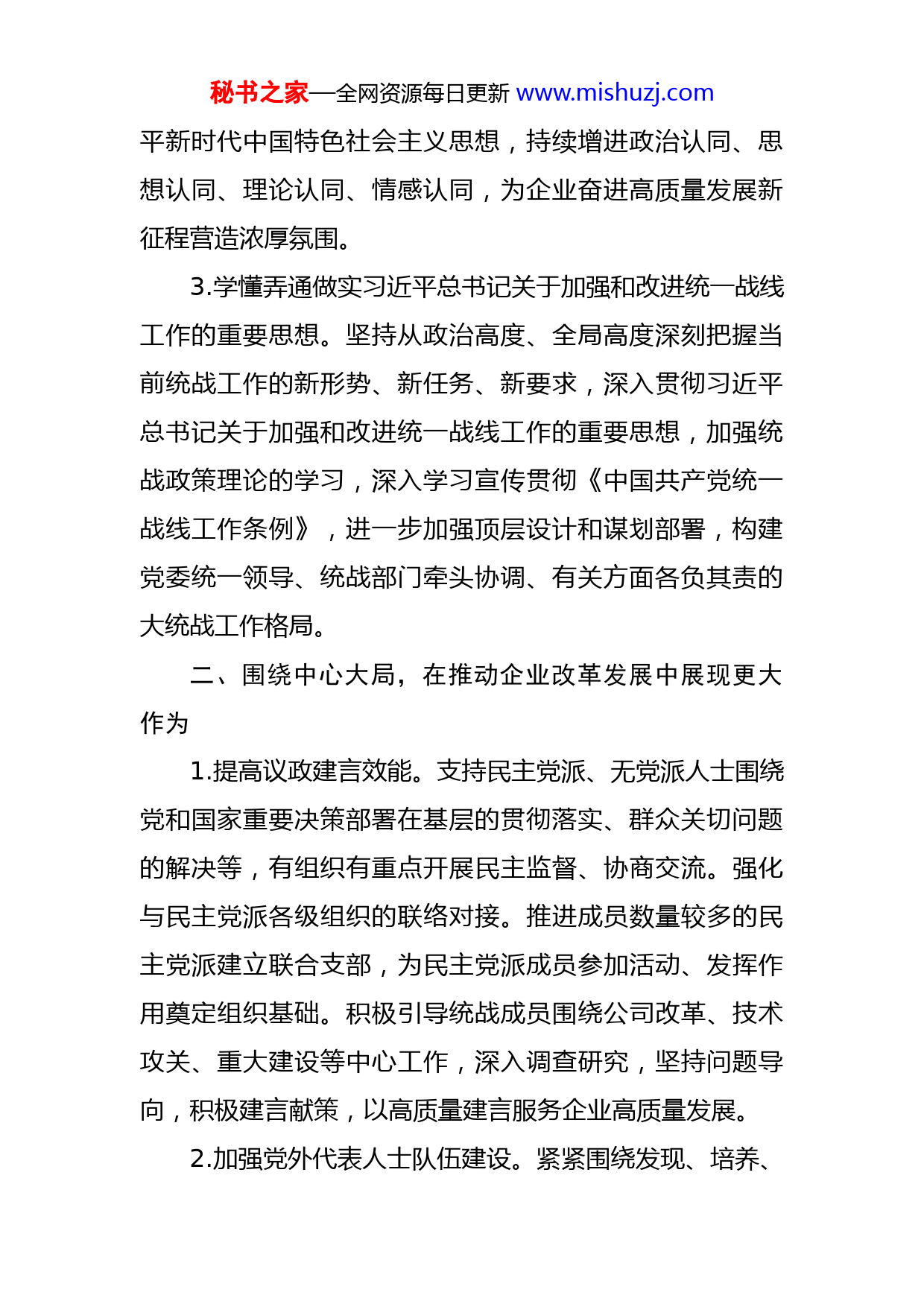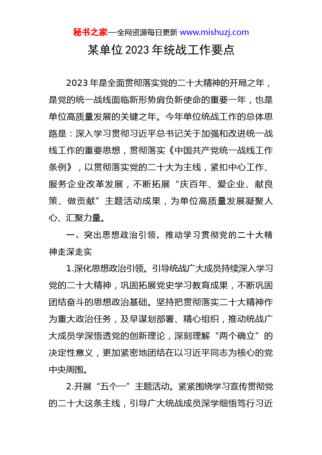 秘书之家—全网资源每日更新www.mishuzj.com某单位2023年统战工作要点2023年是全面贯彻落实党的二十大精神的开局之年,是党的统一战线面临新形势肩负新使命的重要一年,也是单位高质量发展的关键之年。今年单位统战工作的总体思路是:深入学习贯彻习近平总书记关于加强和改进统一战线工作的重要思想,贯彻落实《中国共产党统一战线工作条例》,以贯彻落实党的二十大为主线,紧扣中心工作、服务企业改革发展,不断拓展“庆百年、爱企业、献良策、做贡献”主题活动成果,为单位高质量发展凝聚人心、汇聚力量。一、突出思想政治引领,推动学习贯彻党的二十大精神走深走实1.深化思想政治引领。引导统战广大成员持续深入学习党的二十大精神,巩固拓展党史学习教育成果,不断巩固团结奋斗的思想政治基础。坚持把贯彻落实二十大精神作为重大政治任务,及早谋划部署、精心组织,推动统战广大成员学深悟透党的创新理论,深刻理解“两个确立”的决定性意义,更加紧密地团结在以习近平同志为核心的党中央周围。2.开展“五个一”主题活动。紧紧围绕学习宣传贯彻党的二十大这条主线,引导广大统战成员深学细悟笃行习近秘书之家—全网资源每日更新www.mishuzj.com平新时代中国特色社会主义思想,持续增进政治认同、思想认同、理论认同、情感认同,为企业奋进高质量发展新征程营造浓厚氛围。3.学懂弄通做实习近平总书记关于加强和改进统一战线工作的重要思想。坚持从政治高度、全局高度深刻把握当前统战工作的新形势、新任务、新要求,深入贯彻习近平总书记关于加强和改进统一战线工作的重要思想,加强统战政策理论的学习,深入学习宣传贯彻《中国共产党统一战线工作条例》,进一步加强顶层设计和谋划部署,构建党委统一领导、统战部门牵头协调、有关方面各负其责的大统战工作格局。二、围绕中心大局,在推动企业改革发展中展现更大作为1.提高议政建言效能。支持民主党派、无党派人士围绕党和国家重要决策部署在基层的贯彻落实、群众关切问题的解决等,有组织有重点开展民主监督、协商交流。强化与民主党派各级组织的联络对接。推进成员数量较多的民主党派建立联合支部,为民主党派成员参加活动、发挥作用奠定组织基础。积极引导统战成员围绕公司改革、技术攻关、重大建设等中心工作,深入调查研究,坚持问题导向,积极建言献策,以高质量建言服务企业高质量发展。2.加强党外代表人士队伍建设。紧紧围绕发现、培养、秘书之家—全网资源每日更新www.mishuzj.com使用、管理四个环节,建立组织部门与统战部门协同配合、定期沟通协商机制,做到党外优秀人才早发现、早储备、早培养、早使用,优化党外代表人士队伍结构。继续深化党委领导班子成员与党外代表人士联谊交友,规范党外干部的推荐提拔、年度考核、日常管理等工作,全面了解德、能、勤、绩、廉状况,积极促进党外代表人士发挥作用。畅通沟通交流渠道,进一步团结支持党外知识分子立足本职岗位建功立业、聚焦中心大局献计出力。3.做好民族团结及宗教工作。紧紧围绕铸牢中华民族共同体意识,深入学习领会新时代党的民族宗教工作方针政策,切实增强做好民族宗教工作的政治意识和使命担当。做好定点帮扶相关工作,助力定点帮扶地区乡村振兴、民生改善,促进共同富裕。加强风险防范,牢牢守住不发生涉民族宗教因素重大突发事件和网络舆情事件的底线。三、压实政治责任,全面加强党对统战工作的领导1.肩负起巩固和发展统一战线的政治责任。各级党委要自觉扛起主体责任,将习近平总书记关于统战工作的最新重要讲话和指示批示精神列入党委会“第一议题”和党委理论学习中心组学习的主要内容,定期研究统战重大问题、部署安排统战重点工作。深入构建“大统战”工作格局,将统战工作纳入党建责任制考核,督促层层压实工作责任,形成工作合力。秘书之家—全网资源每日更新www.mishuzj.com2.加强统战部门自身建设。强化统战力量配备,从组织设置、岗位职责、人员分工等方面织密基层统战工作网络。分层分批开展统战干部政策和业务培训,将统战工作纳入基层党务干部培训课程,不断提高各级统战干部的政治素养、理论水平和专业能力。运用信息化手段为统战工作赋能,按照统一安排,积极组织党务干部参加统战政策法规的学习内容。做好统战工作基础工作,围绕新时代统战工作新特点新任务,加强理论研究和宣传政策、解疑释惑工作,促进统战工作与业务工作深度融合,推动新时代统战工作高质量发展。