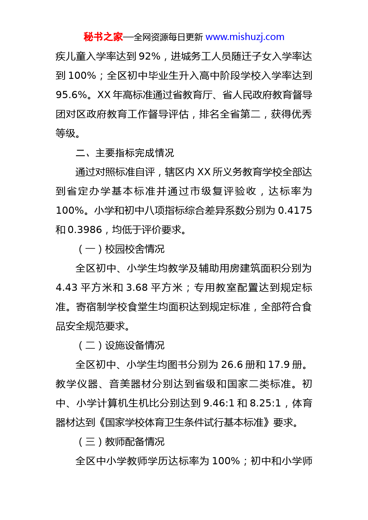 秘书之家—全网资源每日更新www.mishuzj.com某县义务教育均衡发展工作情况汇报尊敬的各位领导、各位专家:首先,我代表XX区委、区政府对督导组一行莅临我区检查指导工作表示热烈的欢迎!根据督导评估要求,下面,就我区推进义务教育均衡发展工作汇报如下,不妥之处,恳请各位领导和专家批评指正。一、全区及教育基本情况XX区是XX市政府所在地,也是全市政治、经济、文化中心。全区总面积3386平方公里,现辖XX个乡镇、XX个社区、XX个行政村,总人口40.88万人(不含流动暂住人口),其中农业人口22.24万人。XX年全区城市化率达到63.8%;全区生产总值XX亿元,增长13.6%;财政总收入10.3亿元,增长24%;城镇居民人均可支配收入22400元,增长11.65%;农民人均纯收入10467元,增长12.13%。目前,辖区内有义务教育阶段学校XX所(含市直学校5所),其中小学XX所,初中7所,九年一贯制学校7所,完全中学1所。义务教育阶段学生有XX人(初中XX人,小学XX人),教职工XX人,专任教师XX人(初中1183人,小学XX人)。全区小学入学率、巩固率均达100%;初中入学率达到100%,巩固率达到99.1%;残秘书之家—全网资源每日更新www.mishuzj.com疾儿童入学率达到92%,进城务工人员随迁子女入学率达到100%;全区初中毕业生升入高中阶段学校入学率达到95.6%。XX年高标准通过省教育厅、省人民政府教育督导团对区政府教育工作督导评估,排名全省第二,获得优秀等级。二、主要指标完成情况通过对照标准自评,辖区内XX所义务教育学校全部达到省定办学基本标准并通过市级复评验收,达标率为100%。小学和初中八项指标综合差异系数分别为0.4175和0.3986,均低于评价要求。(一)校园校舍情况全区初中、小学生均教学及辅助用房建筑面积分别为4.43平方米和3.68平方米;专用教室配置达到规定标准。寄宿制学校食堂生均面积达到规定标准,全部符合食品安全规范要求。(二)设施设备情况全区初中、小学生均图书分别为26.6册和17.9册。教学仪器、音美器材分别达到省级和国家二类标准。初中、小学计算机生机比分别达到9.46:1和8.25:1,体育器材达到《国家学校体育卫生条件试行基本标准》要求。(三)教师配备情况全区中小学教师学历达标率为100%;初中和小学师秘书之家—全网资源每日更新www.mishuzj.com生比分别为1:13.37和1:15.11,专任教师高于规定学历分别占到74.48%和92.46%;中级及以上专业技术教师分别占48.19%和34.95%。中小学校际间教师结构均衡,均达到了省定标准。(四)经费投入情况XX年-XX年,义务教育预算内经费拨款分别为XX万元、XX万元、XX万元和XX万元,三年增长比例分别为29.0%、22.3%和19.4%;生均预算内教育事业费逐年增长,初中分别为XX元、5840.2元、8965.3元和XX元,小学分别为XX元、4338.8元、4427.1元和5255.4元;生均公用经费实现逐年增长,初中分别为2865.4元、2555.6元、2966.5元、3425.6元,小学分别为762.9元、1570.7元、821.2元和921.7元;教师工资逐年提高,教育附加足额征收并拨付。(五)质量提升情况全区小学六年和初中三年巩固率分别是100%和99.1%;学生学业成绩合格率小学达到100%、初中达到98%;初中物理、化学、生物实验操作合格率达到93.6%。初中毕业生升入高中阶段的比例达到95.6%,普通高中招生计划按40%比例分配到各初中学校。小学、初中生体质健康合格率分别为98.41%、98.1%。认真落实各项惠民政策,XX年各类减、免、奖、补资金达到XX万秘书之家—全网资源每日更新www.mishuzj.com元,受益学生达XX人次。三、所做的工作按照紧盯重点、力补弱点、主攻难点、打造亮点的工作思路,坚持争取项目和加大政府投入“两条腿”走路,使全区义务教育均衡发展取得了重大突破。(一)紧盯硬件均衡重点,全力推进标准化学校建设。近三年,全区共投入资金2.3亿元,着力实施城区学校扩容改造、农村薄弱学校改造和运动场提升改造三大工程,新建改扩建学校17所,全区标准化学校建成率达到100%。一是实施城区学校扩容工程。完成了XXX中、XX中、XX小学等7所学校改扩建任务,新增城区义务教育学位XX个。特别是XX年,市、区两级政府一次性投资XX万元,购买了一所停办三年的民办学校——XXX学校(XXX中),又投入资金近2000万元进行了改造提升,完成了XX中的整体搬迁,进一步优化了城区学校布局。二是实施农村薄弱学校改造工程。新建农村学校教学楼、综合楼5栋,公寓楼11栋,食堂13栋,教师周转宿舍244套。目前,全区XX个乡镇保留的初中和中心小学全部达到了省级标准化学校办学标准。三是实施学校运动场改造工程。改造了23所城乡学校运动场,面积约18万平方米(其中6所学校为塑胶运动场,面积5.7万平方米),城秘书之家—全网资源每日更新www.mishuzj.com乡学校办学条件进一步改善。特别是对城区6所学校的运动场建设和环境卫生综合整治,既方便了学生的体育教学,又美化了城市环境,成为去年城市建设管理的新亮点。(二)力补教育装备弱点,着力缩小城乡学校办学差距。近三年,全区在教育设施设备、信息化发展等方面共投入资金XX万元,学校现代化教育装备水平得到大力提升。全区中小学新增电脑XX台,图书36.5万册,音体美教学设备7万余件,实验仪器设备2592台(套),装备计算机教室、标准化实验室194间,“班班通”教室930间。特别是今年,区政府一次性投资XX万元,为城市中小学、农村寄宿制学校装备了高标准液晶触控一体机“班班通”设备,是区政府承诺的十件惠民实事之一,建起