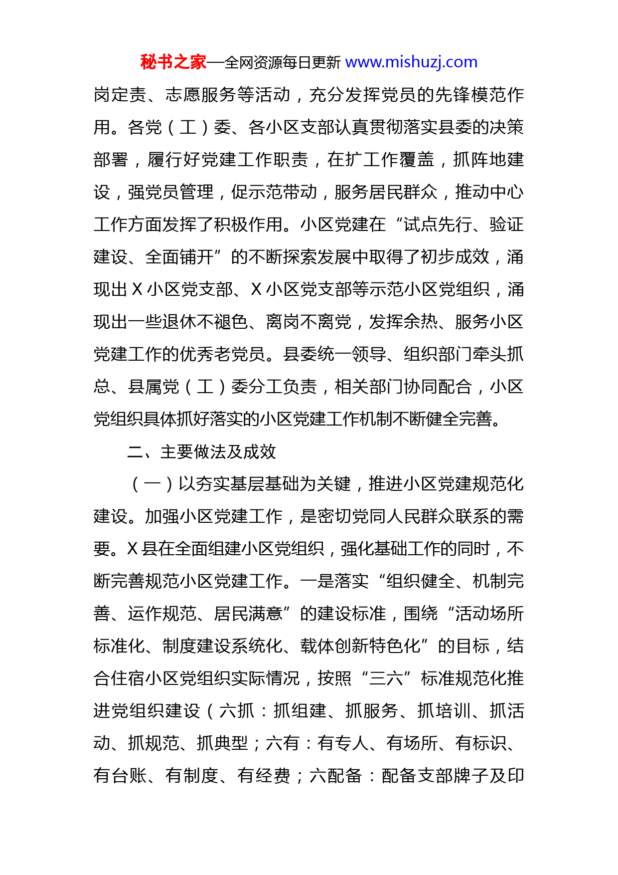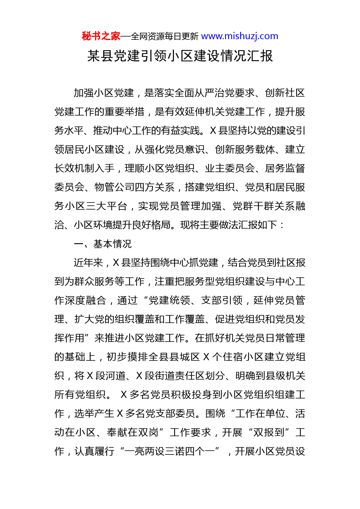 秘书之家—全网资源每日更新www.mishuzj.com某县党建引领小区建设情况汇报加强小区党建,是落实全面从严治党要求、创新社区党建工作的重要举措,是有效延伸机关党建工作,提升服务水平、推动中心工作的有益实践。X县坚持以党的建设引领居民小区建设,从强化党员意识、创新服务载体、建立长效机制入手,理顺小区党组织、业主委员会、居务监督委员会、物管公司四方关系,搭建党组织、党员和居民服务小区三大平台,实现党员管理加强、党群干群关系融洽、小区环境提升良好格局。现将主要做法汇报如下:一、基本情况近年来,X县坚持围绕中心抓党建,结合党员到社区报到为群众服务等工作,注重把服务型党组织建设与中心工作深度融合,通过“党建统领、支部引领,延伸党员管理、扩大党的组织覆盖和工作覆盖、促进党组织和党员发挥作用”来推进小区党建工作。在抓好机关党员日常管理的基础上,初步摸排全县县城区X个住宿小区建立党组织,将X段河道、X段街道责任区划分、明确到县级机关所有党组织。X多名党员积极投身到小区党组织组建工作,选举产生X多名党支部委员。围绕“工作在单位、活动在小区、奉献在双岗”工作要求,开展“双报到”工作,认真履行“一亮两设三诺四个一”,开展小区党员设秘书之家—全网资源每日更新www.mishuzj.com岗定责、志愿服务等活动,充分发挥党员的先锋模范作用。各党(工)委、各小区支部认真贯彻落实县委的决策部署,履行好党建工作职责,在扩工作覆盖,抓阵地建设,强党员管理,促示范带动,服务居民群众,推动中心工作方面发挥了积极作用。小区党建在“试点先行、验证建设、全面铺开”的不断探索发展中取得了初步成效,涌现出X小区党支部、X小区党支部等示范小区党组织,涌现出一些退休不褪色、离岗不离党,发挥余热、服务小区党建工作的优秀老党员。县委统一领导、组织部门牵头抓总、县属党(工)委分工负责,相关部门协同配合,小区党组织具体抓好落实的小区党建工作机制不断健全完善。二、主要做法及成效(一)以夯实基层基础为关键,推进小区党建规范化建设。加强小区党建工作,是密切党同人民群众联系的需要。X县在全面组建小区党组织,强化基础工作的同时,不断完善规范小区党建工作。一是落实“组织健全、机制完善、运作规范、居民满意”的建设标准,围绕“活动场所标准化、制度建设系统化、载体创新特色化”的目标,结合住宿小区党组织实际情况,按照“三六”标准规范化推进党组织建设(六抓:抓组建、抓服务、抓培训、抓活动、抓规范、抓典型;六有:有专人、有场所、有标识、有台账、有制度、有经费;六配备:配备支部牌子及印秘书之家—全网资源每日更新www.mishuzj.com章、党旗、桌椅、书报架、民情意见箱、党务公开栏),不断完善住宿小区党组织阵地建设及工作规范。二是健全沟通协调、督促检查等制度,由县委组织部牵头,金碧镇党委和小区党建工作主责单位共同参与,定期开展小区党建工作情况现场观摩、评比学习,定期召开小区党建工作联席会议,及时发现和研究解决小区党建工作中存在的突出问题,强化工作责任,形成上下联动、条块结合、共同推进的良好局面。(二)以全面从严治党为遵循,提升小区党组织的凝聚力战斗力。小区党组织是党和政府联系群众的桥梁和纽带,担负着宣传、组织、团结、服务群众,把党的路线方针政策落实到基层的重要责任。一是坚持从严管理树形象,活动吸引聚合力。按照住宿小区党组织设置和城区河道、街道卫生责任区划分,积极组织发动党员参与到城乡环境治理、文明行为劝导、社会治安防范、精神文明创建等各项中心工作中去。其中,在疫情防控期间,全县各级各部门积极配合村(社区)组建党员先锋队X支、设立党员先锋岗X个,有序开展疫情防控各项工作,实现无遗漏、零感染防控目标。二是进一步建立健全物业管理公司与居民小区党组织议事机制,树立共同为民服务的宗旨意识,针对居民小区内各类民生实际问题,提出切实可行的工作措施并迅速落实。截至目前,有效解决小区院内车辆秘书之家—全网资源每日更新www.mishuzj.com乱停、下水道堵塞等问题X多件,发现并调解纠纷X件,真正形成齐抓共建的基层治理合力。(三)以提升服务能力为突破,促进发挥党员的先锋模范作用。只有大力加强党组织建设和党员管理,把服务群众作为小区党建的出发点和落脚点,才能得到群众的信任和支持。一是结合住宿小区党支部党建工作的开展,建立民情征集、归纳、受理、服务、反馈、监督一体化的服务体系,在服务中实施管理,在管理中体现服务,突出住宿小区党组织的服务、引领、协助、监督等方面的工作特性,形成组织领导、党员参与、群众配合、共建和谐小区的良好局面。二是根据党员志愿者的工作和生活情况以及小区实际,组建志愿服务队,紧扣三月文明礼貌月、五月防灾减灾日、七一建党节、九九敬老节、十二月法制宣传周等特定时间节点,围绕政策理论宣传、物管收费协助、环境卫生整治、园林绿化管护、矛盾纠纷调解、法律政策咨询、小区治安联防、健康知识宣讲、乱停乱放劝导、廉洁自律提醒等内容,组织开展各类主题志愿服务活动,教育引导党员落实好“两学一做”各项要求,把握“做”之关键,在合格基础上争当优秀,经受实践