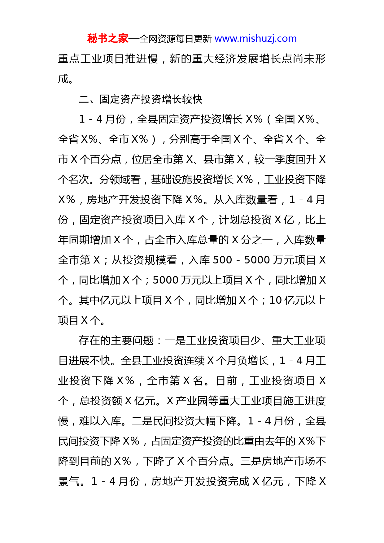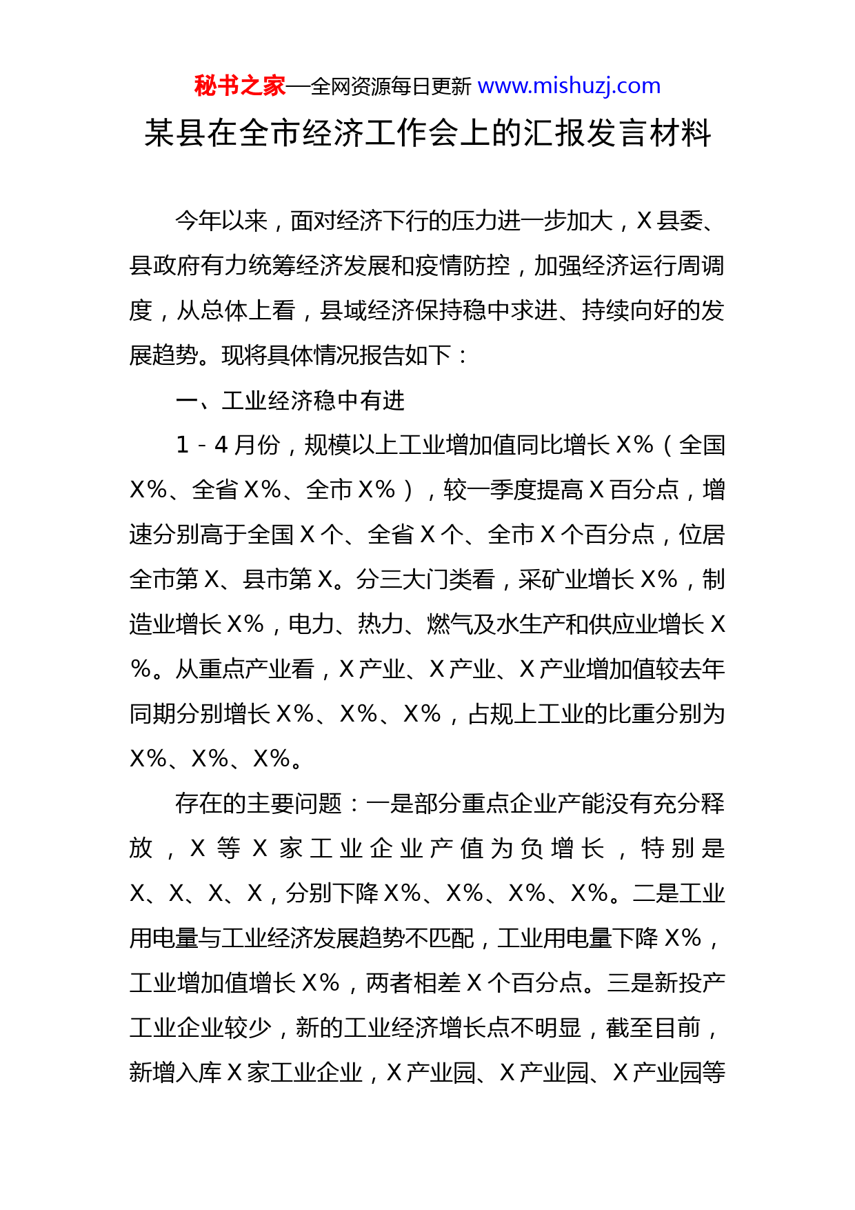 秘书之家—全网资源每日更新www.mishuzj.com某县在全市经济工作会上的汇报发言材料今年以来,面对经济下行的压力进一步加大,X县委、县政府有力统筹经济发展和疫情防控,加强经济运行周调度,从总体上看,县域经济保持稳中求进、持续向好的发展趋势。现将具体情况报告如下:一、工业经济稳中有进1-4月份,规模以上工业增加值同比增长X%(全国X%、全省X%、全市X%),较一季度提高X百分点,增速分别高于全国X个、全省X个、全市X个百分点,位居全市第X、县市第X。分三大门类看,采矿业增长X%,制造业增长X%,电力、热力、燃气及水生产和供应业增长X%。从重点产业看,X产业、X产业、X产业增加值较去年同期分别增长X%、X%、X%,占规上工业的比重分别为X%、X%、X%。存在的主要问题:一是部分重点企业产能没有充分释放,X等X家工业企业产值为负增长,特别是X、X、X、X,分别下降X%、X%、X%、X%。二是工业用电量与工业经济发展趋势不匹配,工业用电量下降X%,工业增加值增长X%,两者相差X个百分点。三是新投产工业企业较少,新的工业经济增长点不明显,截至目前,新增入库X家工业企业,X产业园、X产业园、X产业园等秘书之家—全网资源每日更新www.mishuzj.com重点工业项目推进慢,新的重大经济发展增长点尚未形成。二、固定资产投资增长较快1-4月份,全县固定资产投资增长X%(全国X%、全省X%、全市X%),分别高于全国X个、全省X个、全市X个百分点,位居全市第X、县市第X,较一季度回升X个名次。分领域看,基础设施投资增长X%,工业投资下降X%,房地产开发投资下降X%。从入库数量看,1-4月份,固定资产投资项目入库X个,计划总投资X亿,比上年同期增加X个,占全市入库总量的X分之一,入库数量全市第X;从投资规模看,入库500-5000万元项目X个,同比增加X个;5000万元以上项目X个,同比增加X个。其中亿元以上项目X个,同比增加X个;10亿元以上项目X个。存在的主要问题:一是工业投资项目少、重大工业项目进展不快。全县工业投资连续X个月负增长,1-4月工业投资下降X%,全市第X名。目前,工业投资项目X个,总投资额X亿元。X产业园等重大工业项目施工进度慢,难以入库。二是民间投资大幅下降。1-4月份,全县民间投资下降X%,占固定资产投资的比重由去年的X%下降到目前的X%,下降了X个百分点。三是房地产市场不景气。1-4月份,房地产开发投资完成X亿元,下降X秘书之家—全网资源每日更新www.mishuzj.com%;房屋新开工面积X万平方米,下降X%;商品房销售面积X万平方米,下降X%。三、消费品市场增速回落1-4月份,社会消费品零售总额X亿元,增长X%(全国X%、全省X%、全市X%),高于全国X个百分点、高于全省X个百分点,低于全市X个百分点,较一季度回落X个百分点,增速位居全市第X、县市第X。其中,限额以上单位消费品零售额完成X亿元,同比增长X%。存在的主要问题:一是入库企业块头较小。限额以上企业对消费品市场的支撑作用不强,我县X家限额以上企业中,零售业共X家,占全县限额以上企业数量的X%,没有单月零售额超X万元的企业。二是疫情对住宿餐饮行业的影响较大,X家住宿餐饮企业中,X家是负增长,X有限公司、X有限公司、X有限公司,分别下降X%、X%、X%。三是增速评估因素不支撑。商业增值税增速X%(全市第X)、车辆购置税增速X%(全市第X),影响了社消增速的评估。四、现代服务业增势较好1-4月份,规模以上服务业营业收入完成X亿元,增长X%。其中,互联网服务增长X%,科学研究和技术服务业增长X%,其他运输业增长X%。其他营利性服务业增长X%,其中,居民修理服务业增长X%,商务租赁服务业增秘书之家—全网资源每日更新www.mishuzj.com长X%,文化体育和娱乐业增长X%。存在的主要问题:一是疫情对文化体育娱乐业和商务租赁服务业影响较大,X电影有限公司、X租赁有限公司、X管理有限公司营业收入同比分别下降X%、X%、X%。电影有限公司停业累计超过X天(今年1月份停业10天,3月19日停业到现在未营业),营业时间短,营业收入较往期大幅下降。X租赁有限公司用X人次减少,营业收入下降。X管理有限公司,鉴于疫情防控的严峻形势,物流运输订单减少,承运量下滑;交通不畅增加运输成本,企业盈利减少。二是重点企业少规模小,中小企业多,缺少龙头企业带动是阻碍服务业高质量发展的基本因素。现有龙头企业后劲不足,中小企业发展缓慢,小企业多且规模过小。五、财税金融运行平稳1-4月份,一般公共预算收入完成X亿元,增长X%;其中,税收完成X亿元,同比下降X%;税比为X%。在全省X县市中,总量排名第X位,增速排名第X位。在X县市中,总量第X、增速第X。一般公共预算支出完成X亿元,增长X%。县域金融机构存款余额X亿元,比年初增加X亿元,增长X%,增速全市第X。各项贷款余额X亿元,比年初增加X亿元,增长X%,增速全市第X。金融机构存贷比为X秘书之家—全网资源每日更新www.mishuzj.com%,全市第X,高于全市X个百分点。截至4月末,个人消费贷款余额X亿元,同比增长X%为圆满实现全年经济发展预期目标,针对下一步经济运行提出以下四条建议:一是抓项目进度。“大抓工业,抓大工业”,把工业产业项目作为今年经济稳增长的主抓手,聚焦X、X、X、等重大项目推进,提高复工复产整体效益和水平。二是抓产能释放。抓好跟踪服务和督察督办,延续实施部分阶段性减税降费政策的同时,精准实施对中小微企业、个体工商户减税降费,进一步打通生产“堵点”;加大信贷资