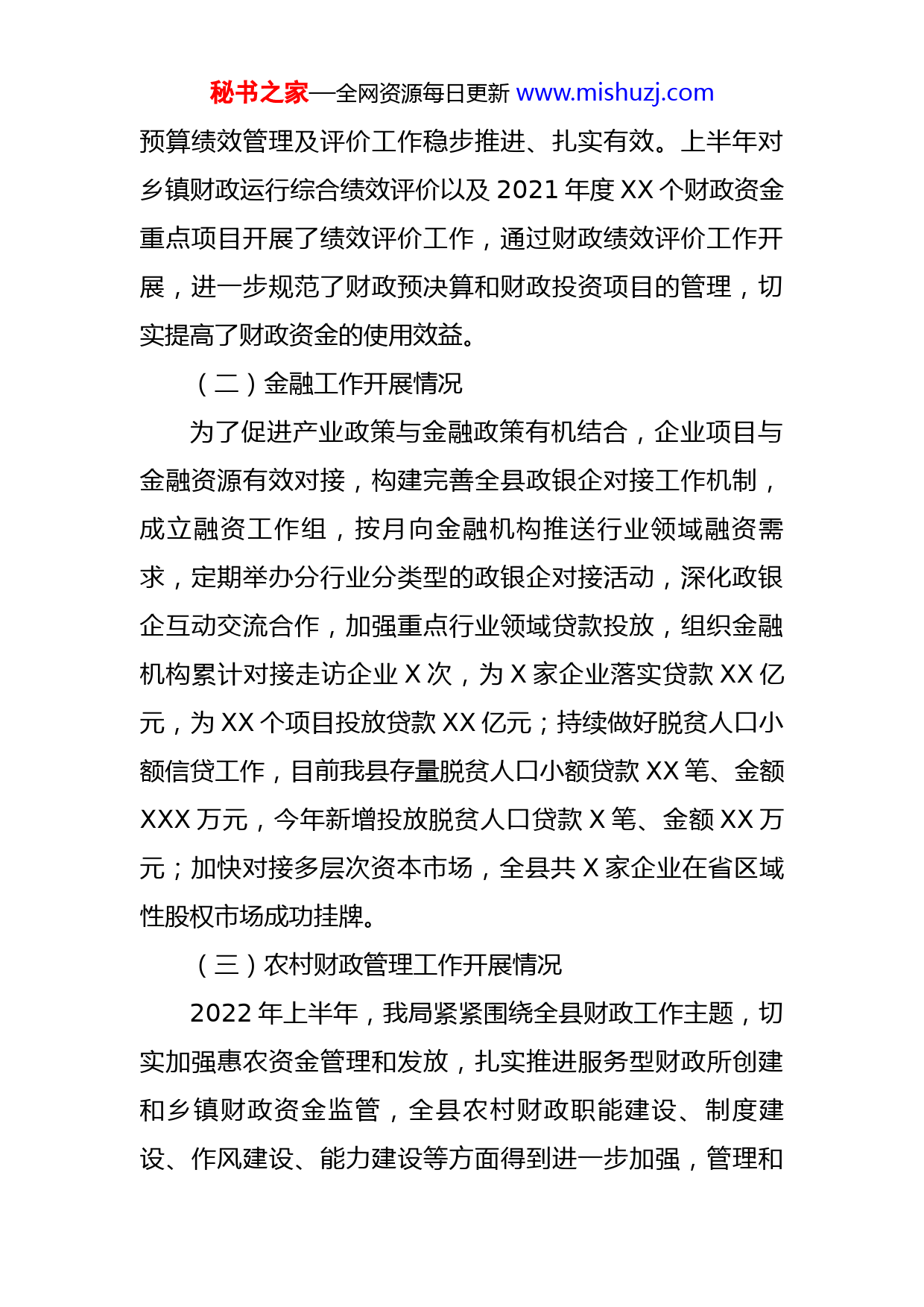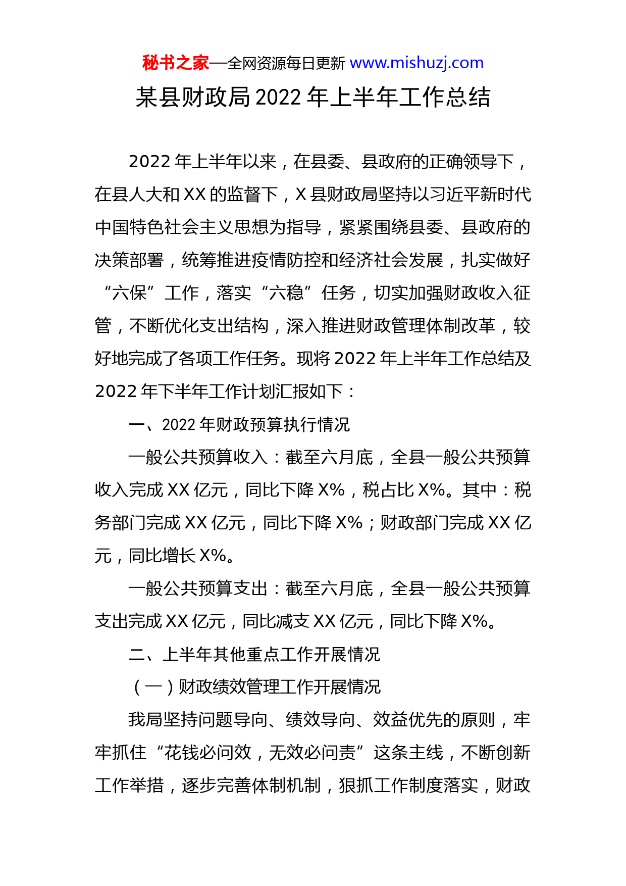 秘书之家—全网资源每日更新www.mishuzj.com某县财政局2022年上半年工作总结2022年上半年以来,在县委、县政府的正确领导下,在县人大和XX的监督下,X县财政局坚持以习近平新时代中国特色社会主义思想为指导,紧紧围绕县委、县政府的决策部署,统筹推进疫情防控和经济社会发展,扎实做好“六保”工作,落实“六稳”任务,切实加强财政收入征管,不断优化支出结构,深入推进财政管理体制改革,较好地完成了各项工作任务。现将2022年上半年工作总结及2022年下半年工作计划汇报如下:一、2022年财政预算执行情况一般公共预算收入:截至六月底,全县一般公共预算收入完成XX亿元,同比下降X%,税占比X%。其中:税务部门完成XX亿元,同比下降X%;财政部门完成XX亿元,同比增长X%。一般公共预算支出:截至六月底,全县一般公共预算支出完成XX亿元,同比减支XX亿元,同比下降X%。二、上半年其他重点工作开展情况(一)财政绩效管理工作开展情况我局坚持问题导向、绩效导向、效益优先的原则,牢牢抓住“花钱必问效,无效必问责”这条主线,不断创新工作举措,逐步完善体制机制,狠抓工作制度落实,财政秘书之家—全网资源每日更新www.mishuzj.com预算绩效管理及评价工作稳步推进、扎实有效。上半年对乡镇财政运行综合绩效评价以及2021年度XX个财政资金重点项目开展了绩效评价工作,通过财政绩效评价工作开展,进一步规范了财政预决算和财政投资项目的管理,切实提高了财政资金的使用效益。(二)金融工作开展情况为了促进产业政策与金融政策有机结合,企业项目与金融资源有效对接,构建完善全县政银企对接工作机制,成立融资工作组,按月向金融机构推送行业领域融资需求,定期举办分行业分类型的政银企对接活动,深化政银企互动交流合作,加强重点行业领域贷款投放,组织金融机构累计对接走访企业X次,为X家企业落实贷款XX亿元,为XX个项目投放贷款XX亿元;持续做好脱贫人口小额信贷工作,目前我县存量脱贫人口小额贷款XX笔、金额XXX万元,今年新增投放脱贫人口贷款X笔、金额XX万元;加快对接多层次资本市场,全县共X家企业在省区域性股权市场成功挂牌。(三)农村财政管理工作开展情况2022年上半年,我局紧紧围绕全县财政工作主题,切实加强惠农资金管理和发放,扎实推进服务型财政所创建和乡镇财政资金监管,全县农村财政职能建设、制度建设、作风建设、能力建设等方面得到进一步加强,管理和秘书之家—全网资源每日更新www.mishuzj.com服务水平获得进一步提升。上半年,我县惠农补贴“一卡通”系统的补贴项目覆盖XX大类XX小项X个批次,发放补贴资金约XXX万元,惠及XX万人(户),村级资金系统办理支付业务XXX笔,支付资金XX万元。同时注重加强建立有效的考评机制,采取“日常考核+季度考核+重点工作”方式对乡镇财政惠农补贴“一卡通”发放管理、工资管理、固定报表报送、信息报送、效能建设等进行绩效考评,极大地提高了基层财政的管理质效。(四)国有资产监督管理工作开展情况根据市财政局(国资委)的工作布置,我局按计划完成了全县XX户国有企业和X户集体企业财务决算。按月审核国资委、财政部统一报表系统中涉及我县的XX户快报企业的上报工作。我局获得市国资委国有资产2021年统计工作先进单位,有多位同志获得先进个人称号。同时认真开展了国企改革三年行动工作,XX年根据省、市国企改革三年行动实施方案精神,根据《XX县国企改革三年行动实施方案》《关于成立XX县国企改革工作领导小组的通知》《XX县国企改革三年行动实施方案改革任务清单》(X办发【XX】XX号),我县国企改革三年行动共XX项任务,2022年涉及XX项,按照“2022年完成总任务XX%以上、2022年上半年基本收官”的总体目标,截至目前,已完成XX项,总体任务完成率达XX%。秘书之家—全网资源每日更新www.mishuzj.com(五)“三公”经费管理工作开展情况根据市财政局《关于开展XX年度“三公”经费支出自查工作的通知》要求,我局于X月份开展了2022年三公经费检查工作。按照XX省财政厅关于报送“三公经费”和会议费支出统计报表的通知(财行[XX]X号)的要求,我局于每月X号前汇总上报全县所有行政事业单位使用一般公共预算支出的三公经费数,并与上年同期做对比、做分析。截至月底,我县“三公”经费支出XX万元,与上年同期XX万元相比增长X%。增长主要原因:油价上涨及X月份以来疫情防控督查等业务增加,造成机关事务管理中心公务用车油费比同期增加了XX万,交通局公务用车费用增加了XX万元,公安局由于油价上涨及从去年下半年开始加大日常巡逻力度及报账时间节点不同,油费同比增加约XX万元等。(六)债务管理工作开展情况在过去的半年里,我局在省市财政部门指导下,有序开展债务管理工作,XX年我县新申报X个项目纳入专项债券储备库管理,专项债券资金需求X亿元。按照项目建设资金需求,结合省财政厅债券发行计划,我县于X月份完成全年债券发行工作,共计发行专项债券XX亿元,其中一般债券XX亿元,专项债券XX亿元,有力地支持了我县经济发展。按照省财政厅还款计划,我县2022年X-X月份秘书之家—全网资源每日更新www.mishuzj.com需偿还XX亿元,截至目前我局已完成。(七)党建工作开展情况上半年,我局以习近平新时代中国特色社会主义思想为指导,全面贯彻落实新时代党的建设总体要求和新时代党的组