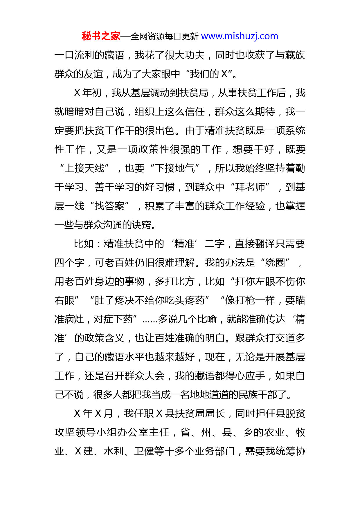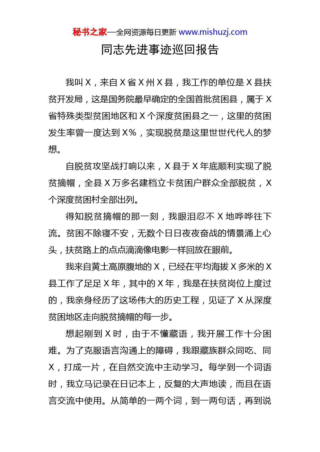 秘书之家—全网资源每日更新www.mishuzj.com同志先进事迹巡回报告我叫X,来自X省X州X县,我工作的单位是X县扶贫开发局,这是国务院最早确定的全国首批贫困县,属于X省特殊类型贫困地区和X个深度贫困县之一,这里的贫困发生率曾一度达到X%,实现脱贫是这里世世代代人的梦想。自脱贫攻坚战打响以来,X县于X年底顺利实现了脱贫摘帽,全县X万多名建档立卡贫困户群众全部脱贫,X个深度贫困村全部出列。得知脱贫摘帽的那一刻,我眼泪忍不X地哗哗往下流。贫困不除寝不安,无数个日日夜夜奋战的情景涌上心头,扶贫路上的点点滴滴像电影一样回放在眼前。我来自黄土高原腹地的X,已经在平均海拔X多米的X县工作了足足X年,其中的X年,我是在扶贫岗位上度过的,我亲身经历了这场伟大的历史工程,见证了X从深度贫困地区走向脱贫摘帽的每一步。想起刚到X时,由于不懂藏语,我开展工作十分困难。为了克服语言沟通上的障碍,我跟藏族群众同吃、同X,打成一片,在自然交流中主动学习。每学到一个词语时,我立马记录在日记本上,反复的大声地读,而且在语言交流中使用。从简单的一两个词,到一两句话,再到说秘书之家—全网资源每日更新www.mishuzj.com一口流利的藏语,我花了很大功夫,同时也收获了与藏族群众的友谊,成为了大家眼中“我们的X”。X年初,我从基层调动到扶贫局,从事扶贫工作后,我就暗暗对自己说,组织上这么信任,群众这么期待,我一定要把扶贫工作干的很出色。由于精准扶贫既是一项系统性工作,又是一项政策性很强的工作,想要干好,既要“上接天线”,也要“下接地气”,所以我始终坚持着勤于学习、善于学习的好习惯,到群众中“拜老师”,到基层一线“找答案”,积累了丰富的群众工作经验,也掌握一些与群众沟通的诀窍。比如:精准扶贫中的‘精准’二字,直接翻译只需要四个字,可老百姓仍旧很难理解。我的办法是“绕圈”,用老百姓身边的事物,多打比方,比如“打你左眼不伤你右眼”“肚子疼决不给你吃头疼药”“像打枪一样,要瞄准病灶,对症下药”……多说几个比喻,就能准确传达‘精准’的政策含义,也让百姓准确的明白。跟群众打交道多了,自己的藏语水平也越来越好,现在,无论是开展基层工作,还是召开群众大会,我的藏语都得心应手,如果自己不说,很多人都把我当成一名地地道道的民族干部了。X年X月,我任职X县扶贫局局长,同时担任县脱贫攻坚领导小组办公室主任,省、州、县、乡的农业、牧业、X建、水利、卫健等十多个业务部门,需要我统筹协秘书之家—全网资源每日更新www.mishuzj.com调;项目、资金分配引发的矛盾,也都要一一化解。在一件件事情的协调过程中,我的组织能力、协调能力都有了很大地提升。我记得开的最长的一次会议,从中午X点开到了晚上X点。那天的会议上,考虑到X村自然条件恶劣,房屋依山而建,地势险峻,交通不便,群众增收渠道单一,县里决定将全村X多户村民中的X户,易地扶贫搬迁到多昌村邦达滩安置点。项目即将落地时,村民们得知根据国家占补平衡政策,搬迁户在村里的老房子必须拆除,顿时产生了抵触情绪。且不说对老房子不舍,根据藏族的习俗,有的人家,先辈们的尸骨就埋在房屋周围。村民代表提出,“老房子一个砖瓦都不能动”,否则,就不搬迁了。那时,省里已经批复了这个项目,搬迁是势在必行,可以说是骑虎难下,为了做通群众的思想工作,我同县乡村三级相关工作人员采取召开各种宣传动员座谈会议,挨家挨户走访等方式不厌其烦耐心反复多次开导牧民群众,期间牧民群众思想转变不了,使我着急上火,寝食难眠。在其中一次最漫长达X个小时的沟通协调里,与会代表坐在桌前纹丝未动,持续进行宣讲政策,列摆事实和现实案例,不断引导开导牧民群众,连晚饭都是打包送进会议室的,结束时,我站起身来,感觉脚不沾地、全身轻飘飘的。如今,也巴村的搬迁户们全都X进了宽敞明亮的房秘书之家—全网资源每日更新www.mishuzj.com屋,安置点道路、排水、供电等生活设施一应俱全,从幼儿园到高中都能就近入学。村民过上了好日子,也理解了当初国家的初心和善意。脱贫攻坚工作难,深度贫困县的脱贫事业更难,总是矛盾与困难交织,面对国家脱贫攻坚的好政策,需要每一名扶贫干部用十倍的热情、百倍的耐心、细致的工作,才能把好事办好,把政策落到实处。为了推进脱贫攻坚工作,我学习借鉴X脱贫攻坚战略模式,精心谋划,将全县X个乡镇划分为南方、北方、X“四大战区”,形成了“四大战区、十个作战单元、六十九个作战小组”的脱贫攻坚作战指挥体系,强化了脱贫攻坚的制度保障。为解决建档立卡贫困户就业渠道窄的问题,我努力争取生态公益性岗位,目前,全县共有生态管护员X名,农牧民群众享受到了生态保护的红利。为促进老百姓多渠道增收,我努力推动产业扶贫。落实扶贫到户产业资金X.X亿元,实现村集体经济全面“破零”;集中力量开展技能培训,开发就业岗位;建设县扶贫产业园,培育和孵化脱贫产业,目前已有X家企业入驻;扶持发展前景好、辐射带动强的X等专业合作社,项目户群众每年增收X元至X元不等;大力发展旅游扶贫,X村等旅游扶贫项目已开始发挥效益。从事扶贫以来,我白天的工作时间,大都用来协调各秘书之家—全网资源每日更新www.mishuzj.com类事情,只有午休时和晚上下班后,才能静下心来,查阅文件资料,