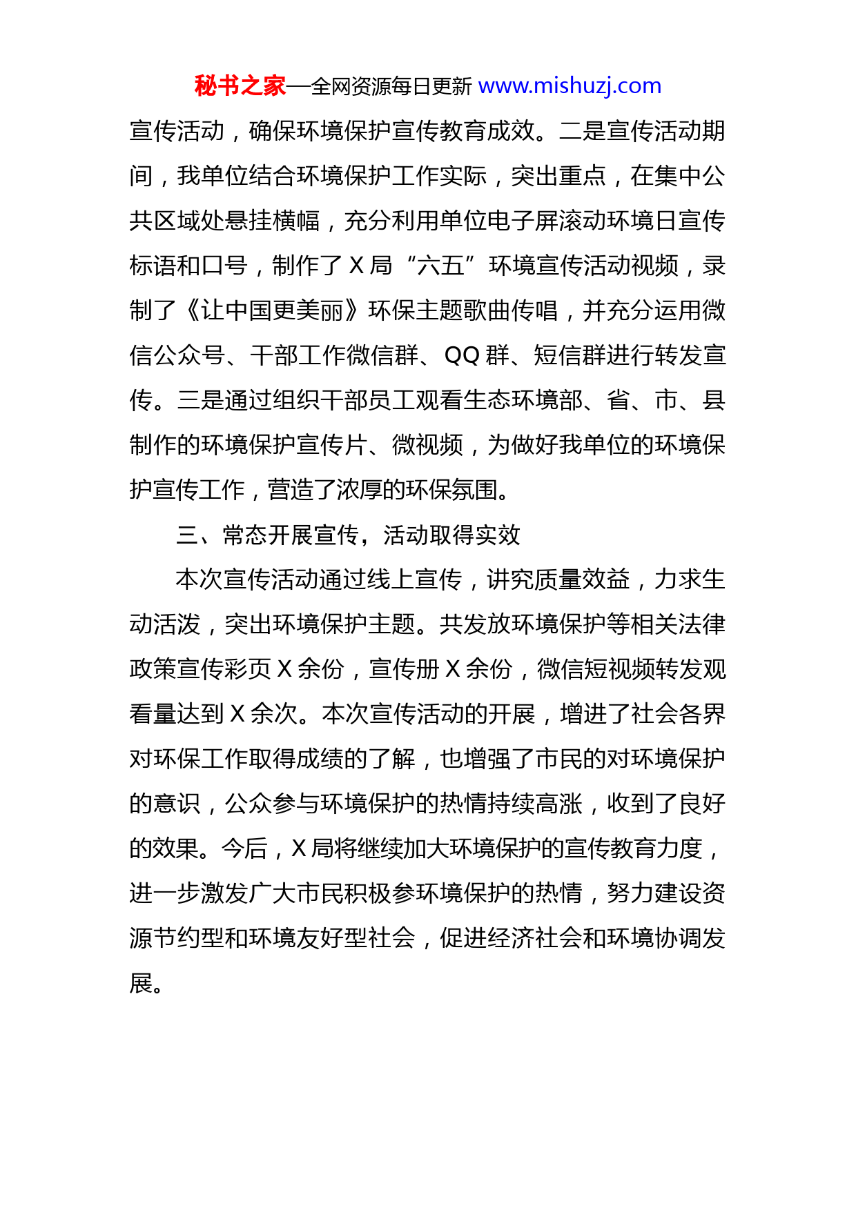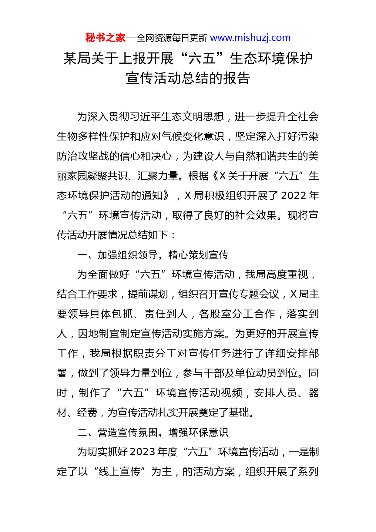 秘书之家—全网资源每日更新www.mishuzj.com某局关于上报开展“六五”生态环境保护宣传活动总结的报告为深入贯彻习近平生态文明思想,进一步提升全社会生物多样性保护和应对气候变化意识,坚定深入打好污染防治攻坚战的信心和决心,为建设人与自然和谐共生的美丽家园凝聚共识、汇聚力量。根据《X关于开展“六五”生态环境保护活动的通知》,X局积极组织开展了2022年“六五”环境宣传活动,取得了良好的社会效果。现将宣传活动开展情况总结如下:一、加强组织领导,精心策划宣传为全面做好“六五”环境宣传活动,我局高度重视,结合工作要求,提前谋划,组织召开宣传专题会议,X局主要领导具体包抓、责任到人,各股室分工合作,落实到人,因地制宜制定宣传活动实施方案。为更好的开展宣传工作,我局根据职责分工对宣传任务进行了详细安排部署,做到了领导力量到位,参与干部及单位动员到位。同时,制作了“六五”环境宣传活动视频,安排人员、器材、经费,为宣传活动扎实开展奠定了基础。二、营造宣传氛围,增强环保意识为切实抓好2023年度“六五”环境宣传活动,一是制定了以“线上宣传”为主,的活动方案,组织开展了系列秘书之家—全网资源每日更新www.mishuzj.com宣传活动,确保环境保护宣传教育成效。二是宣传活动期间,我单位结合环境保护工作实际,突出重点,在集中公共区域处悬挂横幅,充分利用单位电子屏滚动环境日宣传标语和口号,制作了X局“六五”环境宣传活动视频,录制了《让中国更美丽》环保主题歌曲传唱,并充分运用微信公众号、干部工作微信群、QQ群、短信群进行转发宣传。三是通过组织干部员工观看生态环境部、省、市、县制作的环境保护宣传片、微视频,为做好我单位的环境保护宣传工作,营造了浓厚的环保氛围。三、常态开展宣传,活动取得实效本次宣传活动通过线上宣传,讲究质量效益,力求生动活泼,突出环境保护主题。共发放环境保护等相关法律政策宣传彩页X余份,宣传册X余份,微信短视频转发观看量达到X余次。本次宣传活动的开展,增进了社会各界对环保工作取得成绩的了解,也增强了市民的对环境保护的意识,公众参与环境保护的热情持续高涨,收到了良好的效果。今后,X局将继续加大环境保护的宣传教育力度,进一步激发广大市民积极参环境保护的热情,努力建设资源节约型和环境友好型社会,促进经济社会和环境协调发展。