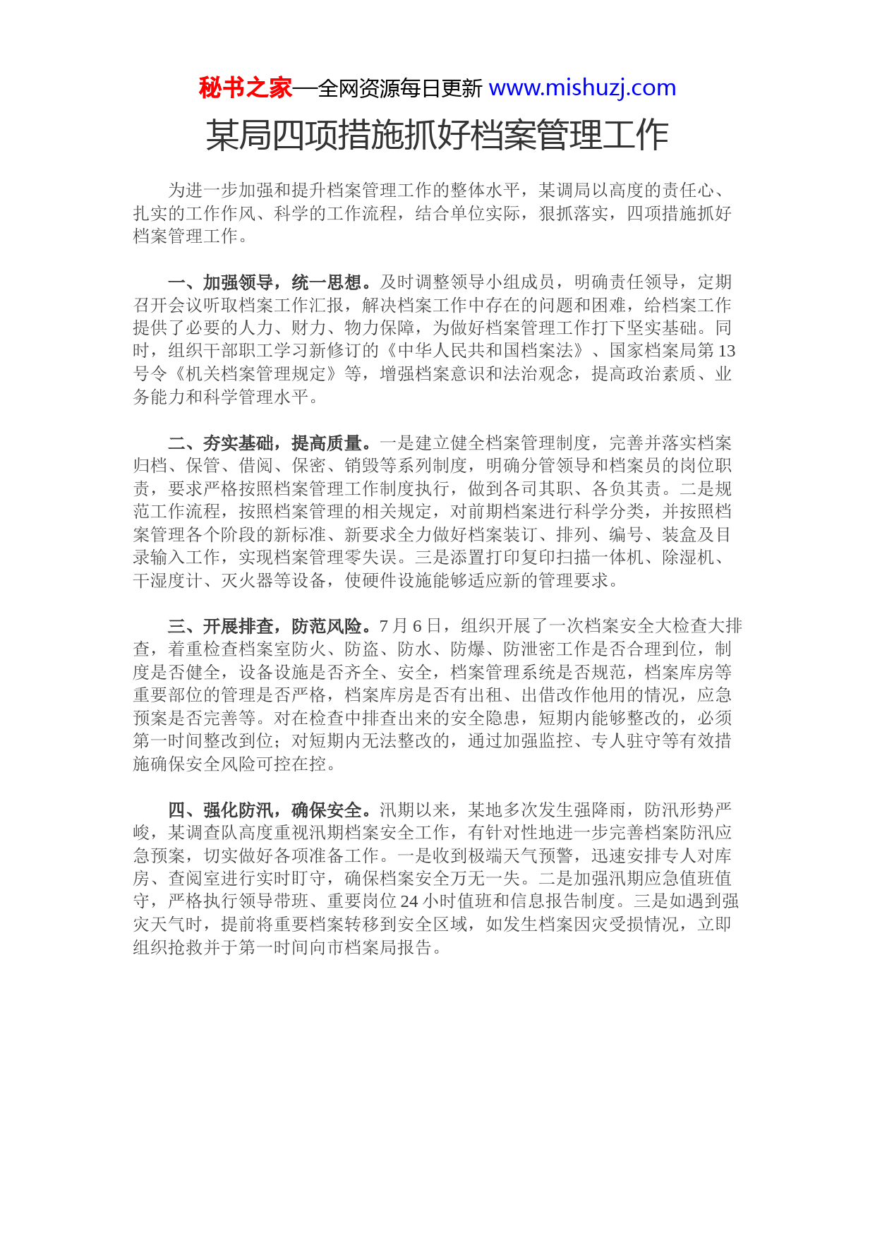 秘书之家—全网资源每日更新www.mishuzj.com某局四项措施抓好档案管理工作为进一步加强和提升档案管理工作的整体水平,某调局以高度的责任心、扎实的工作作风、科学的工作流程,结合单位实际,狠抓落实,四项措施抓好档案管理工作。一、加强领导,统一思想。及时调整领导小组成员,明确责任领导,定期召开会议听取档案工作汇报,解决档案工作中存在的问题和困难,给档案工作提供了必要的人力、财力、物力保障,为做好档案管理工作打下坚实基础。同时,组织干部职工学习新修订的《中华人民共和国档案法》、国家档案局第13号令《机关档案管理规定》等,增强档案意识和法治观念,提高政治素质、业务能力和科学管理水平。二、夯实基础,提高质量。一是建立健全档案管理制度,完善并落实档案归档、保管、借阅、保密、销毁等系列制度,明确分管领导和档案员的岗位职责,要求严格按照档案管理工作制度执行,做到各司其职、各负其责。二是规范工作流程,按照档案管理的相关规定,对前期档案进行科学分类,并按照档案管理各个阶段的新标准、新要求全力做好档案装订、排列、编号、装盒及目录输入工作,实现档案管理零失误。三是添置打印复印扫描一体机、除湿机、干湿度计、灭火器等设备,使硬件设施能够适应新的管理要求。三、开展排查,防范风险。7月6日,组织开展了一次档案安全大检查大排查,着重检查档案室防火、防盗、防水、防爆、防泄密工作是否合理到位,制度是否健全,设备设施是否齐全、安全,档案管理系统是否规范,档案库房等重要部位的管理是否严格,档案库房是否有出租、出借改作他用的情况,应急预案是否完善等。对在检查中排查出来的安全隐患,短期内能够整改的,必须第一时间整改到位;对短期内无法整改的,通过加强监控、专人驻守等有效措施确保安全风险可控在控。四、强化防汛,确保安全。汛期以来,某地多次发生强降雨,防汛形势严峻,某调查队高度重视汛期档案安全工作,有针对性地进一步完善档案防汛应急预案,切实做好各项准备工作。一是收到极端天气预警,迅速安排专人对库房、查阅室进行实时盯守,确保档案安全万无一失。二是加强汛期应急值班值守,严格执行领导带班、重要岗位24小时值班和信息报告制度。三是如遇到强灾天气时,提前将重要档案转移到安全区域,如发生档案因灾受损情况,立即组织抢救并于第一时间向市档案局报告。
