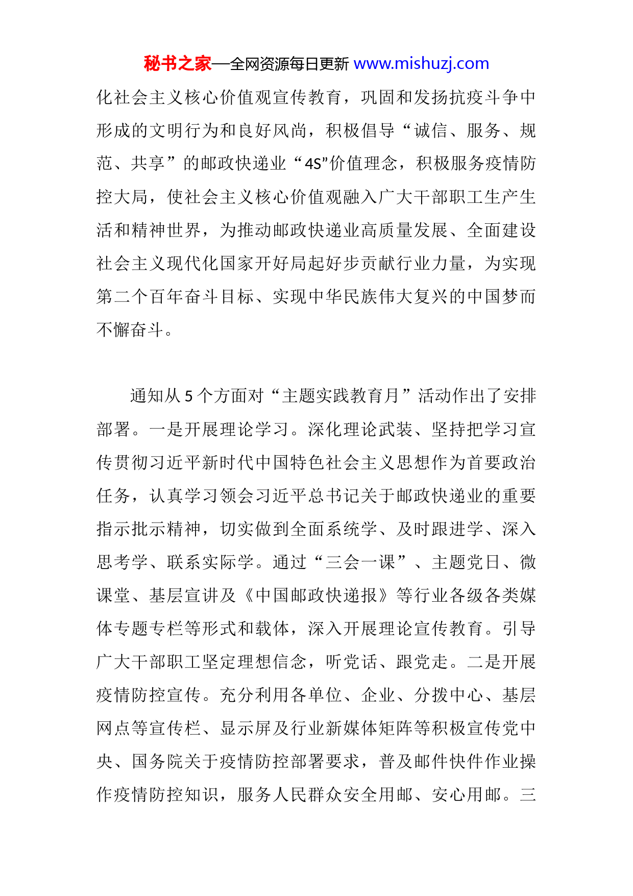 秘书之家—全网资源每日更新www.mishuzj.com某局部署开展“社会主义核心价值观主题实践教育月”活动4月7日,为深入贯彻落实习近平总书记关于精神文明建设的重要论述,积极推进新时代文明实践中心建设,不断深化群众性精神文明创建活动,推动社会主义核心价值观在邮政快递业落地落实。按照交通运输部统一部署,经XX同意,XX办公室印发通知,决定4月在全行业开展“社会主义核心价值观主题实践教育月”活动(以下简称“主题实践教育月”活动)。“主题实践教育月”活动以习近平新时代中国特色社会主义思想为指导,深入贯彻落实党的十九大和十九届历次全会精神,深刻领悟“两个确立”决定性意义,进一步增强“四个意识”、坚定“四个自信”、做到“两个维护”,紧紧围绕迎接宣传贯彻党的二十大这条主线,坚持稳中求进、守正创新,以社会主义核心价值观为引领,结合疫情防控要求有针对性地开展“主题实践教育月”活动,为党的二十大胜利召开营造良好氛围。通知指出,“主题实践教育月”活动要把社会公德、职业道德、家庭美德、个人品德建设作为着力点,持续深秘书之家—全网资源每日更新www.mishuzj.com化社会主义核心价值观宣传教育,巩固和发扬抗疫斗争中形成的文明行为和良好风尚,积极倡导“诚信、服务、规范、共享”的邮政快递业“4S”价值理念,积极服务疫情防控大局,使社会主义核心价值观融入广大干部职工生产生活和精神世界,为推动邮政快递业高质量发展、全面建设社会主义现代化国家开好局起好步贡献行业力量,为实现第二个百年奋斗目标、实现中华民族伟大复兴的中国梦而不懈奋斗。通知从5个方面对“主题实践教育月”活动作出了安排部署。一是开展理论学习。深化理论武装、坚持把学习宣传贯彻习近平新时代中国特色社会主义思想作为首要政治任务,认真学习领会习近平总书记关于邮政快递业的重要指示批示精神,切实做到全面系统学、及时跟进学、深入思考学、联系实际学。通过“三会一课”、主题党日、微课堂、基层宣讲及《中国邮政快递报》等行业各级各类媒体专题专栏等形式和载体,深入开展理论宣传教育。引导广大干部职工坚定理想信念,听党话、跟党走。二是开展疫情防控宣传。充分利用各单位、企业、分拨中心、基层网点等宣传栏、显示屏及行业新媒体矩阵等积极宣传党中央、国务院关于疫情防控部署要求,普及邮件快件作业操作疫情防控知识,服务人民群众安全用邮、安心用邮。三秘书之家—全网资源每日更新www.mishuzj.com是开展群众性精神文明创建活动。大力发掘培树先进典型,广泛宣传“全国邮政行业先进集体和劳动模范”“最美快递员”“感动交通年度人物”以及抗击疫情中涌现的先进典型,用好新媒体传播平台,讲好先进人物感人故事,充分发挥其榜样示范作用,不断激发广大党员干部职工干事创业的激情和热情,以实际行动践行“人民邮政为人民”的初心使命。围绕迎接宣传贯彻党的二十大这条主线,持续弘扬伟大建党精神,推动党史学习教育常态化长效化,组织开展丰富的群众性主题活动,激发奋斗热情。四是开展志愿服务活动。引导机关和邮政快递企业组建志愿服务队伍、夯实一线志愿力量,积极推进邮政快递业志愿服务活动。结合疫情防控重点工作,广泛开展社区支援、便民配送、安全教育等志愿服务活动,充分发挥基层党组织战斗堡垒和党员先锋模范作用,积极打造邮政快递业特色志愿服务品牌。五是开展行业精神学习宣传教育。大力弘扬“忠诚为本、勤劳为基、创造为荣、守护为责”的“小蜜蜂”精神,大力传承“传邮万里、国脉所系”的红色基因,深入汲取罗淑珍、王顺友、尼玛拉木、其美多吉、葛军、汪勇等先进典型的精神养料,引导全行业干部职工充分认识、深刻理解、积极宣传行业精神,推动邮政快递业精神践行有形化、多样化。