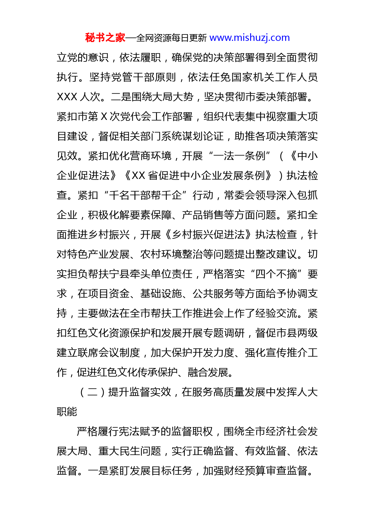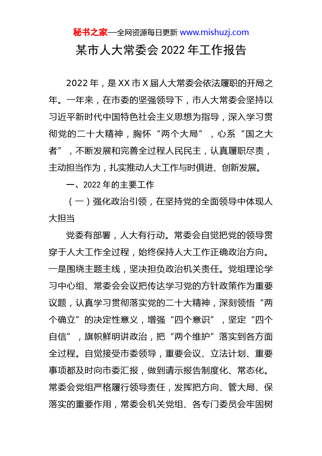 秘书之家—全网资源每日更新www.mishuzj.com某市人大常委会2022年工作报告2022年,是XX市X届人大常委会依法履职的开局之年。一年来,在市委的坚强领导下,市人大常委会坚持以习近平新时代中国特色社会主义思想为指导,深入学习贯彻党的二十大精神,胸怀“两个大局”,心系“国之大者”,不断发展和完善全过程人民民主,认真履职尽责,主动担当作为,扎实推动人大工作与时俱进、创新发展。一、2022年的主要工作(一)强化政治引领,在坚持党的全面领导中体现人大担当党委有部署,人大有行动。常委会自觉把党的领导贯穿于人大工作全过程,始终保持人大工作正确政治方向。一是围绕主题主线,坚决担负政治机关责任。党组理论学习中心组、常委会会议把传达学习党的方针政策作为重要议题,认真学习贯彻落实党的二十大精神,深刻领悟“两个确立”的决定性意义,增强“四个意识”,坚定“四个自信”,旗帜鲜明讲政治,把“两个维护”落实到各方面全过程。自觉接受市委领导,重要会议、立法计划、重要事项都及时向市委汇报,做到请示报告制度化、常态化。常委会党组严格履行领导责任,发挥把方向、管大局、保落实的重要作用,常委会机关党组、各专门委员会牢固树秘书之家—全网资源每日更新www.mishuzj.com立党的意识,依法履职,确保党的决策部署得到全面贯彻执行。坚持党管干部原则,依法任免国家机关工作人员XXX人次。二是围绕大局大势,坚决贯彻市委决策部署。紧扣市第X次党代会工作部署,组织代表集中视察重大项目建设,督促相关部门系统谋划论证,助推各项决策落实见效。紧扣优化营商环境,开展“一法一条例”(《中小企业促进法》《XX省促进中小企业发展条例》)执法检查。紧扣“千名干部帮千企”行动,常委会领导深入包抓企业,积极化解要素保障、产品销售等方面问题。紧扣全面推进乡村振兴,开展《乡村振兴促进法》执法检查,针对特色产业发展、农村环境整治等问题提出整改建议。切实担负帮扶宁县牵头单位责任,严格落实“四个不摘”要求,在项目资金、基础设施、公共服务等方面给予协调支持,主要做法在全市帮扶工作推进会上作了经验交流。紧扣红色文化资源保护和发展开展专题调研,督促市县两级建立联席会议制度,加大保护开发力度、强化宣传推介工作,促进红色文化传承保护、融合发展。(二)提升监督实效,在服务高质量发展中发挥人大职能严格履行宪法赋予的监督职权,围绕全市经济社会发展大局、重大民生问题,实行正确监督、有效监督、依法监督。一是紧盯发展目标任务,加强财经预算审查监督。秘书之家—全网资源每日更新www.mishuzj.com听取和审议计划、预算、审计等报告,依法批准市本级财政决算和预算调整方案、新增政府债券资金分配意见。首次联合审计部门召开市级财政预算执行暨国有资产审计集中进点会,推动监督关口前移,形成监督合力。在全省市(州)首个听取国有资产管理情况专项报告,从强化管理基础、防止国有资产流失等方面提出整改建议。专题听取审计查出问题整改情况报告,积极化解“年年审、年年有”的问题。制定印发《关于加强市县人大对政府债务审查监督的实施意见》,专题调研政府性债务情况,对解决政府隐性债务提出对策建议。运用信息化手段,加强市级预算联网监督,不断完善财政全口径审查、全过程监管。二是紧盯社会重大关切,加强民生热点实事监督。组织人大代表集中视察城区饮水提质工程等XX个项目进展情况,推动2022年市列为民办实事真正落实。专题督查高标准农田建设、苗木占用耕地腾退工作,提出合理规划选址、实施土壤改良、提高腾退补偿标准等建议,助力耕地“非农化”“非粮化”专项整治。开展学前教育工作情况专题调研,督促教育主管部门进一步优化资源配置,提高普惠幼儿园比例,加强师资队伍建设,推动城乡学前教育优质均衡发展。开展《XX省中小学校安全条例》执法检查,督促有关部门强化联动协同,靠实交通、食品、防疫等方面安全责任,加强校园及周边环境安全管理。配合调研《归侨秘书之家—全网资源每日更新www.mishuzj.com侨眷权益保护法》《城市民族工作条例》贯彻实施情况,推进归侨侨眷权益保护和城市民族工作。三是紧盯宜居城市建设,加强环境保护治理监督。开展《环境保护法》《XX省环境保护条例》执法检查,逐项对照查看水、大气、土壤、固废污染防治规定执行情况,提出靠实法律责任、补齐环保短板、提高执法水平等建议,跟进督促农业面源污染防治、石油开发管线治理、城区施工扬尘管控等工作整改情况。开展“河长制”工作情况专题调研,掌握XX河、XX河水资源保护、水生态修复等情况,促进水土保持、水污染防治和集约节约用水,助力河湖“四乱”问题有效解决。连续五年听取环保部门专项工作报告,跟进关注生态环境状况、环保目标完成情况,推动生态环境质量持续好转。(三)聚焦法治保障,在法治XX建设中彰显人大作为始终坚持人民立场,着力提高立法质量,加大法律实施监督力度,促进提升依法治市水平,扎实推进民主法治建设进程。一是突出XX特色,稳步推进地方立法。紧扣我市综合能源化工基地、“西气东输”、“气化XX”等项目建设的推进,为加强燃气市场管理、保障燃气稳定供应、保护各方合法权益,制定颁布《XX市燃气