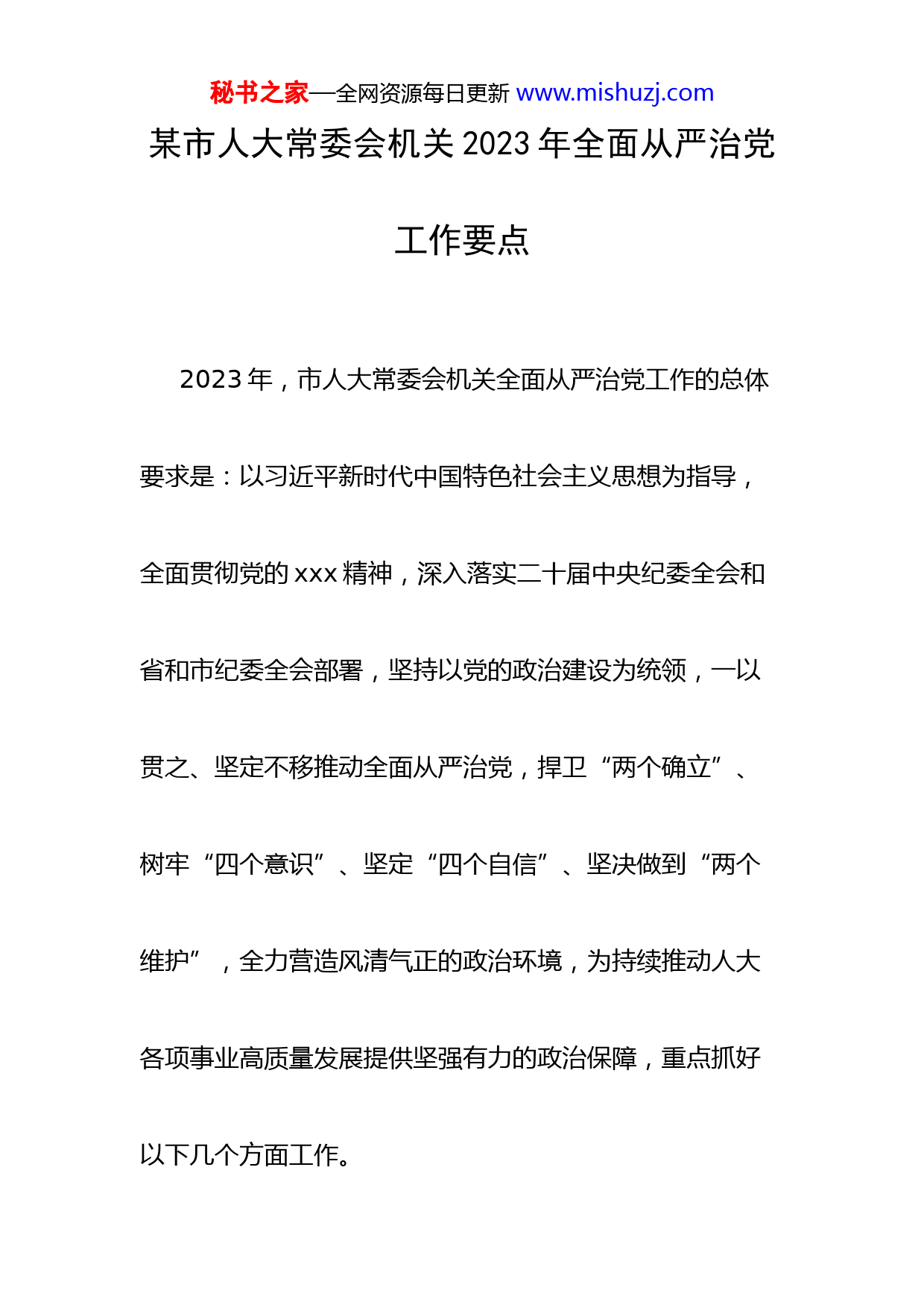 秘书之家—全网资源每日更新www.mishuzj.com某市人大常委会机关2023年全面从严治党工作要点2023年,市人大常委会机关全面从严治党工作的总体要求是:以习近平新时代中国特色社会主义思想为指导,全面贯彻党的xxx精神,深入落实二十届中央纪委全会和省和市纪委全会部署,坚持以党的政治建设为统领,一以贯之、坚定不移推动全面从严治党,捍卫“两个确立”、树牢“四个意识”、坚定“四个自信”、坚决做到“两个维护”,全力营造风清气正的政治环境,为持续推动人大各项事业高质量发展提供坚强有力的政治保障,重点抓好以下几个方面工作。秘书之家—全网资源每日更新www.mishuzj.com一、以政治建设为引领,落实全面从严治党主体责任1.强化政治机关意识教育。牢固树立人大机关首先是政治机关的意识,组织党支部每月开展一次重温入党誓词、开展为党员过“政治生日”的政治仪式、开展党支部书记每半年报告一次支部党员思想政治工作,使机关党内生活庄重、严肃,把政治机关意识教育的触角延伸到每个支部、覆盖到每个党员,让政治机关意识入心、入脑,增强“四个意识”、坚定“四个自信”、做到“两个维护”,在思想上政治上行动上与习近平同志为核心的党中央保持高度一致。秘书之家—全网资源每日更新www.mishuzj.com2.严守政治纪律和政治规矩。坚持把学习党章党规党纪作为党员干部必修课,定期组织学习《中国共产党章程》《中国共产党廉洁自律准则》《中国共产党纪律处分条例》《中国共产党问责条例》等党规党纪,内化于心、外化于行,时刻绷紧纪律规矩这根弦,带头遵守党规党纪,营造风清气正的政治生态。全面开展“工作落实年”活动,确保党中央和省市委各项决策部署有效贯彻落实。3.夯实主体责任。按照《党委(党组)全面从严治党主体责任规定》,坚持一级抓一级、层层抓落实,确保把责任压实到每个委办室,形成齐抓共管、各负其责的工作格局。坚持全面从严治党与业务工作同研究、同部署、同推秘书之家—全网资源每日更新www.mishuzj.com进、同考核,推动工作任务落实。制定2023年度全面从严治党主体责任清单,明确责任、推进措施、责任人和完成时限,科学运用“四个体系”推进工作落实。二、以思想建设为核心,夯实思想政治基础4.加强政治理论学习。通过“第一议题”、理论学习中心组、“三会一课”等学习形式,把学习贯彻习近平新时代中国特色社会主义思想作为首要政治任务,及时跟进学习习近平总书记最新重要讲话和重要指示批示精神,坚持把不忘初心、牢记使命作为加强党的建设的永恒课题和党员干部的终身课题,不断巩固深化党史学习教育成果,持续在学懂弄通做实习近平新时代中国特色社会主义思想上秘书之家—全网资源每日更新www.mishuzj.com发力,不断提高政治判断力、政治领悟力、政治执行力,以强有力的政治自觉确保党中央和省委、市委决策部署一贯到底。5.强化思想政治建设。认真抓纪律教育、政德教育、家风教育、业务知识的学习,不断提升干部队伍的理论水平、专业技能、党性作风,鼓励干部职工读原著、学原文、悟原理,建设忠诚干净担当的人大干部队伍。积极开展思想政治教育,组织开展中央部署的主题教育,持续深化党史学习教育,牢固树立“四个意识”,坚定“四个自信”,做到“两个维护”。秘书之家—全网资源每日更新www.mishuzj.com6.加强意识形态建设。认真落实意识形态和网络意识形态工作责任制,把意识形态工作纳入党建工作体系,纳入重要议事日程。充分利用人大公众号、微信群等阵地,积极开展社会主义核心价值观、优秀传统美德等意识形态宣传,旗帜鲜明反对、抵制、批驳错误思潮、错误观点和错误言论。强化意识形态风险监测预警和分析研判,组织开展排查活动。三、以组织建设为基础,筑牢坚实组织保障7.打牢基层组织基础。牢固树立党的“一切工作到支部”的鲜明导向,推进党支部标准化规范化建设。开展党支部标准化规范化对标评星活动,使人大常委会机关党支秘书之家—全网资源每日更新www.mishuzj.com部规范化标准化达到95%以上,进一步提升基层党组织阵地。严格执行《关于新形势下党内政治生活的若干准则》,健全党内政治生活制度,严格落实“三会一课”、组织生活会、民主生活会、领导干部双重组织生活、谈心谈话、民主评议党员等基本制度,不断增强党内政治生活的政治性、时代性、原则性和战斗性。8.提升基层党组织组织力。深入贯彻落实《中国共产党支部工作条例(试行)》,组织好党建业务培训,增强党务工作者工作能力,提高工作质量,不断增强党组织的战斗力。坚持党建带团建、妇建、工建,加强机关群团组织秘书之家—全网资源每日更新www.mishuzj.com队伍建设,组织机关党员职工开展群团活动,展示机关党员干部昂扬向上的精神风貌。9.加强党建与业务工作的深度融合。开展党建品牌创建活动。组织市人大常委会机关党支部开展“创特色、亮品牌”活动。牢固树立“以业务实绩体现党建政治效果”的鲜明导向,把抓中心工作完成、抓重大任务落实作为检验基层组织组织力的试金石,积极引导各党支部发挥在推进中心工作、落实重大任务中的政治引领作用,积极营造抓党建、强业务的浓厚氛围,促进党建和人大业务深度融合。四、以作风建设为支撑,