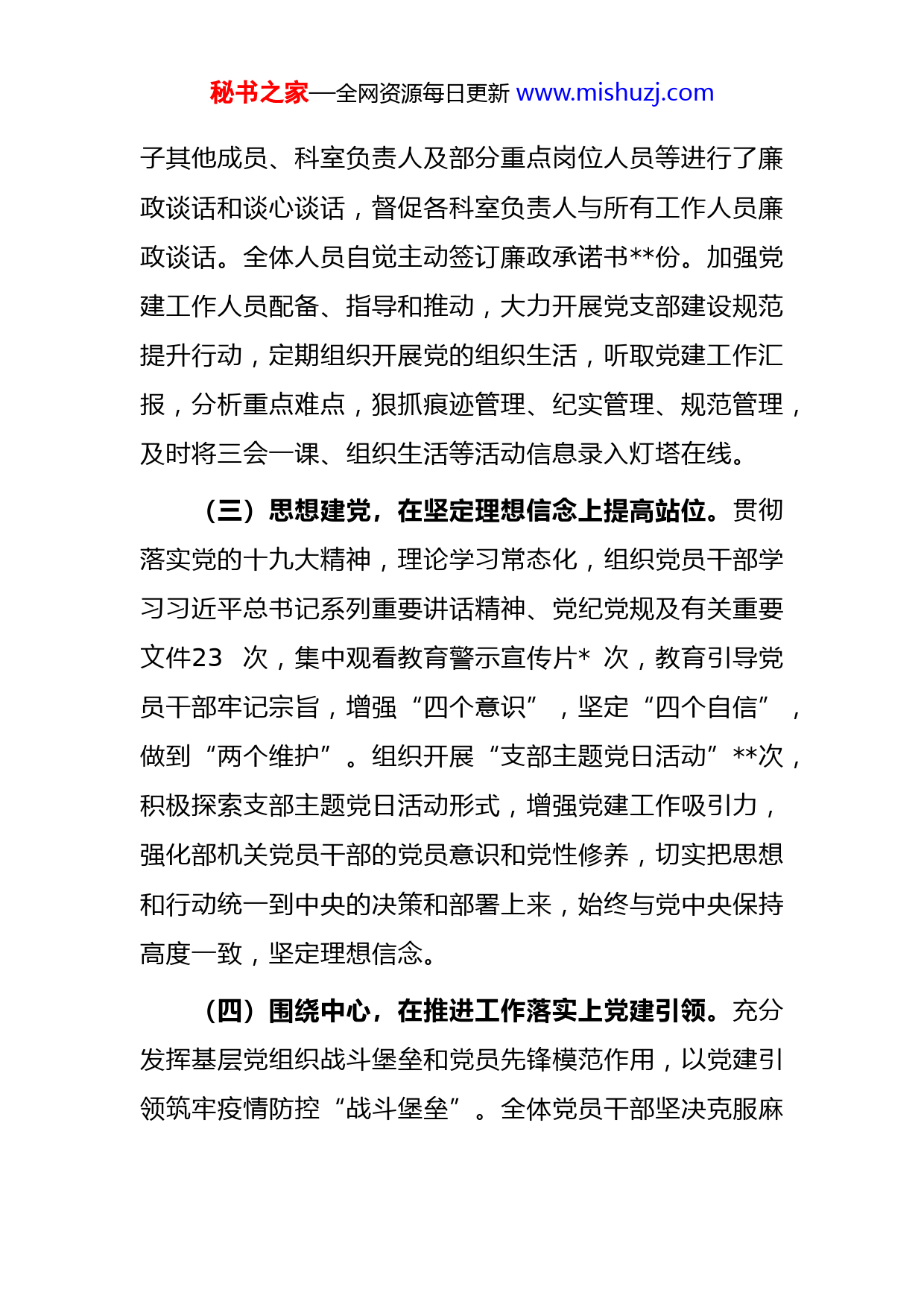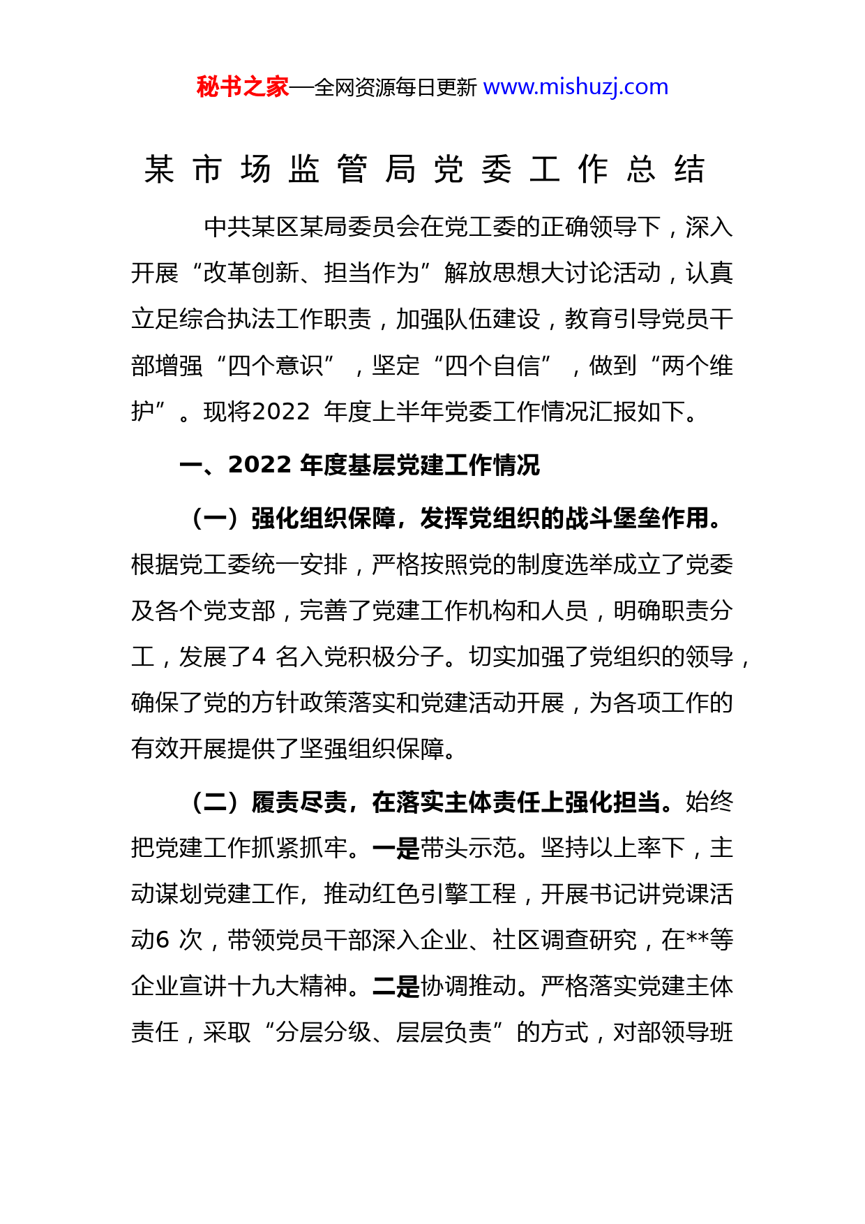 秘书之家—全网资源每日更新www.mishuzj.com某市场监管局党委工作总结中共某区某局委员会在党工委的正确领导下,深入开展“改革创新、担当作为”解放思想大讨论活动,认真立足综合执法工作职责,加强队伍建设,教育引导党员干部增强“四个意识”,坚定“四个自信”,做到“两个维护”。现将2022年度上半年党委工作情况汇报如下。一、2022年度基层党建工作情况(一)强化组织保障,发挥党组织的战斗堡垒作用。根据党工委统一安排,严格按照党的制度选举成立了党委及各个党支部,完善了党建工作机构和人员,明确职责分工,发展了4名入党积极分子。切实加强了党组织的领导,确保了党的方针政策落实和党建活动开展,为各项工作的有效开展提供了坚强组织保障。(二)履责尽责,在落实主体责任上强化担当。始终把党建工作抓紧抓牢。一是带头示范。坚持以上率下,主动谋划党建工作,推动红色引擎工程,开展书记讲党课活动6次,带领党员干部深入企业、社区调查研究,在等企业宣讲十九大精神。二是协调推动。严格落实党建主体责任,采取“分层分级、层层负责”的方式,对部领导班秘书之家—全网资源每日更新www.mishuzj.com子其他成员、科室负责人及部分重点岗位人员等进行了廉政谈话和谈心谈话,督促各科室负责人与所有工作人员廉政谈话。全体人员自觉主动签订廉政承诺书份。加强党建工作人员配备、指导和推动,大力开展党支部建设规范提升行动,定期组织开展党的组织生活,听取党建工作汇报,分析重点难点,狠抓痕迹管理、纪实管理、规范管理,及时将三会一课、组织生活等活动信息录入灯塔在线。(三)思想建党,在坚定理想信念上提高站位。贯彻落实党的十九大精神,理论学习常态化,组织党员干部学习习近平总书记系列重要讲话精神、党纪党规及有关重要文件23次,集中观看教育警示宣传片次,教育引导党员干部牢记宗旨,增强“四个意识”,坚定“四个自信”,做到“两个维护”。组织开展“支部主题党日活动”次,积极探索支部主题党日活动形式,增强党建工作吸引力,强化部机关党员干部的党员意识和党性修养,切实把思想和行动统一到中央的决策和部署上来,始终与党中央保持高度一致,坚定理想信念。(四)围绕中心,在推进工作落实上党建引领。充分发挥基层党组织战斗堡垒和党员先锋模范作用,以党建引领筑牢疫情防控“战斗堡垒”。全体党员干部坚决克服麻秘书之家—全网资源每日更新www.mishuzj.com痹思想、厌战情绪、侥幸心理、松劲心态,在疫情防控一线充分发挥硬核作用,特别是在进口集装箱疫情防控和涉外渔船管控上,为坚决打赢疫情防控阻击战贡献力量。荣获某市抗击新冠肺炎疫情先进集体荣誉称号。完成了轮冷链食品和轮进口冷链食品摸排和核酸检测工作。迅速开展非冷链疫情防控工作,完成进口物品摸底工作,建立进口企业、物品信息台账,摸排出进口企业家,承运进口集装箱运输企业家,涉及商品配件及原材料余类。利用北斗定位,每日调度涉外渔船。安排专人多次赴石岛约谈企业负责人,压实疫情防控责任,确保不发生涉外事件。(五)攻坚克难,在拼搏进取中开创工作新局面。全体人员凝心聚力,坚持高标准、严要求,真抓实干,攻坚克难,开创了综合执法工作新局面。顺利完成2022年度市综合考核指标任务,承担的各项指标均在同序列开发区考核中列第一位,有力助推开发区经济社会高质量发展。组织实施农村公路“村村通、户户通”工程,补齐民生短板,高质量服务群众出行。仅用一个月改造道路万米,万平方米。开展国三营运柴油货车淘汰工作,2022年度淘汰任务为辆,截至2022年底已淘汰辆,秘书之家—全网资源每日更新www.mishuzj.com超额完成2022年度淘汰任务数的100%。组织开展公路限高限宽设施、检查卡点及劝返点拆除工作,调查摸排处,其中依法予以保留的处,做到了应拆尽拆,恢复路面,保障畅通,在全市率先完成整治任务。(六)深入基层,在服务群众中践行初心使命。以人民为中心,以“心系群众冷暖,打通服务群众最后一公里”为初心和担当,以作风建设为抓手,坚持为民谋福祉。落实首问负责制,进一步完善工作机制、提高服务效率,积极妥善有效处理投诉举报1985件,切实做到了听民声、畅民意、解民忧、纾民困。带领党员干部深入企业、社区调查研究,践行“双报到”,支持社区建设,到社区开展各类活动次。(七)聚焦问题,在狠抓整改落实上精准突破。全面落实从严治党的责任。坚持实事求是,督促各党支部对照党支部工作条例开展全面自查,逐一整改落实。针对查找出的突出问题逐项列出问题清单、责任清单、整改清单。截至目前,扎实抓好整改落实件,做到了件件有着落、事事有回音,真正把全面从严治党落实到每个支部、每名党员。二、存在的问题及原因秘书之家—全网资源每日更新www.mishuzj.com(一)学习氛围还不够浓厚,学习培训不够系统深入。对学习理论的重要性、紧迫性认识不够,仅仅学习上级安排部署的学习任务,什么“最新”学什么,忽略了政治理论学习的全面性、系统性和有机协调性。没有建立好完善的学习反馈机制,党员干部们自学时间少,往往浅尝辄止,学习存在重痕迹、轻收获现象。(二)全面从严治党压力传导还有差距。对部领导班子成员“一岗双责”落实情况监督不严不细,平时强调的多,督导力度小,