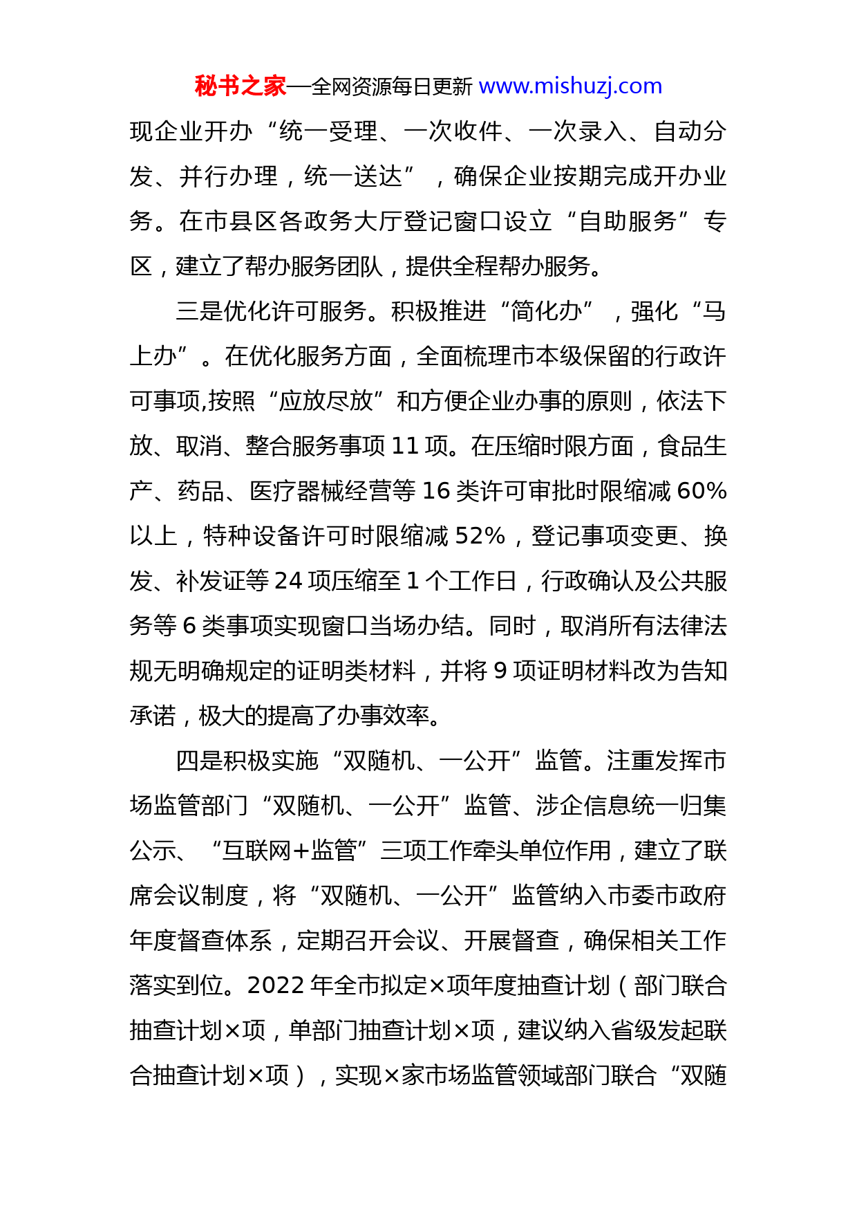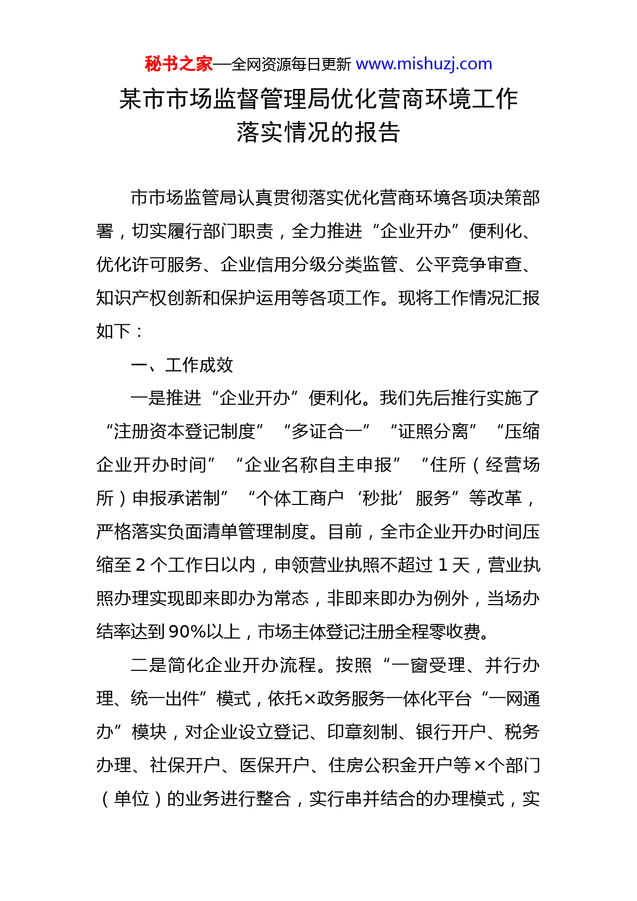 秘书之家—全网资源每日更新www.mishuzj.com某市市场监督管理局优化营商环境工作落实情况的报告市市场监管局认真贯彻落实优化营商环境各项决策部署,切实履行部门职责,全力推进“企业开办”便利化、优化许可服务、企业信用分级分类监管、公平竞争审查、知识产权创新和保护运用等各项工作。现将工作情况汇报如下:一、工作成效一是推进“企业开办”便利化。我们先后推行实施了“注册资本登记制度”“多证合一”“证照分离”“压缩企业开办时间”“企业名称自主申报”“住所(经营场所)申报承诺制”“个体工商户‘秒批’服务”等改革,严格落实负面清单管理制度。目前,全市企业开办时间压缩至2个工作日以内,申领营业执照不超过1天,营业执照办理实现即来即办为常态,非即来即办为例外,当场办结率达到90%以上,市场主体登记注册全程零收费。二是简化企业开办流程。按照“一窗受理、并行办理、统一出件”模式,依托×政务服务一体化平台“一网通办”模块,对企业设立登记、印章刻制、银行开户、税务办理、社保开户、医保开户、住房公积金开户等×个部门(单位)的业务进行整合,实行串并结合的办理模式,实秘书之家—全网资源每日更新www.mishuzj.com现企业开办“统一受理、一次收件、一次录入、自动分发、并行办理,统一送达”,确保企业按期完成开办业务。在市县区各政务大厅登记窗口设立“自助服务”专区,建立了帮办服务团队,提供全程帮办服务。三是优化许可服务。积极推进“简化办”,强化“马上办”。在优化服务方面,全面梳理市本级保留的行政许可事项,按照“应放尽放”和方便企业办事的原则,依法下放、取消、整合服务事项11项。在压缩时限方面,食品生产、药品、医疗器械经营等16类许可审批时限缩减60%以上,特种设备许可时限缩减52%,登记事项变更、换发、补发证等24项压缩至1个工作日,行政确认及公共服务等6类事项实现窗口当场办结。同时,取消所有法律法规无明确规定的证明类材料,并将9项证明材料改为告知承诺,极大的提高了办事效率。四是积极实施“双随机、一公开”监管。注重发挥市场监管部门“双随机、一公开”监管、涉企信息统一归集公示、“互联网+监管”三项工作牵头单位作用,建立了联席会议制度,将“双随机、一公开”监管纳入市委市政府年度督查体系,定期召开会议、开展督查,确保相关工作落实到位。2022年全市拟定×项年度抽查计划(部门联合抽查计划×项,单部门抽查计划×项,建议纳入省级发起联合抽查计划×项),实现×家市场监管领域部门联合“双随秘书之家—全网资源每日更新www.mishuzj.com机、一公开”监管成员单位和×县区全覆盖。建立健全守信联合激励和失信联合惩戒机制,联合×个部门公开发布×批×户“房地产开发领域失信企业黑榜名单”,通过各类新闻媒体和网络平台,不间断滚动式向社会广而告之,对失信企业和人员形成了强大威慑力。五是全面建立公平竞争审查机制。报请市政府印发了《关于进一步落实公平竞争审查制度的实施意见》,进一步明确了审查对象、审查方式、审查标准、工作措施和具体要求,健全完善了全市公平竞争审查工作联席会议制度。制定印发了《×市公平竞争审查政策措施抽查制度》《×市公平竞争审查投诉举报处理回应制度》《×市重大政策措施公平竞争审查会审制度》等,推动全市公平竞争审查工作制度化规范化。至目前,牵头组织审查以市政府或市政府办公室名义出台的、提交市政府常务会议审议的、以市政府名义对外签订的涉及市场主体经济活动政策措施文件、议题、合同或协议×份,从源头上防范了滥用行政权力排除限制竞争行为。六是提升知识产权创新创造运用能力。鼓励企业、高校、科研院所围绕×特色,挖掘申报一批创新水平高、市场竞争力强的高价值核心专利,全面提升全市知识产权创新创造质量、能力和水平。目前,全市授权专利×件,其中发明专利×件,实用新型专利×件,外观设计专利×件,累计秘书之家—全网资源每日更新www.mishuzj.com有效发明专利×件,万人口发明专利拥有量达×件;培育国家级知识产权优势企业×家、省级知识产权优势企业×家,培育知识产权贯标企业×家,培育市级知识产权优势企业×家,环县一中被授予“甘肃省中小学知识产权教育示范学校”;全市已有×个县(区)进入国家知识产权强县试点县和国家传统知识知识产权保护试点县行列。二、工作打算通过简政放权、证照分离、压缩企业开办时间等一系列改革措施,市场监管部门优化营商环境取得了一定成绩,但是仍然存在“放管服”助力企业发展还不够,便民化水平还不高,企业、群众的获得感还不强,部门涉企信息统一归集公示工作主动性不强,并未实现真正意义上的信息互通、资源共享,跨部门、跨领域综合分析应用能力亟待提升,信用体系不完善、监管机制不健全等问题。下一步,我们将以这次督查检查为契机,认真贯彻落实市委、市政府《关于进一步优化全市营商环境的实施意见》,提升行政效能,彰显市场监管担当作为,加快解决制约企业发展的突出困难和问题,增强市场主体活力和创造力,促进全市经济社会高质量发展。一是制定《×市市场监管局<关于进一步优化全市营商环境的实施意见>任务分解方案》,对×项重点任务进行分解。明确了责