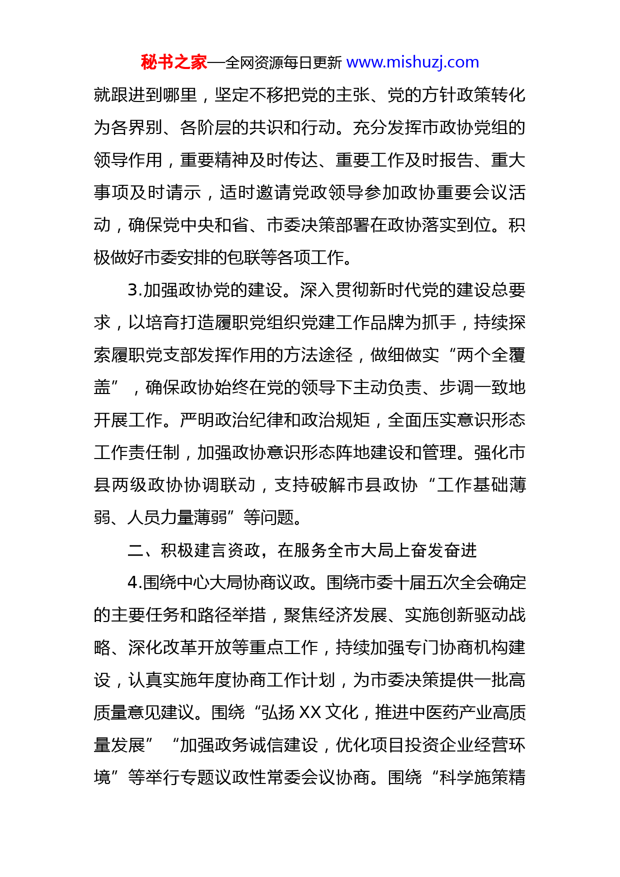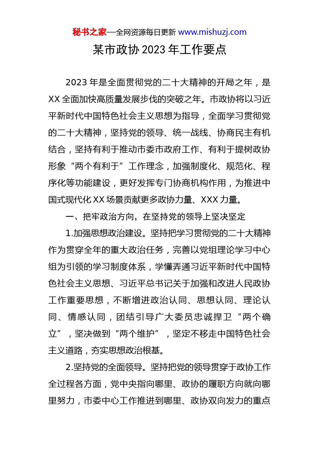 秘书之家—全网资源每日更新www.mishuzj.com某市政协2023年工作要点2023年是全面贯彻党的二十大精神的开局之年,是XX全面加快高质量发展步伐的突破之年。市政协将以习近平新时代中国特色社会主义思想为指导,全面学习贯彻党的二十大精神,坚持党的领导、统一战线、协商民主有机结合,坚持有利于推动市委市政府工作、有利于提树政协形象“两个有利于”工作理念,加强制度化、规范化、程序化等功能建设,更好发挥专门协商机构作用,为推进中国式现代化XX场景贡献更多政协力量、XXX力量。一、把牢政治方向,在坚持党的领导上坚决坚定1.加强思想政治建设。坚持把学习贯彻党的二十大精神作为贯穿全年的重大政治任务,完善以党组理论学习中心组为引领的学习制度体系,学懂弄通习近平新时代中国特色社会主义思想、习近平总书记关于加强和改进人民政协工作重要思想,不断增进政治认同、思想认同、理论认同、情感认同,团结引导广大委员忠诚捍卫“两个确立”,坚决做到“两个维护”,坚定不移走中国特色社会主义道路,夯实思想政治根基。2.坚持党的全面领导。坚持把党的领导贯穿于政协工作全过程各方面,党中央指向哪里、政协的履职方向就向哪里努力,市委中心工作推进到哪里、政协双向发力的重点秘书之家—全网资源每日更新www.mishuzj.com就跟进到哪里,坚定不移把党的主张、党的方针政策转化为各界别、各阶层的共识和行动。充分发挥市政协党组的领导作用,重要精神及时传达、重要工作及时报告、重大事项及时请示,适时邀请党政领导参加政协重要会议活动,确保党中央和省、市委决策部署在政协落实到位。积极做好市委安排的包联等各项工作。3.加强政协党的建设。深入贯彻新时代党的建设总要求,以培育打造履职党组织党建工作品牌为抓手,持续探索履职党支部发挥作用的方法途径,做细做实“两个全覆盖”,确保政协始终在党的领导下主动负责、步调一致地开展工作。严明政治纪律和政治规矩,全面压实意识形态工作责任制,加强政协意识形态阵地建设和管理。强化市县两级政协协调联动,支持破解市县政协“工作基础薄弱、人员力量薄弱”等问题。二、积极建言资政,在服务全市大局上奋发奋进4.围绕中心大局协商议政。围绕市委十届五次全会确定的主要任务和路径举措,聚焦经济发展、实施创新驱动战略、深化改革开放等重点工作,持续加强专门协商机构建设,认真实施年度协商工作计划,为市委决策提供一批高质量意见建议。围绕“弘扬XX文化,推进中医药产业高质量发展”“加强政务诚信建设,优化项目投资企业经营环境”等举行专题议政性常委会议协商。围绕“科学施策精秘书之家—全网资源每日更新www.mishuzj.com准管控,全面提升大气污染治理水平”“发挥产业集群优势,巩固实体经济根基”“提升城市社区综合治理水平”“深化一二三产业融合发展,加快农业强市建设步伐”等组织开展专题协商。围绕“推进高质量医养结合,大力发展康养产业”“优化农村人居环境,让乡村更美更宜居”“完善联农带农机制,培育富民特色产业”等开展远程协商。围绕推进普惠性托育机构建设、省海外同胞慈善基金会对XX县乡村振兴帮扶项目进展情况、省级民主法治示范村(社区)创建工作、助力“专精特新”中小企业培育发展、巩固国家级森林城市创建成果、高质量发展农村电商、深入挖掘XX文化内涵、推动新能源产业高质量发展、推进旅游景区数字化标准化规范化建设、巩固脱贫攻坚成果、团结界别群众等主题开展调研视察。5.聚焦决策落地强化监督。围绕重大项目建设、生态治理、基层治理等工作,完善民主监督形式,选准切入点,把民主监督的过程转化为共同发现问题、共同研究问题、共同解决问题的过程。重点就专题协商会建议落实情况、“营造社会办医良好环境,引导民营医院健康发展”“重大项目落地开工、投产达效”“加快推进社会适老化改造,积极应对人口老龄化”“巩固农村集体经济‘三资’整治成果”等开展民主监督,助推市委、市政府工作部署落地落实。秘书之家—全网资源每日更新www.mishuzj.com三、广泛凝聚人心,在汇集奋进力量上见行见效6.加强和促进凝聚共识。坚持团结和民主两大主题,把加强思想政治引领、广泛凝聚共识作为履职中心环节,紧扣党和国家工作大局,全面落实《关于加强和促进人民政协凝聚共识工作的实施意见》,着力做好凝心聚力大文章,把更多的人团结在党的周围,形成群策群力、共谋发展、共创事业的良好局面。7.做好联系界别群众工作。积极引导联系群众支持和参与改革发展,鼓励支持委员在履职工作中和关键时刻亮明身份,不断提升“听力”,真正把社会各界群众的呼声和诉求搜集上来;不断提升“说力”,及时准确向党委和政府反映民意,面向群众做好解疑释惑、理顺情绪的工作,真正形成影响一批、带动一片的裂变效应。探索完善委员联系界别群众制度机制,在加强沟通、丰富活动、拓展渠道和机制建设上大胆尝试,形成具有XX政协辨识度的标志性履职成果。8.做好团结联谊工作。强与各民主党派、工商联和有关社会团体、行业协会的联系,探索建立与各民主党派、工商联和无党派人士联席会议制度,完善民主党派和无党派人士在政协开展经常性工作的机制。密切与