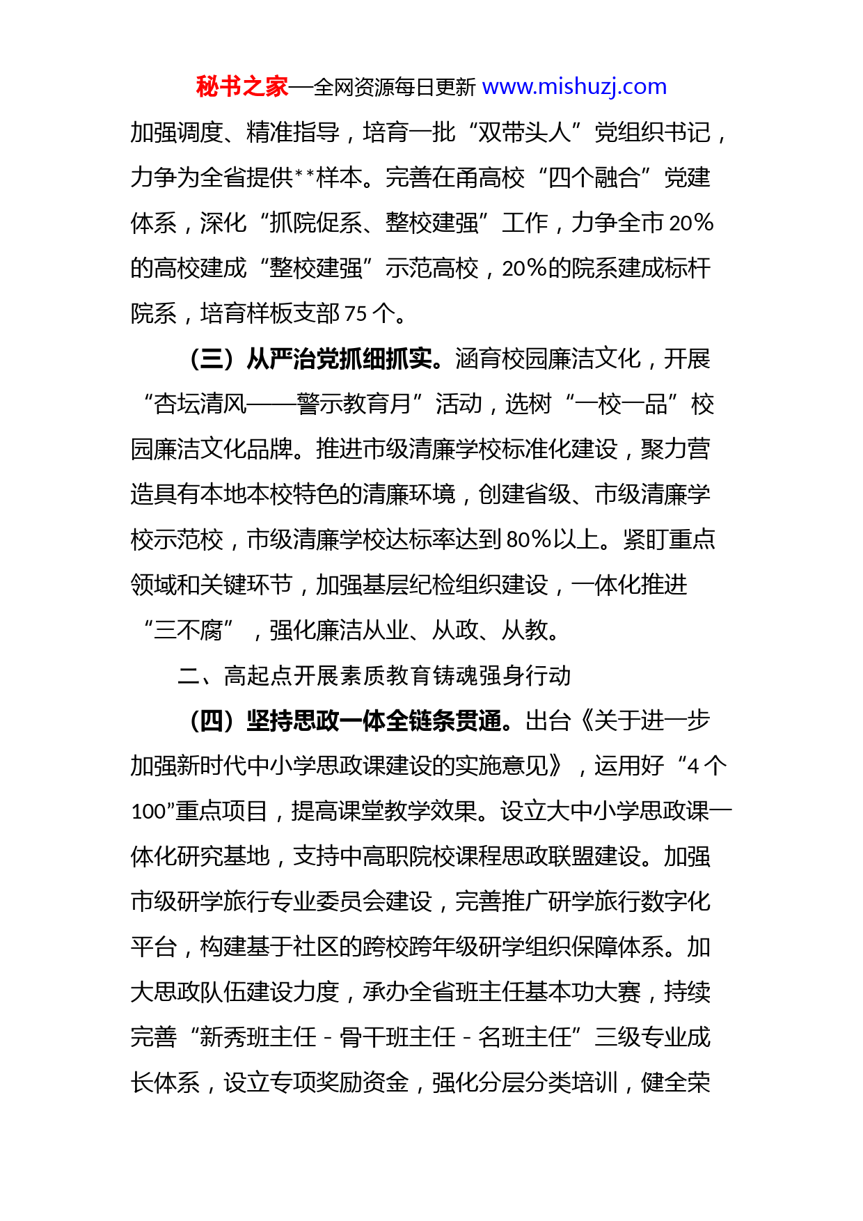 秘书之家—全网资源每日更新www.mishuzj.com某市教育局2023年工作要点2023年是全面贯彻落实党的二十大精神的开局之年,是实施“十四五”规划承上启下的重要一年,全市教育系统要坚持以习近平新时代中国特色社会主义思想为指导,深入贯彻落实党的二十大精神、习近平总书记关于教育的重要论述以及省、市党代会精神,围绕市委、市政府工作部署,落实科教兴市战略,落实立德树人根本任务,发展素质教育,促进教育公平,加快建设高质量教育体系,培养德智体美劳全面发展的社会主义建设者和接班人,为加快建设现代化滨海大都市、推进“两个先行”、打造中国式现代化市域样板提供教育和人才支撑。一、高站位开展党的全面领导引领行动(一)主题教育学深悟透。在全市教育系统广泛开展学习贯彻党的二十大精神活动,紧密结合主题教育和“六学六增六提升”学习实践活动,分层分类组织学习轮训,丰富党委理论中心组学习会、读书会、培训班、专题讲座等学习形式,确保主题教育走深走实,推动全市师生学深悟透、知行合一,切实把学习成效转化为干事创业的强大动力。(二)党建统领谋新创优。全面推进全市中小学校党组织领导的校长负责制,到2023年底全部调整到位。出台《中小学校章程修订参考文本》,组织书记、校长轮训,秘书之家—全网资源每日更新www.mishuzj.com加强调度、精准指导,培育一批“双带头人”党组织书记,力争为全省提供样本。完善在甬高校“四个融合”党建体系,深化“抓院促系、整校建强”工作,力争全市20%的高校建成“整校建强”示范高校,20%的院系建成标杆院系,培育样板支部75个。(三)从严治党抓细抓实。涵育校园廉洁文化,开展“杏坛清风——警示教育月”活动,选树“一校一品”校园廉洁文化品牌。推进市级清廉学校标准化建设,聚力营造具有本地本校特色的清廉环境,创建省级、市级清廉学校示范校,市级清廉学校达标率达到80%以上。紧盯重点领域和关键环节,加强基层纪检组织建设,一体化推进“三不腐”,强化廉洁从业、从政、从教。二、高起点开展素质教育铸魂强身行动(四)坚持思政一体全链条贯通。出台《关于进一步加强新时代中小学思政课建设的实施意见》,运用好“4个100”重点项目,提高课堂教学效果。设立大中小学思政课一体化研究基地,支持中高职院校课程思政联盟建设。加强市级研学旅行专业委员会建设,完善推广研学旅行数字化平台,构建基于社区的跨校跨年级研学组织保障体系。加大思政队伍建设力度,承办全省班主任基本功大赛,持续完善“新秀班主任-骨干班主任-名班主任”三级专业成长体系,设立专项奖励资金,强化分层分类培训,健全荣秘书之家—全网资源每日更新www.mishuzj.com誉激励机制,助推班主任阶梯式成长。高质量建设第五批市级文明校园,学校文明创建和未成年人思想道德建设测评排名位居全国前列。(五)坚持五育并举全方位培养。实施《市学生体质健康提升三年行动计划》,强化针对性干预。全面落实《关于全面加强新时代中小学劳动教育的实施意见》,创新实施“劳动+产业”“劳动+职教”“劳动+社区”等新型实践模式,推动劳动教育地方化、清单化、校本化。发挥好素质教育“五个中心”作用,加快打造以核心素养培育为导向的“五育”融合的课后服务品牌。写好“双减”后半篇,强化学校教育主阵地作用,优化课堂教学研修,提升校内作业设计和实施能力;开展违规学科培训整治“清朗行动”,健全非学科类校外培训机构治理体系,积极引导校外资源形成有益补充。(六)坚持成长指导全过程引领。完善市区校三级学生成长指导联动模式,选树14个示范性“学生成长指导工作站”,授牌20个“学生成长指导特色课程共建基地”,开展“百节成长指导特色课程”“百场学生成长指导活动”进校园系列服务,举办学生成长指导年度学术论坛。健全中小学生心理健康服务体系,强化生命健康教育,探索问题会诊式全程性家庭教育服务体系建设。三、高标准开展办学质量创优提质行动秘书之家—全网资源每日更新www.mishuzj.com(七)推进学前教育补短提质。落实《市学前教育发展第四轮行动计划(2022-2025年)》,建立健全与人口增长相适应的教育资源配置机制,全市公办幼儿园在园幼儿占比达到60%,二级及以上幼儿园在园幼儿占比达78%及以上,普惠性幼儿园在园幼儿占比达90%及以上。持续推进幼儿园品牌课程建设,出台区域性课程质量评估标准,评选首批品牌课程优秀教师。推动适托化改造,鼓励支持有条件的幼儿园开设托班。(八)促进义务教育优质均衡。加速推进全国义务教育优质均衡县创建,科学设置激励举措,力争1-2个区(县、市)通过复核评估。推进教共体建设,县域内融合型、共建型教共体占比不低于60%。抓实免试就近入学、公民同招,完善多孩家庭子女、高层次人才子女、随迁子女入学服务流程。加强市级课后服务综合管理系统和作业管理系统等数字化平台建设,数字赋能课程供给、师资共享和作业监管。(九)强化普通高中提质扩面。稳慎推进中考中招改革,完善普通高中自主招生、定向分配等管理办法,引导初中学校均衡发展。出台市普通高中新一轮优质特色发展行动计划,构建普通高中学校分层与分类相结合发展格局,探索拔尖创新人才早期培养机制。实施直属普通高中学科支持计