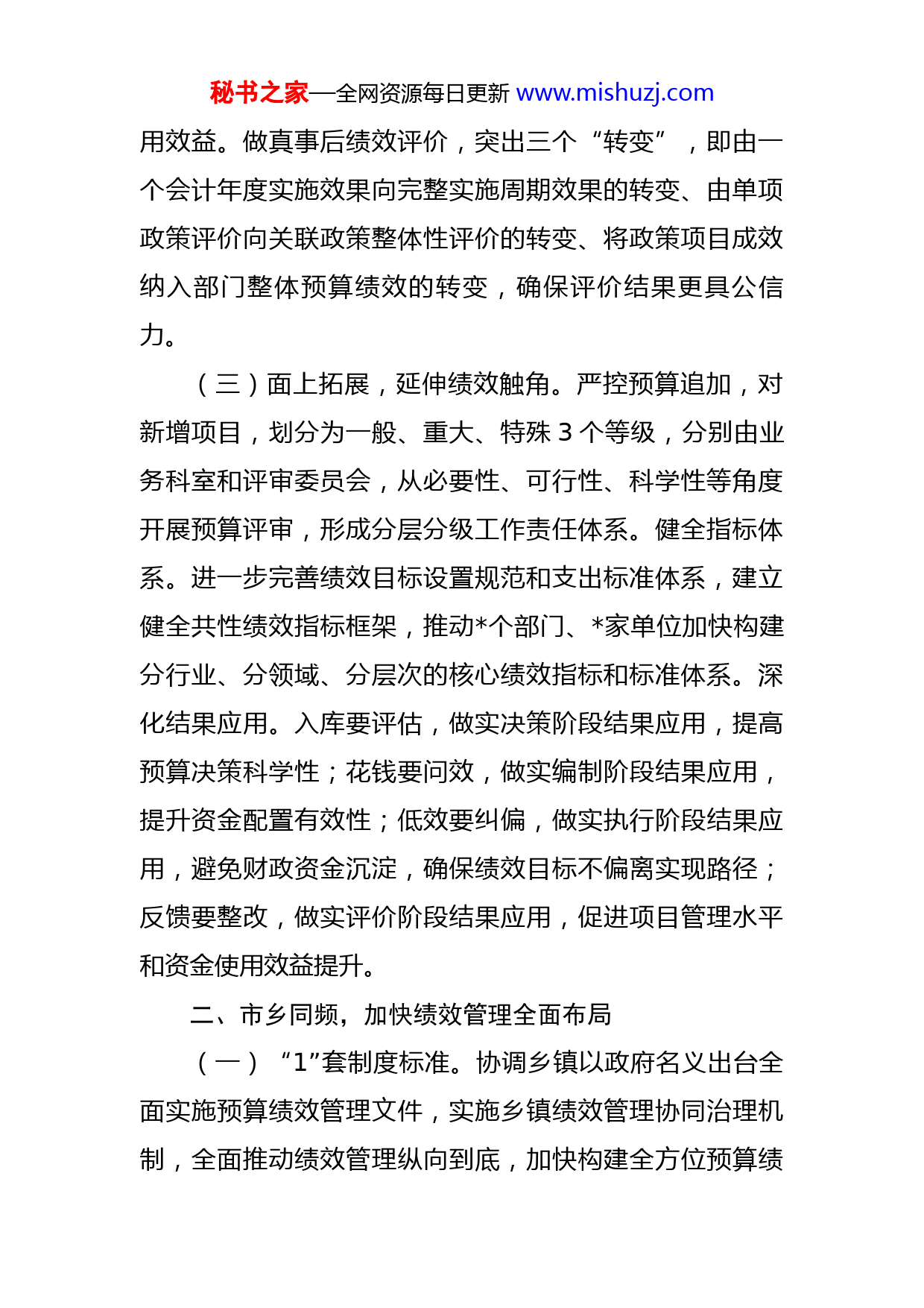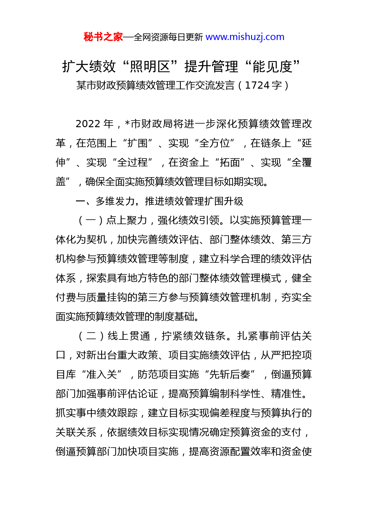 秘书之家—全网资源每日更新www.mishuzj.com扩大绩效“照明区”提升管理“能见度”某市财政预算绩效管理工作交流发言(1724字)2022年,市财政局将进一步深化预算绩效管理改革,在范围上“扩围”、实现“全方位”,在链条上“延伸”、实现“全过程”,在资金上“拓面”、实现“全覆盖”,确保全面实施预算绩效管理目标如期实现。一、多维发力,推进绩效管理扩围升级(一)点上聚力,强化绩效引领。以实施预算管理一体化为契机,加快完善绩效评估、部门整体绩效、第三方机构参与预算绩效管理等制度,建立科学合理的绩效评估体系,探索具有地方特色的部门整体绩效管理模式,健全付费与质量挂钩的第三方参与预算绩效管理机制,夯实全面实施预算绩效管理的制度基础。(二)线上贯通,拧紧绩效链条。扎紧事前评估关口,对新出台重大政策、项目实施绩效评估,从严把控项目库“准入关”,防范项目实施“先斩后奏”,倒逼预算部门加强事前评估论证,提高预算编制科学性、精准性。抓实事中绩效跟踪,建立目标实现偏差程度与预算执行的关联关系,依据绩效目标实现情况确定预算资金的支付,倒逼预算部门加快项目实施,提高资源配置效率和资金使秘书之家—全网资源每日更新www.mishuzj.com用效益。做真事后绩效评价,突出三个“转变”,即由一个会计年度实施效果向完整实施周期效果的转变、由单项政策评价向关联政策整体性评价的转变、将政策项目成效纳入部门整体预算绩效的转变,确保评价结果更具公信力。(三)面上拓展,延伸绩效触角。严控预算追加,对新增项目,划分为一般、重大、特殊3个等级,分别由业务科室和评审委员会,从必要性、可行性、科学性等角度开展预算评审,形成分层分级工作责任体系。健全指标体系。进一步完善绩效目标设置规范和支出标准体系,建立健全共性绩效指标框架,推动个部门、家单位加快构建分行业、分领域、分层次的核心绩效指标和标准体系。深化结果应用。入库要评估,做实决策阶段结果应用,提高预算决策科学性;花钱要问效,做实编制阶段结果应用,提升资金配置有效性;低效要纠偏,做实执行阶段结果应用,避免财政资金沉淀,确保绩效目标不偏离实现路径;反馈要整改,做实评价阶段结果应用,促进项目管理水平和资金使用效益提升。二、市乡同频,加快绩效管理全面布局(一)“1”套制度标准。协调乡镇以政府名义出台全面实施预算绩效管理文件,实施乡镇绩效管理协同治理机制,全面推动绩效管理纵向到底,加快构建全方位预算绩秘书之家—全网资源每日更新www.mishuzj.com效管理格局。(二)“2”种管理方法。一是以培促学,分级分批组织各类培训,牢固树立绩效理念,熟悉管理流程,掌握工作方法,提升管理能力。二是以考代评,丰富乡镇绩效管理考核内容,充分发挥乡镇集约、节约、高效使用财政资金的主观能动性。(三)“3”步走好绩效全过程。一是优化绩效信息平台,加强系统互联互通,促进信息有效传输,实现乡镇绩效管理从“人为判断”向“数字应用”转变。二是建立健全事前绩效评估和绩效目标申报、事中运行监控、事后绩效评价和绩效结果应用的全生命周期预算绩效管理机制。三是形成“反馈—整改—提升”的结果应用良性循环,体现结果导向,压缩乡镇资金管理的“任性空间”,强化“钱该不该花、应该怎么花”的刚性约束。三、内外协同,形成绩效管理强大合力(一)实现齐抓共管。厘清财政与部门工作职责,围绕资金绩效这个中心,聚焦政策和资金两条主线,紧扣决策、过程、产出、效益四个维度,把脉问诊。找出“低效”资金,尤其是长期“趴账”资金,加快支出进度或及时调整支出方向;找出“无效”资金,及时收回做“减法”。寓服务于监管之中,逐步形成“预算部门抓日常,财政部门抓重点”的一盘棋机制,构建部门内外统一协调秘书之家—全网资源每日更新www.mishuzj.com的大分工、大协作格局。(二)实现联动监督。充分发挥省市高质量发展考核体系的“绩效指挥棒”作用,统筹推进全域预算绩效管理各项改革攻坚任务。对内,构建协调顺畅的协同机制;对外,建立财政人大审计等联动监督机制;向上,做好与省财政厅工作衔接;向下,推动与乡镇同频共振。(三)实现借力引智。坚持“质量导向、择优选取”原则,引进资质水平高、专业能力强的合作机构,建立行业专家库,充分发挥第三方机构和专家的独立性和专业性优势,为积极构建新发展格局提供智力支撑。财政部门着力在方案、指标的制定和报告的撰写等关键点,加强引导、规范管理,提高第三方机构绩效管理质量。
