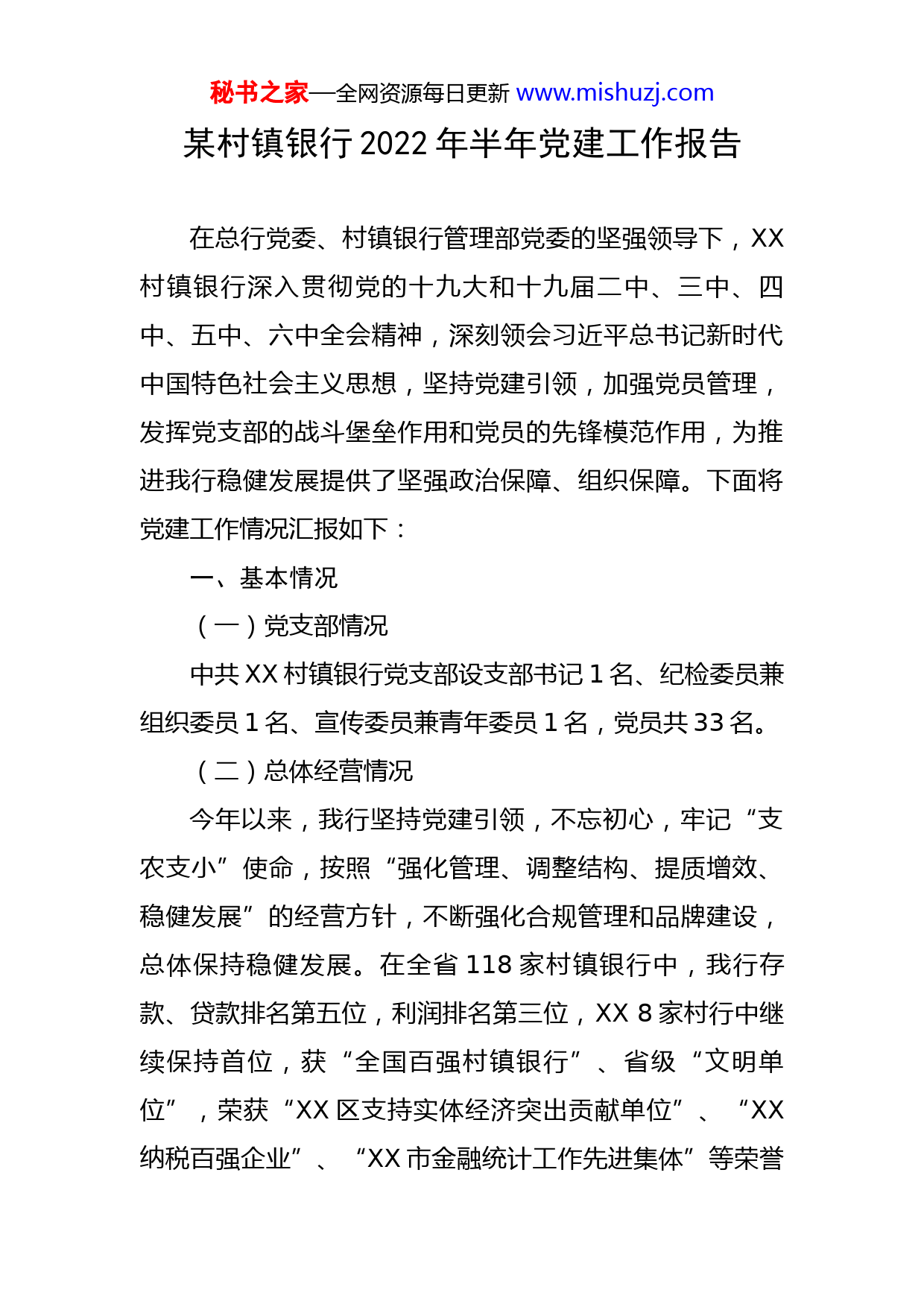 秘书之家—全网资源每日更新www.mishuzj.com某村镇银行2022年半年党建工作报告在总行党委、村镇银行管理部党委的坚强领导下,XX村镇银行深入贯彻党的十九大和十九届二中、三中、四中、五中、六中全会精神,深刻领会习近平总书记新时代中国特色社会主义思想,坚持党建引领,加强党员管理,发挥党支部的战斗堡垒作用和党员的先锋模范作用,为推进我行稳健发展提供了坚强政治保障、组织保障。下面将党建工作情况汇报如下:一、基本情况(一)党支部情况中共XX村镇银行党支部设支部书记1名、纪检委员兼组织委员1名、宣传委员兼青年委员1名,党员共33名。(二)总体经营情况今年以来,我行坚持党建引领,不忘初心,牢记“支农支小”使命,按照“强化管理、调整结构、提质增效、稳健发展”的经营方针,不断强化合规管理和品牌建设,总体保持稳健发展。在全省118家村镇银行中,我行存款、贷款排名第五位,利润排名第三位,XX8家村行中继续保持首位,获“全国百强村镇银行”、省级“文明单位”,荣获“XX区支持实体经济突出贡献单位”、“XX纳税百强企业”、“XX市金融统计工作先进集体”等荣誉秘书之家—全网资源每日更新www.mishuzj.com称号。是XX省村镇银行委员会主任单位,社会影响力不断提升。二、党建工作情况(一)加强党员管理,狠抓思想政治教育,为各项业务发展做好坚强的政治保障为提高党员的政治素质和理论水平,发挥党员的先锋模范作用,强化责任意识和担当意识,党支部持续加强党员的学习教育工作。一是坚持不懈抓思想政治教育。贯彻落实习近平新时代中国特色社会主义思想,深入学习党章、党规以及习近平关于治国理政重要论述,强化党员理论武装和主人翁意识,学习时间、人员、内容和效果“四落实”。二是以增强党组织生机活力为着力点,认真落实“三会一课”、民主评议、组织生活会等制度,开展了各种主题教育活动,党员“四个意识”得到显著增强。三是按照党委部署,组织开展党员考试工作,以考促学,提升学习效果。通过加强对党员管理,狠抓思想政治教育,为各项业务发展做好坚强的政治保障。(二)明确重点任务,广泛开展党建活动,推进党的建设工作一是积极推进落实党建重点任务措施清单,列出学习配档表,明确工作重点。二是重大决策、重大问题首先提交党组织会议研究讨论,强化党对经营管理工作的统一领秘书之家—全网资源每日更新www.mishuzj.com导。三是实施“书记项目、党员公关项目”,党支部书记为第一责任人,带头抓党建,使基层党建工作化“虚”为“实”。四是对日常学习内容列出清单,加强督导,并对党员笔记定期检查通报。目前我行共121名干部职工,其中共产党员33人,占全部员工的27.3%。党支部按照“三会一课”要求,每月组织召开支部会议,组织全体党员集中学习。今年以来召开支部会议16次,召开民主生活会1次,召开党课10次,及时传达党委会议精神,开展了抗疫党员志愿服务、街道结对共建活动,党建引领携手促进精准扶贫,公益环保活动等。(三)完善相关设施,加强党的标准化建设按照标准化要求,不断完善软硬件设施。一是修订完善支部学习制度、会议制度等,完善制度体系,营造良好的党建文化氛围。二是对党员活动室制度上墙,进一步优化了党员学习活动环境,活动室配置了健身器、跑步机、乒乓球台等健身娱乐设施,员工利用休息时间进行体育锻炼和休闲娱乐,丰富员工文体生活。三是党组织紧密联系群众,对党员干部职工思想动态变化及时掌握,春节期间对员工进行家访,帮助解决实际困难,让他们全身心地投入到工作中。(四)加强纪检工作,高度重视案件防控秘书之家—全网资源每日更新www.mishuzj.com上半年全面开展员工行为排查,通过工商、征信、涉诉以及账户监控等方式对全员进行异常行为排查。建立员工直系亲属经商名录,对员工进行警示教育,7月份召开了全行警示教育会议;加强案防合规学习,完成案防合规考试全员覆盖工作。另外平时注重加强飞行检查,加强违规处罚,严防员工八小时内外的道德风险,杜绝各类案防和事件的发生。三、下一步的工作计划结合党建工作实际,下一步我行将从以下几方面进行完善:(一)强化理论学习,加强思想教育一是学习内容更加深入。更加系统深入的学习贯彻党的二十大会议精神、习近平新时代中国特色社会主义思想以及习近平总书记系列重要讲话精神。加强对党章、党规、纪律处分条例、廉洁自律准则的集中培训,引导党员干部不断增强四个意识,切实提高风险意识、危机意识和责任意识。扎实开展好“不忘初心、牢记使命”主题教育。二是学习方式更加丰富。做好学习计划,扩展学习方式,积极通过学习考试、知识竞赛、演讲比赛等方式,进一步活跃学习气氛,提升学习效果。三是理论与实际相结合。对学习的相关理论知识,与实际工作相结合,对照要求、分析不足、剖析原因、积极改进,切实将学习的知识秘书之家—全网资源每日更新www.mishuzj.com应用到实际工作中和日常生活中,学以致用。(二)加强作风建设,发挥党员带头作用一是强化责任担当意识。各级领导干部以身作则,严格要求自己,提高党员的政治意识,带头冲锋,身先士卒,积极争先,为全行员工树立榜样,并优先提拔敢于担当、迎难而上的干部,切实发挥党员的模范带头作用,发挥党支部战斗堡垒作