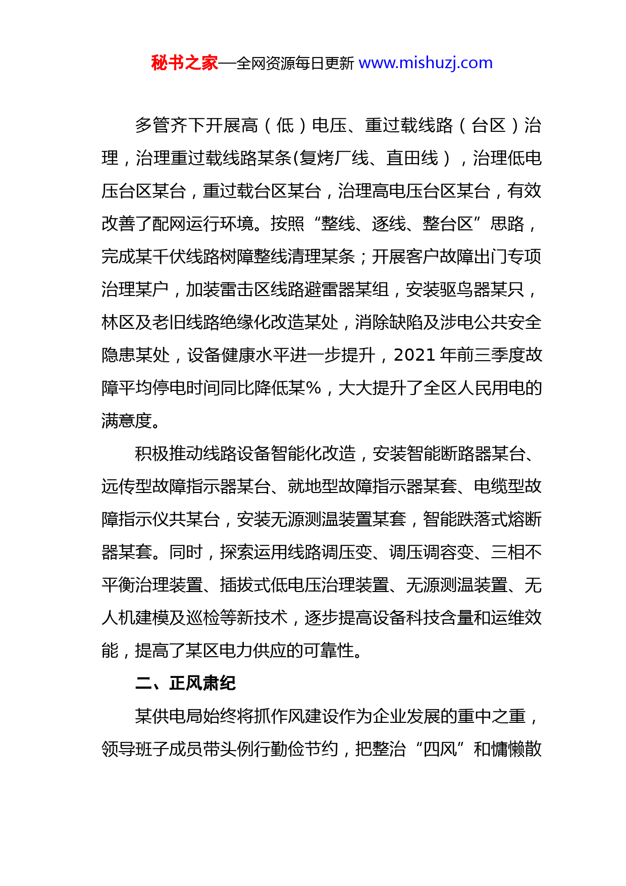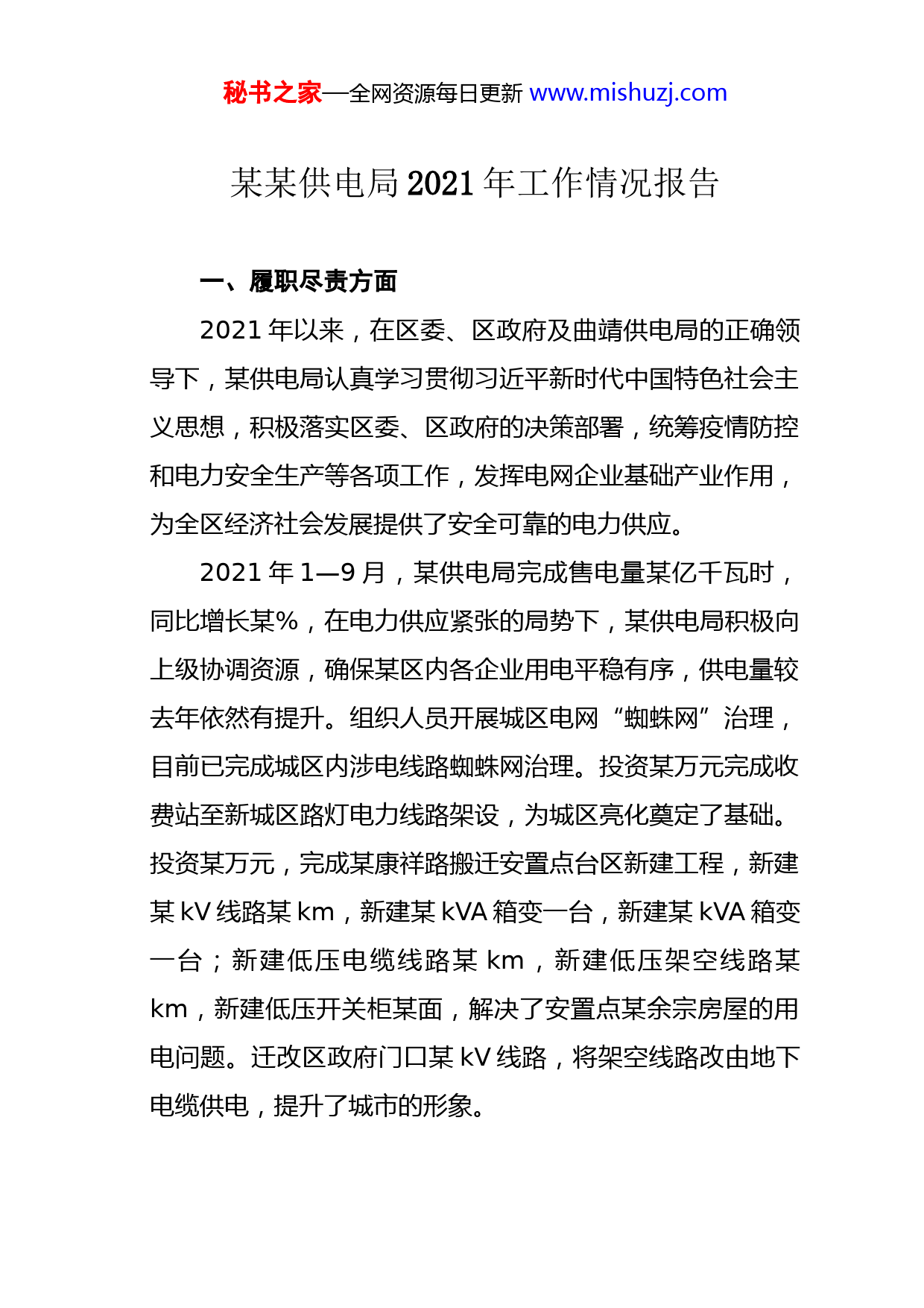 秘书之家—全网资源每日更新www.mishuzj.com某某供电局2021年工作情况报告一、履职尽责方面2021年以来,在区委、区政府及曲靖供电局的正确领导下,某供电局认真学习贯彻习近平新时代中国特色社会主义思想,积极落实区委、区政府的决策部署,统筹疫情防控和电力安全生产等各项工作,发挥电网企业基础产业作用,为全区经济社会发展提供了安全可靠的电力供应。2021年1—9月,某供电局完成售电量某亿千瓦时,同比增长某%,在电力供应紧张的局势下,某供电局积极向上级协调资源,确保某区内各企业用电平稳有序,供电量较去年依然有提升。组织人员开展城区电网“蜘蛛网”治理,目前已完成城区内涉电线路蜘蛛网治理。投资某万元完成收费站至新城区路灯电力线路架设,为城区亮化奠定了基础。投资某万元,完成某康祥路搬迁安置点台区新建工程,新建某kV线路某km,新建某kVA箱变一台,新建某kVA箱变一台;新建低压电缆线路某km,新建低压架空线路某km,新建低压开关柜某面,解决了安置点某余宗房屋的用电问题。迁改区政府门口某kV线路,将架空线路改由地下电缆供电,提升了城市的形象。秘书之家—全网资源每日更新www.mishuzj.com多管齐下开展高(低)电压、重过载线路(台区)治理,治理重过载线路某条(复烤厂线、直田线),治理低电压台区某台,重过载台区某台,治理高电压台区某台,有效改善了配网运行环境。按照“整线、逐线、整台区”思路,完成某千伏线路树障整线清理某条;开展客户故障出门专项治理某户,加装雷击区线路避雷器某组,安装驱鸟器某只,林区及老旧线路绝缘化改造某处,消除缺陷及涉电公共安全隐患某处,设备健康水平进一步提升,2021年前三季度故障平均停电时间同比降低某%,大大提升了全区人民用电的满意度。积极推动线路设备智能化改造,安装智能断路器某台、远传型故障指示器某台、就地型故障指示器某套、电缆型故障指示仪共某台,安装无源测温装置某套,智能跌落式熔断器某套。同时,探索运用线路调压变、调压调容变、三相不平衡治理装置、插拔式低电压治理装置、无源测温装置、无人机建模及巡检等新技术,逐步提高设备科技含量和运维效能,提高了某区电力供应的可靠性。二、正风肃纪某供电局始终将抓作风建设作为企业发展的重中之重,领导班子成员带头例行勤俭节约,把整治“四风”和慵懒散秘书之家—全网资源每日更新www.mishuzj.com奢作为检验领导干部的首要标尺。公开“书记信箱”“工会主席”信箱,主动接受各级人员的监督,同时主动到社区、村庄,了解广大群众对电力工作的满意度,对群众反映的用电问题立即布置解决。努力践行人民电业为人民的企业宗旨,疑难险重面前,领导干部带头冲到前面,多次连夜开展电力抢修成为某电力人践行对全区供电的承诺。全年未出现整治“四风”不力和慵懒散奢、纪律松弛等问题。三、优化服务紧盯政府招商引资项目落地情况,全方位做好电力配套工作,对钢铁、黄磷等大客户提供定制化服务,引导其避开高峰期、低谷期满发多发,在有序用电的背景下,千方百计提高售电量。认真落实某省坚决遏制“两高”项目盲目发展有关工作要求,构建政企联动机制,促成区政府成立专班,确保了“两高”企业用电管控全面到位且未出现负面舆论影响。截止目前,圆满组织完成高考、中考、庆祝中国共产党成立100周年、某区庆祝中国共产党成立100周年百首红歌献给党大型歌咏比赛活动、COP15保供电等某次保供电任务,累计出动人员某人次、车辆某台次、应急发电车某辆次,应急发电机某台次。各项应急保供电任务的圆满完成,秘书之家—全网资源每日更新www.mishuzj.com未发生保供电失效事件。认真分析某区主电网存在的薄弱问题,安排人员开展调查分析,形成电网问题库,并协同多方资源向上级要资金、要项目用于建设某区电网,2021年实施项目某项,投资某万元用于强化某区电网。优选某个网格列入2022年重点建设网格,解决问题某个,输出项目某项,预计项目实施后,中压线路可转供电率由某%提高至某%,将大大缩短某城区停电时间。围绕地方经济社会发展电力需求,高质量修编某配电网“十四五”规划、“一县一可研”,有序开展规划落地实施,解决某电网突出问题。深化“运规合一”“统一建设”管理,推进某配电网某个网格储备项目的落地实施。将某城区“1小时停电”要求植入未来网架构建中,加快某千伏让田变电站建设,满足通泉片区、南海子工业园区用电需求;加快某千伏照和变以“2-1单环网”为目标中压供电网架,通过新建出线分割、转移负荷,合理联络,实现线路互供转供,改善网架结构。四、工作效率有效落实“三零三减两提升”服务举措,全区低压居民、低压非居民、高压单电源用户平均接电时间分别缩短为秘书之家—全网资源每日更新www.mishuzj.com2.03、2.22、22.82个工作日,线上报装率达某%,实现低压居民和低压小微企业客户用电报装“零上门”。完成业扩配套项目建设某项目,为客户节省某万元,实现低压小微企业客户用电“零投资”。五、廉政建设严格落实从严治党的主体责任,按照抓业务就要抓监督的原则,不断强化党的诊治建设和纪律建设,设立独立的纪检监督机构,做实做细纪律监督工作。构建了三级、四级纪检监督网格管理架构,制定《曲靖某供电局全面监督工作激励方案》
