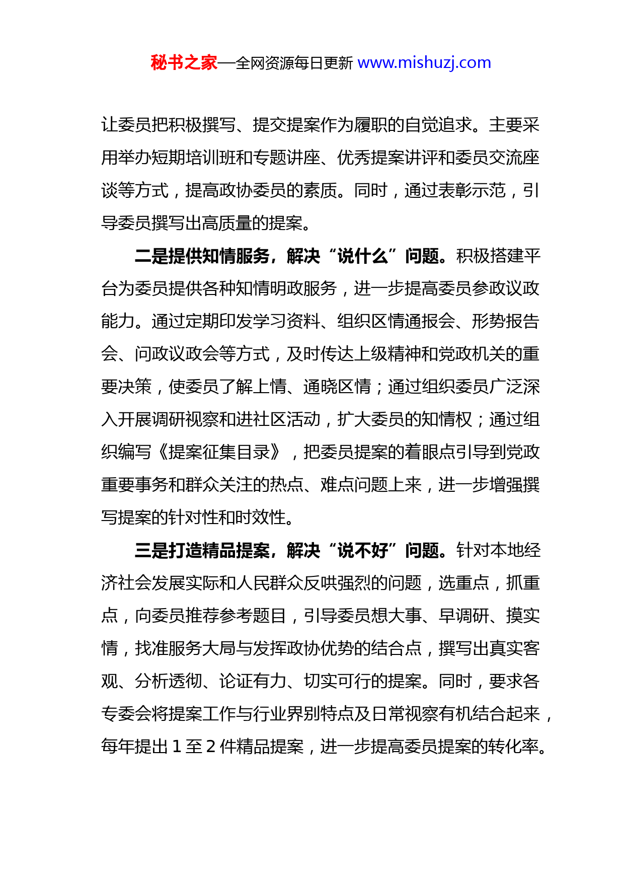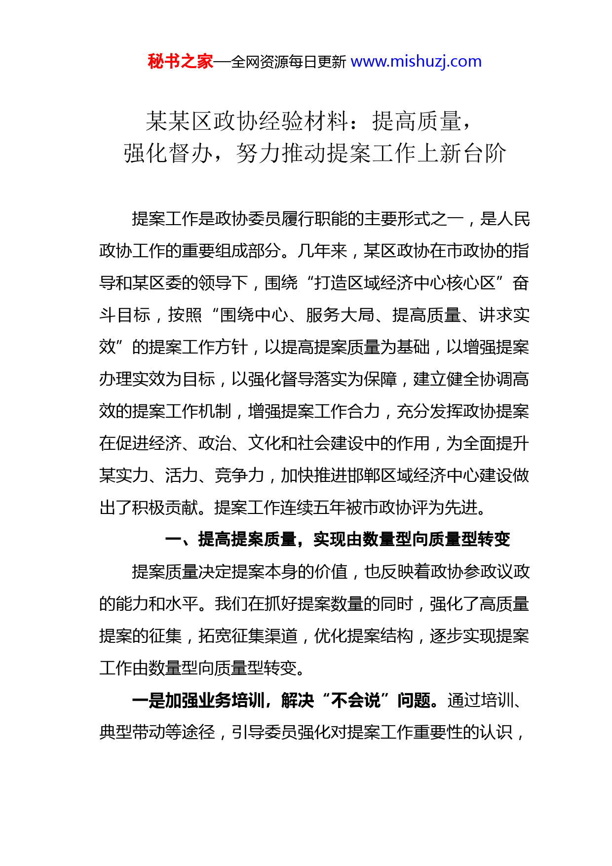 秘书之家—全网资源每日更新www.mishuzj.com某某区政协经验材料:提高质量,强化督办,努力推动提案工作上新台阶提案工作是政协委员履行职能的主要形式之一,是人民政协工作的重要组成部分。几年来,某区政协在市政协的指导和某区委的领导下,围绕“打造区域经济中心核心区”奋斗目标,按照“围绕中心、服务大局、提高质量、讲求实效”的提案工作方针,以提高提案质量为基础,以增强提案办理实效为目标,以强化督导落实为保障,建立健全协调高效的提案工作机制,增强提案工作合力,充分发挥政协提案在促进经济、政治、文化和社会建设中的作用,为全面提升某实力、活力、竞争力,加快推进邯郸区域经济中心建设做出了积极贡献。提案工作连续五年被市政协评为先进。一、提高提案质量,实现由数量型向质量型转变提案质量决定提案本身的价值,也反映着政协参政议政的能力和水平。我们在抓好提案数量的同时,强化了高质量提案的征集,拓宽征集渠道,优化提案结构,逐步实现提案工作由数量型向质量型转变。一是加强业务培训,解决“不会说”问题。通过培训、典型带动等途径,引导委员强化对提案工作重要性的认识,秘书之家—全网资源每日更新www.mishuzj.com让委员把积极撰写、提交提案作为履职的自觉追求。主要采用举办短期培训班和专题讲座、优秀提案讲评和委员交流座谈等方式,提高政协委员的素质。同时,通过表彰示范,引导委员撰写出高质量的提案。二是提供知情服务,解决“说什么”问题。积极搭建平台为委员提供各种知情明政服务,进一步提高委员参政议政能力。通过定期印发学习资料、组织区情通报会、形势报告会、问政议政会等方式,及时传达上级精神和党政机关的重要决策,使委员了解上情、通晓区情;通过组织委员广泛深入开展调研视察和进社区活动,扩大委员的知情权;通过组织编写《提案征集目录》,把委员提案的着眼点引导到党政重要事务和群众关注的热点、难点问题上来,进一步增强撰写提案的针对性和时效性。三是打造精品提案,解决“说不好”问题。针对本地经济社会发展实际和人民群众反哄强烈的问题,选重点,抓重点,向委员推荐参考题目,引导委员想大事、早调研、摸实情,找准服务大局与发挥政协优势的结合点,撰写出真实客观、分析透彻、论证有力、切实可行的提案。同时,要求各专委会将提案工作与行业界别特点及日常视察有机结合起来,每年提出1至2件精品提案,进一步提高委员提案的转化率。秘书之家—全网资源每日更新www.mishuzj.com四是严格审查立案,解决“不规范”问题。对同一个问题多年重复提出的提案,用意见和建议的形式督促承办单位加大解决力度;对内容、建议相同相似的集体与个人提案,采取与委员协商沟通后并案处理;对一案多事无法确定承办单位的提案,指导委员按照“一事一案”的要求,重新撰写提案;对内容较好但建议不够全面具体的提案,指导其完善提案内容,使之重新达到立案标准;对内容空洞,无具体建议或建议明显没有可行性的提案,退回提案人修改。严格实行提案初审、复审、疑难提案会审制度,严把提案质量关,从源头上提高提案的质量。二、提升办理质量,实现由答复型向落实型转变提案办理是提案工作的核心和关键,而办理的最终目的是采纳和落实,发挥提案的最佳效益。近几年,我们从提高提案采纳率、落实率入手,不断改进办理方式,完善办理制度,实现了办理工作由答复型向落实型的转变。一是创新交办形式。建立政协提案联合交办制度。由区政协与区委、区政府联合召开“政协提案工作交办会”,邀请党委政府有关领导参加,现场交办,明确要求。进一步加强各承办单位对政协提案办理工作的高度重视,促进对政协提案意见建议的广纳吸收,全面提升提案办理质量和效率。秘书之家—全网资源每日更新www.mishuzj.com二是提高运作层次。健全完善高层运作管理模式。将集体提案和筛选出的重点提案送区委、区政府有关领导阅批,并对相关提案提出具体承办要求。同时,主席、副主席领办重点提案。根据提案内容和提案所涉及的工作特点,采取调查研究、座谈讨论、现场办案、跟踪办理等督办方式,协调解决矛盾问题,推动提案的有效落实。三是深化紧密配合。充分加强与提案者沟通交流。委员的意见和建议立案以后,承办单位提前走访,主要了解委员提案的前因后果,了解提案的真正意图,掌握第一手材料,以确定承办的具体时间和实际情况。在办理过程中,承办单位研究协商解决问题的具体办法。提案办理后,承办单位在征求委员意见的基础上,征求对办理结果的意见和建议,进一步改进和完善工作,发挥提案的最大效益。四是确保满意办结。注重加强与区委办、区政府办及各承办单位的沟通与协调,积极配合“两办”协调提案人参与承办单位召开的征求意见会和情况通报会。通过视察和参加各种会议,在加强沟通了解、达到谅解的基础上,对办理落实工作提出切实可行的意见和建议,力求做到件件有落实。在办理过程中,“两办”主动及时向区政协通报办理进度,反映问题,并加强督办。近年来我区交办的提案得到了各部秘书之家—全网资源每日更新www.mishuzj.com门认真办理,办复率都达到了某%,委员对办理结果表示满意的占某%以上。三、加大督办力度,实现由自发型向监