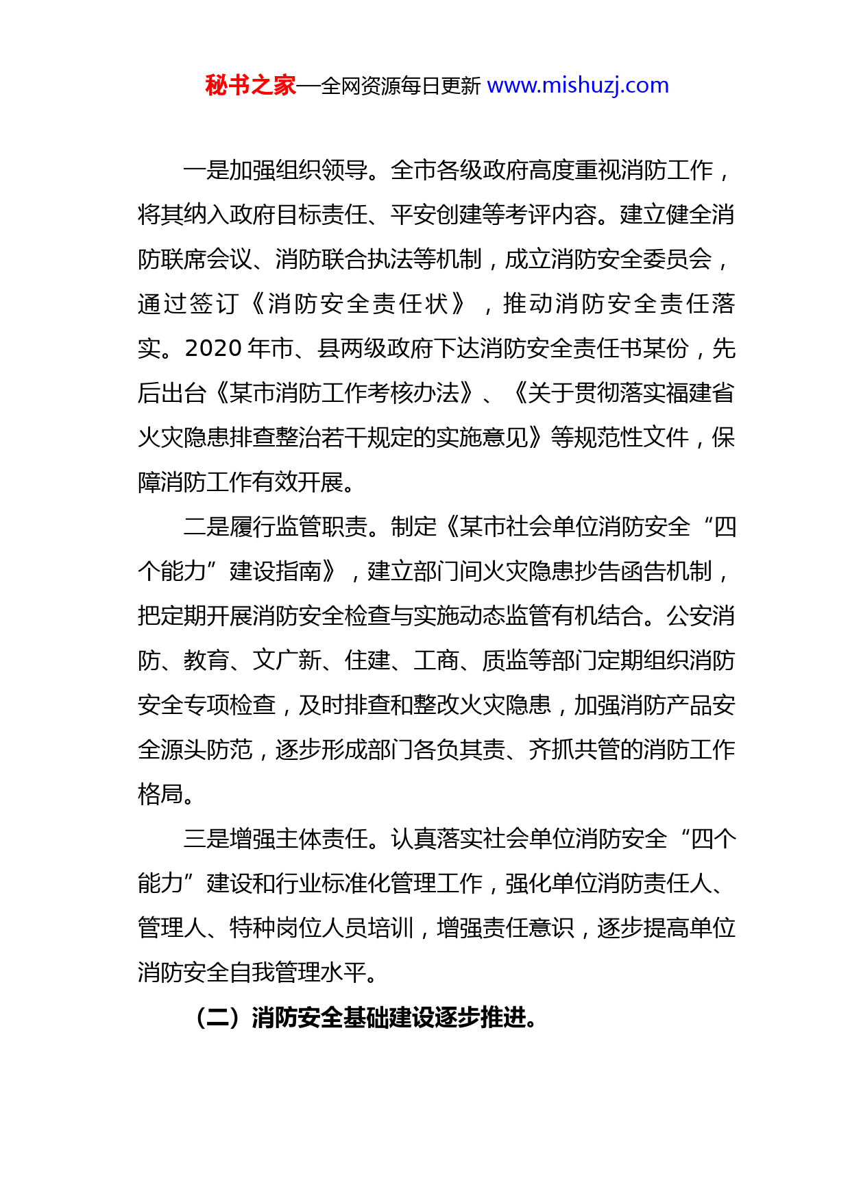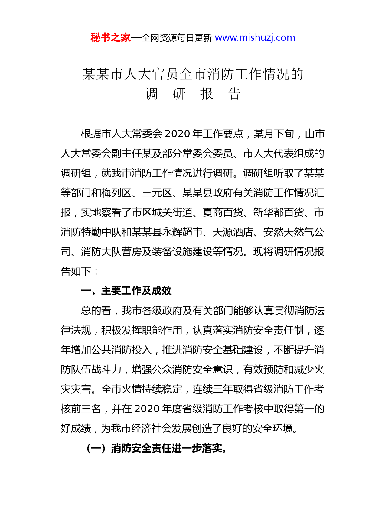 秘书之家—全网资源每日更新www.mishuzj.com某某市人大官员全市消防工作情况的调研报告根据市人大常委会2020年工作要点,某月下旬,由市人大常委会副主任某及部分常委会委员、市人大代表组成的调研组,就我市消防工作情况进行调研。调研组听取了某某等部门和梅列区、三元区、某某县政府有关消防工作情况汇报,实地察看了市区城关街道、夏商百货、新华都百货、市消防特勤中队和某某县永辉超市、天源酒店、安然天然气公司、消防大队营房及装备设施建设等情况。现将调研情况报告如下:一、主要工作及成效总的看,我市各级政府及有关部门能够认真贯彻消防法律法规,积极发挥职能作用,认真落实消防安全责任制,逐年增加公共消防投入,推进消防安全基础建设,不断提升消防队伍战斗力,增强公众消防安全意识,有效预防和减少火灾灾害。全市火情持续稳定,连续三年取得省级消防工作考核前三名,并在2020年度省级消防工作考核中取得第一的好成绩,为我市经济社会发展创造了良好的安全环境。(一)消防安全责任进一步落实。秘书之家—全网资源每日更新www.mishuzj.com一是加强组织领导。全市各级政府高度重视消防工作,将其纳入政府目标责任、平安创建等考评内容。建立健全消防联席会议、消防联合执法等机制,成立消防安全委员会,通过签订《消防安全责任状》,推动消防安全责任落实。2020年市、县两级政府下达消防安全责任书某份,先后出台《某市消防工作考核办法》、《关于贯彻落实福建省火灾隐患排查整治若干规定的实施意见》等规范性文件,保障消防工作有效开展。二是履行监管职责。制定《某市社会单位消防安全“四个能力”建设指南》,建立部门间火灾隐患抄告函告机制,把定期开展消防安全检查与实施动态监管有机结合。公安消防、教育、文广新、住建、工商、质监等部门定期组织消防安全专项检查,及时排查和整改火灾隐患,加强消防产品安全源头防范,逐步形成部门各负其责、齐抓共管的消防工作格局。三是增强主体责任。认真落实社会单位消防安全“四个能力”建设和行业标准化管理工作,强化单位消防责任人、管理人、特种岗位人员培训,增强责任意识,逐步提高单位消防安全自我管理水平。(二)消防安全基础建设逐步推进。秘书之家—全网资源每日更新www.mishuzj.com一是公共消防设施不断完善。全市建立市政消火栓建设维保机制,共新建某个,维修保养某个消火栓。某某县各乡镇配备某台消防机泵,部分乡镇配置消防车或经改装的洒水车,消防安全保障能力有所提升。二是部队装备条件逐步改善。市消防应急救援指挥中心业务用房项目主体工程封顶,建宁、某某县新消防站先后建成并投入使用。全市累计投入某余万元购置消防车某辆,器材装备某件(套)。三是消防保障经费逐年增加。“十二五”期间,市级财政安排消防经费年均增长某%。2020年市财政安排消防业务保障和项目建设经费某万元,同比上年增长某%。永安市、建宁县投入消防业务经费同比上年分别增长某%、某%。四是消防专项规划有序推进。全市中心城区、建制镇和有总体规划的乡均完成消防专项规划编制审批工作,市区将规划增设贵溪洋、富兴堡消防站。(三)消防安全综合治理不断深化。一是加强火灾隐患排查。2020年以来,全市共检查单位某家,督促整改火灾隐患某条,责令“三停”单位某家,治安拘留某人,消防安全环境得到改善。二是加大专项整治力度。针对重大火灾隐患、区域性火秘书之家—全网资源每日更新www.mishuzj.com灾隐患、易燃易爆危化品经营场所,采取政府挂牌督办方式集中整治,共挂牌督办重大火灾隐患单位某个。目前已完成国务院安委会和省政府督办的某处区域性火灾隐患、重大火灾隐患单位的整改。三是推进消防安全网格化建设。通过网格定人、定岗、定责,运用信息化手段,将全市消防安全重点单位纳入户籍化管理,实行动态监管。梅列区依托“智慧梅列”城乡网格化服务管理,将消防工作纳入某+某管理平台;某某县聘请专职网格员,定期驻点乡镇开展网格化业务指导培训。(四)灭火应急救援能力有效提升。一是消防队伍战斗力不断增强。2020年以来,全市消防部队共接警出动某次,抢救被困人员某人、财产某余万元。完成了客属祭祖大典、林博会、G某峰会等重大消防安保任务和漳州古雷爆炸事故、泰宁“某•某”泥石流灾害等抢险救灾任务。二是社会应急救援能力有所提升。建成市区重点单位和社区微型消防站某个、区域联防组织某个。某某县所有乡镇均按照实有人口万分之六至八的标准配备协警,承担巡防灭火职责,社会面的火灾防范能力有所提高。二、存在的主要问题秘书之家—全网资源每日更新www.mishuzj.com(一)火灾隐患依然突出。从市政府对2020年度消防工作考核和这次调研情况看,我市火灾隐患仍然突出,呈现点多面广之势。目前,全市仍有某处区域性火灾隐患和某处重大火灾隐患未整改完毕,如沙县城中村集中区域无消防车道、电线乱拉乱接现象严重;泰宁县医院住院综合楼未设置封闭楼梯间、消防设施未设置双电源;某市阳光城商场部分店铺未设置防火门、疏散通道部分隔墙耐火等级不达标等问题。全市共有某家民办幼儿园、某家社会福利机构尚未办理消防手续,有的甚至不具备消防安全基础条件。此外,消