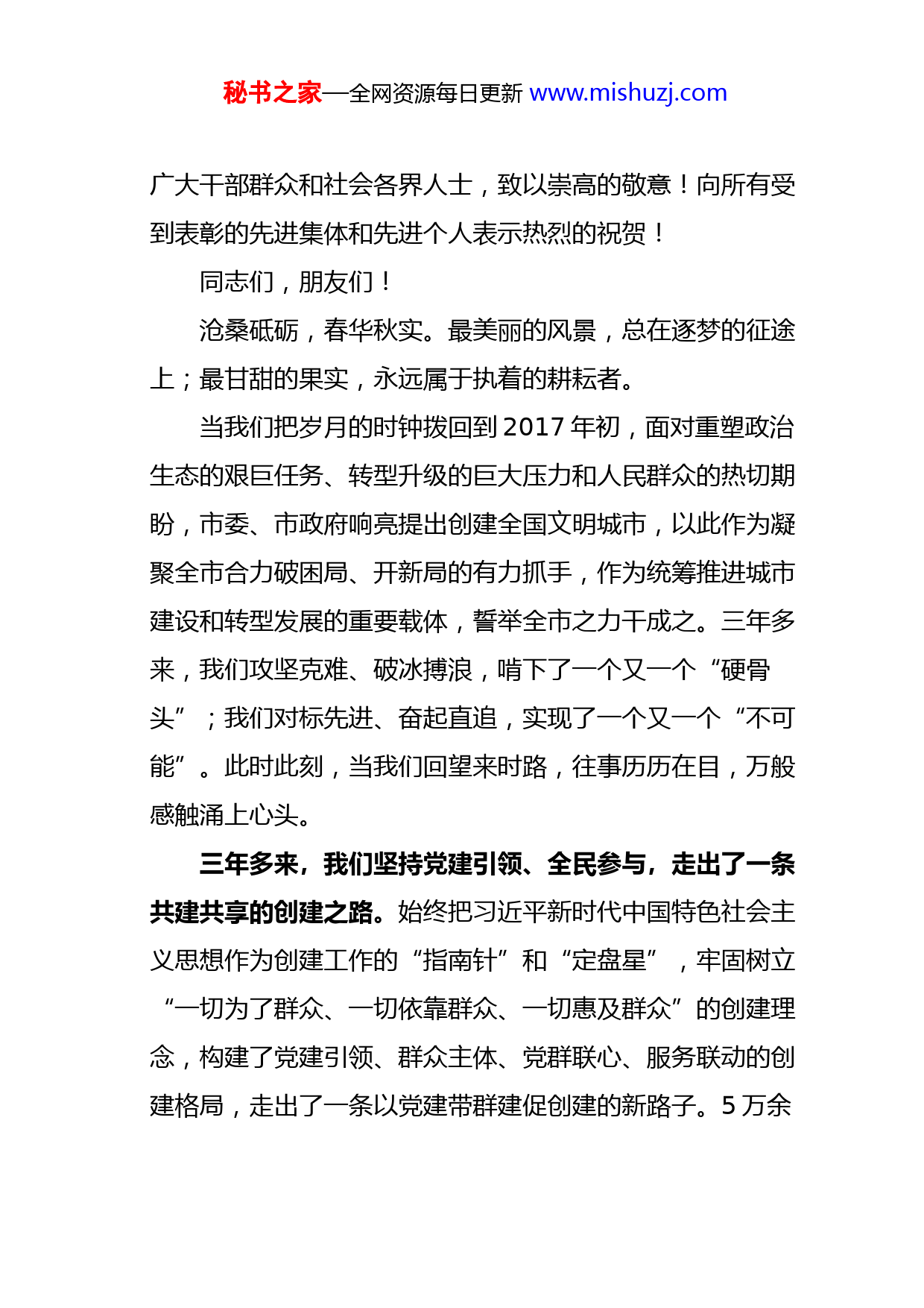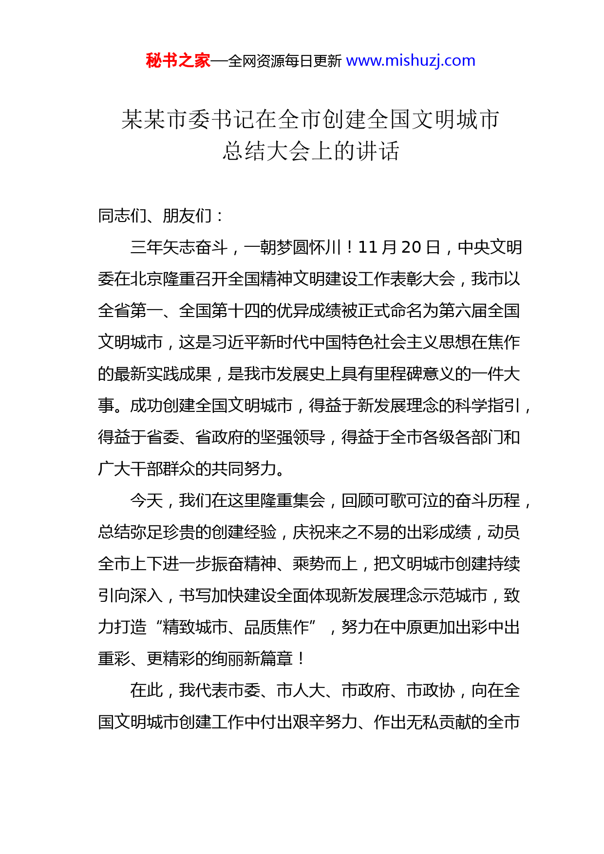 秘书之家—全网资源每日更新www.mishuzj.com某某市委书记在全市创建全国文明城市总结大会上的讲话同志们、朋友们:三年矢志奋斗,一朝梦圆怀川!11月20日,中央文明委在北京隆重召开全国精神文明建设工作表彰大会,我市以全省第一、全国第十四的优异成绩被正式命名为第六届全国文明城市,这是习近平新时代中国特色社会主义思想在焦作的最新实践成果,是我市发展史上具有里程碑意义的一件大事。成功创建全国文明城市,得益于新发展理念的科学指引,得益于省委、省政府的坚强领导,得益于全市各级各部门和广大干部群众的共同努力。今天,我们在这里隆重集会,回顾可歌可泣的奋斗历程,总结弥足珍贵的创建经验,庆祝来之不易的出彩成绩,动员全市上下进一步振奋精神、乘势而上,把文明城市创建持续引向深入,书写加快建设全面体现新发展理念示范城市,致力打造“精致城市、品质焦作”,努力在中原更加出彩中出重彩、更精彩的绚丽新篇章!在此,我代表市委、市人大、市政府、市政协,向在全国文明城市创建工作中付出艰辛努力、作出无私贡献的全市秘书之家—全网资源每日更新www.mishuzj.com广大干部群众和社会各界人士,致以崇高的敬意!向所有受到表彰的先进集体和先进个人表示热烈的祝贺!同志们,朋友们!沧桑砥砺,春华秋实。最美丽的风景,总在逐梦的征途上;最甘甜的果实,永远属于执着的耕耘者。当我们把岁月的时钟拨回到2017年初,面对重塑政治生态的艰巨任务、转型升级的巨大压力和人民群众的热切期盼,市委、市政府响亮提出创建全国文明城市,以此作为凝聚全市合力破困局、开新局的有力抓手,作为统筹推进城市建设和转型发展的重要载体,誓举全市之力干成之。三年多来,我们攻坚克难、破冰搏浪,啃下了一个又一个“硬骨头”;我们对标先进、奋起直追,实现了一个又一个“不可能”。此时此刻,当我们回望来时路,往事历历在目,万般感触涌上心头。三年多来,我们坚持党建引领、全民参与,走出了一条共建共享的创建之路。始终把习近平新时代中国特色社会主义思想作为创建工作的“指南针”和“定盘星”,牢固树立“一切为了群众、一切依靠群众、一切惠及群众”的创建理念,构建了党建引领、群众主体、党群联心、服务联动的创建格局,走出了一条以党建带群建促创建的新路子。5万余秘书之家—全网资源每日更新www.mishuzj.com名党员、近百万群众在党旗指引下,投身波澜壮阔的创建一线,而创建成果也最大程度地惠及了全体市民。创建以来,我们共改造提升城中村、棚户区54个,农贸市场18个,背街小巷161条,老旧小区859个,受益群众超90万人。我们相继建成苏蔺、府城两座水厂,98万群众喝上了甘甜的丹江水。我们让利于民,将近90%的南水北调绿化带征迁群众,就地安置在总干渠附近的城市黄金地段,让他们在改善居住环境的同时,又不远离故土。三年多来,我们聚焦提升颜值、涵养气质,走出了一条精致品质的创建之路。以打造“精致城市、品质焦作”为目标,把全生命周期管理理念贯穿城市规划、建设、管理全过程,统筹生产、生活、生态“三生共融”,让城市成为人民群众追求更加美好生活的有力依托、心灵寄托。创建以来,我们践行“绿水青山就是金山银山”理念,全力打造“公园城市”,北部山区生态复绿71.5平方公里,南水北调绿化带华丽蝶变,大沙河涅槃重生,苏蔺体育公园、沁泉湖公园以及60余个“口袋公园”星罗棋布、点缀全城,中心城区绿地和生态水面面积较2016年分别增加1.03万亩、0.64万亩,人均公园绿地面积达16.4平方米。我们新建改建主次干道96条,全面消除建成区内14个黑臭水体,城市品秘书之家—全网资源每日更新www.mishuzj.com质显著提升。我们深入开展大气污染防治攻坚,PM10、PM2.5连续四年实现“双下降”,城市环境大为改善。现在的焦作,山青、水秀、天蓝,不是江南,胜似江南。三年多来,我们着眼以德育人、以文化人,走出了一条春风化雨的创建之路。坚持以社会主义核心价值观引领文明城市创建,先育“文明人”,再建“文明城”,使城市充满道德滋润、向善力量和文明之风。创建以来,我们大力宣扬全国道德模范谢延信、维和英雄申亮亮、人民功臣程传信、最美导游韩滨、优秀共产党员李志勇,以及在抗击新冠肺炎疫情中涌现出的“最美医生”赵童、“二次出征”靳双周等先进事迹,把一个榜样树成一面旗帜,让一群好人温暖一座城市。我们倡树文明新风,礼让斑马线成为城市一景,全市39万“小红帽”“红马甲”志愿者如同一粒粒“文明种子”,播撒在城市的每一个角落,文明已经成为焦作最靓丽的城市底色。我们弘扬诚信文化,“白求恩式好医生”赵飞琴开出1毛9良心药方,被媒体称为“良心医生”,“守信光荣、失信可耻”的观念在焦作深入人心。三年多来,我们围绕转型升级、创新发展,走出了一条统筹协调的创建之路。按照习近平总书记“物质文明和精神文明要比翼齐飞”的要求,以新发展理念统筹经济社会发展秘书之家—全网资源每日更新www.mishuzj.com和文明城市创建。从2016年市十一次党代会提出实施“三大战略”、建设“四个焦作”,跻身全省“第一方阵”的奋斗目标;到2018年学成都佛山,拉开建设全面体现新发展理念示范城市的帷幕;再到2019年学徐州扬州,吹响致力打造“精致城市、品质焦作”的