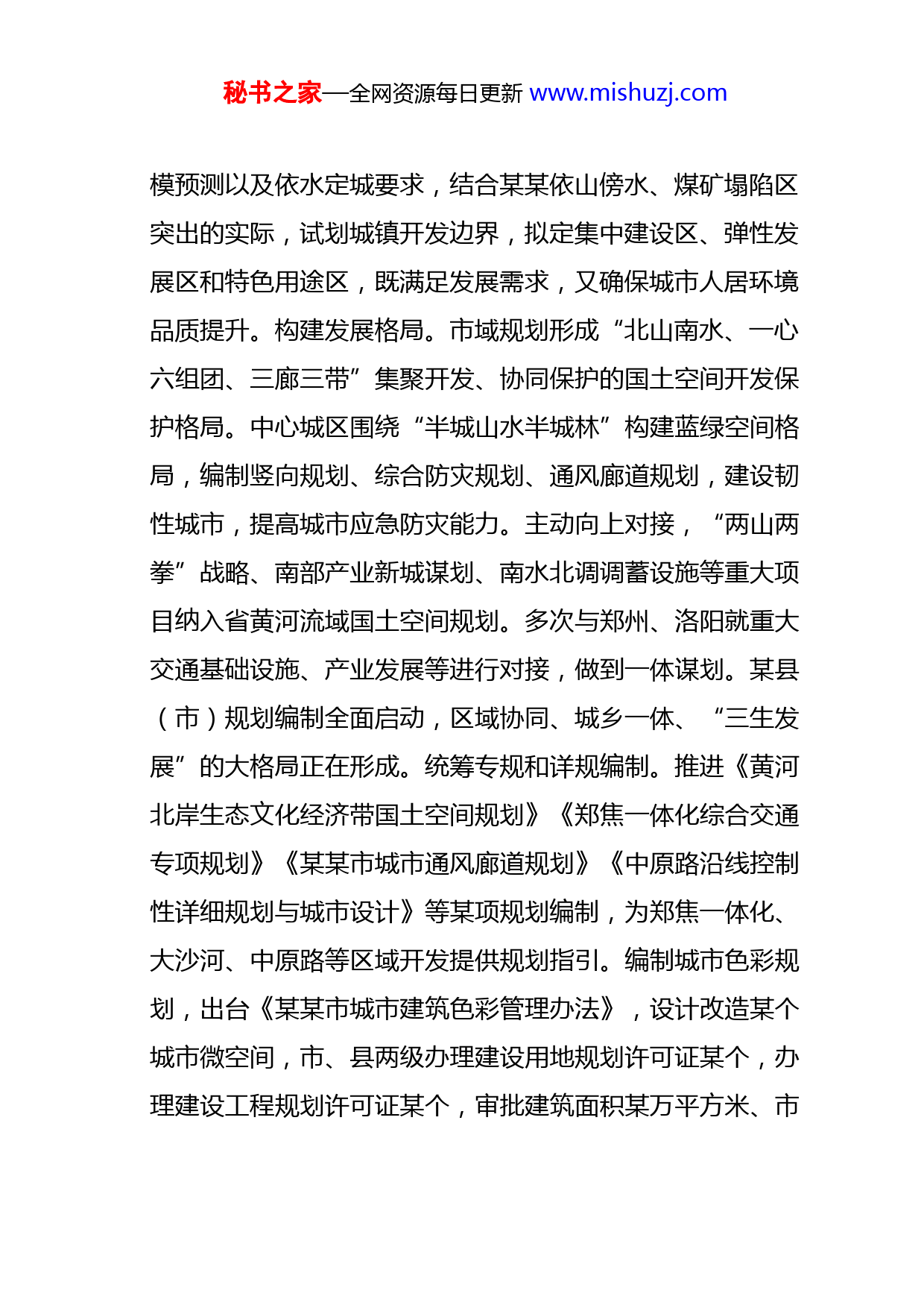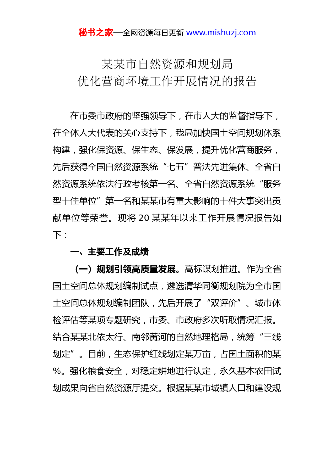 秘书之家—全网资源每日更新www.mishuzj.com某某市自然资源和规划局优化营商环境工作开展情况的报告在市委市政府的坚强领导下,在市人大的监督指导下,在全体人大代表的关心支持下,我局加快国土空间规划体系构建,强化保资源、保生态、保发展,提升优化营商服务,先后获得全国自然资源系统“七五”普法先进集体、全省自然资源系统依法行政考核第一名、全省自然资源系统“服务型十佳单位”第一名和某某市有重大影响的十件大事突出贡献单位等荣誉。现将20某某年以来工作开展情况报告如下:一、主要工作及成绩(一)规划引领高质量发展。高标谋划推进。作为全省国土空间总体规划编制试点,遴选清华同衡规划院为全市国土空间总体规划编制团队,先后开展了“双评价”、城市体检评估等某项专题研究,市委、市政府多次听取情况汇报。结合某某北依太行、南邻黄河的自然地理格局,统筹“三线划定”。目前,生态保护红线划定某万亩,占国土面积的某%。强化粮食安全,对稳定耕地进行认定,永久基本农田试划成果向省自然资源厅提交。根据某某市城镇人口和建设规秘书之家—全网资源每日更新www.mishuzj.com模预测以及依水定城要求,结合某某依山傍水、煤矿塌陷区突出的实际,试划城镇开发边界,拟定集中建设区、弹性发展区和特色用途区,既满足发展需求,又确保城市人居环境品质提升。构建发展格局。市域规划形成“北山南水、一心六组团、三廊三带”集聚开发、协同保护的国土空间开发保护格局。中心城区围绕“半城山水半城林”构建蓝绿空间格局,编制竖向规划、综合防灾规划、通风廊道规划,建设韧性城市,提高城市应急防灾能力。主动向上对接,“两山两拳”战略、南部产业新城谋划、南水北调调蓄设施等重大项目纳入省黄河流域国土空间规划。多次与郑州、洛阳就重大交通基础设施、产业发展等进行对接,做到一体谋划。某县(市)规划编制全面启动,区域协同、城乡一体、“三生发展”的大格局正在形成。统筹专规和详规编制。推进《黄河北岸生态文化经济带国土空间规划》《郑焦一体化综合交通专项规划》《某某市城市通风廊道规划》《中原路沿线控制性详细规划与城市设计》等某项规划编制,为郑焦一体化、大沙河、中原路等区域开发提供规划指引。编制城市色彩规划,出台《某某市城市建筑色彩管理办法》,设计改造某个城市微空间,市、县两级办理建设用地规划许可证某个,办理建设工程规划许可证某个,审批建筑面积某万平方米、市秘书之家—全网资源每日更新www.mishuzj.com政管线道路某公里,推动城市规划提标、改造提质、管理提优、品质提升。(二)强化资源要素保障。做优机制政策保障。按照市委、市政府安排部署,组建了综合协调、土地报批、土地供应、不动产登记等某个专班,建立了研判交办、专班承办、调度通报等某项制度,畅通企业反映问题及解决问题渠道。迅速出台关于“万人助万企”和支持灾后重建的“双八条”政策,按照不低于某%的比例划定工业用地保护红线,保障每个县(市)某亩“先建后拆”周转指标用于各类园区和产业集聚区建设。实地走访企业,针对某个企业历史遗留问题,积极研究解决路径,建立台账,明确责任人和解决时限等,市长李亦博在工作简报上批示给予充分肯定。同时,完善地质灾害预报预警机制,发挥一线群测群防员作用,组织某名干部职工参加地灾防治工作,某月份以来,中央电视台、学习强国、自然资源报分别进行报道。做实土地高效利用。以“零增地”建设竖起来的产业园,探索“高位推动、府院联动、载体驱动、龙头带动”的“百园增效”新路子,盘活存量土地某余亩,助推产业集聚区提质增效,某月某日省政府“百园增效”行动推进会在我市召开。做强用地服务保障。把国土空间规划审批前某个重大产业项目、民生项目秘书之家—全网资源每日更新www.mishuzj.com和重要基础设施建设全部纳入规划进行保障。用足用活用好增减挂钩、增存挂钩等政策,获批土地某万亩,供应土地某万亩,有力支持了小浪底北岸灌区、西霞院水利枢纽工程、南太行高速某某段、东海大道等某余个省市重点项目建设。(三)“三位一体”助力乡村振兴。落实市第十三届人民代表大会第四次会议精神,深入开展实用性村庄规划、全域土地综合整治、农村集体建设用地入市“三位一体”工作。构筑“乡镇政府、设计团队、驻村规划设计师及村民共同参与”的协同平台,联合市委组织部在全市评选美丽乡村规划师某名,完成村庄规划编制某个,引领乡村产业兴、生态美。率先在全省完成集体土地基准地价全覆盖,全省首例集体经营性建设用地点状供地在修武县挂牌成交,全市出让集体经营性建设用地某宗,土地出让金某亿元。加快武陟县嘉应观乡某个村、某某市某某镇某个村两个国家全域土地综合整治试点建设,推动形成农田集中连片、建设用地集中集聚、空间形态高效节约的用地格局,为乡村振兴提供新的路径。(四)优化提升营商环境质量。坚持便利服务。继续深化不动产登记改革和创新,深入实施“互联网+”,全面启用“电子证照”服务,生成不动产登记、规划许可证等8类秘书之家—全网资源每日更新www.mishuzj.com电子证照某余万个,与市中级人民法院建立“点对点”不动产网络查控系统,让政务服