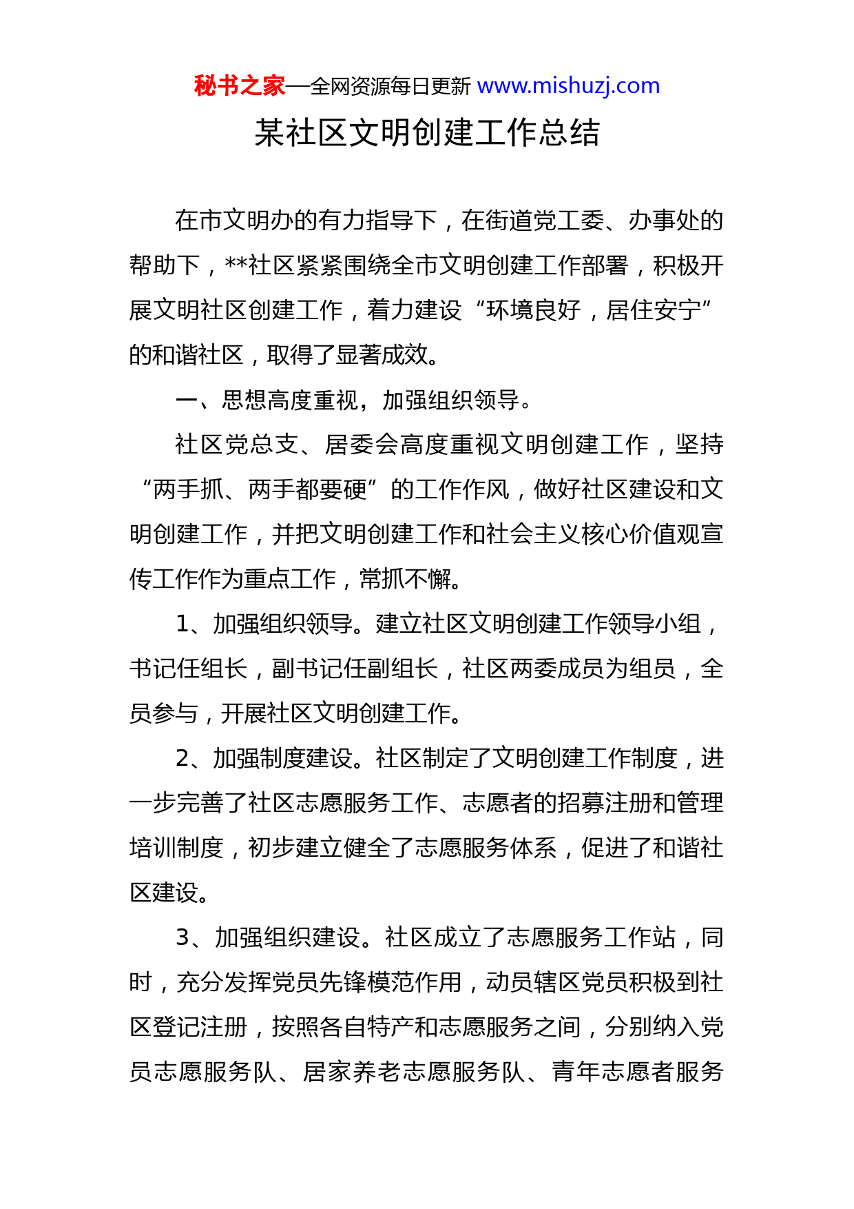 秘书之家—全网资源每日更新www.mishuzj.com某社区文明创建工作总结在市文明办的有力指导下,在街道党工委、办事处的帮助下,社区紧紧围绕全市文明创建工作部署,积极开展文明社区创建工作,着力建设“环境良好,居住安宁”的和谐社区,取得了显著成效。一、思想高度重视,加强组织领导。社区党总支、居委会高度重视文明创建工作,坚持“两手抓、两手都要硬”的工作作风,做好社区建设和文明创建工作,并把文明创建工作和社会主义核心价值观宣传工作作为重点工作,常抓不懈。1、加强组织领导。建立社区文明创建工作领导小组,书记任组长,副书记任副组长,社区两委成员为组员,全员参与,开展社区文明创建工作。2、加强制度建设。社区制定了文明创建工作制度,进一步完善了社区志愿服务工作、志愿者的招募注册和管理培训制度,初步建立健全了志愿服务体系,促进了和谐社区建设。3、加强组织建设。社区成立了志愿服务工作站,同时,充分发挥党员先锋模范作用,动员辖区党员积极到社区登记注册,按照各自特产和志愿服务之间,分别纳入党员志愿服务队、居家养老志愿服务队、青年志愿者服务秘书之家—全网资源每日更新www.mishuzj.com队、卫生健康志愿服务队等。二、落实经费投入,保障工作顺利开展。社区加强经费保障,一是积极争取市、街道工作经费;二是社区自筹工作经费,近三年来共落实工作经费11万元,有力保障了文明创建工作顺利有序开展。三、加强综合治理,创造良好生活环境。1、改善社区卫生。社区不断完善卫生制度,严格落实责任,坚持用制度管理人、用制度约束人。制定完善了《卫生管理制度》,社区工作人员还深入到各居民小区,协助物业和包保单位对小区内环境进行集中整治,3年来,共清理小广告约1000余个、清理各类垃圾近200余吨。通过一系列的整治,社区环境卫生得到了明显改善,居民们对社区的这一工作给予了认可,并提高了自觉维护环境卫生的意识。2、做好综治工作。加强对流动人口的管理,社区定期或不定期对辖区常住人口、流动人口进行调查、登记。社区人口9345人,流入人口357人,流出人口104人,社区工作人员经常利用上下班时间进行普法宣传教育,发放各类宣传资料3000余份。社区成立志愿者服务队,不定期开展群防群治巡逻,确保居民住得安心,住得放心。深入开展禁毒和反邪教警示教育,强化居民防范意识,一是深入片区发放禁毒宣传资料;二是联系辖区派出所,共同对秘书之家—全网资源每日更新www.mishuzj.com辖区开展巡查。积极排查和化解居民矛盾,按照“预防为主,教育疏导,防止各类矛盾激化”的原则,把各类矛盾化解在萌芽状态,维护社区稳定,近3年来,社区共成功调解纠纷72起。3、落实网格责任。社区实行网格化管理,网格责任人负责所在片区工作具体落实,通过包片人员巡查发现,社区路面破损严重、地下排水管网老化,通过协商议事等方式近3年来共为居民疏通下水道20余次,对4条背街小巷路面进行修整,积极解决居民反应热点难点问题。四、广泛宣传教育,树立文明新风。1、大力开展社会主义核心价值观教育。持续开展践行社会主义核心价值观实践活动,利用户外广告牌、电子显示屏等工具,广泛开展核心价值观公益广告宣传,让核心价值观随处可见。社区道德讲堂经常邀请志愿者讲述自身故事,为辖区居民言传身教,传播正能量,积极上报身边好人先进典型。2、大力开展居民素质教育。在职党员、社区工作人员利用上下班时间深入小区和居民家中发放烟花爆竹限放、不乱倒垃圾等各类宣传单4000余份。利用公开栏、便民张贴栏宣传计生、科普等宣传知识,每季度定期宣传健康教育知识、食品安全知识。并通过设立咨询台、发放宣传资料等形式,倡导绿色生活、保护环境、共建美好家园。秘书之家—全网资源每日更新www.mishuzj.com3、大力开展遵德守礼宣传。利用社区公开栏、户外广告牌积极开展遵德守礼宣传,在背街小巷和主要路口制作遵德守礼宣传牌70余块,营造浓厚宣传氛围。五、开展志愿服务,弘扬奉献精神。1、开展环境整治活动。社区工作人员组织辖区保洁人员对背街小巷开展集中整治,清理小广告、杂草、卫生死角和乱堆乱放等,帮助居民美化生活环境。近3年来共清理小广告1000余个,杂草3000多平米,卫生死角200余处,乱堆乱放150余处。2、开展文明劝导活动。组织社区工作人员在大道与路路口开展文明交通劝导活动,引导市民自觉遵守交通规则。六、组织文化活动,丰富居民精神生活。1、丰富文体活动。社区成功配合街道举办扫黑除恶专项斗争文艺汇演、庆祝新中国成立70周年文艺汇演等活动。广场舞健身队、太极健身队等社区健身组织蓬勃发展,尤其促进了健身运动的深入开展,有助于提高居民的身体素质。2、打造特色项目。设立家庭生活指导室、阅览室、党员活动室等,并配备了健身器材、电视、各类书籍等,安排专职人员进行管理,努力满足群众多样化、个性化文化娱乐活动需求。把情趣相同、爱好相近的人员组织起来开秘书之家—全网资源每日更新www.mishuzj.com展相关活动。已开展了亲子趣味阅读、庆“六一”、“七一”活动等,满足了居民文化娱乐需求,受到居民认可。在两委成员的共同努力下,社区文明创建工作实实在在做了大量的工作,也取得了一定的成绩,得到了社区居民的