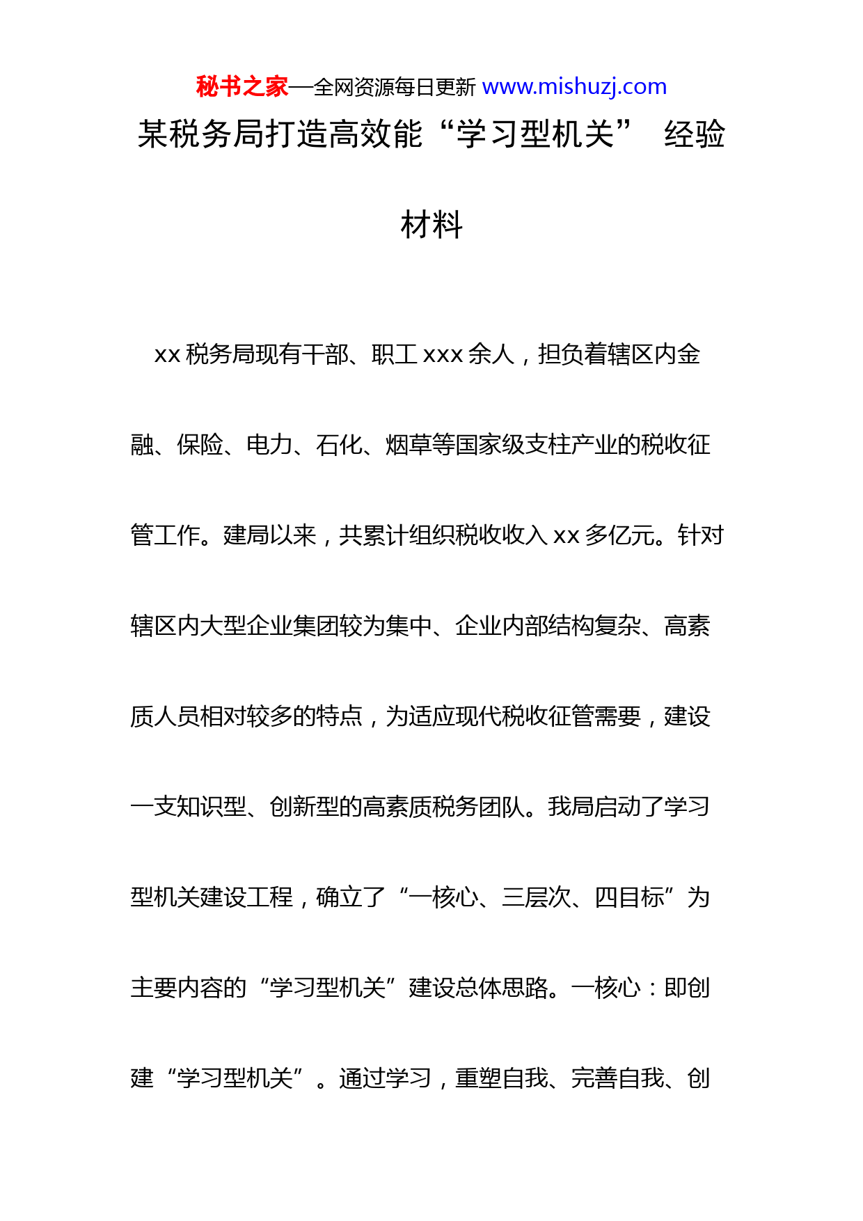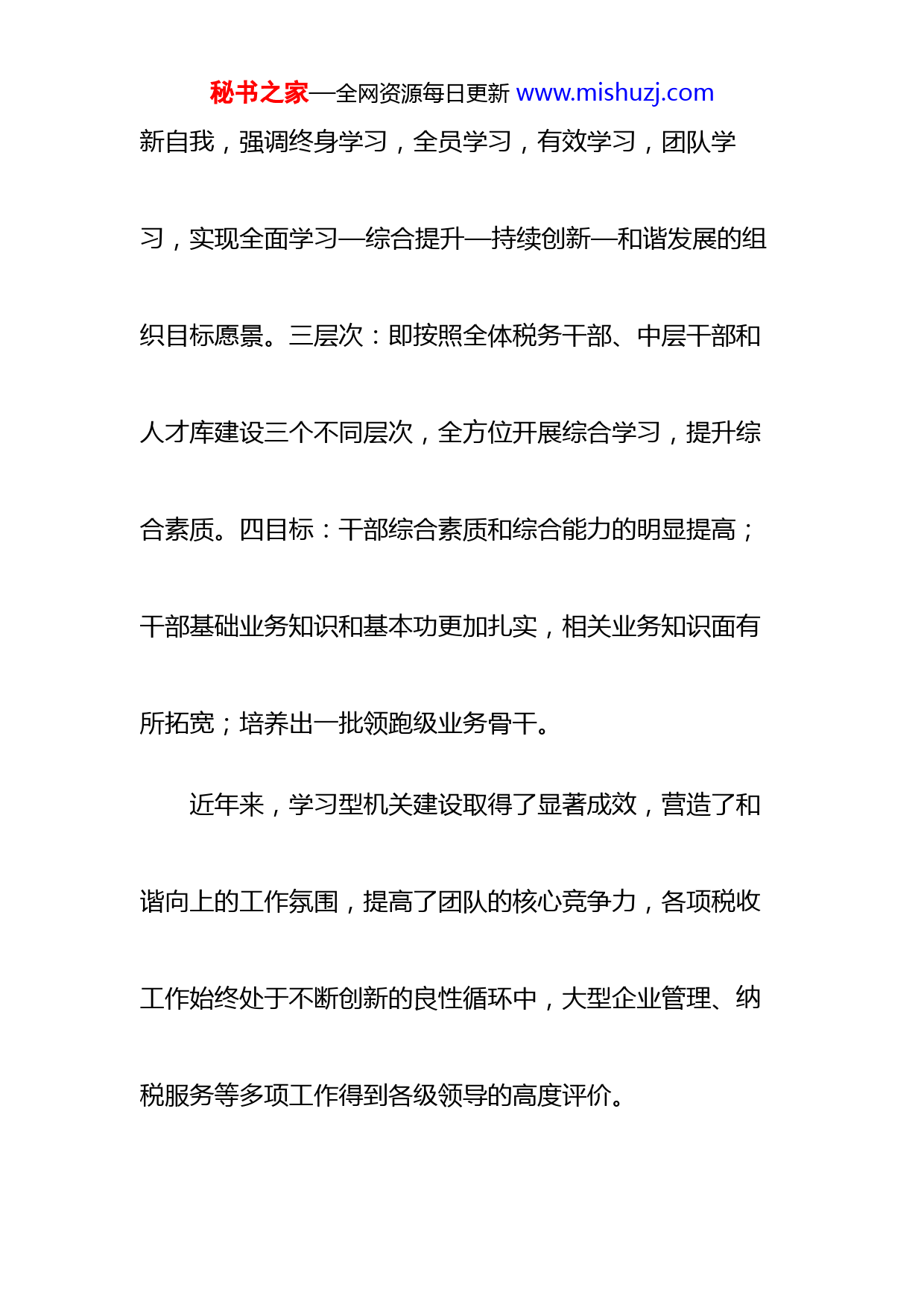 秘书之家—全网资源每日更新www.mishuzj.com某税务局打造高效能“学习型机关”经验材料xx税务局现有干部、职工xxx余人,担负着辖区内金融、保险、电力、石化、烟草等国家级支柱产业的税收征管工作。建局以来,共累计组织税收收入xx多亿元。针对辖区内大型企业集团较为集中、企业内部结构复杂、高素质人员相对较多的特点,为适应现代税收征管需要,建设一支知识型、创新型的高素质税务团队。我局启动了学习型机关建设工程,确立了“一核心、三层次、四目标”为主要内容的“学习型机关”建设总体思路。一核心:即创建“学习型机关”。通过学习,重塑自我、完善自我、创秘书之家—全网资源每日更新www.mishuzj.com新自我,强调终身学习,全员学习,有效学习,团队学习,实现全面学习—综合提升—持续创新—和谐发展的组织目标愿景。三层次:即按照全体税务干部、中层干部和人才库建设三个不同层次,全方位开展综合学习,提升综合素质。四目标:干部综合素质和综合能力的明显提高;干部基础业务知识和基本功更加扎实,相关业务知识面有所拓宽;培养出一批领跑级业务骨干。近年来,学习型机关建设取得了显著成效,营造了和谐向上的工作氛围,提高了团队的核心竞争力,各项税收工作始终处于不断创新的良性循环中,大型企业管理、纳税服务等多项工作得到各级领导的高度评价。秘书之家—全网资源每日更新www.mishuzj.com一、全面学习,着眼未来发展(一)确立目标,培养学习习惯。xx税务局现有干部职工xx余人,从年龄结构看,全局干部职工平均年龄xx岁,其中:30岁以下人员占总人数xx%;31岁至40岁人员占总人数的xx%;41岁至50岁人员占总人数的xx%;50岁以上人员占总人数的xx%。从文化程度来看,全局研究生学历的干部占总人数的xx%;大学本科学历干部占总人数的xx%;大学专科学历占总人数的xx%。干部年龄结构和知识结构趋于老化的现实,与我们承担的全市税务系统的税收任务量以及新形势下税收工作的秘书之家—全网资源每日更新www.mishuzj.com要求形成了强烈的反差。特别是面对日益繁重的基层税收管理工作,如何使干部从埋于工作任务的泥潭中解脱出来,局党委提出了依靠提高干部素质来减负是最有效的途径。力求通过学习型机关建设工程,学会辩证的分析问题、解决问题的思维方法和工作方法,培养创新思维,促进工作能力、工作效率和工作质量的提高。召开学习型机关建设工程启动大会,在全局开展学习型机关建设主题征文活动、加大对“学习型机关”建设的宣传力度等多种形式,组织中层科所长、党员、干部、青年开展多层面、启发式的思想动员,统一思想。让每一个干部认识到,学习是为了超越自我,是为了投资未来,培养自身的创新能秘书之家—全网资源每日更新www.mishuzj.com力,为自己赢得更加阳光的发展空间。柔通过多种体验式、互动式的动员、交流、研讨,使“终身学习、全员学习、有效学习、团队学习”的理念逐步深入人心,在全局构建“全面学习、综合提升、持续创新、和谐发展”的共同愿景,全局干部中产生强烈共鸣,为队伍的发展带来了生机和活力。(二)完善自我,促进全面发展。在学习型机关建设中,局党委立足局的长远发展和干部自身能力的全面提升,以税收实际工作需求为导向,以素质培养和能力建设为主线,开展多层次、多学科的综合学习,鼓励和帮助干部对个人职业生涯进行全面规划。两秘书之家—全网资源每日更新www.mishuzj.com年来,组织政治理论、宏观经济、财会知识、心理健康、沟通技巧等各类培训xx次,参加人数累计xxx人次,累计xxx学时,使干部在学习中“学会求知、学会做事、学会共处、学会做人”,促进了干部综合素质的提升。我们始终坚持把学习政治理论与提升综合素质、基础知识与岗位技能、宏观知识与微观知识、现代经济知识与实际税收业务有机结合。理论素养重在熏陶。我局党委和各个部门,把理论学习作为统一思想认识、提高理论素质、培养管理能力、加强班子建设的有效途径,做到率先学习、规范学习、注重实效。坚持理论联系实际、学用一致,坚持学而信、学而思、学而行使大家深刻理解习近平秘书之家—全网资源每日更新www.mishuzj.com新时代中国特色社会主义思想的精神实质和丰富内涵。专业基础狠抓技能。在全局范围内开展岗位练兵,将全局干部依“三员”岗位分类,实施“每日一题、每周一测和每月一考”,截至目前,共组织了每日一题测试xxx余次、每周一测xx余次、每月一考xx余次,有效提升了干部的税收业务基本功和岗位技能标准。按照“干什么学什么、缺什么补什么”的原则,我们根据不同岗位工作的需要,以提高干部税收业务水平为重点,进行多层面、多领域的学习,邀请法律顾问、专家学者讲解“税务稽查中的相关法律问题”、“新的组合式税费优惠政策解析”等税收业务知识拓展讲座。组织干部参加xx个全局专项税收业务的秘书之家—全网资源每日更新www.mishuzj.com辅导、考核。现代知识开阔视野。我们通过组织多种高层次培训、交流,知识更新,组织xx名干部,到xx集团进行参观、学习,让干部感受现代化信息技术的高速发展。组织干部参与健康心态、公务礼仪等10余门热门学科的学习与交流,进一步更新知识、拓展视野、提高能力。(三)超越自我,激发创造活力。自我超越的意义在