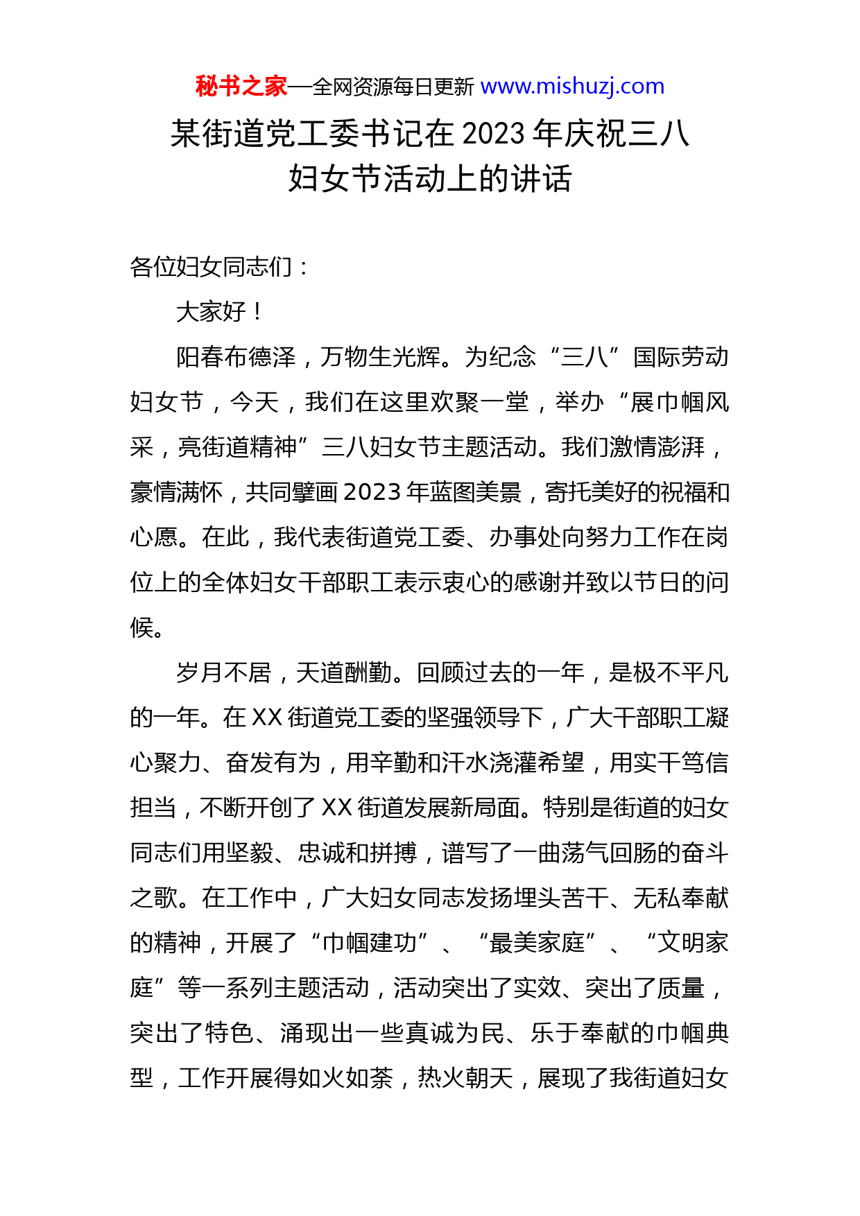 秘书之家—全网资源每日更新www.mishuzj.com某街道党工委书记在2023年庆祝三八妇女节活动上的讲话各位妇女同志们:大家好!阳春布德泽,万物生光辉。为纪念“三八”国际劳动妇女节,今天,我们在这里欢聚一堂,举办“展巾帼风采,亮街道精神”三八妇女节主题活动。我们激情澎湃,豪情满怀,共同擘画2023年蓝图美景,寄托美好的祝福和心愿。在此,我代表街道党工委、办事处向努力工作在岗位上的全体妇女干部职工表示衷心的感谢并致以节日的问候。岁月不居,天道酬勤。回顾过去的一年,是极不平凡的一年。在XX街道党工委的坚强领导下,广大干部职工凝心聚力、奋发有为,用辛勤和汗水浇灌希望,用实干笃信担当,不断开创了XX街道发展新局面。特别是街道的妇女同志们用坚毅、忠诚和拼搏,谱写了一曲荡气回肠的奋斗之歌。在工作中,广大妇女同志发扬埋头苦干、无私奉献的精神,开展了“巾帼建功”、“最美家庭”、“文明家庭”等一系列主题活动,活动突出了实效、突出了质量,突出了特色、涌现出一些真诚为民、乐于奉献的巾帼典型,工作开展得如火如荼,热火朝天,展现了我街道妇女秘书之家—全网资源每日更新www.mishuzj.com干部真抓实干、攻坚克难的精神风貌,为广大干部树立了标杆,获得了群众良好的口碑,值得大家标榜和赞誉。特别是在疫情防控工作中,街道社区的妇女干部,舍小家为大家,风里来雨里去,如一朵朵铿锵的玫瑰,把真情和爱心播撒到辖区的每一个角落。他们面对困难和压力没有退缩,而是冲锋在前,主动作为,强化担当,不怕苦、不怕累,凝聚了勇于亮剑,敢打硬仗的决心和信心,发扬了逢山开路、遇河架桥的勇气和魄力,彰显了广大妇女干部攻坚克难、乘势而上的精神和动力。风正潮平,自当扬帆破浪;任重道远,更需策马扬鞭。今年,我们任务艰巨、责任重大、意义深远。我们要以习近平新时代中国特色社会主义思想为指导,在学习党的二十大精神、加强党史教育的基础上,紧扣服务型街道的实际,传承兔的秉赋和精神,发挥自己的聪明才智,以“兔”飞猛进的气势,履职担当,真抓实干,创造出金榜题名的业绩来。要发扬踏石留印、抓铁有痕的精神,真正地沉下身子、埋头苦干、履职担当、全心全意地为辖区居民服务,奋发进取、开拓创新,切实把为民服务的直通车开到群众的心坎里。同时,广大妇女同志要以王者归来、势如破竹的的霸气,攻坚克难、砥砺奋进的勇气,锐意进取,突破创新的锐气,积极应对各种风险和挑战,不负韶华,不辱使命,激发“赶考”的作为,增强赶考的本领,秘书之家—全网资源每日更新www.mishuzj.com战胜一切困难,解决群众关心的热点、难点和焦点问题,为XX街道又快又好发展奠定坚实的基础。律回春晖渐,万象始更新。从极不平凡的2023年跨入豪情满怀的未来,我们信心百倍,笃定前行,大展宏图。最后,值此三八妇女节到来之际,让我们共同祝愿XX街道事业蒸蒸日上,祝广大妇女同志兔年大吉,工作顺利、身体健康、阖家幸福、万事如意。
