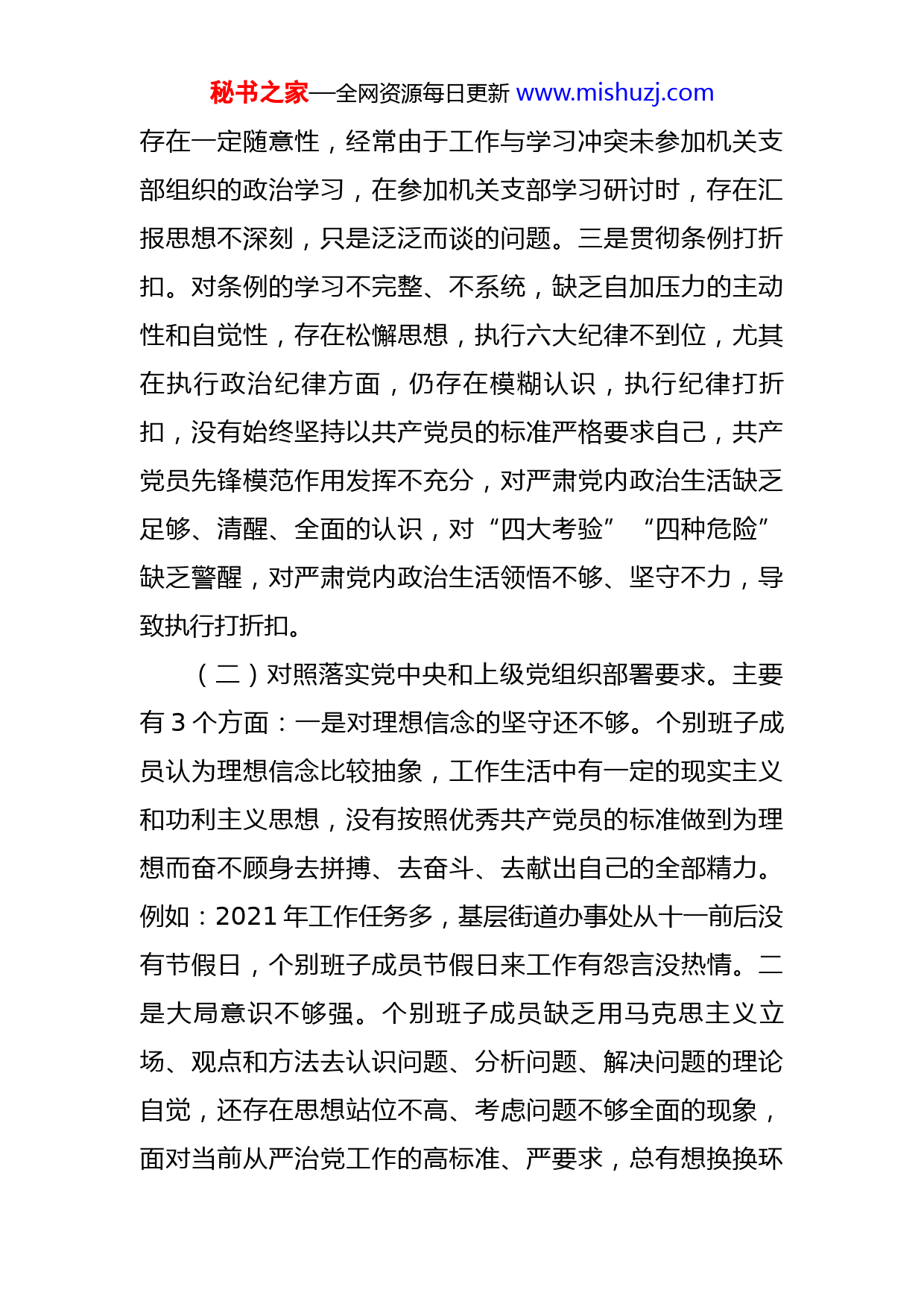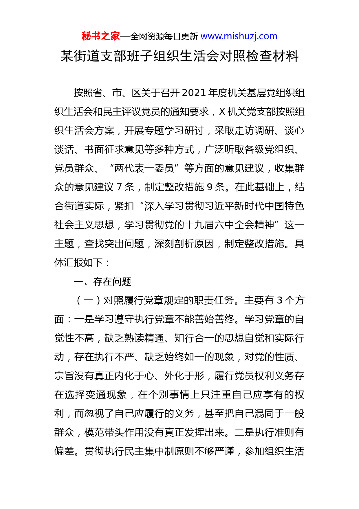 秘书之家—全网资源每日更新www.mishuzj.com某街道支部班子组织生活会对照检查材料按照省、市、区关于召开2021年度机关基层党组织组织生活会和民主评议党员的通知要求,X机关党支部按照组织生活会方案,开展专题学习研讨,采取走访调研、谈心谈话、书面征求意见等多种方式,广泛听取各级党组织、党员群众、“两代表一委员”等方面的意见建议,收集群众的意见建议7条,制定整改措施9条。在此基础上,结合街道实际,紧扣“深入学习贯彻习近平新时代中国特色社会主义思想,学习贯彻党的十九届六中全会精神”这一主题,查找突出问题,深刻剖析原因,制定整改措施。具体汇报如下:一、存在问题(一)对照履行党章规定的职责任务。主要有3个方面:一是学习遵守执行党章不能善始善终。学习党章的自觉性不高,缺乏熟读精通、知行合一的思想自觉和实际行动,存在执行不严、缺乏始终如一的现象,对党的性质、宗旨没有真正内化于心、外化于形,履行党员权利义务存在选择变通现象,在个别事情上只注重自己应享有的权利,而忽视了自己应履行的义务,甚至把自己混同于一般群众,模范带头作用没有真正发挥出来。二是执行准则有偏差。贯彻执行民主集中制原则不够严谨,参加组织生活秘书之家—全网资源每日更新www.mishuzj.com存在一定随意性,经常由于工作与学习冲突未参加机关支部组织的政治学习,在参加机关支部学习研讨时,存在汇报思想不深刻,只是泛泛而谈的问题。三是贯彻条例打折扣。对条例的学习不完整、不系统,缺乏自加压力的主动性和自觉性,存在松懈思想,执行六大纪律不到位,尤其在执行政治纪律方面,仍存在模糊认识,执行纪律打折扣,没有始终坚持以共产党员的标准严格要求自己,共产党员先锋模范作用发挥不充分,对严肃党内政治生活缺乏足够、清醒、全面的认识,对“四大考验”“四种危险”缺乏警醒,对严肃党内政治生活领悟不够、坚守不力,导致执行打折扣。(二)对照落实党中央和上级党组织部署要求。主要有3个方面:一是对理想信念的坚守还不够。个别班子成员认为理想信念比较抽象,工作生活中有一定的现实主义和功利主义思想,没有按照优秀共产党员的标准做到为理想而奋不顾身去拼搏、去奋斗、去献出自己的全部精力。例如:2021年工作任务多,基层街道办事处从十一前后没有节假日,个别班子成员节假日来工作有怨言没热情。二是大局意识不够强。个别班子成员缺乏用马克思主义立场、观点和方法去认识问题、分析问题、解决问题的理论自觉,还存在思想站位不高、考虑问题不够全面的现象,面对当前从严治党工作的高标准、严要求,总有想换换环秘书之家—全网资源每日更新www.mishuzj.com境、歇歇气的心理,没有站在为人民服务的理想信念上思考工作。部分班子成员表示基层工作太难干,工作到了一定年限想找个清闲点的单位待着。三是学习实践性不够强。个别班子成员在一定程度上忽视了对习近平新时代中国特色社会主义思想的系统研究和深刻理解,忽视了理论联系实际、理论指导实践的重要原则和根本作用,存在着为了理论学习而学习,用理论学习装门面,实际上所学的理论与实际主要工作相脱节,起不到理论指导实践的应有效果。认为基层工作繁忙上级要求的学学就行了,有时候借口开会或者有重要工作,集体学习能不参加就不参加。(三)对照完成党史学习教育专项整治、巡视巡察以及上年度组织生活会等问题整改情况。一是对照专项整治“景观亮化工程”过度化等“政绩工程”、“面子工程”问题。在落实“隔墙透绿”工作中存在蜻蜓点水、花拳绣腿的现象。总希望能花少钱办大事儿,只注重规模效应,没有考虑种植绿植的存活率。在“沿街门店整治”工作中存在落实不务实的问题,只注重吸引领导的眼球,区委区政府周边门店强制整治,其他有的沿街门店该整治的没有整治到位。在小区环境整治等亮化工程中,没有做到提前征求群众意见,没有考虑是否背离人民群众意愿。二是巡察整改情况。根据X统一部署,X月X日至X月X日,区委第X巡察组对X街道进行了巡察问题整改“回头看”。X秘书之家—全网资源每日更新www.mishuzj.com月X日,区委第X巡察组向街道领导班子反馈了巡察意见。在充分肯定街道党工委工作的同时,实事求是地指出了街道党工委在党的全面领导、党的思想建设、党的基层建设、党的纪律建设以及党风廉政建设和反腐败工作等方面问题,提出了X条有针对性的整改意见和建议,移交信访件X件、问题线索X起。X月份以来,×党工委建立了《×反馈问题的整改台账》对X项问题逐项明确了整改措施、责任人、责任单位、整改时限和推进情况,结合实际抓好整改工作。在整改工作中,×党工委先后X次到基层党组织进行督查工作,重点就存在问题整改情况进行检查,看整改变化情况、措施落实情况,对整改效果不明显,或者问题依然存在的社区和企业,要求X月底前务必整改完毕。截止X月X日,×各基层党组织的党建问题已经全部整改完毕。三是上年度组织生活会共查摆出X条问题,均已整改完毕。(四)对照人民群众的新期待,全面查找在发挥政治功能和组织力等方面的问题和不足。主要有3个方面:一是为民服务的意识还需增强。随着阅历增长、环境变化,个别班子成员不自觉地在思想深处对“为了谁、依靠谁、我是