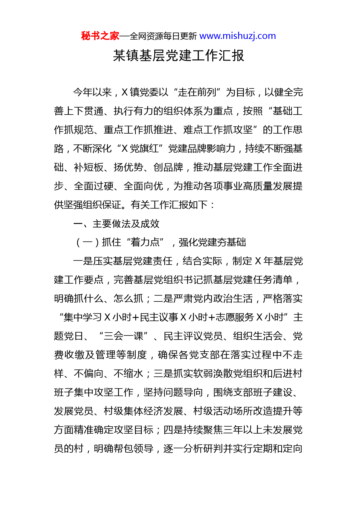 秘书之家—全网资源每日更新www.mishuzj.com某镇基层党建工作汇报今年以来,X镇党委以“走在前列”为目标,以健全完善上下贯通、执行有力的组织体系为重点,按照“基础工作抓规范、重点工作抓推进、难点工作抓攻坚”的工作思路,不断深化“X党旗红”党建品牌影响力,持续不断强基础、补短板、扬优势、创品牌,推动基层党建工作全面进步、全面过硬、全面向优,为推动各项事业高质量发展提供坚强组织保证。有关工作汇报如下:一、主要做法及成效(一)抓住“着力点”,强化党建夯基础一是压实基层党建责任,结合实际,制定X年基层党建工作要点,完善基层党组织书记抓基层党建任务清单,明确抓什么、怎么抓;二是严肃党内政治生活,严格落实“集中学习X小时+民主议事X小时+志愿服务X小时”主题党日、“三会一课”、民主评议党员、组织生活会、党费收缴及管理等制度,确保各党支部在落实过程中不走样、不偏向、不缩水;三是抓实软弱涣散党组织和后进村班子集中攻坚工作,坚持问题导向,围绕支部班子建设、发展党员、村级集体经济发展、村级活动场所改造提升等方面精准确定攻坚目标;四是持续聚焦三年以上未发展党员的村,明确帮包领导,逐一分析研判并实行定期和定向秘书之家—全网资源每日更新www.mishuzj.com约谈机制。(二)找准“结合点”,创建品牌增亮点为了唤醒党员初心、明确党员使命、激发党员活力,破解农村党员管理难题,经过深入调查研究,自X年X月创新实施加强党员队伍日常管理办法,分类开展党员“先锋引领”行动。对于在家党员,将党员志愿服务与设岗定责紧密结合,划分为义务环卫岗、义务调解岗和义务巡查岗三个志愿服务岗位,让党员参与到村庄治理的方方面面。X年以来,累计清理村内主要街道X余次,调解邻里矛盾X余起,党员先锋模范作用不断强化。对于外出党员,积极倡导自愿捐赠“党员关爱微基金”,用于村级公益事业和慰问困难党员,为村庄的发展出一份力。截至目前,累计收到“党员关爱微基金”X万余元,已使用X万余元。同时,结合党员积分管理和负面行为劝诫制度,严格执行一月度一登记、一季度一亮分、一年度一总评程序,对党员日常行为表现进行量化打分;对党员在日常工作和生活中出现的不合格行为进行处理,综合运用警示提醒、责令纠错、教育转化等措施纠正错误。截至目前,全镇共警示提醒X名党员,责令纠错X名党员,教育转化X名党员,不断擦亮“X党旗红”党建品牌。(三)紧扣“立足点”,强化服务惠民生坚持支部领办、党员带头、群众自愿、常态长效的原秘书之家—全网资源每日更新www.mishuzj.com则,秉承基本服务更用心、延伸服务更暖心、特色服务更贴心的理念,创建“石莲花开”志愿服务品牌,成立X支农村志愿服务队伍。各村党支部紧盯老党员、贫困户和高龄“三无”(无劳动能力、无子女、无人照料)老人等,每两周到服务对象家开展室内保洁、清扫庭院、清运垃圾、擦拭家具等服务活动。在服务过程中收集了解老党员、困难群众的微心愿,并力所能及地完成心愿,坚持在扶弱助贫上用情、在丰富活动中用心、在调解纾困中用力,真正实现了队员真参与、服务常开展、群众真受益。此外,X镇不断探索激励嘉许制度,设立李家埠、大白崖两处志愿服务“爱心超市”,并对所有镇域内志愿服务者实行积分管理,建立积分兑换奖励制度。镇、村志愿服务队员可凭积分,每季度到爱心超市兑换相应物品,取得了良好成效,大大提高了党员参与志愿服务的积极性。(四)围绕“落脚点”,兴村富民强民心一是打造“三资”清理的“X模式”,严格按照“宣传发动、公示纠错、全面清理、检查验收”四个阶段,分批次推进农村“三资”清理,在全县范围内率先完成“三资”清理工作任务,清收各类欠款X万元,盘活了农村资产资源资金等各类生产要素。二是开展农村财务规范管理工作。以镇农村经管部门为依托,借助农村会计委托代理服务平台,坚持村集体各项收入属于村集体经济组织全体秘书之家—全网资源每日更新www.mishuzj.com成员所有的原则,应收尽收,统一管理。建设“银农直连”平台,探索村级资金非现金结算模式,实现与银行的无缝对接,搭配农村集体资金支付网上审批等模块,实现支付申请、转账、回执、统计全部线上完成。三是全力推进党支部领办合作社工作。立足各村地理位置、自然禀赋、产业基础实际,坚持因村制宜的原则,积极探索土地入股、托管服务、社企合作、区域联合等多种形式的合作社,不断摸索出一条“支部有作为、集体有收益、群众得实惠”的增收路子。二、下一步工作计划一是压实工作责任。发挥示范带头作用,经常性开展调查研究,定期听取专题汇报,解决突出问题。继续推行三级联述联评联考、基层党建工作督导和党建工作定向约谈等机制,层层压实责任,全面提升基层党建水平。二是育强村级班子。强化培训,提升村书记抓乡村振兴能力。严格村书记履职尽责管理,继续推行村书记抓党建促乡村振兴述职评议活动,建立不合格村书记调整机制。强化对村级后备队伍的培养,建好党员、村级后备干部、村书记后备人选“三支队伍”。三是分类管好党员。深入推进“两学一做”学习教育常态化制度化,结合“三会一课”制度,扎实开展支部主题党日活动。继续深化“先锋引领”等活动,管