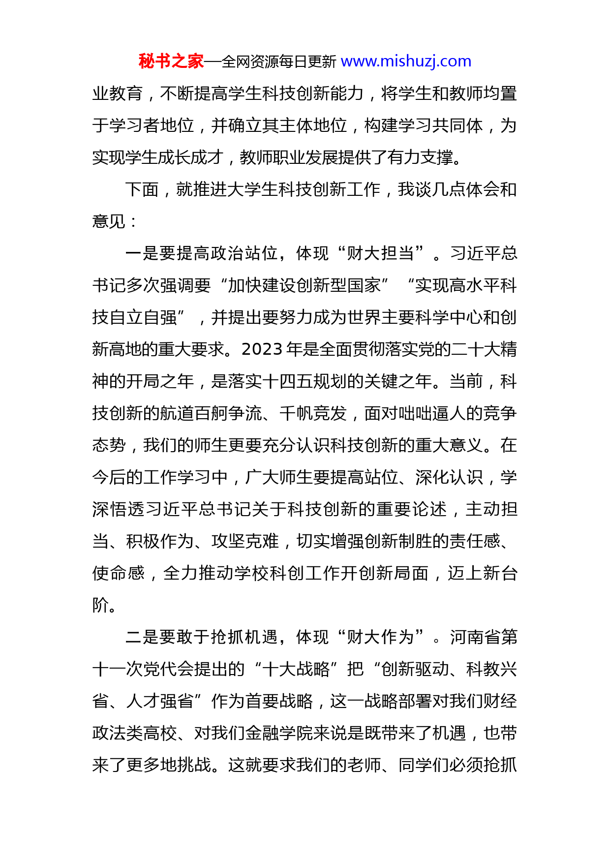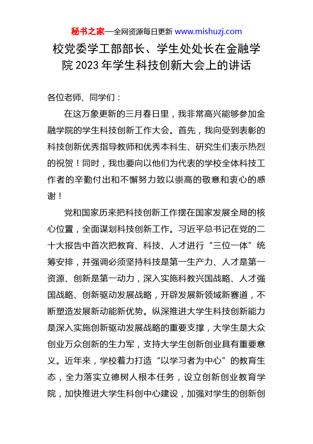 秘书之家—全网资源每日更新www.mishuzj.com校党委学工部部长、学生处处长在金融学院2023年学生科技创新大会上的讲话各位老师、同学们:在这万象更新的三月春日里,我非常高兴能够参加金融学院的学生科技创新工作大会。首先,我向受到表彰的科技创新优秀指导教师和优秀本科生、研究生们表示热烈的祝贺!同时,我也要向以他们为代表的学校全体科技工作者的辛勤付出和不懈努力致以崇高的敬意和衷心的感谢!党和国家历来把科技创新工作摆在国家发展全局的核心位置,全面谋划科技创新工作。习近平总书记在党的二十大报告中首次把教育、科技、人才进行“三位一体”统筹安排,并强调必须坚持科技是第一生产力、人才是第一资源、创新是第一动力,深入实施科教兴国战略、人才强国战略、创新驱动发展战略,开辟发展新领域新赛道,不断塑造发展新动能新优势。纵深推进大学生科技创新能力是深入实施创新驱动发展战略的重要支撑,大学生是大众创业万众创新的生力军,支持大学生创新创业具有重要意义。近年来,学校着力打造“以学习者为中心”的教育生态,全力落实立德树人根本任务,设立创新创业教育学院,加快推进大学生科创中心建设,加强对学生的创新创秘书之家—全网资源每日更新www.mishuzj.com业教育,不断提高学生科技创新能力,将学生和教师均置于学习者地位,并确立其主体地位,构建学习共同体,为实现学生成长成才,教师职业发展提供了有力支撑。下面,就推进大学生科技创新工作,我谈几点体会和意见:一是要提高政治站位,体现“财大担当”。习近平总书记多次强调要“加快建设创新型国家”“实现高水平科技自立自强”,并提出要努力成为世界主要科学中心和创新高地的重大要求。2023年是全面贯彻落实党的二十大精神的开局之年,是落实十四五规划的关键之年。当前,科技创新的航道百舸争流、千帆竞发,面对咄咄逼人的竞争态势,我们的师生更要充分认识科技创新的重大意义。在今后的工作学习中,广大师生要提高站位、深化认识,学深悟透习近平总书记关于科技创新的重要论述,主动担当、积极作为、攻坚克难,切实增强创新制胜的责任感、使命感,全力推动学校科创工作开创新局面,迈上新台阶。二是要敢于抢抓机遇,体现“财大作为”。河南省第十一次党代会提出的“十大战略”把“创新驱动、科教兴省、人才强省”作为首要战略,这一战略部署对我们财经政法类高校、对我们金融学院来说是既带来了机遇,也带来了更多地挑战。这就要求我们的老师、同学们必须抢抓秘书之家—全网资源每日更新www.mishuzj.com“三个机遇”,顺势而上、主动作为,认真思考当前我们国家在建设科技强国、教育强国、人才强国中面临的“燃眉之急”和“心腹之患”是什么,认真思考我们能够在实现新时代中原更加出彩中发挥什么作用,认真思考我们能够为推动学校事业实现高质量内涵式发展提供什么支持?并用这三个问题的答案,为我们未来的科创工作指明方向。三是要弘扬科创精神,体现“财大力量”。习近平总书记反复强调要大力弘扬科学家精神,就是要弘扬一代又一代科技工作者胸怀祖国、服务人民的爱国精神,勇攀高峰、敢为人先的创新精神,追求真理、严谨治学的求实精神,淡泊名利、潜心研究的奉献精神,集智攻关、团结协作的协同精神,甘为人梯、奖掖后学的育人精神。学校在几十年的发展历史中,持续不断地涌现出了一批又一批杰出人才,为我们这一辈财大人留下了“博洽通达、弘毅致远”的财大精神与文化。未来学校要在国家科技创新伟大事业中,建立新时代的财大功绩、体现强有力的“财大力量”,我们就必须把坚定文化自信、传承财大精神作为推动科技创新事业发展的根本动力!老师们、同学们,本次科技创新大会,既是对过去科技创新工作的总结,也是进一步激发科技创新活力、提升科研工作质量的动员会。让我们更加紧密地团结在以习近秘书之家—全网资源每日更新www.mishuzj.com平同志为核心的党中央周围,以习近平新时代中国特色社会主义思想为指导,深入贯彻落实党的二十大精神和校党委各项决策部署,锐意进取、再接再厉,努力开创科技创新工作新局面。最后,也祝愿金融学院能够在未来的科技创新工作取得优异的科创成果,当好“排头兵”、“领头羊”,为我校和社会做出更大的贡献。谢谢大家!