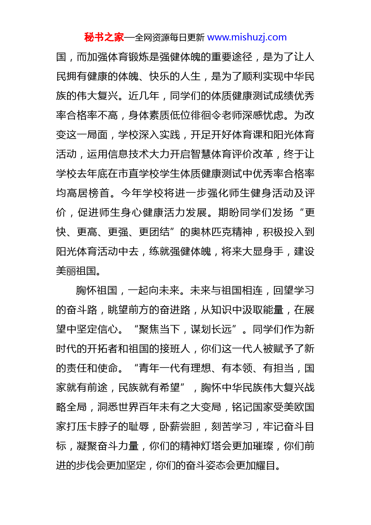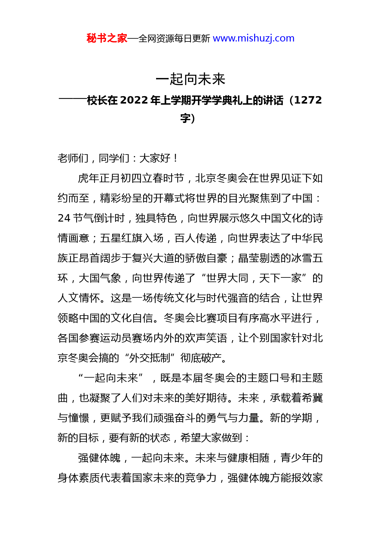 秘书之家—全网资源每日更新www.mishuzj.com一起向未来——校长在2022年上学期开学学典礼上的讲话(1272字)老师们,同学们:大家好!虎年正月初四立春时节,北京冬奥会在世界见证下如约而至,精彩纷呈的开幕式将世界的目光聚焦到了中国:24节气倒计时,独具特色,向世界展示悠久中国文化的诗情画意;五星红旗入场,百人传递,向世界表达了中华民族正昂首阔步于复兴大道的骄傲自豪;晶莹剔透的冰雪五环,大国气象,向世界传递了“世界大同,天下一家”的人文情怀。这是一场传统文化与时代强音的结合,让世界领略中国的文化自信。冬奥会比赛项目有序高水平进行,各国参赛运动员赛场内外的欢声笑语,让个别国家针对北京冬奥会搞的“外交抵制”彻底破产。“一起向未来”,既是本届冬奥会的主题口号和主题曲,也凝聚了人们对未来的美好期待。未来,承载着希冀与憧憬,更赋予我们顽强奋斗的勇气与力量。新的学期,新的目标,要有新的状态,希望大家做到:强健体魄,一起向未来。未来与健康相随,青少年的身体素质代表着国家未来的竞争力,强健体魄方能报效家秘书之家—全网资源每日更新www.mishuzj.com国,而加强体育锻炼是强健体魄的重要途径,是为了让人民拥有健康的体魄、快乐的人生,是为了顺利实现中华民族的伟大复兴。近几年,同学们的体质健康测试成绩优秀率合格率不高,身体素质低位徘徊令老师深感忧虑。为改变这一局面,学校深入实践,开足开好体育课和阳光体育活动,运用信息技术大力开启智慧体育评价改革,终于让学校去年底在市直学校学生体质健康测试中优秀率合格率均高居榜首。今年学校将进一步强化师生健身活动及评价,促进师生身心健康活力发展。期盼同学们发扬“更快、更高、更强、更团结”的奥林匹克精神,积极投入到阳光体育活动中去,练就强健体魄,将来大显身手,建设美丽祖国。胸怀祖国,一起向未来。未来与祖国相连,回望学习的奋斗路,眺望前方的奋进路,从知识中汲取能量,在展望中坚定信心。“聚焦当下,谋划长远”。同学们作为新时代的开拓者和祖国的接班人,你们这一代人被赋予了新的责任和使命。“青年一代有理想、有本领、有担当,国家就有前途,民族就有希望”,胸怀中华民族伟大复兴战略全局,洞悉世界百年未有之大变局,铭记国家受美欧国家打压卡脖子的耻辱,卧薪尝胆,刻苦学习,牢记奋斗目标,凝聚奋斗力量,你们的精神灯塔会更加璀璨,你们前进的步伐会更加坚定,你们的奋斗姿态会更加耀目。秘书之家—全网资源每日更新www.mishuzj.com奋斗不息,一起向未来。未来与奋斗相伴,中国女足两球落后逆转韩国,时隔16年再次问鼎亚洲之巅,迈进2023年世界杯;天问一号探测器从火星轨道传回“新春祝福”,空间站航天员与地面一次次“天地互动”让虎年春节“太空感”十足;青蛙公主谷爱凌获得冬奥会自由式滑雪大跳台金牌,其德智体美劳全面优异发展被长时间刷屏。荣耀属于奋斗者,未来属于奋斗者!奋勇拼搏,与时间赛跑,同困难较量,只争朝夕,不负韶华,“黄金时代,不在我们身后,乃在我们眼前。”如果说时代是出卷人,那我们就是答卷人,在这个千帆竞发、百舸争流的时代,我们不能固步自封,不能徘徊彷徨,要用今天的奋斗去成就未来的辉煌。更美的风景永远在前方,追梦者的脚步不会停歇,让我们向着未来出发,用汗水浇灌收获,让壮美的蓝图一步步成为现实。