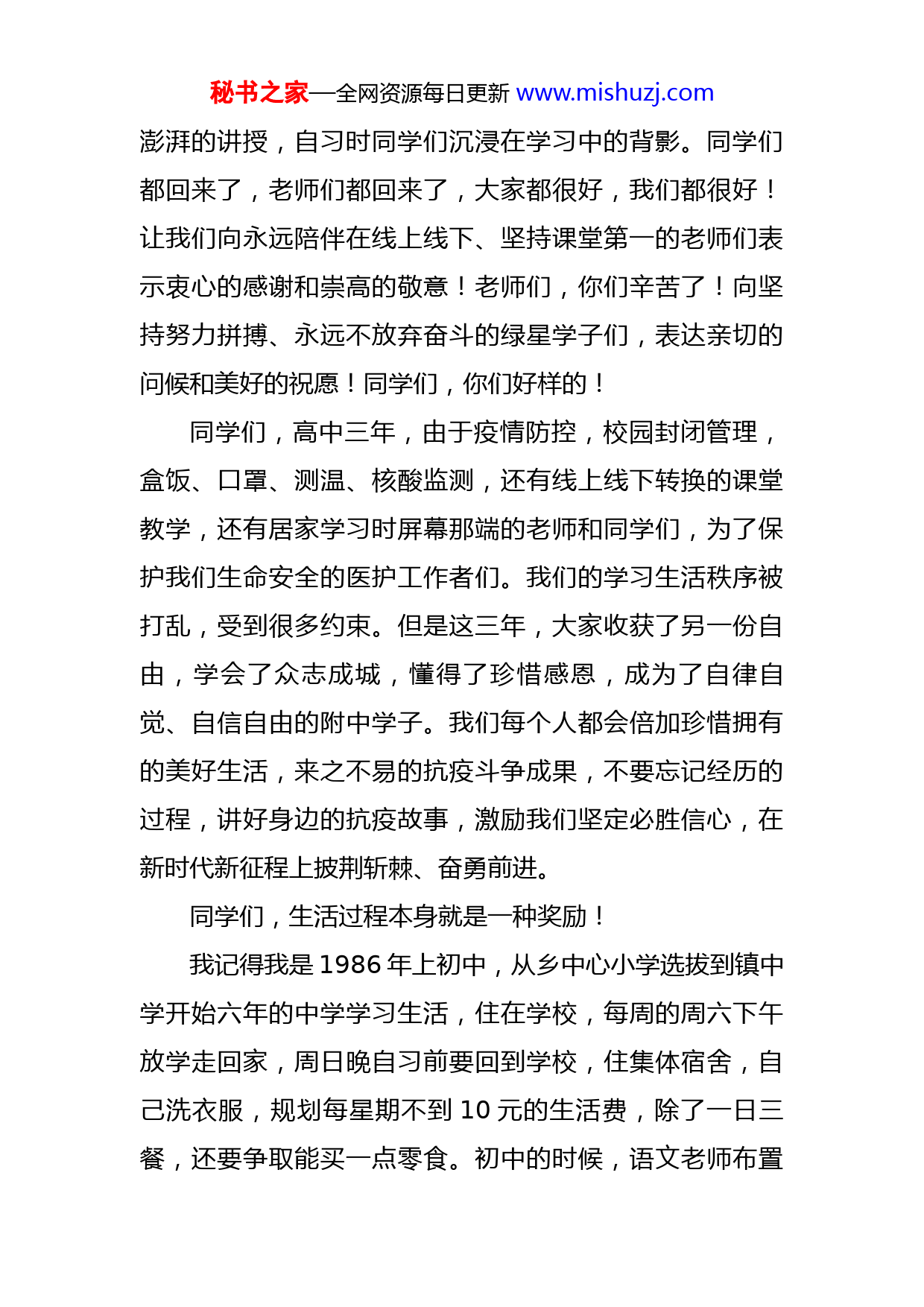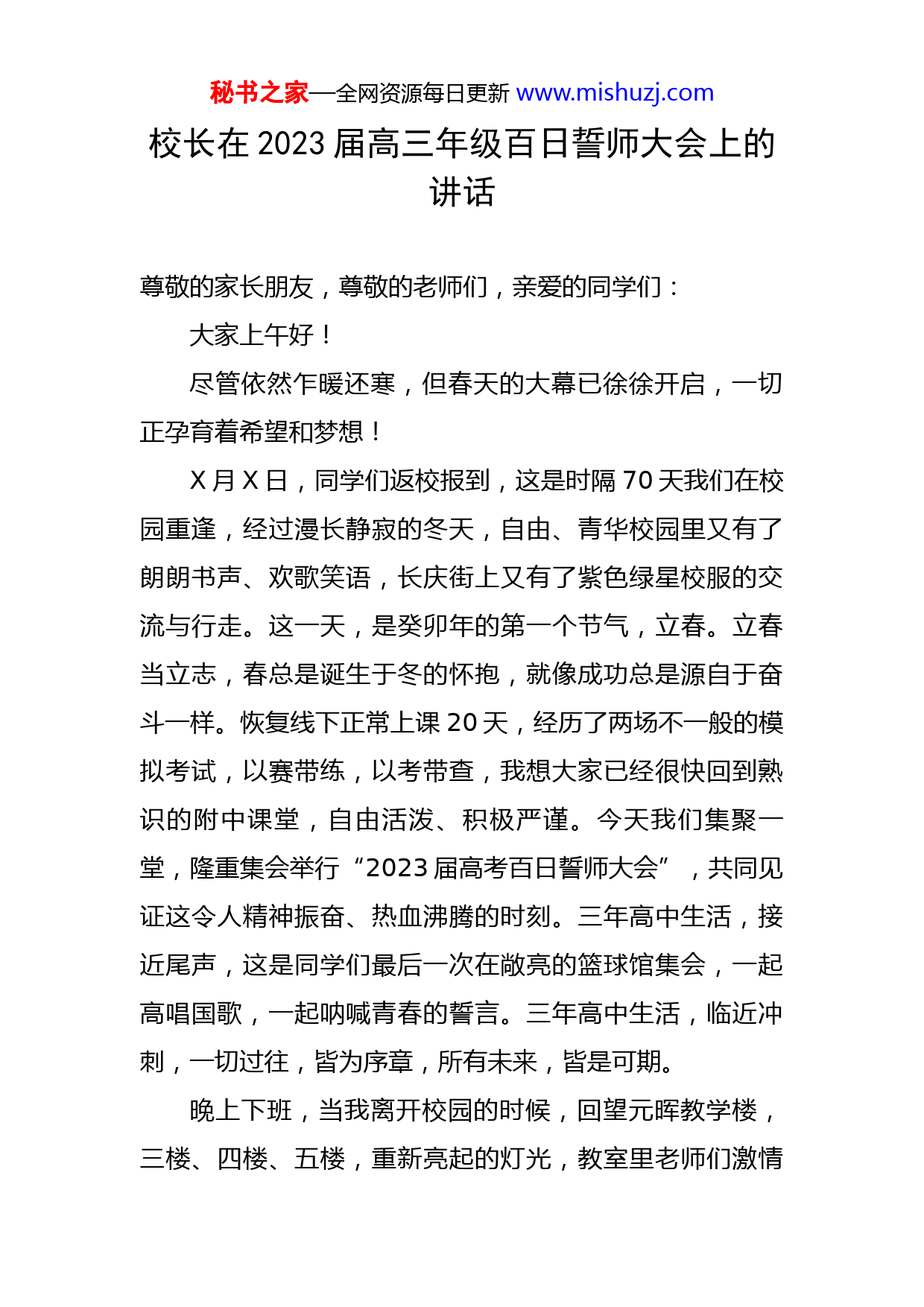 秘书之家—全网资源每日更新www.mishuzj.com校长在2023届高三年级百日誓师大会上的讲话尊敬的家长朋友,尊敬的老师们,亲爱的同学们:大家上午好!尽管依然乍暖还寒,但春天的大幕已徐徐开启,一切正孕育着希望和梦想!X月X日,同学们返校报到,这是时隔70天我们在校园重逢,经过漫长静寂的冬天,自由、青华校园里又有了朗朗书声、欢歌笑语,长庆街上又有了紫色绿星校服的交流与行走。这一天,是癸卯年的第一个节气,立春。立春当立志,春总是诞生于冬的怀抱,就像成功总是源自于奋斗一样。恢复线下正常上课20天,经历了两场不一般的模拟考试,以赛带练,以考带查,我想大家已经很快回到熟识的附中课堂,自由活泼、积极严谨。今天我们集聚一堂,隆重集会举行“2023届高考百日誓师大会”,共同见证这令人精神振奋、热血沸腾的时刻。三年高中生活,接近尾声,这是同学们最后一次在敞亮的篮球馆集会,一起高唱国歌,一起呐喊青春的誓言。三年高中生活,临近冲刺,一切过往,皆为序章,所有未来,皆是可期。晚上下班,当我离开校园的时候,回望元晖教学楼,三楼、四楼、五楼,重新亮起的灯光,教室里老师们激情秘书之家—全网资源每日更新www.mishuzj.com澎湃的讲授,自习时同学们沉浸在学习中的背影。同学们都回来了,老师们都回来了,大家都很好,我们都很好!让我们向永远陪伴在线上线下、坚持课堂第一的老师们表示衷心的感谢和崇高的敬意!老师们,你们辛苦了!向坚持努力拼搏、永远不放弃奋斗的绿星学子们,表达亲切的问候和美好的祝愿!同学们,你们好样的!同学们,高中三年,由于疫情防控,校园封闭管理,盒饭、口罩、测温、核酸监测,还有线上线下转换的课堂教学,还有居家学习时屏幕那端的老师和同学们,为了保护我们生命安全的医护工作者们。我们的学习生活秩序被打乱,受到很多约束。但是这三年,大家收获了另一份自由,学会了众志成城,懂得了珍惜感恩,成为了自律自觉、自信自由的附中学子。我们每个人都会倍加珍惜拥有的美好生活,来之不易的抗疫斗争成果,不要忘记经历的过程,讲好身边的抗疫故事,激励我们坚定必胜信心,在新时代新征程上披荆斩棘、奋勇前进。同学们,生活过程本身就是一种奖励!我记得我是1986年上初中,从乡中心小学选拔到镇中学开始六年的中学学习生活,住在学校,每周的周六下午放学走回家,周日晚自习前要回到学校,住集体宿舍,自己洗衣服,规划每星期不到10元的生活费,除了一日三餐,还要争取能买一点零食。初中的时候,语文老师布置秘书之家—全网资源每日更新www.mishuzj.com随笔作业,要求一周写七篇,每篇不能少于800字,其中三篇可以摘抄。每天晚自习,我都会认真的写一篇,为了摘抄我会认真去阅读期刊杂志,上图书馆借书来看,把好的片段抄下来,现在回想起来,阅读、写字、写作都是在初中三年近一千篇的随笔练成的。春节前,2006届XXX寝室的11位校友在相识20年聚会之际,大家一致想为附中母校做些贡献,回报附中母校桃李育人之恩。同学们集资设立“自强”学生奖学金,激励在校的学弟学妹用功读书,鼓励更多的附中学子自立自强,学好本领,不负韶华,不辱使命。咱们25班班主任XXX老师就是XXX寝室的住宿同学,他和满士哲校友等11位同学,是2003年入学的黄星年级,家乡分别来自北京、长春、白山、敦化、集安和九台;大学就读于清华大学、北京邮电大学、天津大学、西北大学、深圳大学、吉林财经大学、长春理工大学等,其中博士3人,硕士5人;从事行业分布在科研,教育,金融,零售,能源等领域,现生活在长春、北京、香港、深圳、西雅图等地,成为祖国建设、社会发展的栋梁之才!他们回忆高中住宿的学习生活时讲,“志存高远,学求博深”的校训一直激励他们在学习中不断奋斗,在工作生活中,依旧内心火热,信仰善良,勇于担当并积极服务社会。11位同学分别在11个班级,在三年的高中生活中积累了深厚友谊,在学习阶秘书之家—全网资源每日更新www.mishuzj.com段互相帮助,在参加工作后互相激励。同学情、兄弟情,高中集体生活让他们更加珍惜生活的美好!这是最好的奖励!同学们,我们都在经历一场人生旅行,这个过程可能愉快,可能平淡,也可能痛苦,但是你做这件事的过程,本身会给你带来收获,你会学到东西,得到一些领悟,增长一些经验,他们都会成为你生命的一部分,所有的经历都将成就更好的自己,担当更大的责任。人生的过程没有捷径,脚踏实地是唯一的路径。香港知名媒体人陈贝儿为了让世界了解中国的扶贫成就,实地考察全国各地的脱贫故事。她拍摄扶贫纪录片《无穷之路》期间,带着摄制组,穿云贵峡谷,闯西北沙漠,登川藏高原,足迹遍布四川、云南、广西等地,短短3个月,踏足6个省、10个县。她从霓虹灯的丛林中转身,让双脚沾满泥土。从雨林到沙漠,借溜索穿过偏见,用钢梯超越了怀疑。陈贝儿用脚步丈量中国,通过一条求真务实的无穷之路,向世界传递中国人发自内心的笑容,记录中国新时代最美的风景。东北师大附中的老师们从2018年开始教育帮扶深耕计划,老师们利用节假日休息时间,到西藏、贵州、内蒙,到吉林省的乡村中学送课送教,疫情防控期间也不忘教育帮扶,线上线下累记送课70次,平均每个月一次帮扶活动,五年来送课500余节,送教800余秘书之家—全网资源每日更新www.mishuzj.com场报告讲座,名师义培500位跟岗教师,老