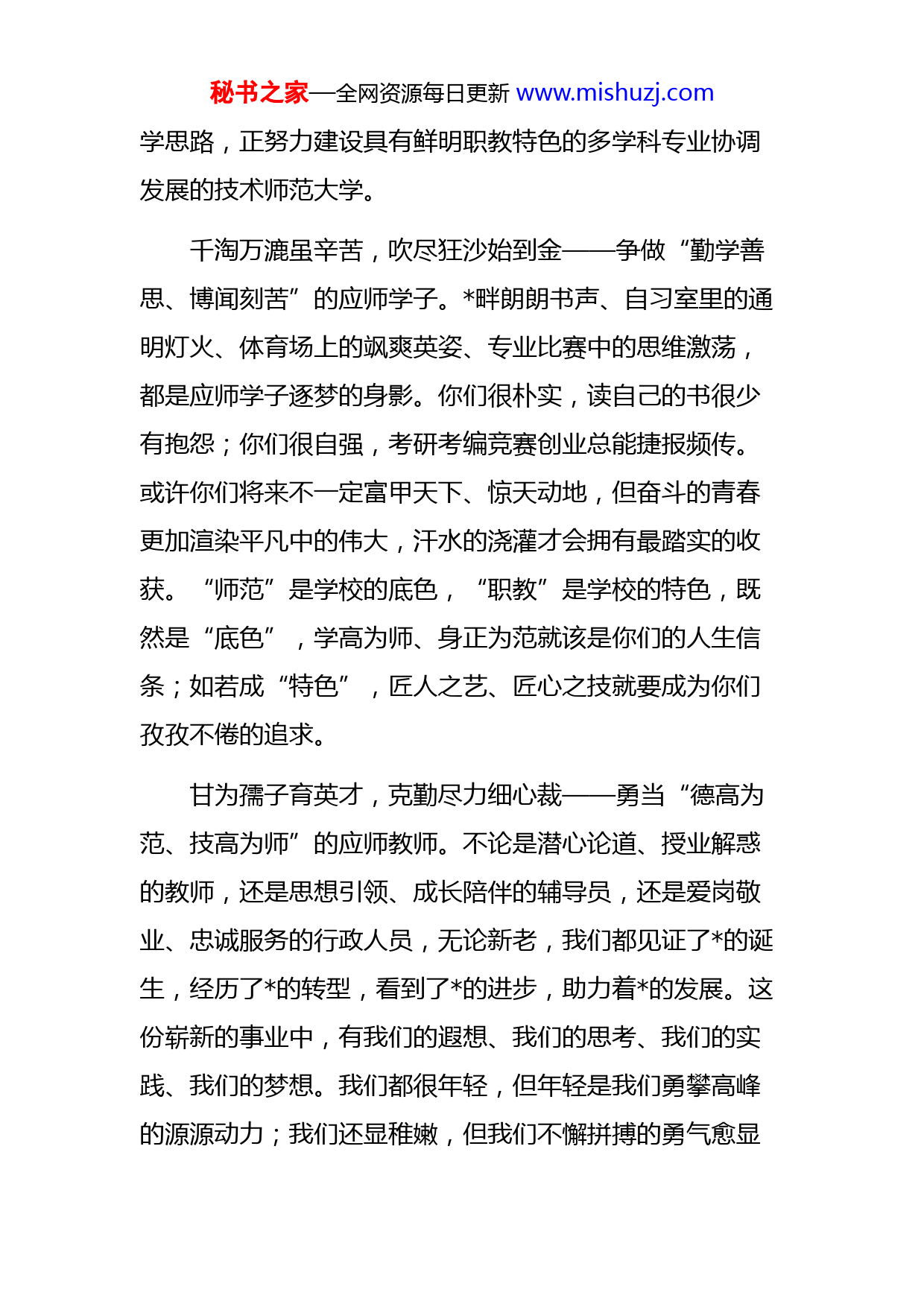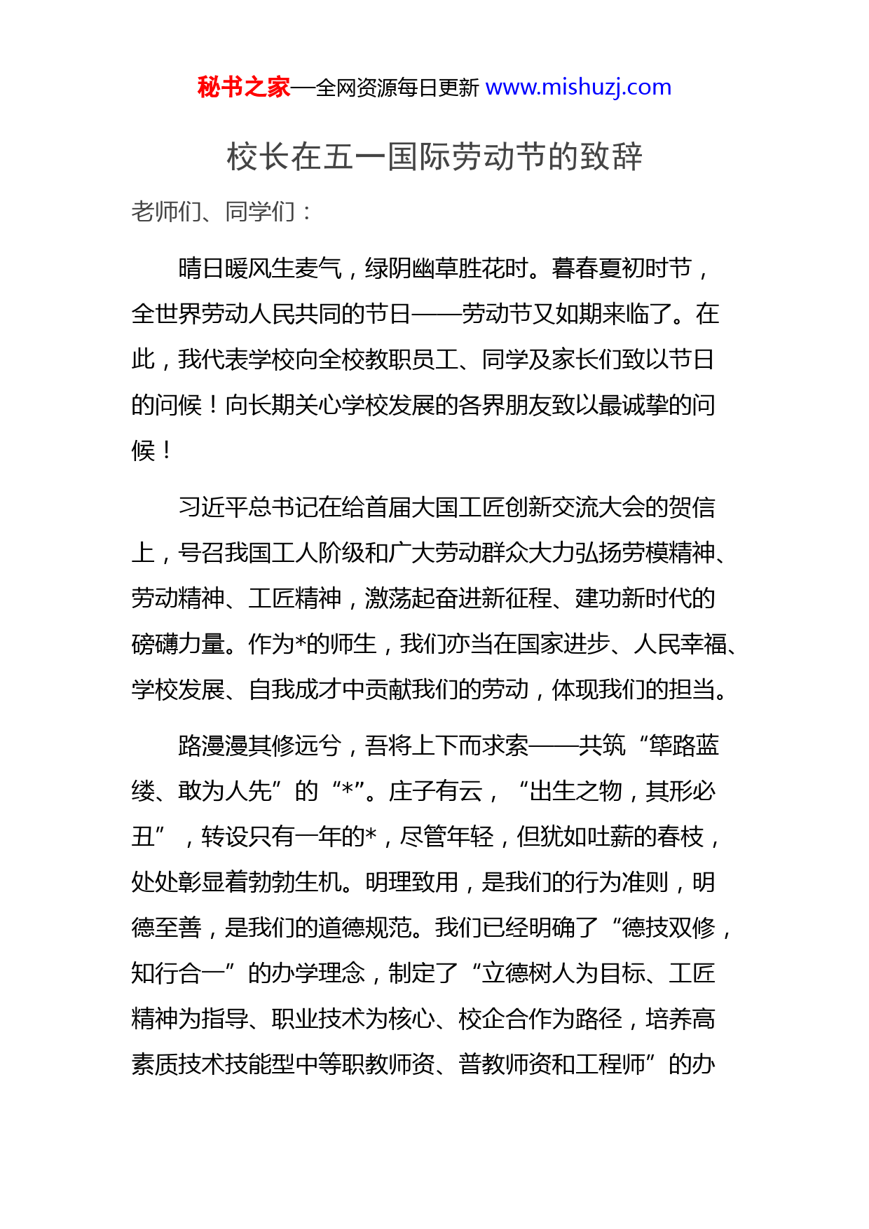 秘书之家—全网资源每日更新www.mishuzj.com校长在五一国际劳动节的致辞老师们、同学们:晴日暖风生麦气,绿阴幽草胜花时。暮春夏初时节,全世界劳动人民共同的节日——劳动节又如期来临了。在此,我代表学校向全校教职员工、同学及家长们致以节日的问候!向长期关心学校发展的各界朋友致以最诚挚的问候!习近平总书记在给首届大国工匠创新交流大会的贺信上,号召我国工人阶级和广大劳动群众大力弘扬劳模精神、劳动精神、工匠精神,激荡起奋进新征程、建功新时代的磅礴力量。作为的师生,我们亦当在国家进步、人民幸福、学校发展、自我成才中贡献我们的劳动,体现我们的担当。路漫漫其修远兮,吾将上下而求索——共筑“筚路蓝缕、敢为人先”的“”。庄子有云,“出生之物,其形必丑”,转设只有一年的,尽管年轻,但犹如吐薪的春枝,处处彰显着勃勃生机。明理致用,是我们的行为准则,明德至善,是我们的道德规范。我们已经明确了“德技双修,知行合一”的办学理念,制定了“立德树人为目标、工匠精神为指导、职业技术为核心、校企合作为路径,培养高素质技术技能型中等职教师资、普教师资和工程师”的办秘书之家—全网资源每日更新www.mishuzj.com学思路,正努力建设具有鲜明职教特色的多学科专业协调发展的技术师范大学。千淘万漉虽辛苦,吹尽狂沙始到金——争做“勤学善思、博闻刻苦”的应师学子。畔朗朗书声、自习室里的通明灯火、体育场上的飒爽英姿、专业比赛中的思维激荡,都是应师学子逐梦的身影。你们很朴实,读自己的书很少有抱怨;你们很自强,考研考编竞赛创业总能捷报频传。或许你们将来不一定富甲天下、惊天动地,但奋斗的青春更加渲染平凡中的伟大,汗水的浇灌才会拥有最踏实的收获。“师范”是学校的底色,“职教”是学校的特色,既然是“底色”,学高为师、身正为范就该是你们的人生信条;如若成“特色”,匠人之艺、匠心之技就要成为你们孜孜不倦的追求。甘为孺子育英才,克勤尽力细心裁——勇当“德高为范、技高为师”的应师教师。不论是潜心论道、授业解惑的教师,还是思想引领、成长陪伴的辅导员,还是爱岗敬业、忠诚服务的行政人员,无论新老,我们都见证了的诞生,经历了的转型,看到了的进步,助力着的发展。这份崭新的事业中,有我们的遐想、我们的思考、我们的实践、我们的梦想。我们都很年轻,但年轻是我们勇攀高峰的源源动力;我们还显稚嫩,但我们不懈拼搏的勇气愈显秘书之家—全网资源每日更新www.mishuzj.com强大。劳动铸就梦想,奋斗开创未来,唯有凝心聚力、守望相助,的明天才会更美好;只有德高为范、技高为师,才能铸造“工匠之师的摇篮”。谁言寸草心,报得三春晖——致敬大爱如山、含辛茹苦的天下父母。值此佳节,我们不能忘记远在家乡,抑或工作在异乡的父母,他们有的辛勤于面朝黄土,有的劳作在机器轰鸣,有的奉献在为人民服务,有的已退休在家含饴弄孙。父母总把辛苦隐匿在心里,却把慈爱挂在脸上;总把困苦扛在肩上,却把温暖双手捧送。不管什么时候,不管什么岗位,父母都是最光荣而伟大的劳动者,都是我们最可亲可敬的人。一夫不耕,或为之饥;一妇不织,或为之寒。每一个理想的实现,都需要我们进行艰苦的奋斗。学校美好的未来更需要全校教职工齐心协力去创造。让我们锐意进取、爱岗敬业,为社会培养更多有用的人才,为把我校建设成具有鲜明师范底色、职教特色的国内有影响的职业技术师范院校而砥砺前行、奋斗不止!