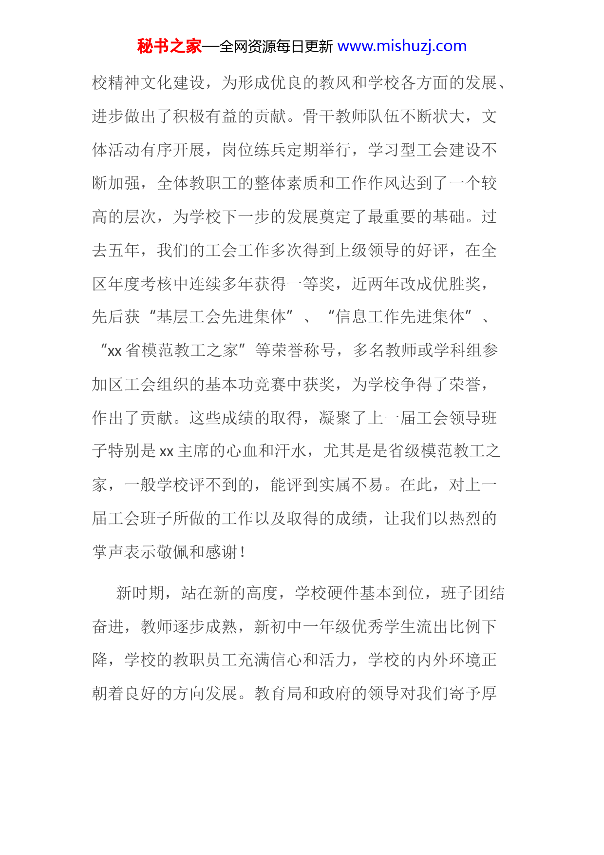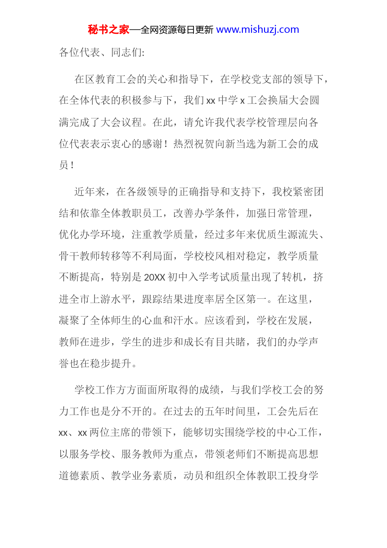 秘书之家—全网资源每日更新www.mishuzj.com各位代表、同志们:在区教育工会的关心和指导下,在学校党支部的领导下,在全体代表的积极参与下,我们xx中学x工会换届大会圆满完成了大会议程。在此,请允许我代表学校管理层向各位代表表示衷心的感谢!热烈祝贺向新当选为新工会的成员!近年来,在各级领导的正确指导和支持下,我校紧密团结和依靠全体教职员工,改善办学条件,加强日常管理,优化办学环境,注重教学质量,经过多年来优质生源流失、骨干教师转移等不利局面,学校校风相对稳定,教学质量不断提高,特别是20XX初中入学考试质量出现了转机,挤进全市上游水平,跟踪结果进度率居全区第一。在这里,凝聚了全体师生的心血和汗水。应该看到,学校在发展,教师在进步,学生的进步和成长有目共睹,我们的办学声誉也在稳步提升。学校工作方方面面所取得的成绩,与我们学校工会的努力工作也是分不开的。在过去的五年时间里,工会先后在xx、xx两位主席的带领下,能够切实围绕学校的中心工作,以服务学校、服务教师为重点,带领老师们不断提高思想道德素质、教学业务素质,动员和组织全体教职工投身学秘书之家—全网资源每日更新www.mishuzj.com校精神文化建设,为形成优良的教风和学校各方面的发展、进步做出了积极有益的贡献。骨干教师队伍不断状大,文体活动有序开展,岗位练兵定期举行,学习型工会建设不断加强,全体教职工的整体素质和工作作风达到了一个较高的层次,为学校下一步的发展奠定了最重要的基础。过去五年,我们的工会工作多次得到上级领导的好评,在全区年度考核中连续多年获得一等奖,近两年改成优胜奖,先后获“基层工会先进集体”、“信息工作先进集体”、“xx省模范教工之家”等荣誉称号,多名教师或学科组参加区工会组织的基本功竞赛中获奖,为学校争得了荣誉,作出了贡献。这些成绩的取得,凝聚了上一届工会领导班子特别是xx主席的心血和汗水,尤其是是省级模范教工之家,一般学校评不到的,能评到实属不易。在此,对上一届工会班子所做的工作以及取得的成绩,让我们以热烈的掌声表示敬佩和感谢!新时期,站在新的高度,学校硬件基本到位,班子团结奋进,教师逐步成熟,新初中一年级优秀学生流出比例下降,学校的教职员工充满信心和活力,学校的内外环境正朝着良好的方向发展。教育局和政府的领导对我们寄予厚秘书之家—全网资源每日更新www.mishuzj.com望,社会各界、家长,包括退休老同志,也对我们寄予厚望。昨天我们校级班子成员分别探访、拜访了xx老校长和xx老校长,x校长经过精心治疗,情况大为好转,两眼放光,情绪乐观,形体外貌和精神状态都很好;xx老校长八十六岁,腿脚不太方便,满头银发,但精神瞿烁,口齿非常清楚,思维非常清晰,看到我们一行,非常高兴。两位老校长接待我们的第一句话都是:今年新初一有多少学生?体现了老一辈教育工作者对我校的深厚感情和发展状大的强烈期望,让我们非常感动,同时也备感责任重大。所有这些关注,也给工会的作用发挥提出了更高的要求,同时为工会工作的更好发展提供了难得的机遇。下面,就如何做好学校的工会工作,为教育教学服务,为教职员工服务,提三点希望:一是希望学校工会自觉接受党支部的领导,积极争取行政支持,不断增强使命感、责任感,自觉地把工会工作融入到教育教学工作大局中去。按照国家有关法律赋予的权利,实现好、发展好、维护好广大教师的合法权益。千方百计为广大教师特别是困难教师办实事、做好事、解难事。要不断加强自身建设,进一步开创工作新局面,坚持依靠秘书之家—全网资源每日更新www.mishuzj.com教师开展工作,把工会工作做到教师中去,做到教师家属中去。二是希望新的一届工会委员会要加强学习,勤奋工作,牢记全体教师的重托,牢记全心全意为人民服务的宗旨,时刻把广大教师的冷暖安危挂在心上,以强烈的责任感,崇高的使命感,以人为本,尽心尽责地做好工作,努力把工会组织建设成为广大教师信赖的“和谐之家”、“温暖之家”,当好教师合法权益的积极维护者。三是希望广大工会会员,胸怀大局,志存高远,与时俱进,进一步增强工作主动性,发挥创造性,踏实工作,教书育人,坚定地走在教育教学改革的最前列,充分展现新时期教师的精神风貌的业务风采,为学校“提质量,谋发展,创特色”多做贡献。代表们,同志们!我坚信,在教育工会新领导层的领导下,我们一定能够团结和动员全体教职员工,为学校的发展和优质学校的成立做出应有的贡献。各位代表,让我们以这次会议为起点,学习榜样,比武奋进,努力把我校建设成为“学生喜欢、家长满意、领导放心”的农村初中优质学校!秘书之家—全网资源每日更新www.mishuzj.com非常感谢。