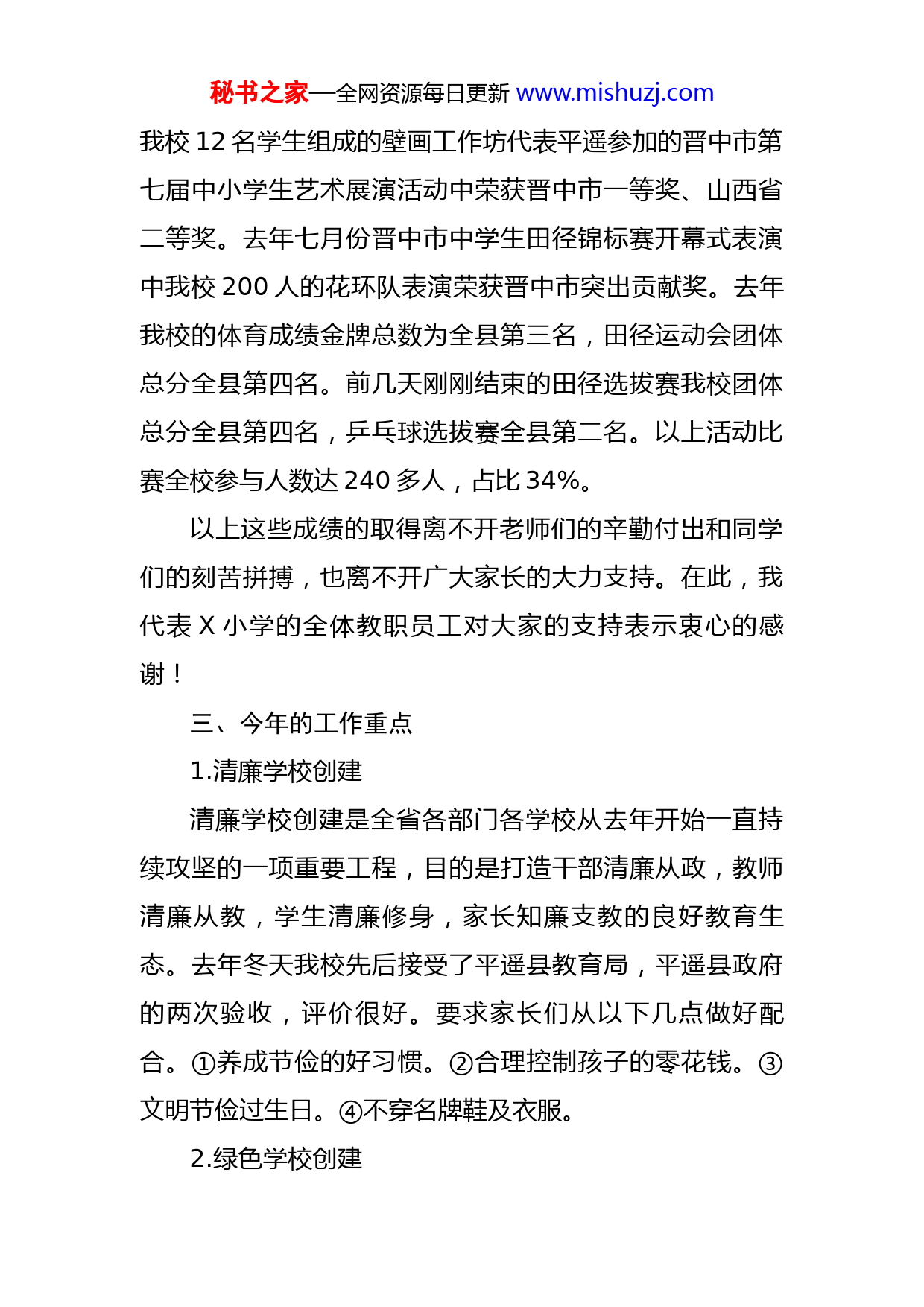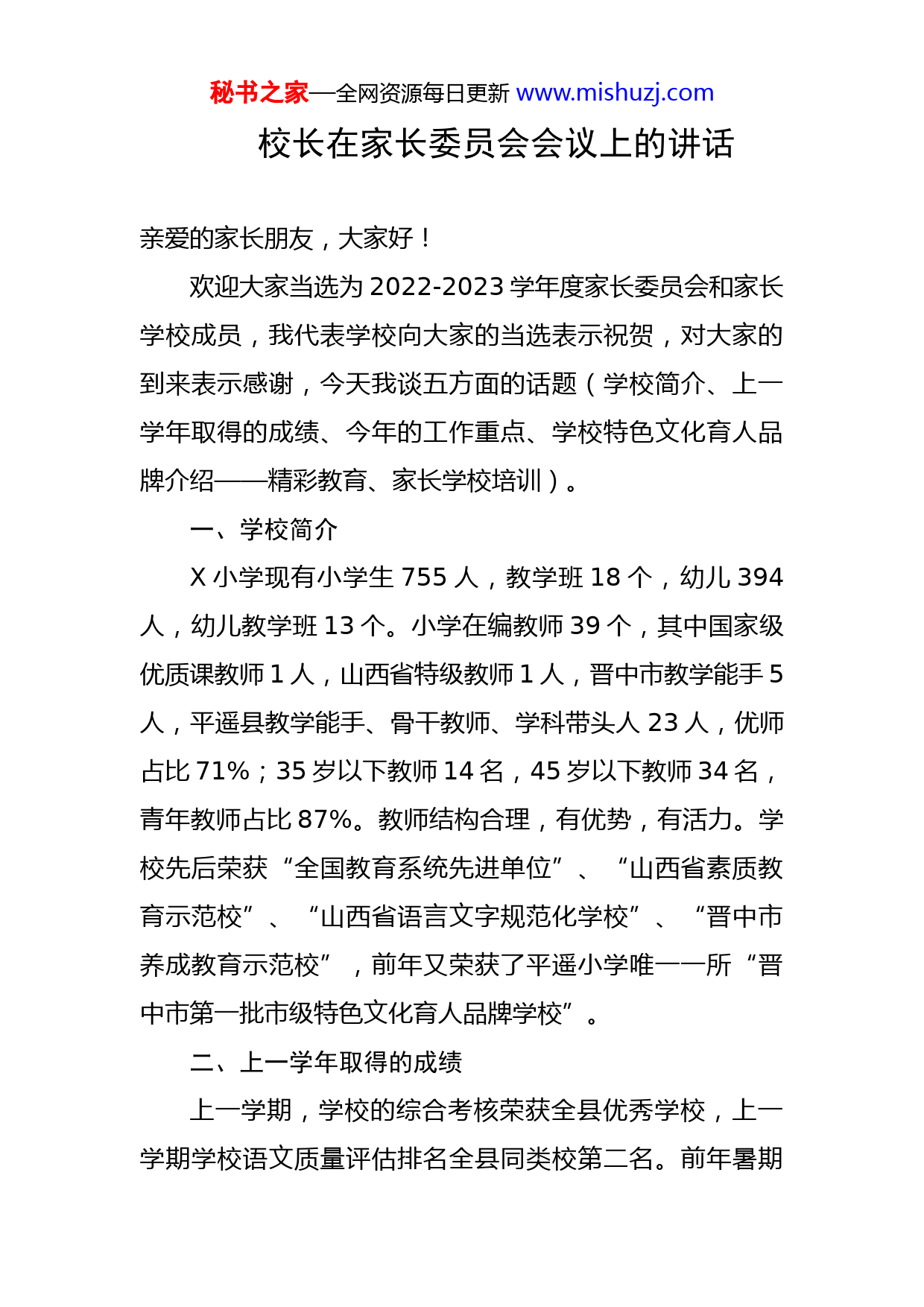 秘书之家—全网资源每日更新www.mishuzj.com校长在家长委员会会议上的讲话亲爱的家长朋友,大家好!欢迎大家当选为2022-2023学年度家长委员会和家长学校成员,我代表学校向大家的当选表示祝贺,对大家的到来表示感谢,今天我谈五方面的话题(学校简介、上一学年取得的成绩、今年的工作重点、学校特色文化育人品牌介绍——精彩教育、家长学校培训)。一、学校简介X小学现有小学生755人,教学班18个,幼儿394人,幼儿教学班13个。小学在编教师39个,其中国家级优质课教师1人,山西省特级教师1人,晋中市教学能手5人,平遥县教学能手、骨干教师、学科带头人23人,优师占比71%;35岁以下教师14名,45岁以下教师34名,青年教师占比87%。教师结构合理,有优势,有活力。学校先后荣获“全国教育系统先进单位”、“山西省素质教育示范校”、“山西省语言文字规范化学校”、“晋中市养成教育示范校”,前年又荣获了平遥小学唯一一所“晋中市第一批市级特色文化育人品牌学校”。二、上一学年取得的成绩上一学期,学校的综合考核荣获全县优秀学校,上一学期学校语文质量评估排名全县同类校第二名。前年暑期秘书之家—全网资源每日更新www.mishuzj.com我校12名学生组成的壁画工作坊代表平遥参加的晋中市第七届中小学生艺术展演活动中荣获晋中市一等奖、山西省二等奖。去年七月份晋中市中学生田径锦标赛开幕式表演中我校200人的花环队表演荣获晋中市突出贡献奖。去年我校的体育成绩金牌总数为全县第三名,田径运动会团体总分全县第四名。前几天刚刚结束的田径选拔赛我校团体总分全县第四名,乒乓球选拔赛全县第二名。以上活动比赛全校参与人数达240多人,占比34%。以上这些成绩的取得离不开老师们的辛勤付出和同学们的刻苦拼搏,也离不开广大家长的大力支持。在此,我代表X小学的全体教职员工对大家的支持表示衷心的感谢!三、今年的工作重点1.清廉学校创建清廉学校创建是全省各部门各学校从去年开始一直持续攻坚的一项重要工程,目的是打造干部清廉从政,教师清廉从教,学生清廉修身,家长知廉支教的良好教育生态。去年冬天我校先后接受了平遥县教育局,平遥县政府的两次验收,评价很好。要求家长们从以下几点做好配合。①养成节俭的好习惯。②合理控制孩子的零花钱。③文明节俭过生日。④不穿名牌鞋及衣服。2.绿色学校创建秘书之家—全网资源每日更新www.mishuzj.com为贯彻落实习近平生态文明思想和党的十九大、二十大精神,落实教育部办公厅、国家发改委办公厅《绿色学校创建行动方案》,贯彻落实山西省人民政府办公厅文件《关于印发山西省绿色生活创建行动实施方案的通知》,在全省各级各类学校厚植绿色发展理念,加强学生生态文明教育,着力提升师生生态文明素养,影响和带动全社会参与生态文明建设,要求各位家长做好以下几点:①生活中养成节水节粮节电的好习惯。②生活垃圾要进行分类,合理利用。③低碳行动,非必要不开汽车。④爱护鸟类及野生动物。⑤大力植树造林。⑥爱护环境,讲究卫生。⑦在家长中做好宣传。3.加强学生的六大习惯养成和读书活动。好习惯成就人的一生,我认为习惯好比学习好都重要,并且一般是习惯好了学习也就好了,所以按照学校规定的六大习惯内容大家要一以贯之地坚持执行下去,学生一定会有一个好的未来。新一轮课程改革对学生素养的提升又提出了更高更具体的要求,而影响学生学习质量的因素很大程度取决于对文本阅读的速度、广度、深度,因此从小养成读书的习惯也至关重要,所以我们要让孩子多读书,读好书。四、学校特色文化育人品牌介绍(精彩教育)精彩,原意为选取上好的白米,用来形容表演、展秘书之家—全网资源每日更新www.mishuzj.com览、作品、言论等出色绝妙,或者某些方面出乎大众意料,超常表现。拆开来看,精,即精华的、优选的;彩,可做动词选取之意,亦可做形容词多样缤纷之意。对于每一个孩子来说,都有属于自己的精彩之处。我们的教育过程其实就是在帮助孩子发现这些连他们都不知道的精彩,我们应当为孩子提供多元的平台和丰富的机会,使他们成为更好的自己。对于每一位教师来说,都有属于自己的精彩之处。在目前的教育环境中,人们更多的是关心孩子如何,学校如何,家长如何,而对于这一切的核心参与者——教师的讨论却大多停留在教学教法、师德师风等传统议题上。我们应当为教师的职业精彩和人生精彩负责,帮助他们实现职业成长和人生突破。对于每一位家长来说,都有属于自己的精彩之处。广义的教育包括社会教育、学校教育和家庭教育,其中对个体影响至关重要的便是家庭教育。我们要重塑家长在整个教育链条中的地位,让每一位家长都能成为家庭教育的专家,让每个家庭的教育都有精彩之处。正如我校的校训所言——让每一个孩子绽放生命的精彩,我们不仅希望学校的每一个孩子,更希望每一名教师、每一位家长都可以成就属于自己的精彩。只有每一个教育主体的精彩才能实现学校的全面精彩。秘书之家—全网资源每日更新www.mishuzj.com为此,学校从以下几方面进行了探索。1.塑造精彩教师①培育一支师德高尚、敬业爱生的正能量团队。②建立一套激励人心、公平公正的教师考评制度。③打造一支责任心强、能力高的班主任队伍。④培养一