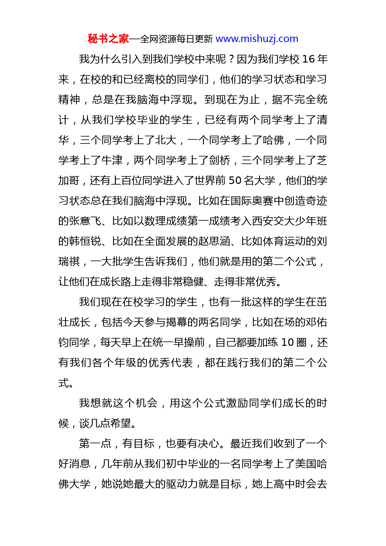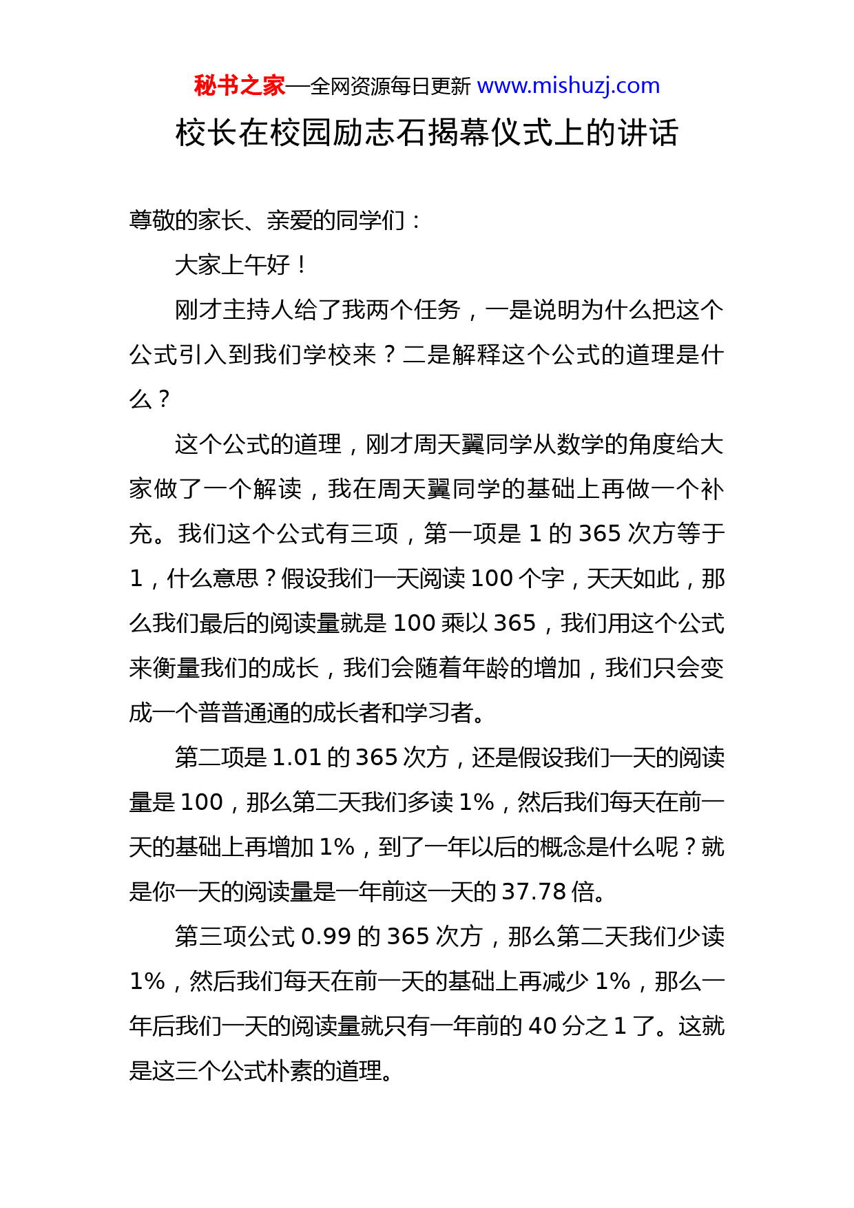 秘书之家—全网资源每日更新www.mishuzj.com校长在校园励志石揭幕仪式上的讲话尊敬的家长、亲爱的同学们:大家上午好!刚才主持人给了我两个任务,一是说明为什么把这个公式引入到我们学校来?二是解释这个公式的道理是什么?这个公式的道理,刚才周天翼同学从数学的角度给大家做了一个解读,我在周天翼同学的基础上再做一个补充。我们这个公式有三项,第一项是1的365次方等于1,什么意思?假设我们一天阅读100个字,天天如此,那么我们最后的阅读量就是100乘以365,我们用这个公式来衡量我们的成长,我们会随着年龄的增加,我们只会变成一个普普通通的成长者和学习者。第二项是1.01的365次方,还是假设我们一天的阅读量是100,那么第二天我们多读1%,然后我们每天在前一天的基础上再增加1%,到了一年以后的概念是什么呢?就是你一天的阅读量是一年前这一天的37.78倍。第三项公式0.99的365次方,那么第二天我们少读1%,然后我们每天在前一天的基础上再减少1%,那么一年后我们一天的阅读量就只有一年前的40分之1了。这就是这三个公式朴素的道理。秘书之家—全网资源每日更新www.mishuzj.com我为什么引入到我们学校中来呢?因为我们学校16年来,在校的和已经离校的同学们,他们的学习状态和学习精神,总是在我脑海中浮现。到现在为止,据不完全统计,从我们学校毕业的学生,已经有两个同学考上了清华,三个同学考上了北大,一个同学考上了哈佛,一个同学考上了牛津,两个同学考上了剑桥,三个同学考上了芝加哥,还有上百位同学进入了世界前50名大学,他们的学习状态总在我们脑海中浮现。比如在国际奥赛中创造奇迹的张意飞、比如以数理成绩第一成绩考入西安交大少年班的韩恒锐、比如在全面发展的赵思涵、比如体育运动的刘瑞祺,一大批学生告诉我们,他们就是用的第二个公式,让他们在成长路上走得非常稳健、走得非常优秀。我们现在在校学习的学生,也有一批这样的学生在茁壮成长,包括今天参与揭幕的两名同学,比如在场的邓佑钧同学,每天早上在统一早操前,自己都要加练10圈,还有我们各个年级的优秀代表,都在践行我们的第二个公式。我想就这个机会,用这个公式激励同学们成长的时候,谈几点希望。第一点,有目标,也要有决心。最近我们收到了一个好消息,几年前从我们初中毕业的一名同学考上了美国哈佛大学,她说她最大的驱动力就是目标,她上高中时会去秘书之家—全网资源每日更新www.mishuzj.com世界上最不发达国家的小学支教,看到那些孩子们的状态,她在和当地孩子们交流后,觉得这些孩子的心理问题,是因为教学资源的落后导致对学习、对成长、对社会、对自己本身的心理障碍,所以她下决心一定要从事心理学事业,要用心理学专业知识,来改变这一批孩子的心理状态。她为此奋斗了几年,今年终于考上了哈佛。第二点,做有难度的事,要积极拥抱。我刚才讲的韩恒锐同学,他是数理成绩全国第一考入西安交大少年班的,但是他当时的体育成绩与西安交大少年班的成绩还相去甚远,面对这样的困难,他一个寒假坚持每天跑步,为了更好的效果,还在腿上绑了两个沙袋,风雨无阻,最后他成功了。为什么我提倡我们的同学做有困难的事,越做有难度的事就越容易成功。第三点,每天多一点,要持之以恒。我们每天的成长只要增加1%,一年的效果就是37.78倍。第一天增加1%没问题,但是要坚持一年,这就非常需要我们自律。每天坚持下来,每个同学都可以创造学习、成长、包括今后事业的好成绩。希望同学们成为这个公式践行的榜样,并用这个精神带动我们1600个同学,让我们1600个同学都在这个公式的激励下成长得更好,成长为社会需要的人才。