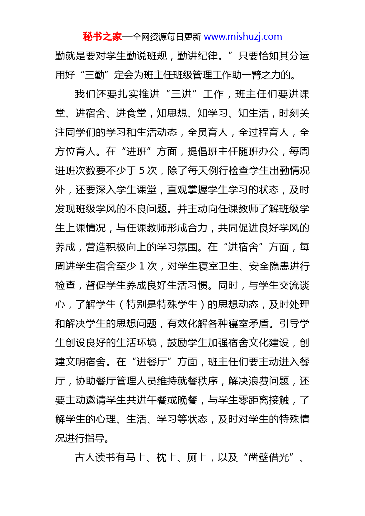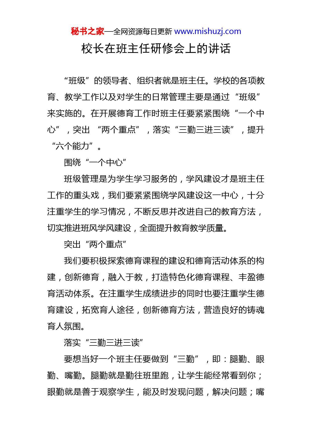 秘书之家—全网资源每日更新www.mishuzj.com校长在班主任研修会上的讲话“班级”的领导者、组织者就是班主任。学校的各项教育、教学工作以及对学生的日常管理主要是通过“班级”来实施的。在开展德育工作时班主任要紧紧围绕“一个中心”,突出“两个重点”,落实“三勤三进三读”,提升“六个能力”。围绕“一个中心”班级管理是为学生学习服务的,学风建设才是班主任工作的重头戏,我们要紧紧围绕学风建设这一中心,十分注重学生的学习情况,不断反思并改进自己的教育方法,切实推进班风学风建设,全面提升教育教学质量。突出“两个重点”我们要积极探索德育课程的建设和德育活动体系的构建,创新德育,融入于教,打造特色化德育课程、丰盈德育活动体系。在注重学生成绩进步的同时也要注重学生德育建设,拓宽育人途径,创新德育方法,营造良好的铸魂育人氛围。落实“三勤三进三读”要想当好一个班主任要做到“三勤”,即:腿勤、眼勤、嘴勤。腿勤就是勤往班里跑,让学生能经常看到你;眼勤就是善于观察学生,能及时发现问题,解决问题;嘴秘书之家—全网资源每日更新www.mishuzj.com勤就是要对学生勤说班规,勤讲纪律。”只要恰如其分运用好“三勤”定会为班主任班级管理工作助一臂之力的。我们还要扎实推进“三进”工作,班主任们要进课堂、进宿舍、进食堂,知思想、知学习、知生活,时刻关注同学们的学习和生活动态,全员育人,全过程育人,全方位育人。在“进班”方面,提倡班主任随班办公,每周进班次数要不少于5次,除了每天例行检查学生出勤情况外,还要深入学生课堂,直观掌握学生学习的状态,及时发现班级学风的不良问题。并主动向任课教师了解班级学生上课情况,与任课教师形成合力,共同促进良好学风的养成,营造积极向上的学习氛围。在“进宿舍”方面,每周进学生宿舍至少1次,对学生寝室卫生、安全隐患进行检查,督促学生养成良好生活习惯。同时,与学生交流谈心,了解学生(特别是特殊学生)的思想动态,及时处理和解决学生的思想问题,有效化解各种寝室矛盾。引导学生创设良好的生活环境,鼓励学生加强宿舍文化建设,创建文明宿舍。在“进餐厅”方面,班主任们要主动进入餐厅,协助餐厅管理人员维持就餐秩序,解决浪费问题,还要主动邀请学生共进午餐或晚餐,与学生零距离接触,了解学生的心理、生活、学习等状态,及时对学生的特殊情况进行指导。古人读书有马上、枕上、厕上,以及“凿壁借光”、秘书之家—全网资源每日更新www.mishuzj.com“悬梁刺股”、“闻鸡起舞”等丰富的惜时事例,我们也要以“三读”为抓手,促进班风学风建设。“三读”即操前读、餐前读、课前读,以及利用其他碎片化的时间进行激情小读,争分夺秒冲在时间的前端,让学生做到心中有课堂,无处不学习。班主任要进行监督,一是检查学生“三读”精神状态以及落实情况;二是寻找问题,对症下药,不断完善提质“三读”计划;三是互相学习,取他长处,改己不足。利用“三读”,让学生养成自律习惯,进一步落实班风学风建设工作,营造良好的学习氛围。提升“六个能力”1.班级管理能力班主任要管理好一个班级,并不是轻而易举就能做到的,而是需要付出劳动、付出代价的。一个班集体由几十名学生组成,他们的思想水平、兴趣爱好、性格特点各不相同。因此,要管理好一个班级,班主任首先必须具备一定的管理能力。而这种管理能力的来源,就是理论学习和教学实践。2.有效沟通能力沟通是一门“细微之处见真章”的艺术,更是一种“共情相长润无声”的大智慧。班主任要善于与学生和家长,获得学生和家长的支持。我们要时刻反思自己在与家长、学生沟通方面的不足,寻找更为合适、增强沟通的有秘书之家—全网资源每日更新www.mishuzj.com效方法,从而更智慧地解决教育教学过程中遇到的各种问题。3.组织协调能力组织协调能力是班主任工作成功有效地完成的基石。良好的班主任组织协调能力是帮助学生和教师完成课堂管理和班级活动的保证。在校内,班主任必须协调学校领导、任课教师等关系。在校外,班主任还要协调学校、家庭和社会对学生的教育影响,发挥教育意义的最大化。4.认识问题能力班主任站位要高,眼光要放长远,认识问题要深刻,做事要精细。5.正面激励能力每个学生都是一颗闪亮的星星,都有他存在的位置与价值。作为独立的个体,每个人都有自己的优势,都渴望被肯定、被赞赏。在班级管理和教育过程中,班主任对学生的激励工作做得好,就能发挥学生的积极性和潜力,取得更好的教育效果。所以在日常工作中我们要多鼓励,多赞扬,多发现学生的闪光点,哪怕一点点的进步也要及时地给予表扬!最大限度地发挥每个学生的聪明才智和创造性,使班级的整体效能提高。6.迅速行动能力班主任在日常工作中要做到:不拖不等,迅速行动。