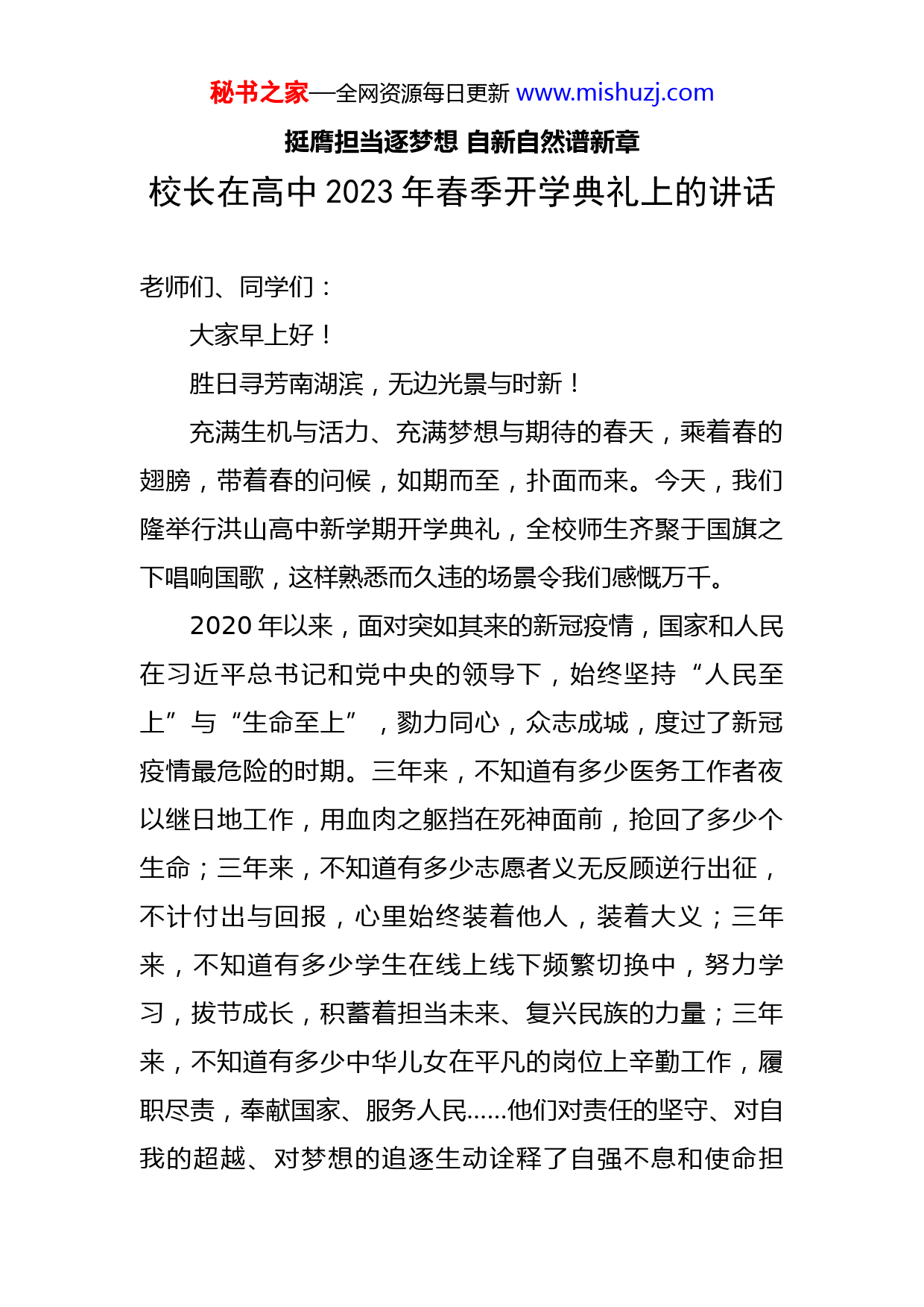 秘书之家—全网资源每日更新www.mishuzj.com挺膺担当逐梦想自新自然谱新章校长在高中2023年春季开学典礼上的讲话老师们、同学们:大家早上好!胜日寻芳南湖滨,无边光景与时新!充满生机与活力、充满梦想与期待的春天,乘着春的翅膀,带着春的问候,如期而至,扑面而来。今天,我们隆举行洪山高中新学期开学典礼,全校师生齐聚于国旗之下唱响国歌,这样熟悉而久违的场景令我们感慨万千。2020年以来,面对突如其来的新冠疫情,国家和人民在习近平总书记和党中央的领导下,始终坚持“人民至上”与“生命至上”,勠力同心,众志成城,度过了新冠疫情最危险的时期。三年来,不知道有多少医务工作者夜以继日地工作,用血肉之躯挡在死神面前,抢回了多少个生命;三年来,不知道有多少志愿者义无反顾逆行出征,不计付出与回报,心里始终装着他人,装着大义;三年来,不知道有多少学生在线上线下频繁切换中,努力学习,拔节成长,积蓄着担当未来、复兴民族的力量;三年来,不知道有多少中华儿女在平凡的岗位上辛勤工作,履职尽责,奉献国家、服务人民……他们对责任的坚守、对自我的超越、对梦想的追逐生动诠释了自强不息和使命担秘书之家—全网资源每日更新www.mishuzj.com当。2022年,党的二十大擘画了全面建设社会主义现代化国家、以中国式现代化全面推进中华民族伟大复兴的宏伟蓝图,吹响了奋进新征程的时代号角。历史长河波澜壮阔,中华文明灿若星辰,不管世界风云如何变幻,不论面对多少艰难困苦,一代又一代的中华儿女不惧困难,不畏艰险,不怕牺牲,前赴后继,接续奋斗,创造了今天伟大的中国。安定祥和来之不易,繁荣昌盛来之不易,幸福生活来之不易,我们要珍惜,要感恩,要创造!2023年的春天是一个崭新的春天。曾经沧海,过尽千帆,无论过去经历了什么,我们都应该有一个崭新的开始,都应该以新的计划、新的姿态、新的行动开启新的学习、新的工作和新的生活,以自然的心态和自新的状态谱新篇章。老师们,同学们,习近平总书记指出,“时间之河川流不息,每一代青年都有自己的际遇和机缘,都要在自己所处的时代条件下谋划人生、创造历史”。做为校长,我在此向大家提出三点希望,与全体师生共勉共进。1自律自主自然生长人在社会上生活,就好比一辆在马路上滚滚车流中行驶的汽车,如果人的自主好比汽车的内在动力,那自然就好比是方向系统,自律好比是制动系统。所谓自然,就是秘书之家—全网资源每日更新www.mishuzj.com确定方向,所谓自律,就是控制速度。人为万物之灵,人的特别就在于他有发达的大脑,会学习、思考和创造,对于情绪、情感、欲望等等这些非智力因素能掌控自如。高中生处在身体生长、“三观”形成、道德、心理、审美和行为养成的关键期。高中的学习生活是紧张而复杂的,同学们都在朝着理想和目标夜以继日、不遗余力地奋力奔跑。但紧张繁忙的学习、考试和升学会产生不同程度的压力,同学们要注意选择合适的排解压力的方式,不要掉进手机、网络的陷阱,也不要陷入情绪、情感的漩涡,不能自律、不能自控甚至不能自拔。要合理确定目标,坚持体育锻炼,不断鼓舞自己、激励自己、肯定自己、悦纳自己,始终做到表里如一、知行合一,实现生命的自然生长。2自省自新自我成长人的成长是潜移默化、潜滋暗长的,人的表现和作为则是成长的表达和外化。所谓自新,就是有新行动、新表现、新进步、新作为。古今中外,不管是成年人还是青少年,但凡出类拔萃、超凡脱俗者,都十分注重反省自我和改过自新,通过不断审视、反思自身的缺点和不足、问题和过失,以实际行动积极、认真、快速、有效、持续去纠正思想、认识和行为上的偏差和错误,持续解决现实问题,不断进入新的境界。“吾日三省吾身”、“行有不得秘书之家—全网资源每日更新www.mishuzj.com者皆反求诸己”、“见贤思齐焉,见不贤者而内自省也”、“苟日新,日日新,又日新”……我们对思想、学习、生活、实践点滴及细节予以检视,客观地看待自我,清醒地查找不足,其意义并非止于认知和忏悔,而在于提高学习和认知能力和水平,提高学习认知的效率和效果,在于改善固有心智模式,改造惯有行为方式,催化自我成长,不断实现自我超越。老师们、同学们,自新是我们每天的必修课!3自立自强自觉担当从建党的开天辟地,到新中国成立的改天换地,到改革开放的翻天覆地,再到二十大擘画的壮阔蓝图,中国共产党带领中国人民砥砺奋进,从胜利走向胜利,从辉煌走向辉煌。我们躬逢盛世,与有荣焉。我们生逢其时,重任在肩。老师们,全面贯彻党的教育方针,落实立德树人根本任务,办人民满意的教育是我们每一名教师和教育工作者的职责和使命。教师承载着传播知识、传播思想、传播真理,塑造灵魂、塑造生命、塑造新人的时代重任。教师要有理想信念、有道德情操、有扎实学识、有仁爱之心,要以德立身、以德立学、以德施教,成为学生完善人格、学习知识、创新思维、奉献祖国的典范和引路人。同学们,人的一生只有一次青春。青春是用来奋斗的而不是用来躺平的。青年学生多经历一点锻炼、摔打、挫折、考秘书之家—全网资源每日更新www.mishuzj.com验,有利于走好一生的路。高中生不再是襁褓婴儿,不该是温室花朵,要自觉担负起青年的责任和使命,把身心锻炼好,把生涯规划