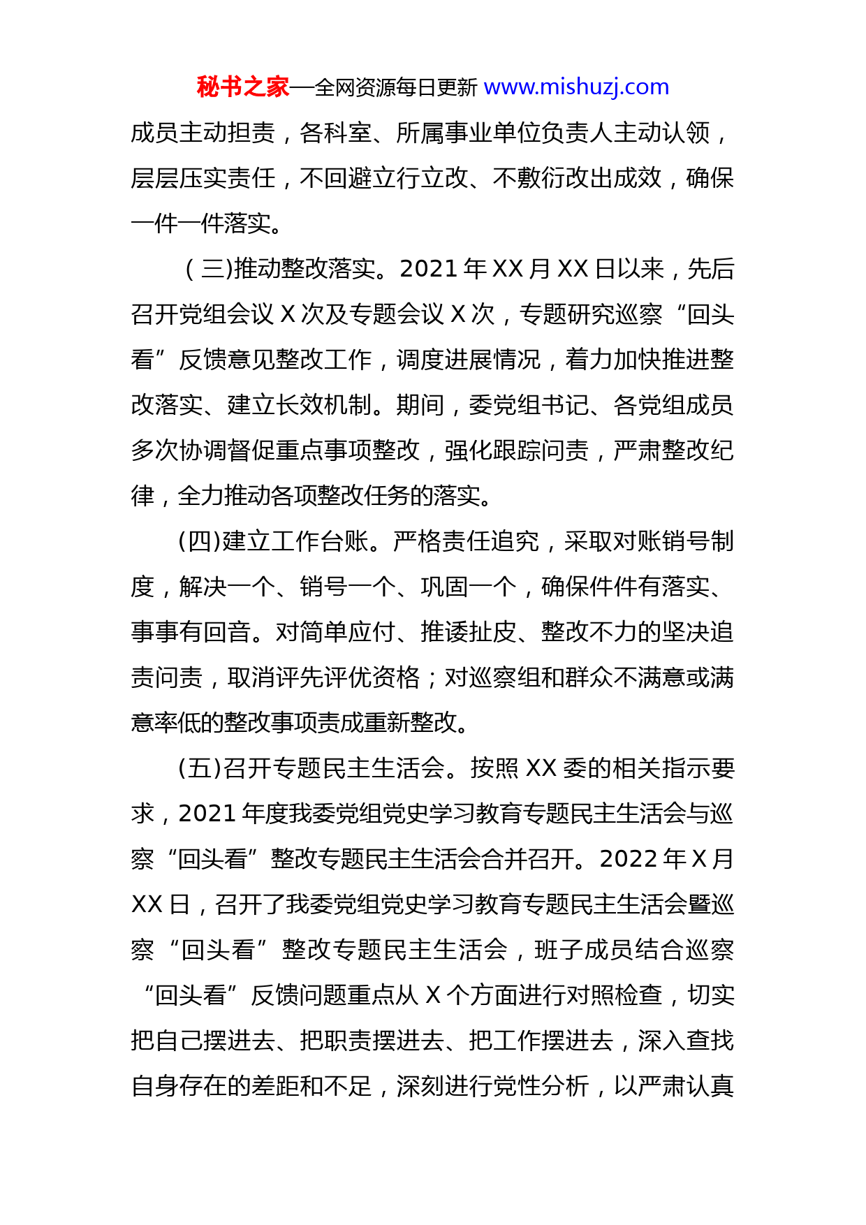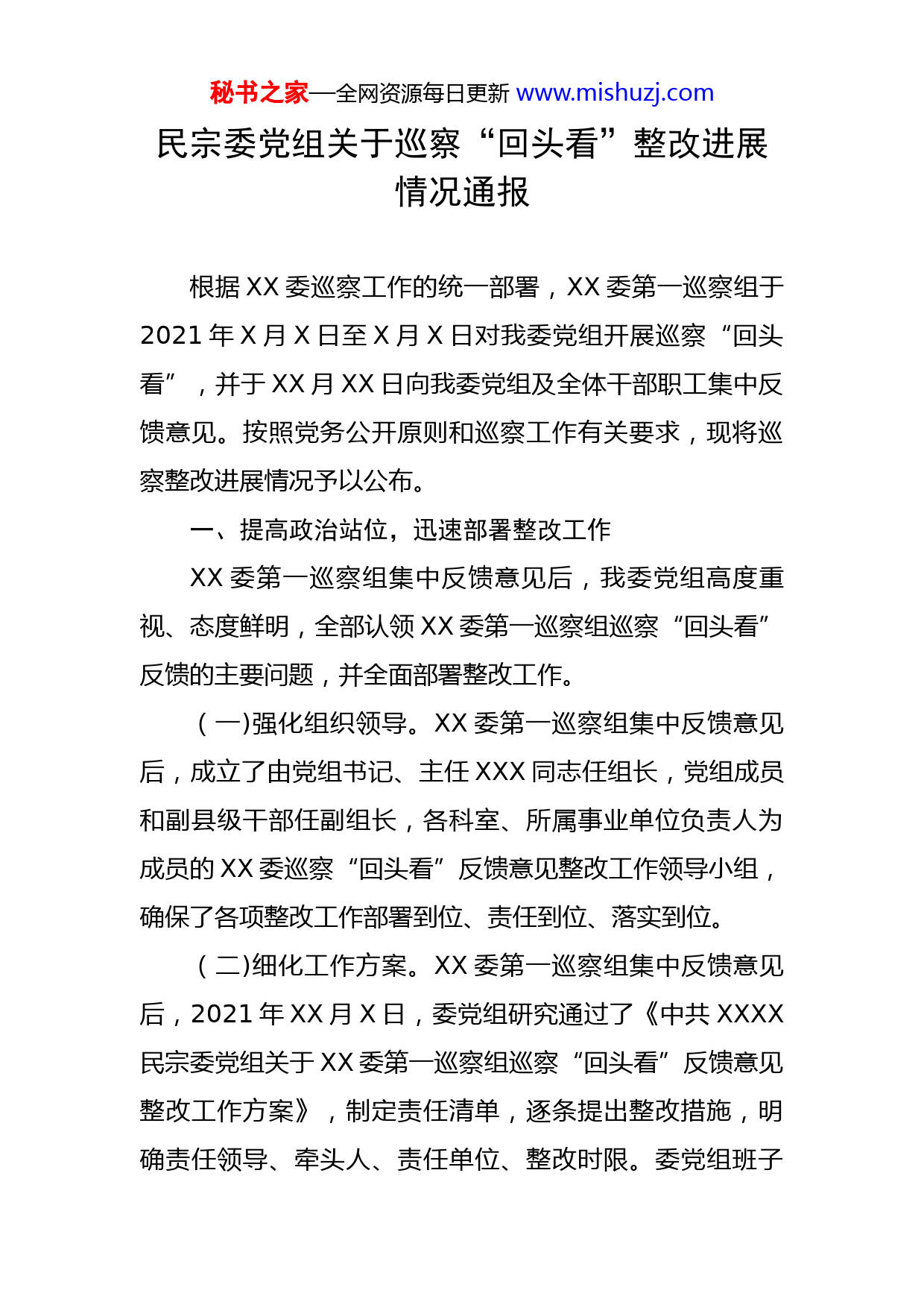 秘书之家—全网资源每日更新www.mishuzj.com民宗委党组关于巡察“回头看”整改进展情况通报根据XX委巡察工作的统一部署,XX委第一巡察组于2021年X月X日至X月X日对我委党组开展巡察“回头看”,并于XX月XX日向我委党组及全体干部职工集中反馈意见。按照党务公开原则和巡察工作有关要求,现将巡察整改进展情况予以公布。一、提高政治站位,迅速部署整改工作XX委第一巡察组集中反馈意见后,我委党组高度重视、态度鲜明,全部认领XX委第一巡察组巡察“回头看”反馈的主要问题,并全面部署整改工作。(一)强化组织领导。XX委第一巡察组集中反馈意见后,成立了由党组书记、主任XXX同志任组长,党组成员和副县级干部任副组长,各科室、所属事业单位负责人为成员的XX委巡察“回头看”反馈意见整改工作领导小组,确保了各项整改工作部署到位、责任到位、落实到位。(二)细化工作方案。XX委第一巡察组集中反馈意见后,2021年XX月X日,委党组研究通过了《中共XXXX民宗委党组关于XX委第一巡察组巡察“回头看”反馈意见整改工作方案》,制定责任清单,逐条提出整改措施,明确责任领导、牵头人、责任单位、整改时限。委党组班子秘书之家—全网资源每日更新www.mishuzj.com成员主动担责,各科室、所属事业单位负责人主动认领,层层压实责任,不回避立行立改、不敷衍改出成效,确保一件一件落实。(三)推动整改落实。2021年XX月XX日以来,先后召开党组会议X次及专题会议X次,专题研究巡察“回头看”反馈意见整改工作,调度进展情况,着力加快推进整改落实、建立长效机制。期间,委党组书记、各党组成员多次协调督促重点事项整改,强化跟踪问责,严肃整改纪律,全力推动各项整改任务的落实。(四)建立工作台账。严格责任追究,采取对账销号制度,解决一个、销号一个、巩固一个,确保件件有落实、事事有回音。对简单应付、推诿扯皮、整改不力的坚决追责问责,取消评先评优资格;对巡察组和群众不满意或满意率低的整改事项责成重新整改。(五)召开专题民主生活会。按照XX委的相关指示要求,2021年度我委党组党史学习教育专题民主生活会与巡察“回头看”整改专题民主生活会合并召开。2022年X月XX日,召开了我委党组党史学习教育专题民主生活会暨巡察“回头看”整改专题民主生活会,班子成员结合巡察“回头看”反馈问题重点从X个方面进行对照检查,切实把自己摆进去、把职责摆进去、把工作摆进去,深入查找自身存在的差距和不足,深刻进行党性分析,以严肃认真秘书之家—全网资源每日更新www.mishuzj.com态度开展批评和自我批评,并明确整改方向。二、坚持问题导向,切实抓好整改落实XX委第一巡察组集中反馈意见后,我委党组对反馈问题进行了认真分析,查找存在问题的原因,紧盯问题不放松,积极推动建章立制,不折不扣完成巡察“回头看”整改工作。目前,针对巡察反馈意见指出的XX个问题XX个整改事项,提出了整改措施XX条,制定和修订完善《中共XXXX民宗委党组“三重一大”会议制度》《XXXX民宗委网站信息发布“三审三校”制度(试行)》等X个制度,提醒谈话XX人次,批评教育X人次,现已全部完成整改。(一)深学笃用习近平新时代中国特色社会主义思想有差距,贯彻落实中央、省委重大决策部署不到位,职能职责发挥不充分,对民族宗教工作指导督导不力。1.学懂弄通做实习近平新时代中国特色社会主义思想有差距、贯彻落实中央文件精神不到位。(1)存在问题:对习近平总书记关于本系统工作的重要讲话精神结合实际贯彻落实不具体,研究不深。党组20XX年第X次(扩大)会议学习习近平总书记关于宗教工作的重要论述,会议记录只有标题,没有任何其他内容,没有结合实际研究提出贯彻落实意见。整改情况:一是2021年XX月XX日,根据《XXXX贯彻落实习近平总书记重要指示批示精神闭环管理工作实秘书之家—全网资源每日更新www.mishuzj.com施细则》,制定了《XXXX民宗委贯彻落实习近平总书记重要指示批示精神闭环管理工作方案》,对习近平总书记关于本系统工作的重要讲话精神实行台账式管理。二是针对上述问题,20XX年X月,XX委巡察办到我委指导督查时提出此问题后,已作整改,党组20XX年第XX次会议之后的会议记录和纪要均有贯彻落实意见。三是2022年X月X日,我委分管领导组织会议记录人员进行业务培训,做到如实记录,不漏记、错记。整改时限:已完成并长期坚持。(2)存在问题:贯彻落实中央文件精神不到位。州民宗委2021年X月XX日召开党组会议传达学习《中共中央关于加强对“一把手”和领导班子监督的意见》,没有按照文件第二十五条要求结合本部门、本系统的情况制定具体贯彻落实措施,贯彻落实中央文件精神停留在读文件层面。整改情况:一是20XX年,我委作为全面从严治党“森林管护区”创建试点单位,于20XX年X月制定印发《XXXX民宗委深化全面从严治党“森林管护区”示范创建工作实施方案》,不折不扣把中央、省、州决策部署落实到位。二是在《实施方案》中,明确了党组及其书记和领导班子其他成员从严治党工作责任清单,切实落实党组主体责任、党组书记“第一责任人”、领导班子其他成员秘书之家—全网资源每日更新www.mishuzj.com“一岗双责”。三是《中共中央关于加强对“一把手”和领导班子监督的意见》下发后,委党组召开2021年第XX次党组会议,再次对