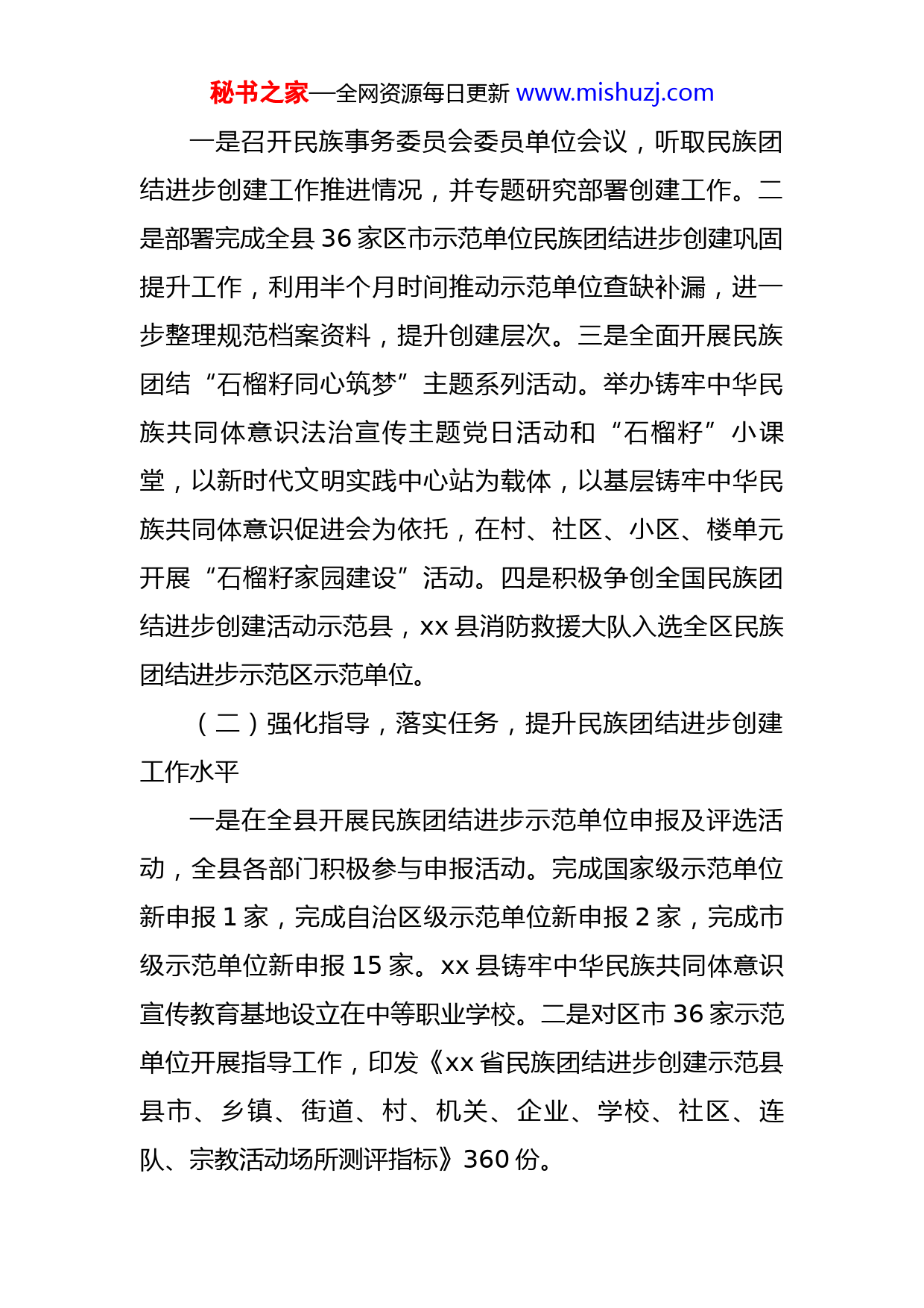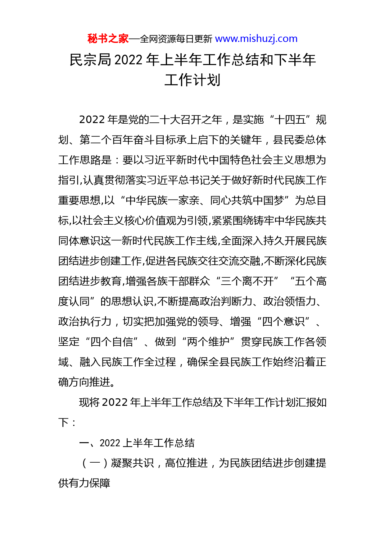 秘书之家—全网资源每日更新www.mishuzj.com民宗局2022年上半年工作总结和下半年工作计划2022年是党的二十大召开之年,是实施“十四五”规划、第二个百年奋斗目标承上启下的关键年,县民委总体工作思路是:要以习近平新时代中国特色社会主义思想为指引,认真贯彻落实习近平总书记关于做好新时代民族工作重要思想,以“中华民族一家亲、同心共筑中国梦”为总目标,以社会主义核心价值观为引领,紧紧围绕铸牢中华民族共同体意识这一新时代民族工作主线,全面深入持久开展民族团结进步创建工作,促进各民族交往交流交融,不断深化民族团结进步教育,增强各族干部群众“三个离不开”“五个高度认同”的思想认识,不断提高政治判断力、政治领悟力、政治执行力,切实把加强党的领导、增强“四个意识”、坚定“四个自信”、做到“两个维护”贯穿民族工作各领域、融入民族工作全过程,确保全县民族工作始终沿着正确方向推进。现将2022年上半年工作总结及下半年工作计划汇报如下:一、2022上半年工作总结(一)凝聚共识,高位推进,为民族团结进步创建提供有力保障秘书之家—全网资源每日更新www.mishuzj.com一是召开民族事务委员会委员单位会议,听取民族团结进步创建工作推进情况,并专题研究部署创建工作。二是部署完成全县36家区市示范单位民族团结进步创建巩固提升工作,利用半个月时间推动示范单位查缺补漏,进一步整理规范档案资料,提升创建层次。三是全面开展民族团结“石榴籽同心筑梦”主题系列活动。举办铸牢中华民族共同体意识法治宣传主题党日活动和“石榴籽”小课堂,以新时代文明实践中心站为载体,以基层铸牢中华民族共同体意识促进会为依托,在村、社区、小区、楼单元开展“石榴籽家园建设”活动。四是积极争创全国民族团结进步创建活动示范县,xx县消防救援大队入选全区民族团结进步示范区示范单位。(二)强化指导,落实任务,提升民族团结进步创建工作水平一是在全县开展民族团结进步示范单位申报及评选活动,全县各部门积极参与申报活动。完成国家级示范单位新申报1家,完成自治区级示范单位新申报2家,完成市级示范单位新申报15家。xx县铸牢中华民族共同体意识宣传教育基地设立在中等职业学校。二是对区市36家示范单位开展指导工作,印发《xx省民族团结进步创建示范县县市、乡镇、街道、村、机关、企业、学校、社区、连队、宗教活动场所测评指标》360份。秘书之家—全网资源每日更新www.mishuzj.com(三)精心准备、强化举措,进一步做好软件整理工作一是加强打造南线北线中线三条路线观摩,已确定观摩点24家。其中,机关4个、企业3个、学校6个、社区3个、连队2个、乡镇4个、宗教场所1个、网络1个这三条观摩路线做到了类型完备、覆盖面广、特色突出。二是按照《全国民族团结进步示范县测评指标标准》明确责任分工、强化协同联动,按照测评标准分解任务情况。对档案材料进行充实完善,力争申报工作不落项、不丢分。二、2022下半年工作计划(一)全面落实“一项计划四个活动”一项计划:实施旅游促进各民族交往交流交融计划。打造各个旅游景点、景区,创建铸牢中华民族共同体意识示范县,着力把旅游作为重要载体、主要窗口,展示民族团结和各民族一家亲;打造一批体现中华民族共同体意识的旅游产品和精品线路,发展一批当地群众能够广泛参与,游客能够深度融入体验,各类市场主体能够深化合作的新型旅游发展业态。四个活动:1.在学校开展国家通用语言助学助教活动,通过搭建“五个助教平台”(培训、交流、进修、测试、展示平台),开展国家通用语言助学“五个一活动”(营造一个环境、创新一个载体、成立一个社团(小组)、开秘书之家—全网资源每日更新www.mishuzj.com展一次研学、拓展一个阵地),有形、有感、有效铸牢中华民族共同体意识,不断巩固中华民族共同体思想文化基础;2.在全社会开展以“学传统美德、演中华文艺、展中华技艺、读中华经典、讲红色故事”为主要内容的中华文化大家学活动;3.在城镇社区开展各族群众互帮互助活动,引导社区各族群众邻里和谐、团结友善,广泛开展“最美石榴籽家庭”评选活动,推动形成互嵌式的社区治理环境;4.在村村广泛开展“忆光辉历史、悟思想理论、讲脱贫故事、学身边典型、晒幸福生活、懂政策法规、兴乡村产业”为主要内容的听党话感党恩跟党走活动。(二)全面助力“铸牢中华民族共同体意识”活动1.调整基层铸牢中华民族共同体意识促进会组织机构,完善职责,切实发挥作用。2.进一步发挥基层党组织和基层铸牢中华民族共同体意识促进会作用,重点是在村村、社区开展“石榴籽同心筑梦”系列主题活动。村村和社区要将铸牢中华民族共同体意识纳入村组织重要工作内容,全面融入“三会一课”主题党日等组织政治生活,组织党员开展民族团结主题党日活动。3.村村和社区要根据评选工作要求,开展“最美石榴籽秘书之家—全网资源每日更新www.mishuzj.com家园”评选活动。(三)培树新时代民族团结进步先进典型以铸牢中华民族共同体意识为主线,以“中华民族一家亲,同心共筑中国梦”为总目标,加强典型示范引领,在创建工作特点、亮点挖倔上下功夫,常态化推进“八进”的示范引领,积极争创全国民族团结进步创建示范县。(
