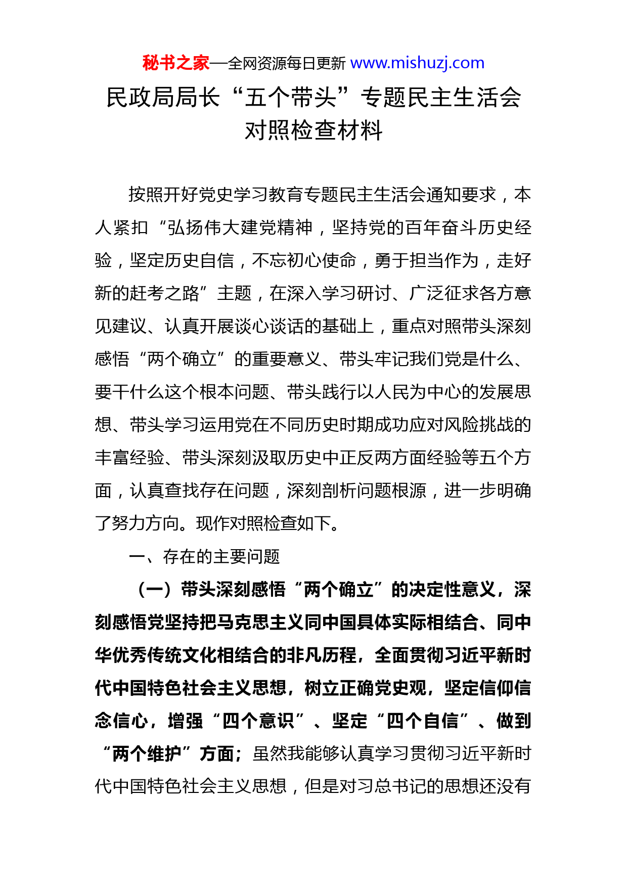 秘书之家—全网资源每日更新www.mishuzj.com民政局局长“五个带头”专题民主生活会对照检查材料按照开好党史学习教育专题民主生活会通知要求,本人紧扣“弘扬伟大建党精神,坚持党的百年奋斗历史经验,坚定历史自信,不忘初心使命,勇于担当作为,走好新的赶考之路”主题,在深入学习研讨、广泛征求各方意见建议、认真开展谈心谈话的基础上,重点对照带头深刻感悟“两个确立”的重要意义、带头牢记我们党是什么、要干什么这个根本问题、带头践行以人民为中心的发展思想、带头学习运用党在不同历史时期成功应对风险挑战的丰富经验、带头深刻汲取历史中正反两方面经验等五个方面,认真查找存在问题,深刻剖析问题根源,进一步明确了努力方向。现作对照检查如下。一、存在的主要问题(一)带头深刻感悟“两个确立”的决定性意义,深刻感悟党坚持把马克思主义同中国具体实际相结合、同中华优秀传统文化相结合的非凡历程,全面贯彻习近平新时代中国特色社会主义思想,树立正确党史观,坚定信仰信念信心,增强“四个意识”、坚定“四个自信”、做到“两个维护”方面;虽然我能够认真学习贯彻习近平新时代中国特色社会主义思想,但是对习总书记的思想还没有秘书之家—全网资源每日更新www.mishuzj.com完全做到融会贯通、系统掌握,在学习基本观点、基本理论上比较重视,但把整个理论系统联系起来掌握还不够,用习近平新时代中国特色社会主义思想指导全区民政发展问题,思考的不多、研究的不够,没能始终站在民政局中心工作的高度上看待、谋划和推动工作。比如,没有将民政事业高质量发展同学习贯彻习近平新时代中国特色社会主义思想以及十九届五、六中中全会精神紧密结合起来。对新时代新形势下民政领域的机遇和挑战,还理解的不够深入、系统、全面,没有对照新形势新发展新要求,破解制约我局各项工作的问题短板。又比如,对民政领域的思想理论关注多,对其它领域主动学习不够,有时处理工作和学习的矛盾不够好,在工作任务重的情况下,还不能在方方面面上都抓好学习武装。学用结合还不够紧密。存在就理论学理论、不能及时融会贯通新知识的问题,把主要精力放在了落实上级任务、完成年度目标、推进重大工作中,没有真正将学习成果转化为谋划工作的科学思路上以及领导工作的扎实本领和落实工作的有力举措上。结合民政工作实际就高质量发展工作上存在的困难和问题及相应措施不够。(二)带头牢记我们党是什么、要干什么这个根本问题,心怀“国之大者”,贯彻新发展理念,履行职责、担当作为,聚焦新冠肺炎疫情防控、保持经济发展、深化改秘书之家—全网资源每日更新www.mishuzj.com革开放、维护社会稳定等正在做的工作,不折不扣把党中央决策部署落实到位方面;一是作为党组书记对紧扣民政工作实际抓好党建工作的思考研究还不深入,投入精力少,措施办法少,局机关支部党建工作与业务兼容性不强、融合度不高。比如,今年的党支部建设标准化实施方案结合自身实际的内容少,党组、党支部学习计划与民政工作要点结合不紧密。又如,作为支部书记给局机关支部上党课,在党课内容上联系民政工作的实际还是不够多,不够丰富,把过组织生活仅仅当作一种任务,只求数量不求质量,对党员教育管理作用收效甚微,使许多党员没有得到严格的党内生活锻炼。二是贯彻执行上级决策部署还存在不深不细。对上级作出的决策事项,尽管能够坚决服从、坚决执行,但在抓落实的力度就存在打折扣的问题。比如,在新形势下,民生民政领域工作已由传统向线上线下相结合转变。没有主动适应互联网时代,做好相关惠民政策的落实及宣传工作,真正做到让信息多跑路,群众少跑腿,推进民政便民服务“马上办、网上办、就近办、一次办”。(三)带头践行以人民为中心的发展思想,尊重群众意愿,为群众办实事解难题,有效保障改善民生,增强人民群众获得感幸福感安全感,确保党永远保持同人民群众的血肉联系方面;一是对当前民生民政领域工作的特点及秘书之家—全网资源每日更新www.mishuzj.com创新工作上把握的不够准确。比如,随着经济社会发展,群众需求呈现多样化、个性化、专业化、便捷化等新特点,除托底公共服务外,社会期待在社会养老、社区服务等方面有多层次的选择空间;除保基本兜底线外,需要更多的金融保险、慈善信托等服务产品;在社会救助方面除提供经济保障、现金救助外,需要更多的精神慰藉、康复照料、社会融入、能力提升等专业服务。又比如在如何利用新媒体开展民政工作缺乏招法,如何采取融媒体手段开展民政政策的宣传工作研究不够,局限于完成工作任务,在更高标准上部署安排局中心工作,做的不够。二是在破解突出矛盾和问题,防范化解民政领域风险挑战上存在差距。在新形势背景下,民政领域的工作面临越来越多的新情况新问题新考验,尽管始终以昂扬的精神状态去化解,但有时也存在畏难情绪,比如,当前群众利益诉求增强,经济纠纷增多,群体性矛盾增加,对抗性因素增长,处理难度增大,主要表现为期望高,事难做,对民政部门期望值越来越高:事要做,钱不够,经济发展下行压力加大,民政事业发展资金增速放缓,有限的资金难以满足发展需求;诉求多,难满意,尽管服务水平越来越高,但仍有个别群众认
