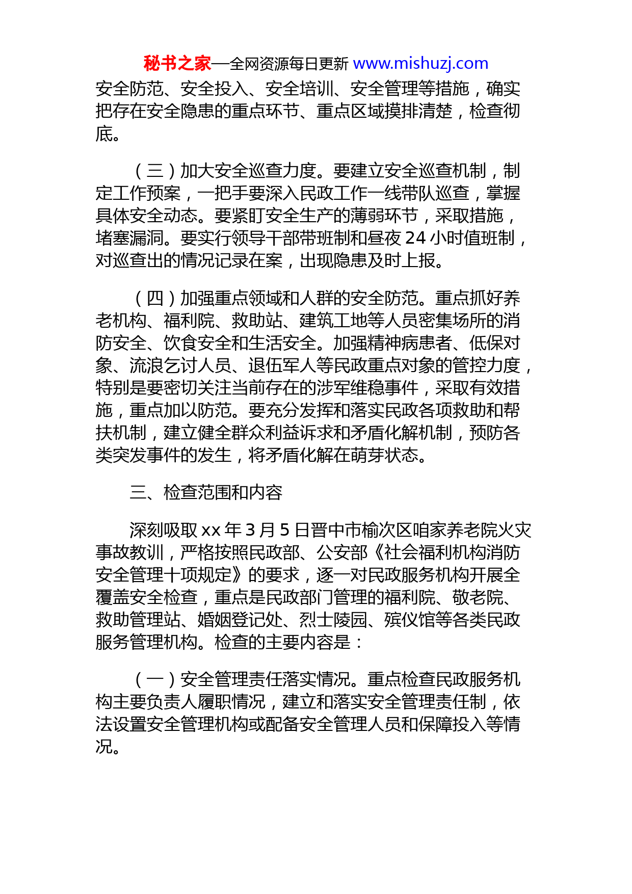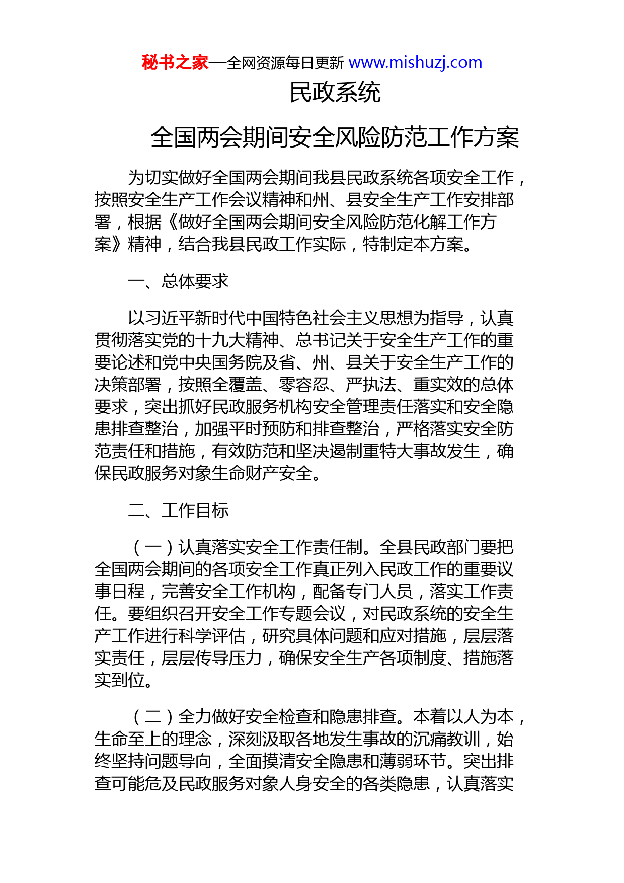 秘书之家—全网资源每日更新www.mishuzj.com民政系统全国两会期间安全风险防范工作方案为切实做好全国两会期间我县民政系统各项安全工作,按照安全生产工作会议精神和州、县安全生产工作安排部署,根据《做好全国两会期间安全风险防范化解工作方案》精神,结合我县民政工作实际,特制定本方案。一、总体要求以习近平新时代中国特色社会主义思想为指导,认真贯彻落实党的十九大精神、总书记关于安全生产工作的重要论述和党中央国务院及省、州、县关于安全生产工作的决策部署,按照全覆盖、零容忍、严执法、重实效的总体要求,突出抓好民政服务机构安全管理责任落实和安全隐患排查整治,加强平时预防和排查整治,严格落实安全防范责任和措施,有效防范和坚决遏制重特大事故发生,确保民政服务对象生命财产安全。二、工作目标(一)认真落实安全工作责任制。全县民政部门要把全国两会期间的各项安全工作真正列入民政工作的重要议事日程,完善安全工作机构,配备专门人员,落实工作责任。要组织召开安全工作专题会议,对民政系统的安全生产工作进行科学评估,研究具体问题和应对措施,层层落实责任,层层传导压力,确保安全生产各项制度、措施落实到位。(二)全力做好安全检查和隐患排查。本着以人为本,生命至上的理念,深刻汲取各地发生事故的沉痛教训,始终坚持问题导向,全面摸清安全隐患和薄弱环节。突出排查可能危及民政服务对象人身安全的各类隐患,认真落实秘书之家—全网资源每日更新www.mishuzj.com安全防范、安全投入、安全培训、安全管理等措施,确实把存在安全隐患的重点环节、重点区域摸排清楚,检查彻底。(三)加大安全巡查力度。要建立安全巡查机制,制定工作预案,一把手要深入民政工作一线带队巡查,掌握具体安全动态。要紧盯安全生产的薄弱环节,采取措施,堵塞漏洞。要实行领导干部带班制和昼夜24小时值班制,对巡查出的情况记录在案,出现隐患及时上报。(四)加强重点领域和人群的安全防范。重点抓好养老机构、福利院、救助站、建筑工地等人员密集场所的消防安全、饮食安全和生活安全。加强精神病患者、低保对象、流浪乞讨人员、退伍军人等民政重点对象的管控力度,特别是要密切关注当前存在的涉军维稳事件,采取有效措施,重点加以防范。要充分发挥和落实民政各项救助和帮扶机制,建立健全群众利益诉求和矛盾化解机制,预防各类突发事件的发生,将矛盾化解在萌芽状态。三、检查范围和内容深刻吸取xx年3月5日晋中市榆次区咱家养老院火灾事故教训,严格按照民政部、公安部《社会福利机构消防安全管理十项规定》的要求,逐一对民政服务机构开展全覆盖安全检查,重点是民政部门管理的福利院、敬老院、救助管理站、婚姻登记处、烈士陵园、殡仪馆等各类民政服务管理机构。检查的主要内容是:(一)安全管理责任落实情况。重点检查民政服务机构主要负责人履职情况,建立和落实安全管理责任制,依法设置安全管理机构或配备安全管理人员和保障投入等情况。秘书之家—全网资源每日更新www.mishuzj.com(二)安全管理制度建立和执行情况。重点检查安全管理标准化建设,实施安全管理、操作技能、设备设施和作业现场制度化、标准化、规范化情况;从业人员安全培训和持证上岗制度落实情况。(三)安全风险管控情况。重点检查安全重要设施、装备完好状况和日常管理维护情况;开展安全风险辨识、评估、分级和公告,对存在较大危险因素的场所和重大危险登记建档、制定落实管控措施情况。(四)隐患排查治理情况。重点检查建立事故隐患排查治理制度,开展隐患自查自改自报,实行整改闭环管理情况;近年3月5日起至xx年3月5日至3月1日)。要成立组织机构,召开专门会议,制定实施方案,广泛宣传动员,全面做出工作部署。(二)组织实施阶段(贯穿集中检查全过程)。按照确定的工作目标,明确工作责任,细化工作措施,开展安全大检查,强化隐患排查整治,不断夯实安全工作基础。按照大检查部署要求,组织力量对照检查内容深入开展自查自改。各民政服务机构全面排查安全风险点和隐患,制定风险防控措施,建立安全隐患清单和整改清单,落实安全隐患整改责任、措施、资金、时限、预案,彻底整改隐患。隐患清单和整改落实情况要在各类服务机构公布。(三)总结考评阶段(xx年3月5日前)。对两会期间的安全工作情况进行汇总分析、自查自评,总结经验做法,并研究建立安全工作长效机制。(四)巩固提高和开展总结(贯穿大检查全过程)。要采取突出检查、明查暗访、随机抽查、回头检查等多种方式,深入民政服务机构进行重点检查。要建立台账销号制度,推动加强民政服务机构安全风险防范。同时,对排查发现的安全隐患和违法行为整治情况进行全面总结。秘书之家—全网资源每日更新www.mishuzj.com五、工作要求(一)提高认识,加强领导。要高度负责,加强组织领导,结合开展的养老院服务质量建设专项行动制定本次大检查实施方案,保障经费投入,确保各项措施落实落细。要充分认识两会期间安全防控工作的重要意义,加强组织领导,做好本单位的安全防控工作。各单位一把手作为本部门安全工作的第一责任人要亲自部署、亲自督办,要身体力行深入安全工作一线检查指导,推动工作落实。(二)狠抓落实,压实责