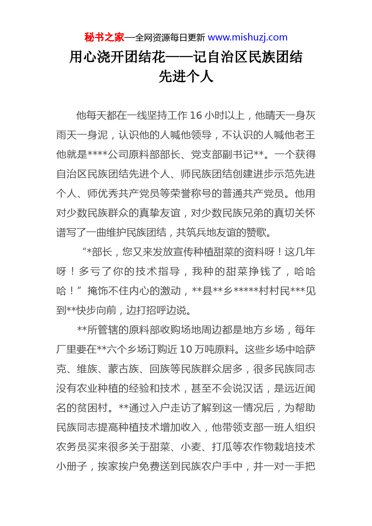 秘书之家—全网资源每日更新www.mishuzj.com用心浇开团结花——记自治区民族团结先进个人他每天都在一线坚持工作16小时以上,他晴天一身灰雨天一身泥,认识他的人喊他领导,不认识的人喊他老王他就是公司原料部部长、党支部副书记。一个获得自治区民族团结先进个人、师民族团结创建进步示范先进个人、师优秀共产党员等荣誉称号的普通共产党员。他用对少数民族群众的真挚友谊,对少数民族兄弟的真切关怀谱写了一曲维护民族团结,共筑兵地友谊的赞歌。“部长,您又来发放宣传种植甜菜的资料呀!这几年呀!多亏了你的技术指导,我种的甜菜挣钱了,哈哈哈!”掩饰不住内心的激动,县乡村村民见到快步向前,边打招呼边说。所管辖的原料部收购场地周边都是地方乡场,每年厂里要在六个乡场订购近10万吨原料。这些乡场中哈萨克、维族、蒙古族、回族等民族群众居多,很多民族同志没有农业种植的经验和技术,甚至不会说汉话,是远近闻名的贫困村。通过入户走访了解到这一情况后,为帮助民族同志提高种植技术增加收入,他带领支部一班人组织农务员买来很多关于甜菜、小麦、打瓜等农作物栽培技术小册子,挨家挨户免费送到民族农户手中,并一对一手把秘书之家—全网资源每日更新www.mishuzj.com手地进行技术指导,前后共发放资料300余册,使村30户民族贫困户靠种植脱贫致富。“只有俯下身子踏踏实实的为他们办好事、办实事,他们才会真正的接受你,相信你,把你当朋友。”对笔者说。现如今,每到春季,民族同志都会来找他,询问部长今年我的土地种植什么呀?什么时候种?种多少合适啊他已然成为了种植户的主心骨。为方便村民们交售甜菜,几年来,每到冬季大雪封路时,就组织车辆和人员免费为村清扫道路积雪,累计达20余次。6月又组织义务修砂石路两公里,极大解决村民出行难问题。7月当他听说访惠聚工作队在村上修建了一个文化活动室时,十分高兴,当即决定捐赠彩色电视机一台,受到广大村民和访惠聚工作队的赞扬,并收到锦旗一面。原料部有一名维族员工叫,她常年有病,有两个孩子,其中一个还有残疾,老公又没有工作,全家生活的重担全压在她一个人身上。主动要求让做自己的贫困联系户。每逢春节、古尔邦节、肉孜节等重大节日,他都会带领支部一班人,将清油大米水果送到她家进行慰问累计送去慰问金2000余元,大米200公斤,清油80公斤。当的第二个孩子出生时,他组织女工委为其捐款捐物700余元。特别是她残疾孩子去乌市做手术,带着原料秘书之家—全网资源每日更新www.mishuzj.com部全体员工的祝福和2000余元捐款(他本人带头捐出500元)来到家,手握捐款泣不成声,只会一遍一遍地说“谢谢”。“我一定要把当做自己的亲人,不能让困难吓倒她,不能让了她感到绝望,要让她感受到大家庭的温暖,感受到亲人的关心和爱护。”说。从此,不仅在生活上更加关心她,在工作中也对她进行了适当的调整,让能分出时间来照顾家照顾孩子。分给的工作是清扫路面和积雪。由于家离单位较远,每到冬季下大雪,都会提前来到单位,帮忙清扫道路积雪,当赶到单位时,路面已清扫过半。201年2月的一天,原料部蒙古族季节工在上班路上摔倒造成右小腿开放性骨折。得知此事后,迅速赶到现场联系车辆把她送往九师医院,经检查需要立即手术需交10000元住院押金。而的老公去世,家里的两个孩子在内地上大学,孩子的学费都是靠她打工筹措,经济很困难实在拿不出来,又找不到人借钱,可手术的时间是不等人的,十分着急,急忙到亲朋好友家东拼西凑地筹集了10000元住院押金,顺利的进行了手术。第二天一早他又和支部一班人带着营养品到医院慰问她。紧紧地握着的手,感动的热泪盈眶,哽咽的说不出话来。只有用心才能促团结,只有真心才能筑友谊,是这秘书之家—全网资源每日更新www.mishuzj.com样说的,也是这样做的。多年来,作为一名基层干部,作为一名普通的共产党员,他就是这样用自己的实际行动,为企业经济发展和民族团结添砖加瓦;用长期细致地工作使各民族同志感受到兵地团结大家庭的温暖;用真挚热情浇开了民族团结和谐的文明单位;用自己对党的忠诚、对事业的热爱铸就民族团结之情,赢得了各族职工群众对党和政府的信赖,谱写了民族团结大家庭的和谐之歌。