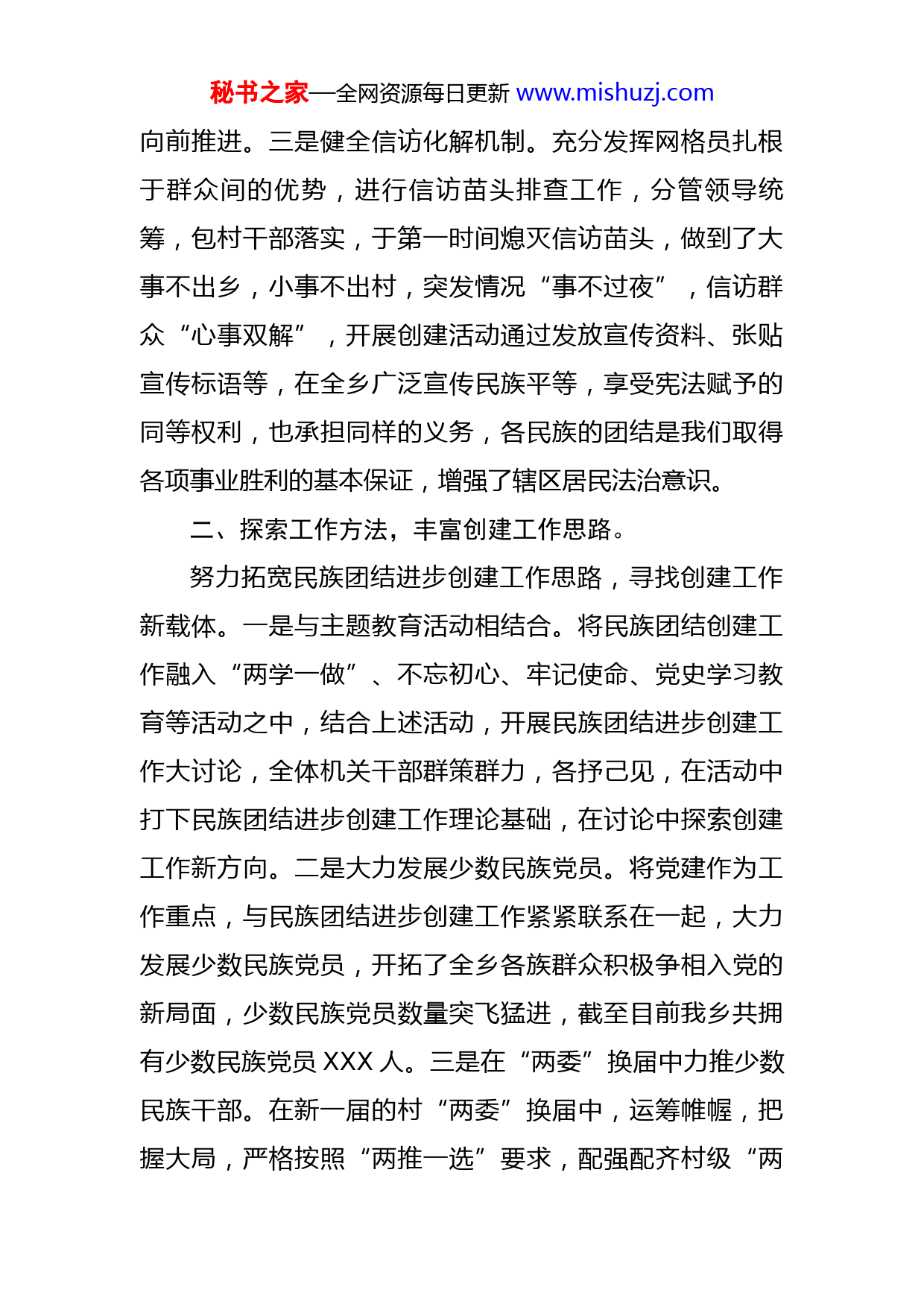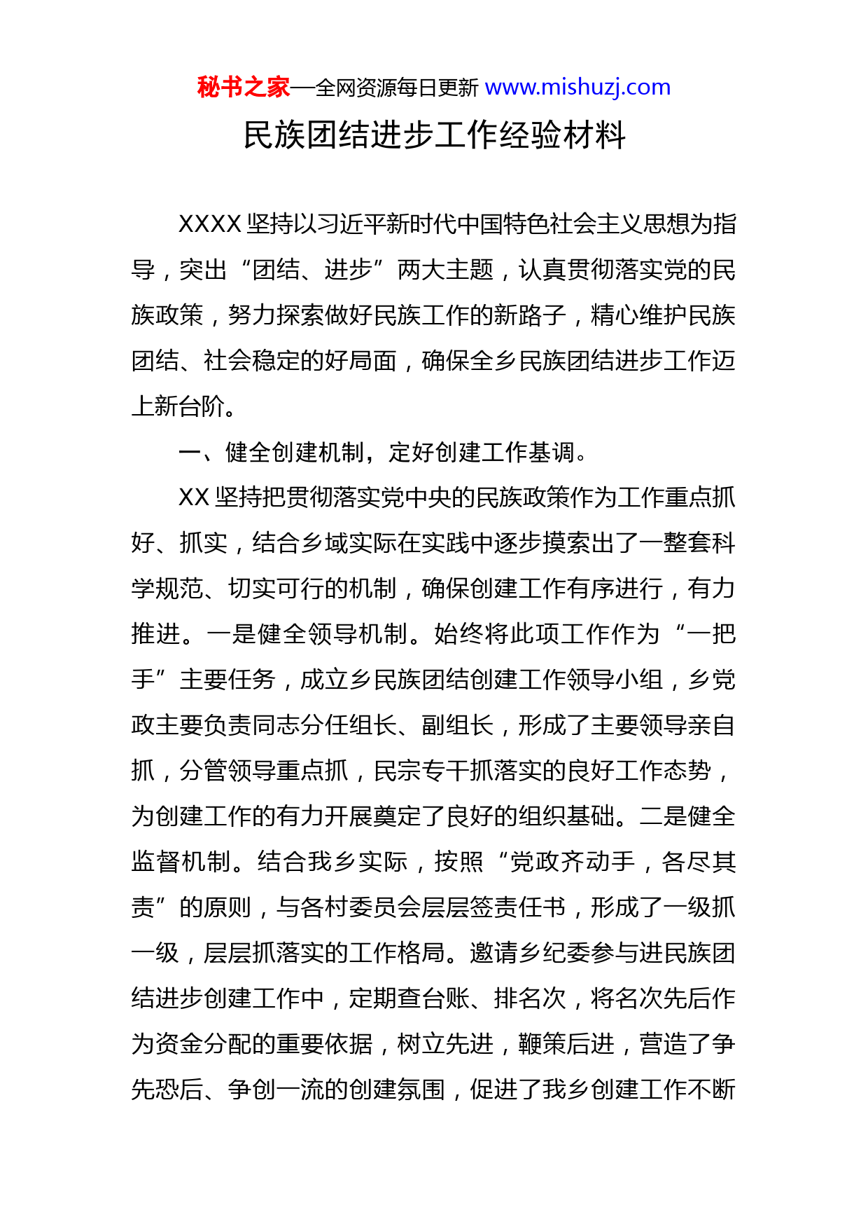 秘书之家—全网资源每日更新www.mishuzj.com民族团结进步工作经验材料XXXX坚持以习近平新时代中国特色社会主义思想为指导,突出“团结、进步”两大主题,认真贯彻落实党的民族政策,努力探索做好民族工作的新路子,精心维护民族团结、社会稳定的好局面,确保全乡民族团结进步工作迈上新台阶。一、健全创建机制,定好创建工作基调。XX坚持把贯彻落实党中央的民族政策作为工作重点抓好、抓实,结合乡域实际在实践中逐步摸索出了一整套科学规范、切实可行的机制,确保创建工作有序进行,有力推进。一是健全领导机制。始终将此项工作作为“一把手”主要任务,成立乡民族团结创建工作领导小组,乡党政主要负责同志分任组长、副组长,形成了主要领导亲自抓,分管领导重点抓,民宗专干抓落实的良好工作态势,为创建工作的有力开展奠定了良好的组织基础。二是健全监督机制。结合我乡实际,按照“党政齐动手,各尽其责”的原则,与各村委员会层层签责任书,形成了一级抓一级,层层抓落实的工作格局。邀请乡纪委参与进民族团结进步创建工作中,定期查台账、排名次,将名次先后作为资金分配的重要依据,树立先进,鞭策后进,营造了争先恐后、争创一流的创建氛围,促进了我乡创建工作不断秘书之家—全网资源每日更新www.mishuzj.com向前推进。三是健全信访化解机制。充分发挥网格员扎根于群众间的优势,进行信访苗头排查工作,分管领导统筹,包村干部落实,于第一时间熄灭信访苗头,做到了大事不出乡,小事不出村,突发情况“事不过夜”,信访群众“心事双解”,开展创建活动通过发放宣传资料、张贴宣传标语等,在全乡广泛宣传民族平等,享受宪法赋予的同等权利,也承担同样的义务,各民族的团结是我们取得各项事业胜利的基本保证,增强了辖区居民法治意识。二、探索工作方法,丰富创建工作思路。努力拓宽民族团结进步创建工作思路,寻找创建工作新载体。一是与主题教育活动相结合。将民族团结创建工作融入“两学一做”、不忘初心、牢记使命、党史学习教育等活动之中,结合上述活动,开展民族团结进步创建工作大讨论,全体机关干部群策群力,各抒己见,在活动中打下民族团结进步创建工作理论基础,在讨论中探索创建工作新方向。二是大力发展少数民族党员。将党建作为工作重点,与民族团结进步创建工作紧紧联系在一起,大力发展少数民族党员,开拓了全乡各族群众积极争相入党的新局面,少数民族党员数量突飞猛进,截至目前我乡共拥有少数民族党员XXX人。三是在“两委”换届中力推少数民族干部。在新一届的村“两委”换届中,运筹帷幄,把握大局,严格按照“两推一选”要求,配强配齐村级“两秘书之家—全网资源每日更新www.mishuzj.com委”班子成员,把党性强、作风好、有能力的少数民族带头人充实到村“两委”班子中来。一大批有知识、有文化、有能力的少数民族党员干部充实到了村支部和村委会,XX位少数民族干部在村集体中发光发热,为壮大基层党组织和村民组织的力量奠定了坚实的基础。四是加快少数民族聚集区基础设施建设。近几年来八卦岭乡以科学发展观为统领,大力加强基础设施建设,改善人居环境,坚持高起点规划、高标准实施、高水平管理,打造功能完善、管理有序、环境优良、承载力强新兴乡镇,交通、教育、农业基础设施均取得长足改善。三、维护民族团结,稳定创建工作局面。坚持“团结、教育、疏导、化解”的方针,讲原则、讲法律、讲政策、讲策略,认真调查研究,及时排除影响民族团结的各种隐患。一是加强矛盾纠纷排查调处工作。突出工作重点,巩固以乡综治委、派出所、执法大队为核心的控制处置防线,同时将关口前移,深入摸排化解各类信访矛盾,多方协调,力争做到信访群众“心事双解”。实行责任追究制度,对因信息掌握不准确,矛盾纠纷排查不到位,调处工作乏力,措施不落实引发重大群体性事件甚至激化升级的,坚决追究有关责任人责任。二是着力改进机关工作作风。要求各机关干部俯下身子去,常驻群众间,主动搜集辖区群众生产生活中遇到的各项难题,想群秘书之家—全网资源每日更新www.mishuzj.com众之所想,急群众之所急,解群众之所困。定期开展业务培训,不断提升党员干部为民办事的能力和服务水平,拉近干群关系。