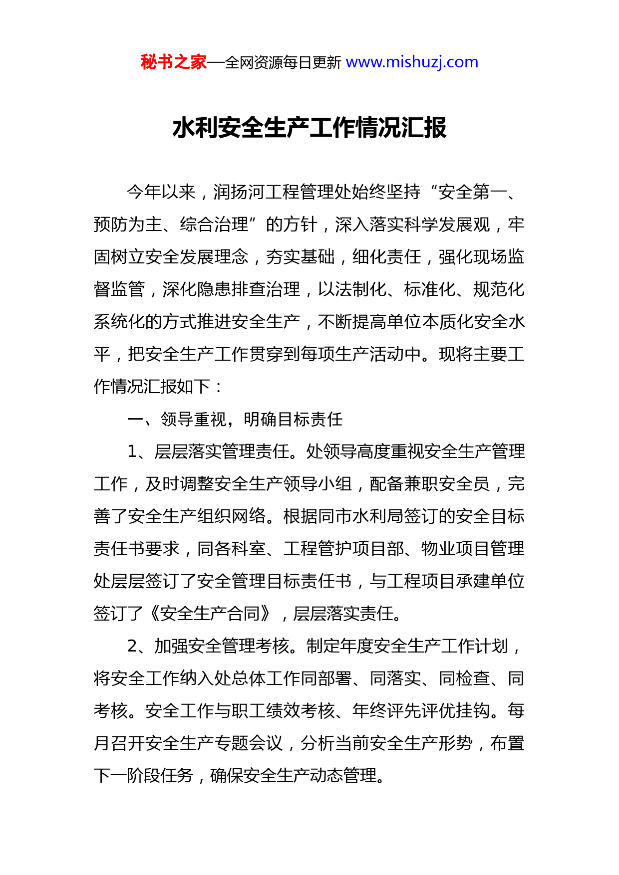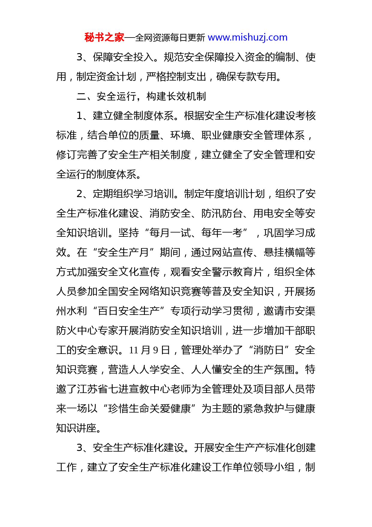 秘书之家—全网资源每日更新www.mishuzj.com水利安全生产工作情况汇报今年以来,润扬河工程管理处始终坚持“安全第一、预防为主、综合治理”的方针,深入落实科学发展观,牢固树立安全发展理念,夯实基础,细化责任,强化现场监督监管,深化隐患排查治理,以法制化、标准化、规范化系统化的方式推进安全生产,不断提高单位本质化安全水平,把安全生产工作贯穿到每项生产活动中。现将主要工作情况汇报如下:一、领导重视,明确目标责任1、层层落实管理责任。处领导高度重视安全生产管理工作,及时调整安全生产领导小组,配备兼职安全员,完善了安全生产组织网络。根据同市水利局签订的安全目标责任书要求,同各科室、工程管护项目部、物业项目管理处层层签订了安全管理目标责任书,与工程项目承建单位签订了《安全生产合同》,层层落实责任。2、加强安全管理考核。制定年度安全生产工作计划,将安全工作纳入处总体工作同部署、同落实、同检查、同考核。安全工作与职工绩效考核、年终评先评优挂钩。每月召开安全生产专题会议,分析当前安全生产形势,布置下一阶段任务,确保安全生产动态管理。秘书之家—全网资源每日更新www.mishuzj.com3、保障安全投入。规范安全保障投入资金的编制、使用,制定资金计划,严格控制支出,确保专款专用。二、安全运行,构建长效机制1、建立健全制度体系。根据安全生产标准化建设考核标准,结合单位的质量、环境、职业健康安全管理体系,修订完善了安全生产相关制度,建立健全了安全管理和安全运行的制度体系。2、定期组织学习培训。制定年度培训计划,组织了安全生产标准化建设、消防安全、防汛防台、用电安全等安全知识培训。坚持“每月一试、每年一考”,巩固学习成效。在“安全生产月”期间,通过网站宣传、悬挂横幅等方式加强安全文化宣传,观看安全警示教育片,组织全体人员参加全国安全网络知识竞赛等普及安全知识,开展扬州水利“百日安全生产”专项行动学习贯彻,邀请市安渠防火中心专家开展消防安全知识培训,进一步增加干部职工的安全意识。11月9日,管理处举办了“消防日”安全知识竞赛,营造人人学安全、人人懂安全的生产氛围。特邀了江苏省七进宣教中心老师为全管理处及项目部人员带来一场以“珍惜生命关爱健康”为主题的紧急救护与健康知识讲座。3、安全生产标准化建设。开展安全生产产标准化创建工作,建立了安全生产标准化建设工作单位领导小组,制秘书之家—全网资源每日更新www.mishuzj.com订详细的实施方案和进度计划,组织开展安全生产标准化达标建设,201x年8月管理处成功创建江苏省水利安全生产标准化二级单位。4、加强汛期值班值守。主汛期时,执行双值班制度,堤防、河道巡查人员、闸站管理人员分组开展工程定期检查和不间断巡查,及时报告险情及隐患。8月份防汛防台期间,尤其今年第18号台风“温比亚”影响,扬州市16日下午遭遇狂风暴雨,至18日8时,全市平均降雨103.7mm,润扬河工程经受了台风严峻的考验,堤防工程整体表现稳定,未出现大的险情。8月19日台风减弱后,我处组织工程技术人员对堤防进行一次特别检查,发现工程附属设施和绿化苗木损失较大,及时组织人员对损坏的工程附属设施隔离网进行了修复、对风刮倒苗木进行了扶正、对乱断树木和断枝进行了清理,确保工程安全完好,发挥效益。三、从严管理,强化风险管控1、定期维护设施设备。每月分组检查消防器材完好有效情况,水闸管护人员定期检查水闸变配电系统、配电柜发电机组、自动化、启闭机、闸门的现状及存在问题,针对发现的问题,及时进行设备设施的维修养护及等级评定以确保设备安全运行。2、开展危险源辨识与风险评价。结合危险源评价方法及评价标准,对一般危险源进行辨识,做出风险评估,制秘书之家—全网资源每日更新www.mishuzj.com定控制措施,以寻求最低事故率、最少的损失以及环境的最低破坏性。3、加强汛期值班值守。主汛期时,处职工根据汛情执行双值班或全员值班制度,堤防、河道巡查人员、闸站管理人员分组开展工程定期检查和不间断巡查,及时报告险情及隐患,确保工程安全发挥效益。四、突出重点,加强隐患排查1、开展日常检查。重点加强机电、电气设备、水闸上下游、河道防护工程、穿堤建筑物、管理区电气使用及车辆安全的日常检查,将检查结果和整改措施形成记录上报处安全员,安全员及时追踪隐患整改落实情况,上报市局安委办及水利安全生产信息系统,全年发现安全隐患14处并全部整改到位。经常组织水政执法巡查,现场处理水事案件,对堤防沿线违章种植、堤防放牧、违章占用、乱倒垃圾、破坏隔离网等10多起违章违法行为进行了及时制止和处理,水政执法取得明显成效。水闸、泵站运行期间增派巡查人员和增加巡查班次,保证工程安全运行。2、开展定期检查。认真组织节假日安全检查工作。管理处专门下发安全检查通知,明确检查责任人、检查内容及要求,在对工程及管理区进行拉网式全面排查基础上,对发现的隐患和薄弱环节,逐一制定应急方案和整改措施及时整改到位。秘书之家—全网资源每日更新www.mishuzj.com3、开展专项检查。开展汛前安全检查,发现河道绿化、水闸工程、穿堤建筑物存在的安全隐患,通过补种草种、调整隔离网