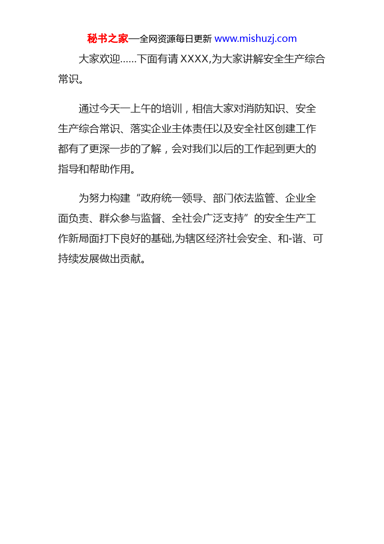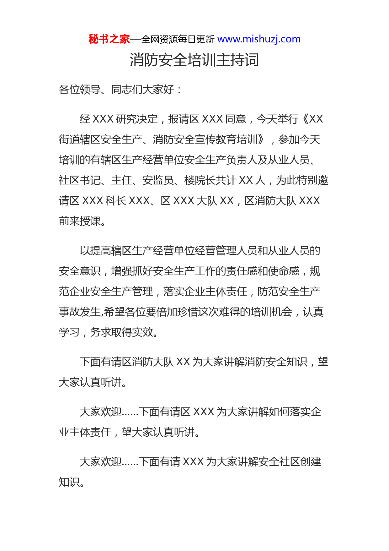 秘书之家—全网资源每日更新www.mishuzj.com消防安全培训主持词各位领导、同志们大家好:经XXX研究决定,报请区XXX同意,今天举行《XX街道辖区安全生产、消防安全宣传教育培训》,参加今天培训的有辖区生产经营单位安全生产负责人及从业人员、社区书记、主任、安监员、楼院长共计XX人,为此特别邀请区XXX科长XXX、区XXX大队XX,区消防大队XXX前来授课。以提高辖区生产经营单位经营管理人员和从业人员的安全意识,增强抓好安全生产工作的责任感和使命感,规范企业安全生产管理,落实企业主体责任,防范安全生产事故发生,希望各位要倍加珍惜这次难得的培训机会,认真学习,务求取得实效。下面有请区消防大队XX为大家讲解消防安全知识,望大家认真听讲。大家欢迎……下面有请区XXX为大家讲解如何落实企业主体责任,望大家认真听讲。大家欢迎……下面有请XXX为大家讲解安全社区创建知识。秘书之家—全网资源每日更新www.mishuzj.com大家欢迎……下面有请XXXX,为大家讲解安全生产综合常识。通过今天一上午的培训,相信大家对消防知识、安全生产综合常识、落实企业主体责任以及安全社区创建工作都有了更深一步的了解,会对我们以后的工作起到更大的指导和帮助作用。为努力构建“政府统一领导、部门依法监管、企业全面负责、群众参与监督、全社会广泛支持”的安全生产工作新局面打下良好的基础,为辖区经济社会安全、和-谐、可持续发展做出贡献。