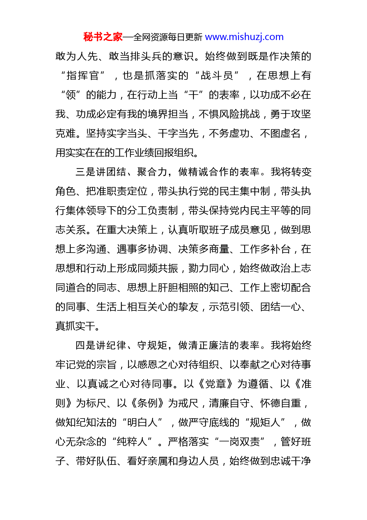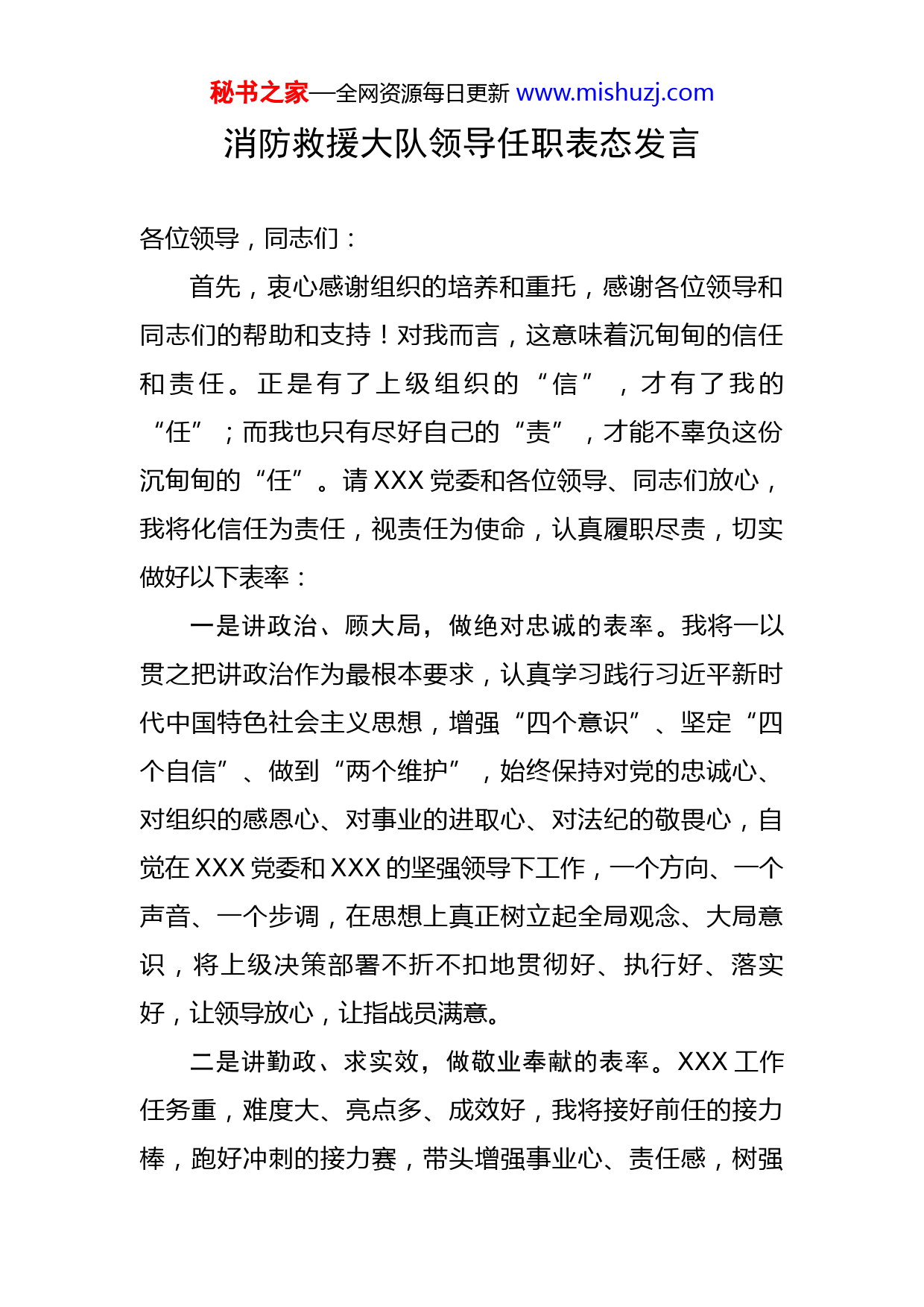 秘书之家—全网资源每日更新www.mishuzj.com消防救援大队领导任职表态发言各位领导,同志们:首先,衷心感谢组织的培养和重托,感谢各位领导和同志们的帮助和支持!对我而言,这意味着沉甸甸的信任和责任。正是有了上级组织的“信”,才有了我的“任”;而我也只有尽好自己的“责”,才能不辜负这份沉甸甸的“任”。请XXX党委和各位领导、同志们放心,我将化信任为责任,视责任为使命,认真履职尽责,切实做好以下表率:一是讲政治、顾大局,做绝对忠诚的表率。我将一以贯之把讲政治作为最根本要求,认真学习践行习近平新时代中国特色社会主义思想,增强“四个意识”、坚定“四个自信”、做到“两个维护”,始终保持对党的忠诚心、对组织的感恩心、对事业的进取心、对法纪的敬畏心,自觉在XXX党委和XXX的坚强领导下工作,一个方向、一个声音、一个步调,在思想上真正树立起全局观念、大局意识,将上级决策部署不折不扣地贯彻好、执行好、落实好,让领导放心,让指战员满意。二是讲勤政、求实效,做敬业奉献的表率。XXX工作任务重,难度大、亮点多、成效好,我将接好前任的接力棒,跑好冲刺的接力赛,带头增强事业心、责任感,树强秘书之家—全网资源每日更新www.mishuzj.com敢为人先、敢当排头兵的意识。始终做到既是作决策的“指挥官”,也是抓落实的“战斗员”,在思想上有“领”的能力,在行动上当“干”的表率,以功成不必在我、功成必定有我的境界担当,不惧风险挑战,勇于攻坚克难。坚持实字当头、干字当先,不务虚功、不图虚名,用实实在在的工作业绩回报组织。三是讲团结、聚合力,做精诚合作的表率。我将转变角色、把准职责定位,带头执行党的民主集中制,带头执行集体领导下的分工负责制,带头保持党内民主平等的同志关系。在重大决策上,认真听取班子成员意见,做到思想上多沟通、遇事多协调、决策多商量、工作多补台,在思想和行动上形成同频共振,勠力同心,始终做政治上志同道合的同志、思想上肝胆相照的知己、工作上密切配合的同事、生活上相互关心的挚友,示范引领、团结一心、真抓实干。四是讲纪律、守规矩,做清正廉洁的表率。我将始终牢记党的宗旨,以感恩之心对待组织、以奉献之心对待事业、以真诚之心对待同事。以《党章》为遵循、以《准则》为标尺、以《条例》为戒尺,清廉自守、怀德自重,做知纪知法的“明白人”,做严守底线的“规矩人”,做心无杂念的“纯粹人”。严格落实“一岗双责”,管好班子、带好队伍、看好亲属和身边人员,始终做到忠诚干净秘书之家—全网资源每日更新www.mishuzj.com担当。各位领导、同志们!诺重如山,行胜于言。我将在XXX坚强领导下,带领队伍锐意开拓进取,奋勇拼搏争先,为甘肃消防事业发展谱写华彩乐章。以上表态,我将认真践行,请监督帮助。谢谢大家。