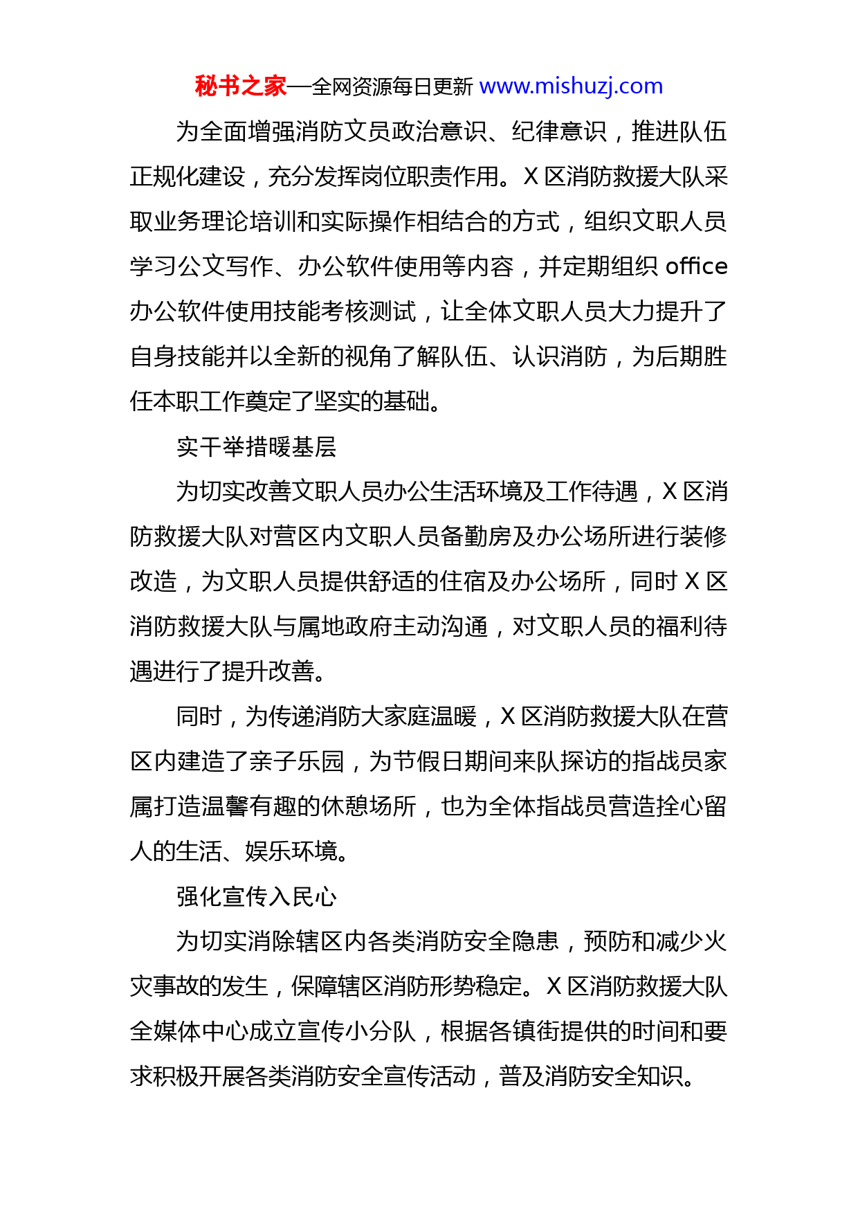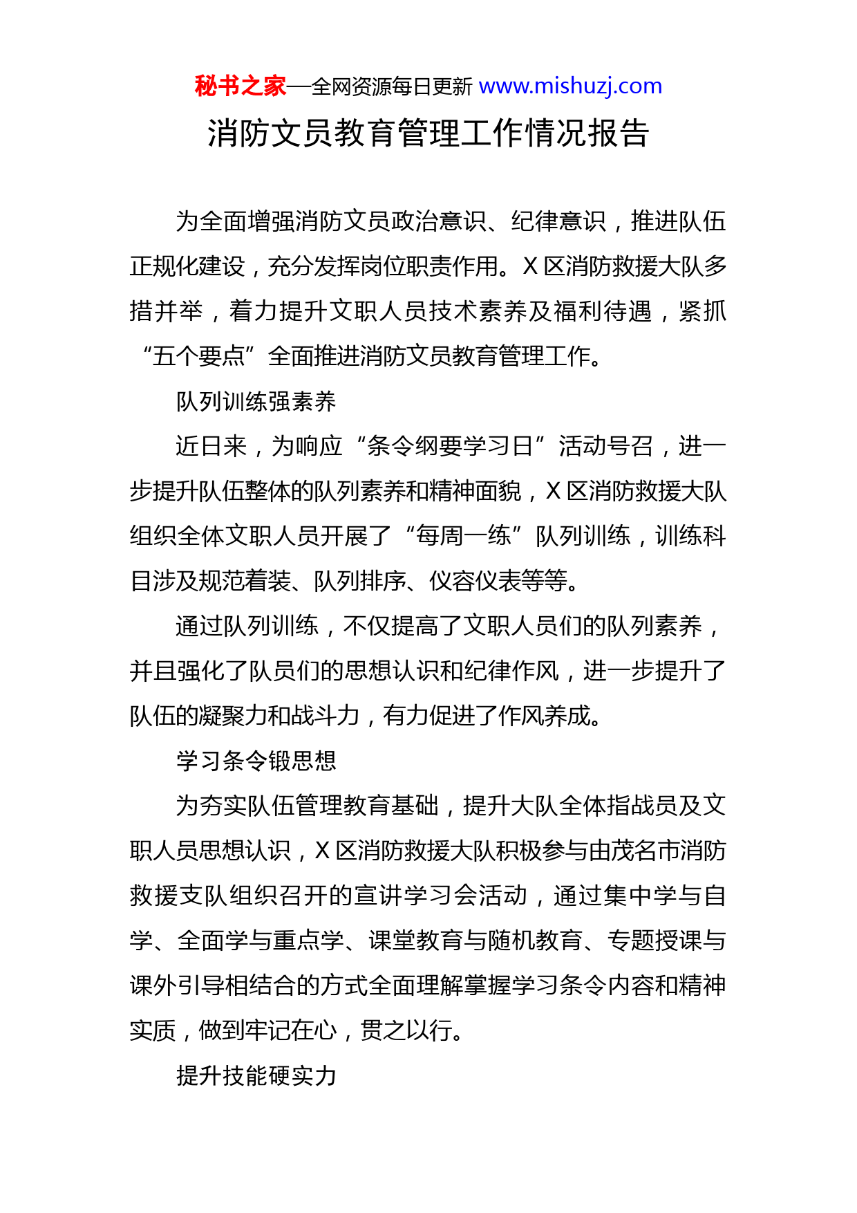 秘书之家—全网资源每日更新www.mishuzj.com消防文员教育管理工作情况报告为全面增强消防文员政治意识、纪律意识,推进队伍正规化建设,充分发挥岗位职责作用。X区消防救援大队多措并举,着力提升文职人员技术素养及福利待遇,紧抓“五个要点”全面推进消防文员教育管理工作。队列训练强素养近日来,为响应“条令纲要学习日”活动号召,进一步提升队伍整体的队列素养和精神面貌,X区消防救援大队组织全体文职人员开展了“每周一练”队列训练,训练科目涉及规范着装、队列排序、仪容仪表等等。通过队列训练,不仅提高了文职人员们的队列素养,并且强化了队员们的思想认识和纪律作风,进一步提升了队伍的凝聚力和战斗力,有力促进了作风养成。学习条令锻思想为夯实队伍管理教育基础,提升大队全体指战员及文职人员思想认识,X区消防救援大队积极参与由茂名市消防救援支队组织召开的宣讲学习会活动,通过集中学与自学、全面学与重点学、课堂教育与随机教育、专题授课与课外引导相结合的方式全面理解掌握学习条令内容和精神实质,做到牢记在心,贯之以行。提升技能硬实力秘书之家—全网资源每日更新www.mishuzj.com为全面增强消防文员政治意识、纪律意识,推进队伍正规化建设,充分发挥岗位职责作用。X区消防救援大队采取业务理论培训和实际操作相结合的方式,组织文职人员学习公文写作、办公软件使用等内容,并定期组织office办公软件使用技能考核测试,让全体文职人员大力提升了自身技能并以全新的视角了解队伍、认识消防,为后期胜任本职工作奠定了坚实的基础。实干举措暖基层为切实改善文职人员办公生活环境及工作待遇,X区消防救援大队对营区内文职人员备勤房及办公场所进行装修改造,为文职人员提供舒适的住宿及办公场所,同时X区消防救援大队与属地政府主动沟通,对文职人员的福利待遇进行了提升改善。同时,为传递消防大家庭温暖,X区消防救援大队在营区内建造了亲子乐园,为节假日期间来队探访的指战员家属打造温馨有趣的休憩场所,也为全体指战员营造拴心留人的生活、娱乐环境。强化宣传入民心为切实消除辖区内各类消防安全隐患,预防和减少火灾事故的发生,保障辖区消防形势稳定。X区消防救援大队全媒体中心成立宣传小分队,根据各镇街提供的时间和要求积极开展各类消防安全宣传活动,普及消防安全知识。秘书之家—全网资源每日更新www.mishuzj.com针对辖区内火灾事故发生的特点,宣传小分队通过消防安全培训、发放宣传单、张贴海报等形式,深入两类场所、重大危险源企业、人员密集场所、住宅小区等重点场所开展消防安全宣传教育,提高广大群众消防安全意识。通过此次消防文员教育管理工作的开展,X大队进一步增强了新聘文员业务理论水平和综合能力素质,培养令行禁止的优良作风和养成,实现了从地方青年向一名合格消防文员的转变。下一步,X大队将持续深入开展消防文员各项培训工作,力争打造一支高素质的消防文员队伍。